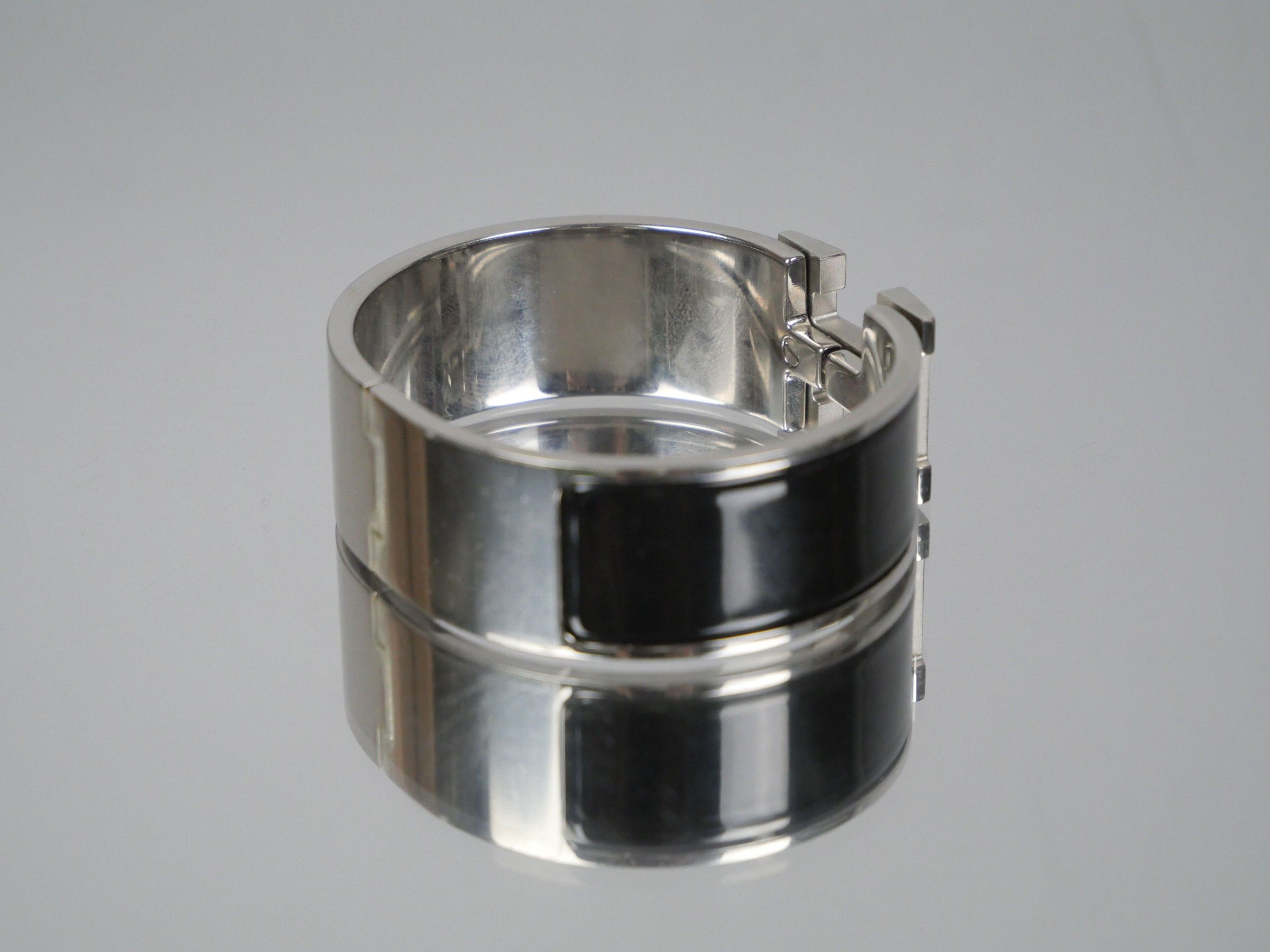 Clic Clac H" bangle bracelet in palladium-plated metal and black enamel. H-shaped pivoting clasp.