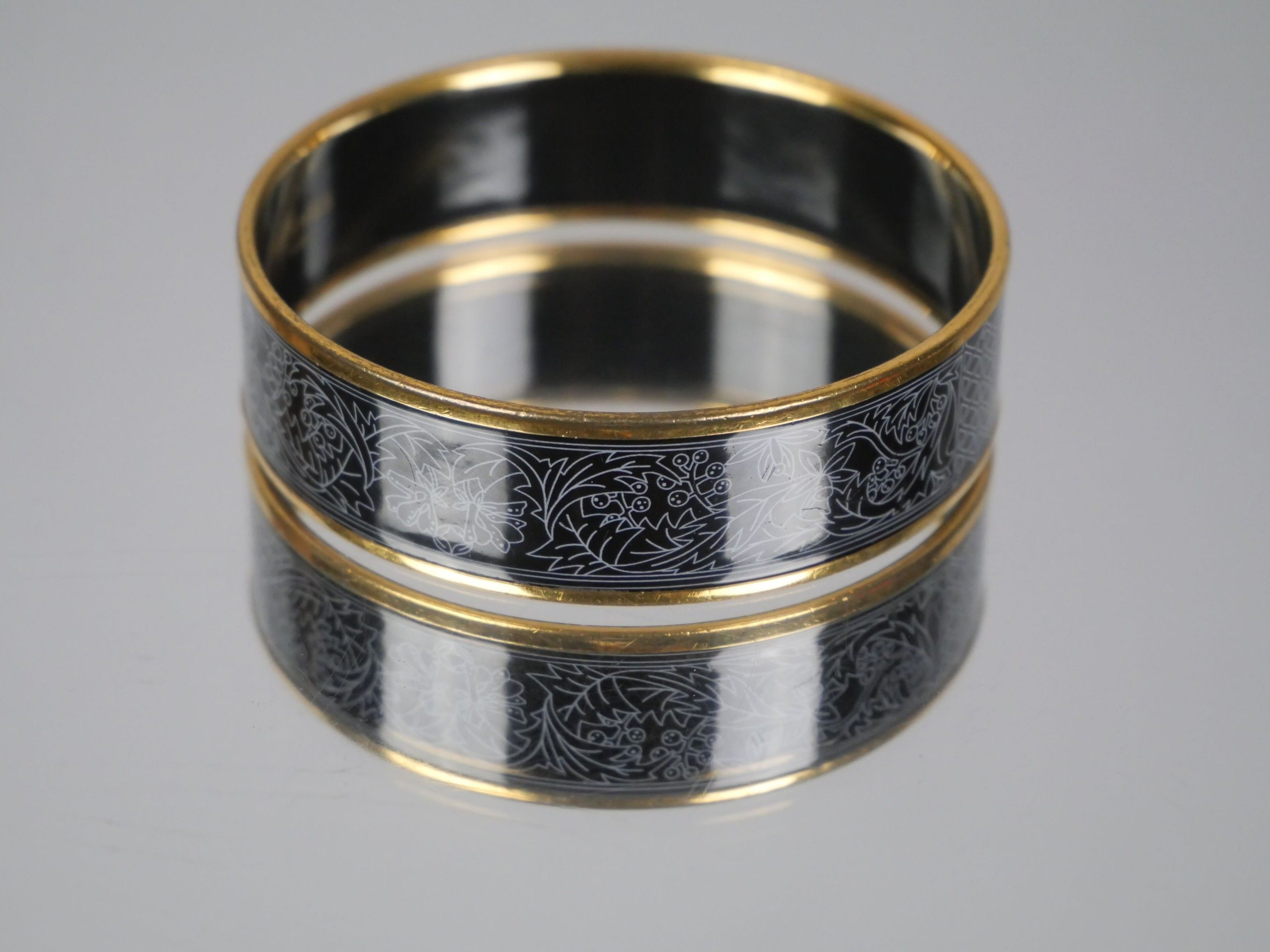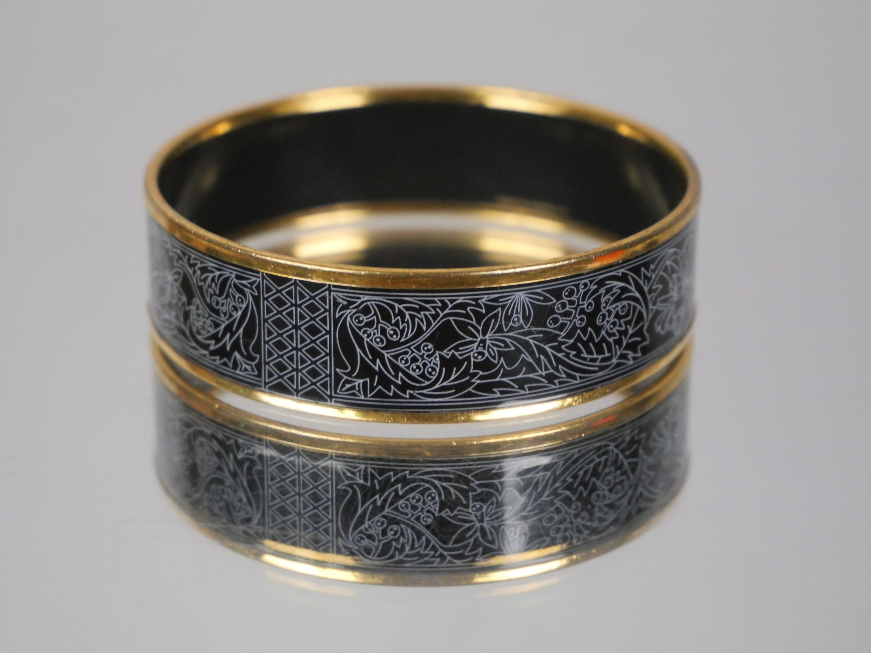 Rigid gold-plated bangle bracelet with an enamelled frieze of stylised plant motifs on a black background.