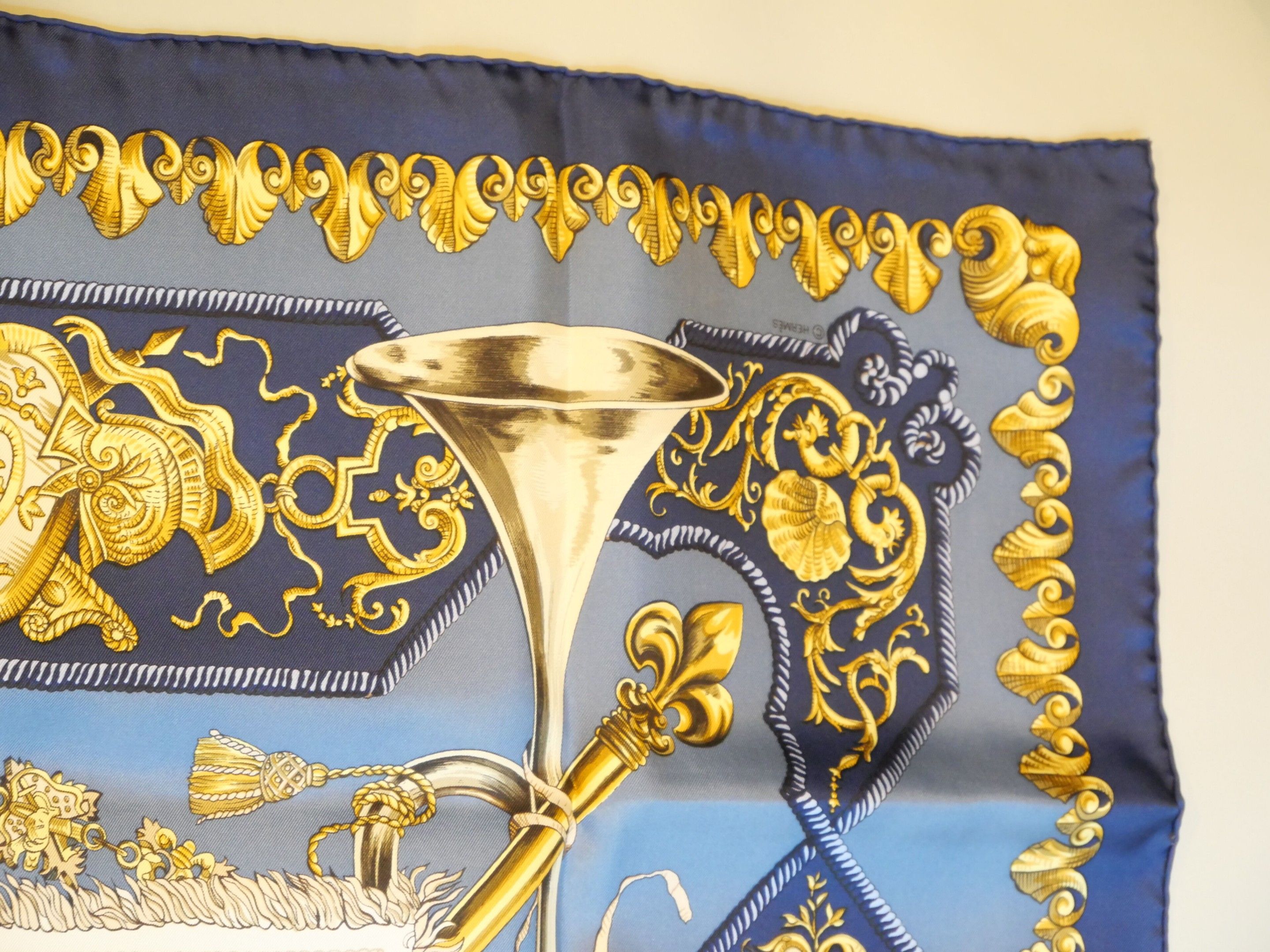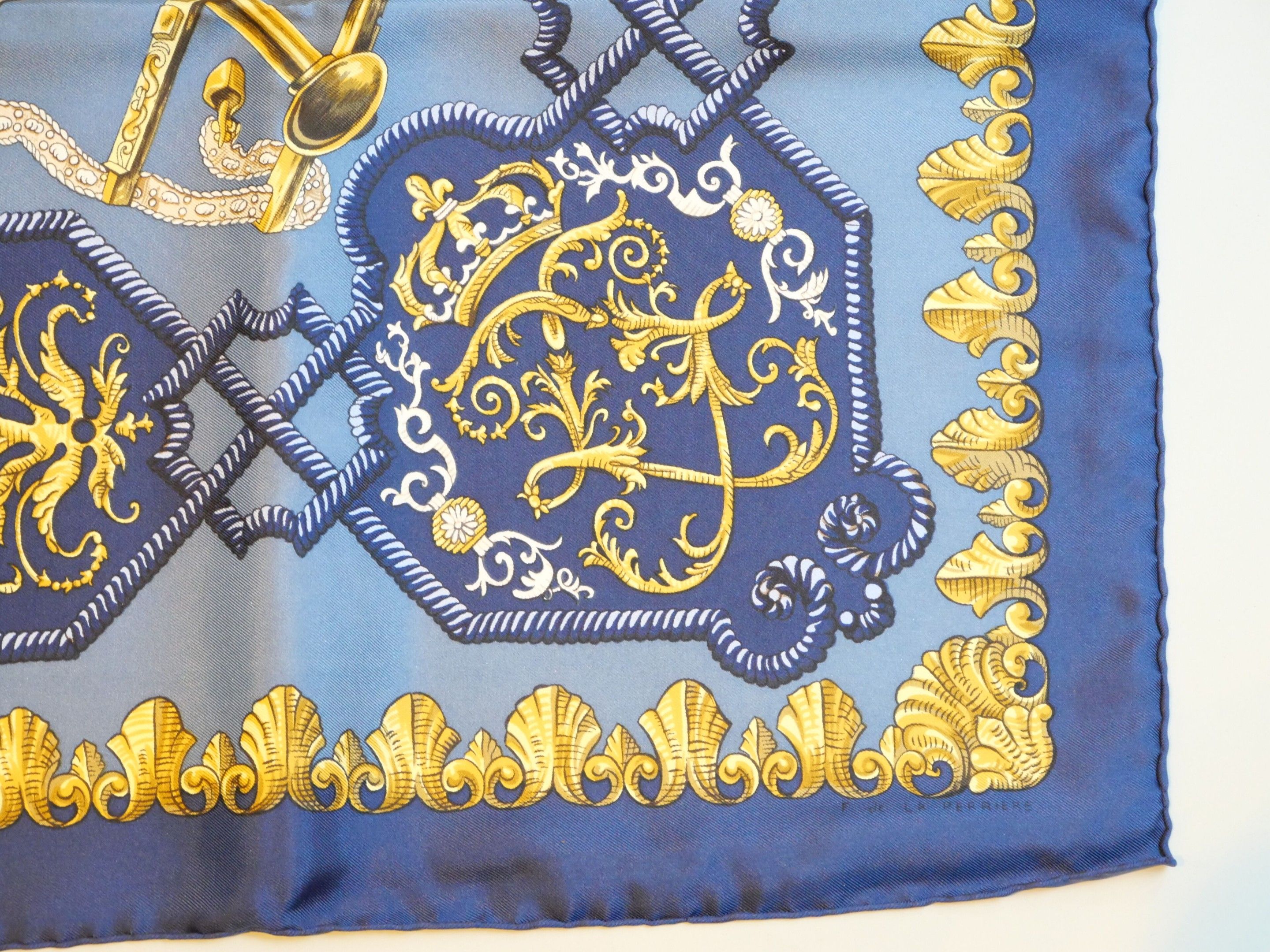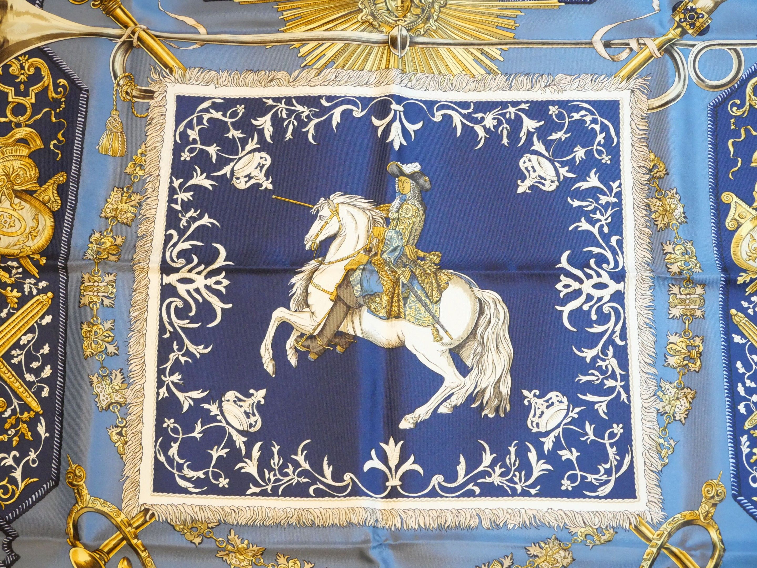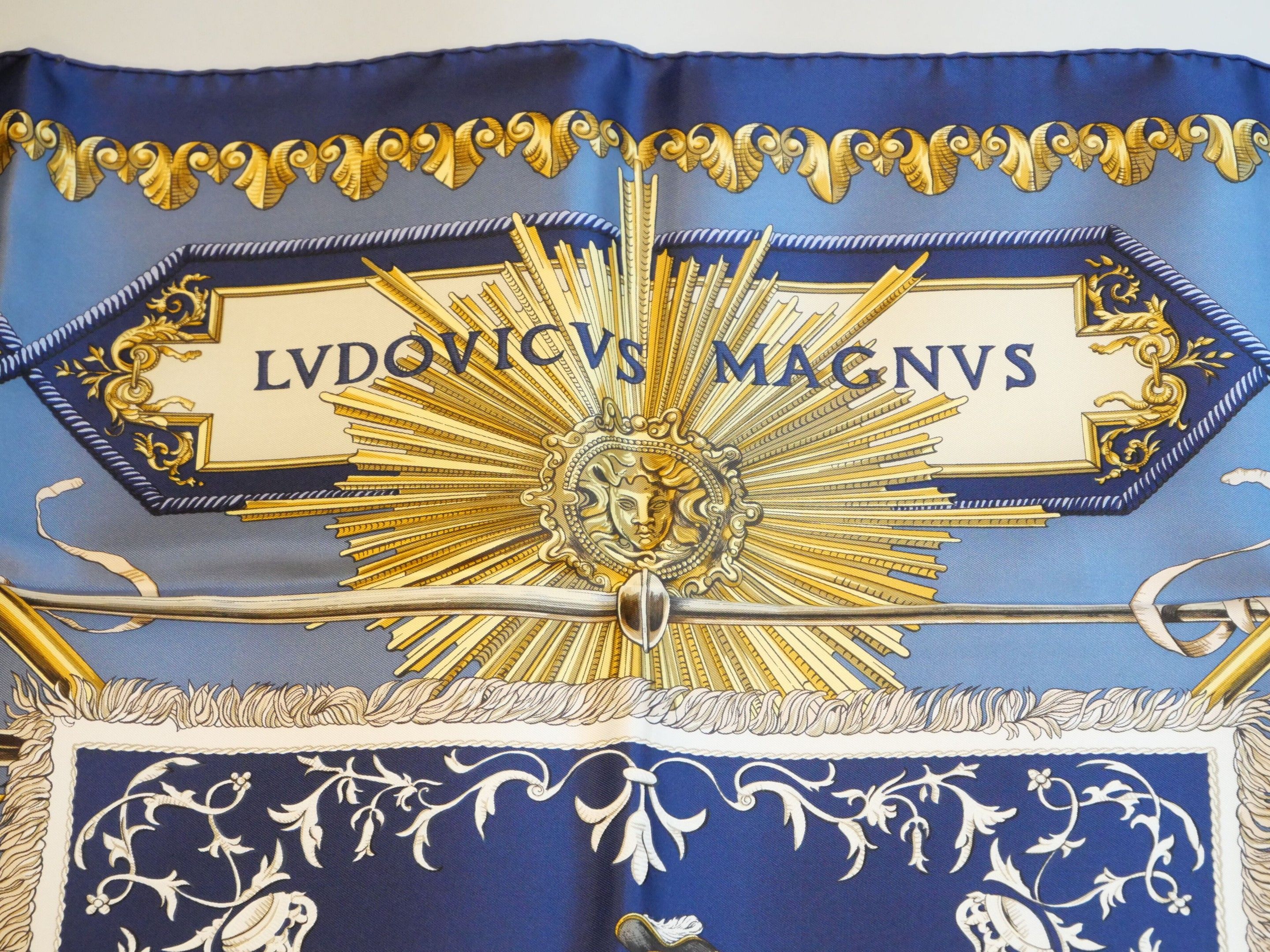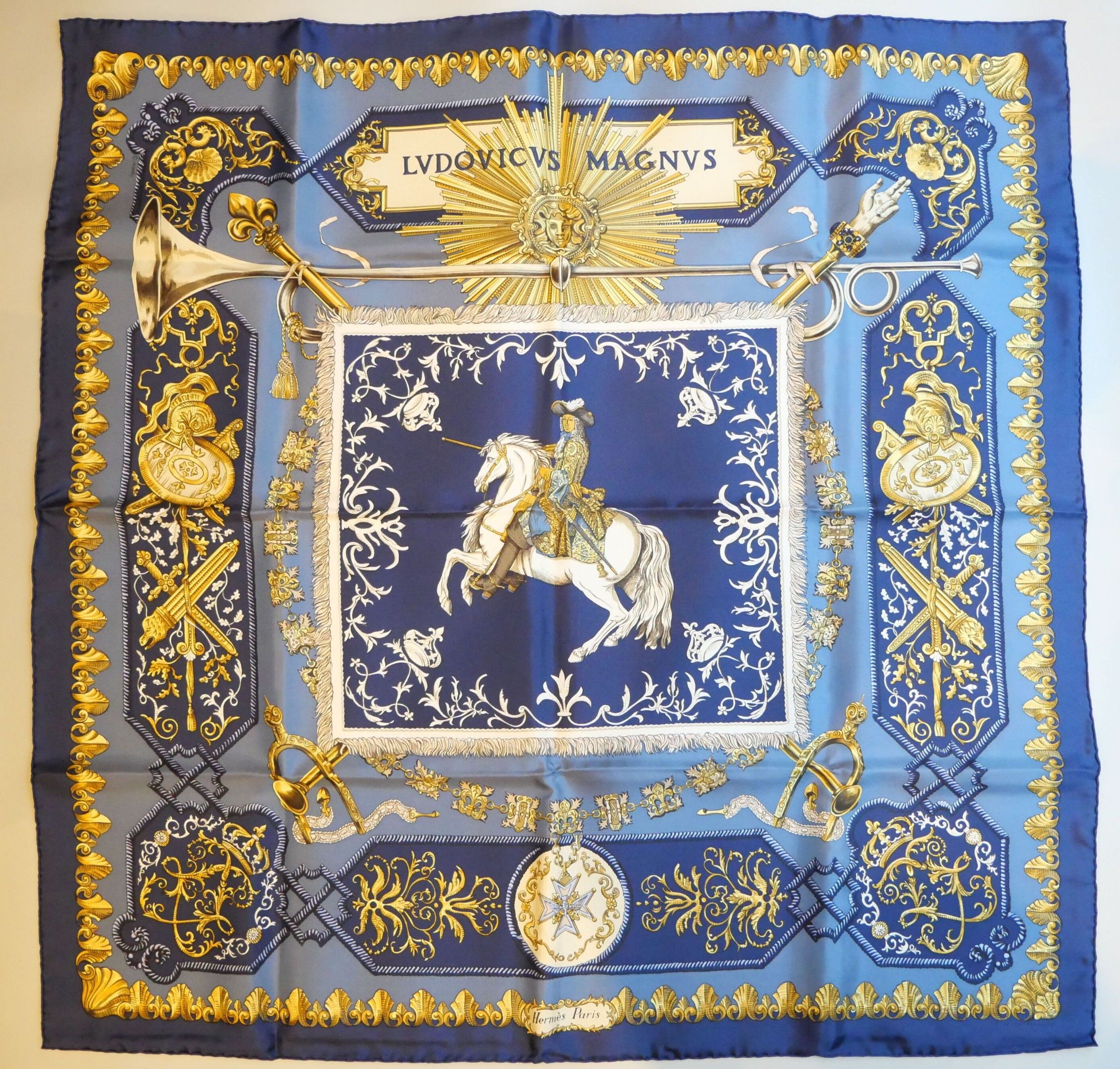 Square in printed silk twill, titled "Ludovicus Magnus" in navy blue and gold.