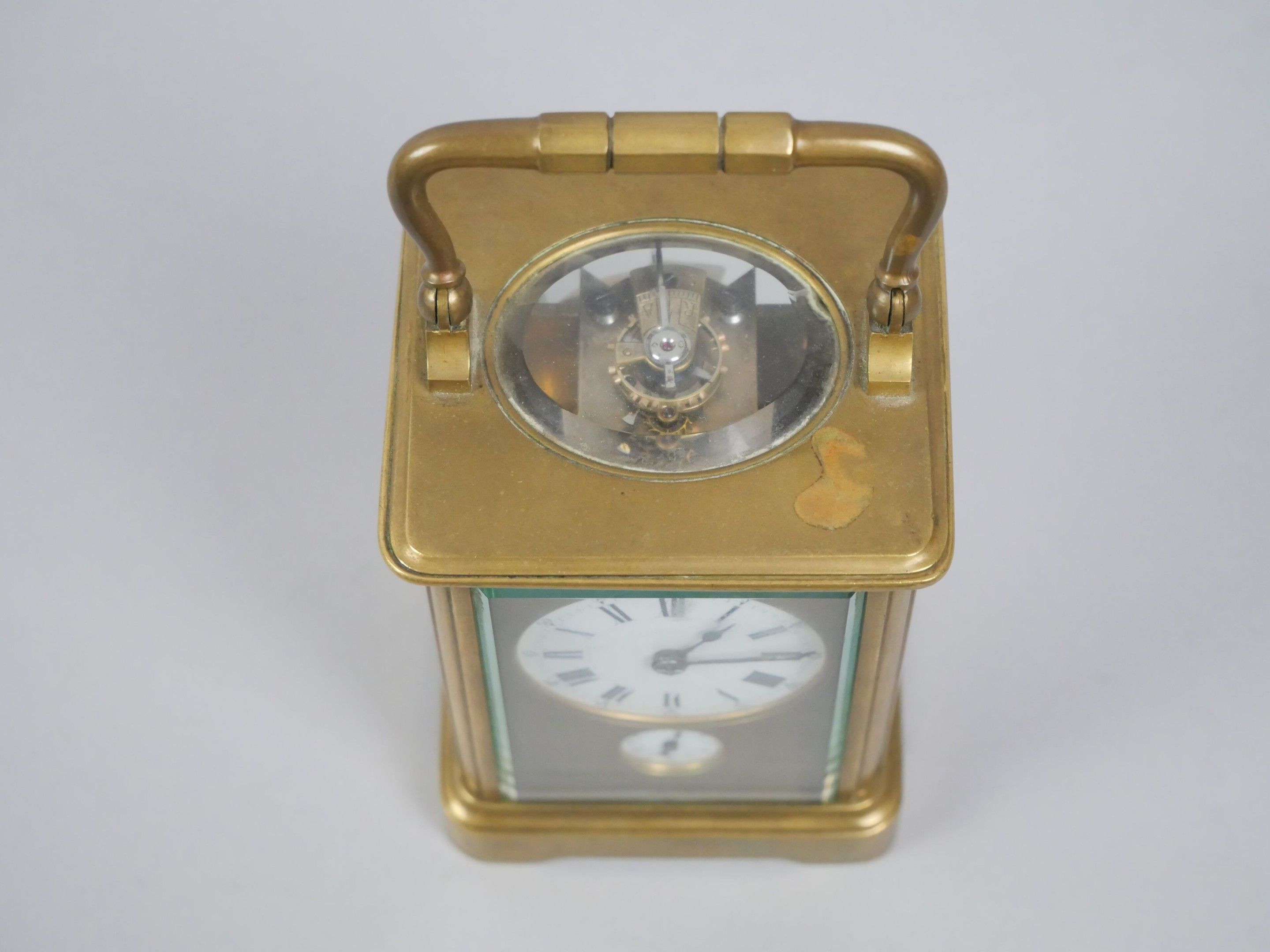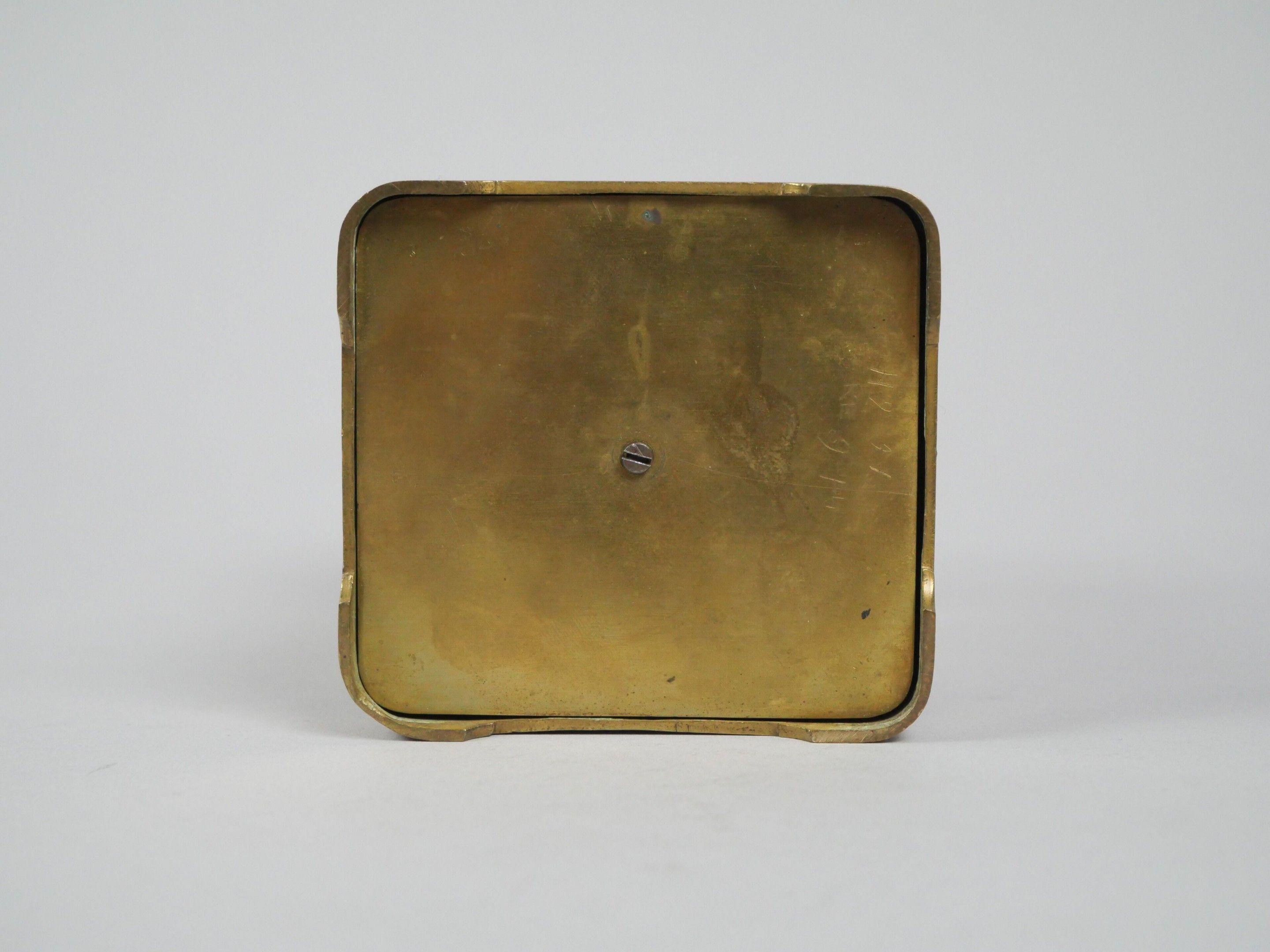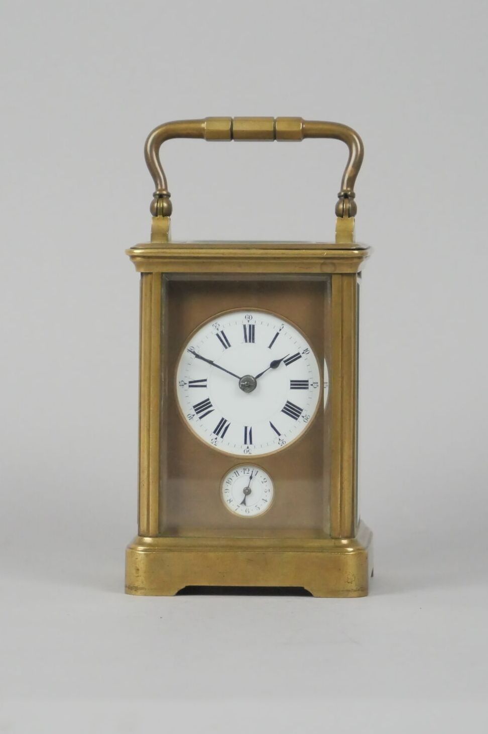 Travel or officer's alarm clock, brass cage, bevelled glass, white enamelled dial with Roman and Arabic numerals on railway track, small lower dial.