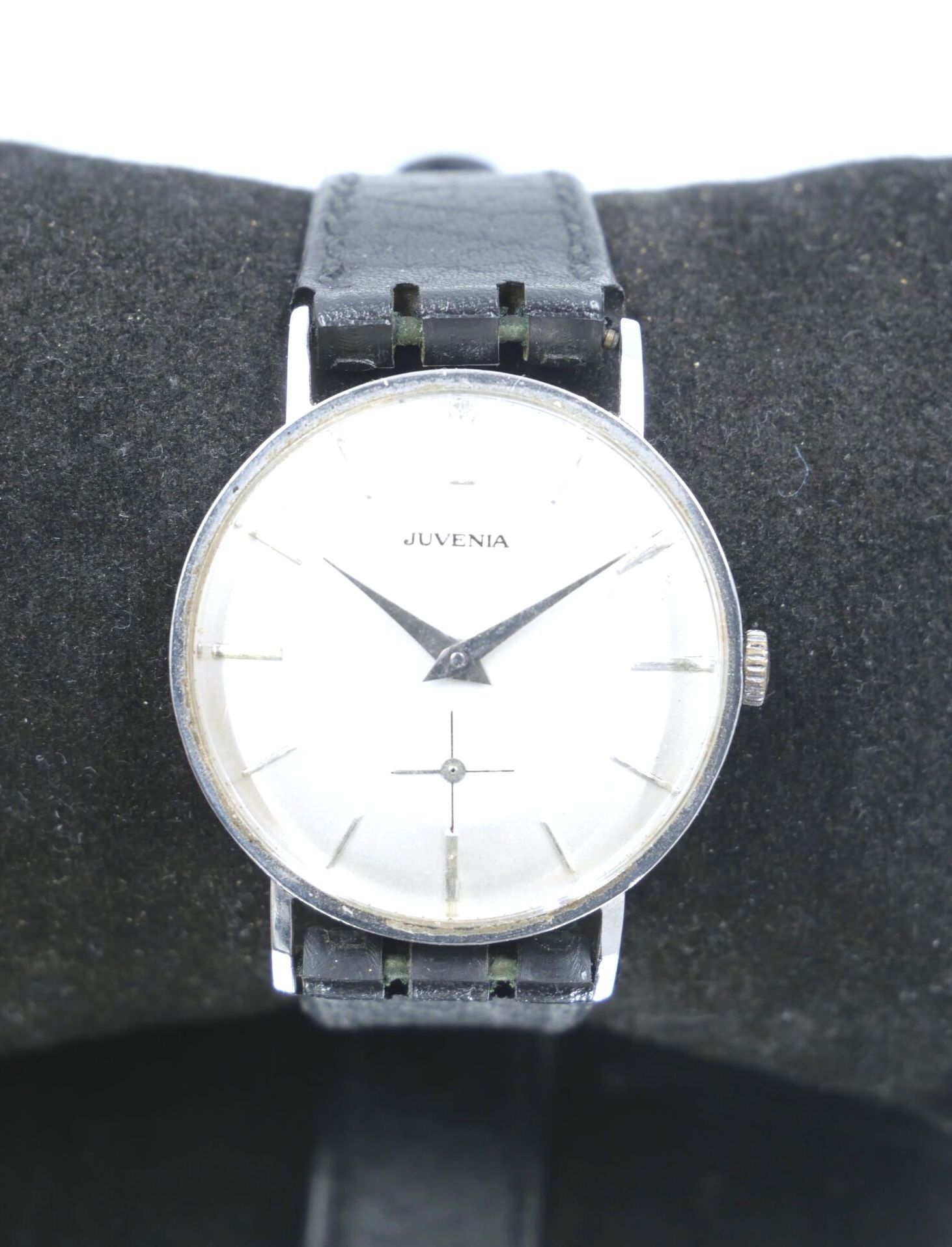 JUVENIA Wristwatch, round steel case, silver dial with appli…