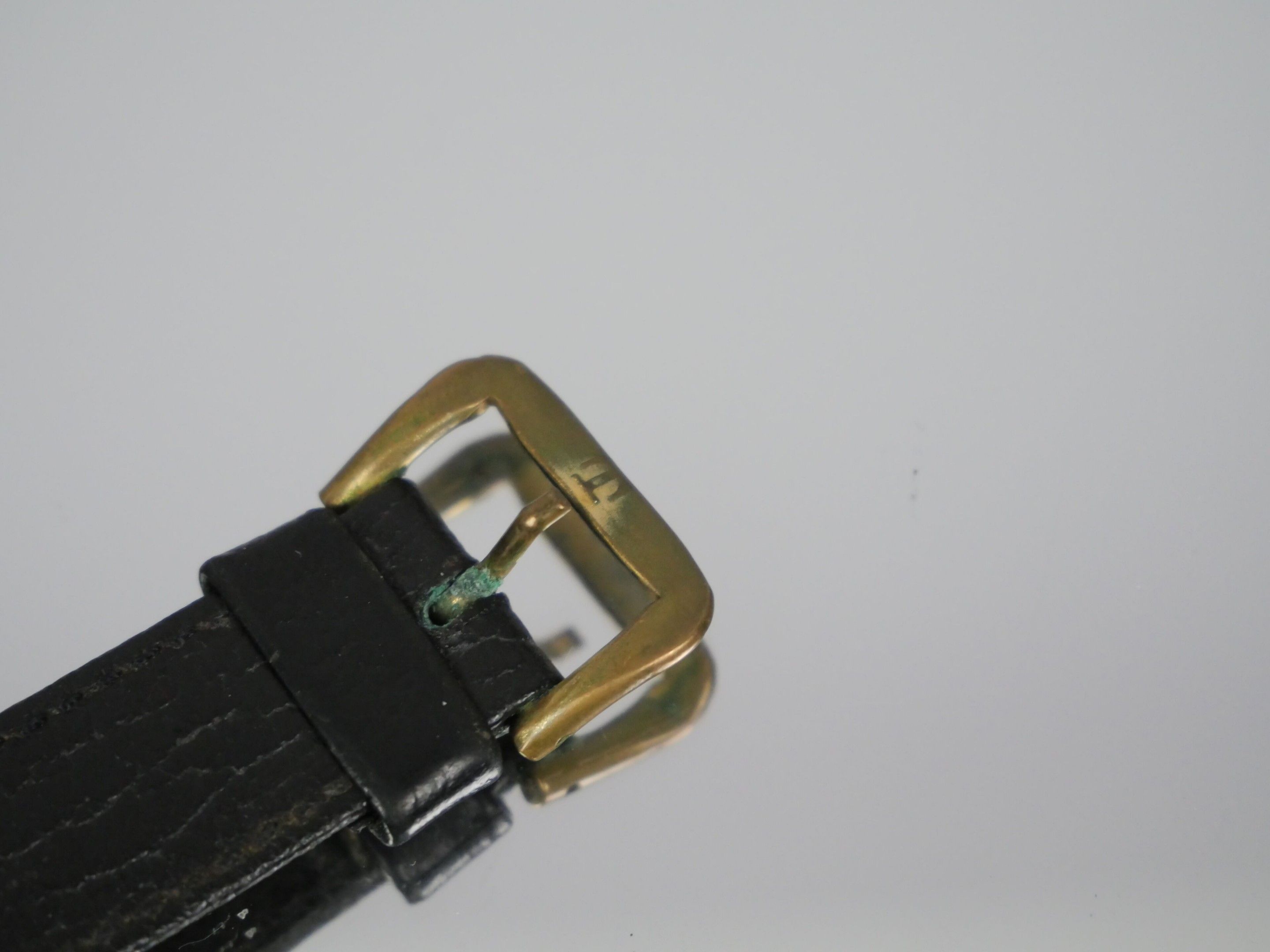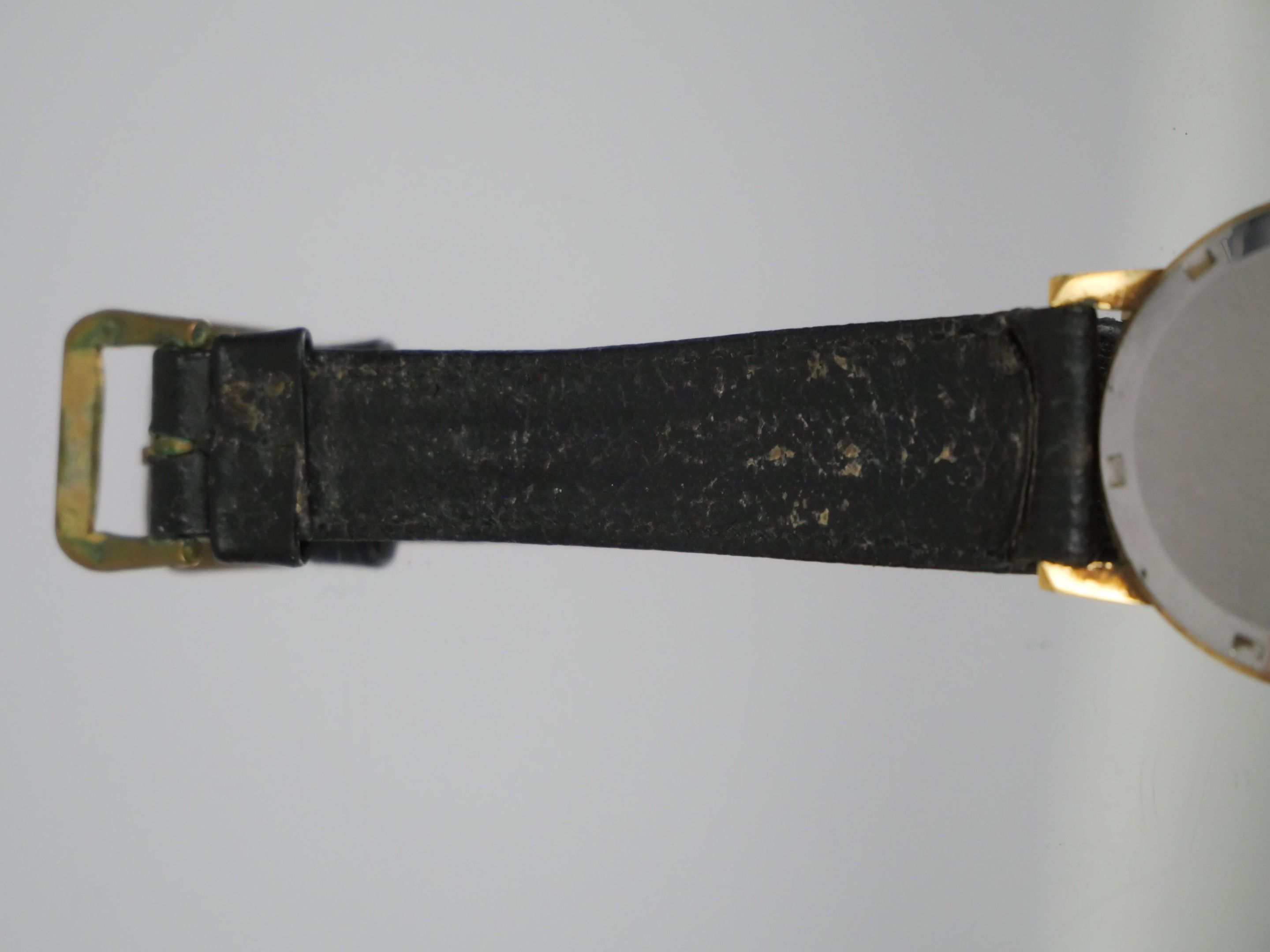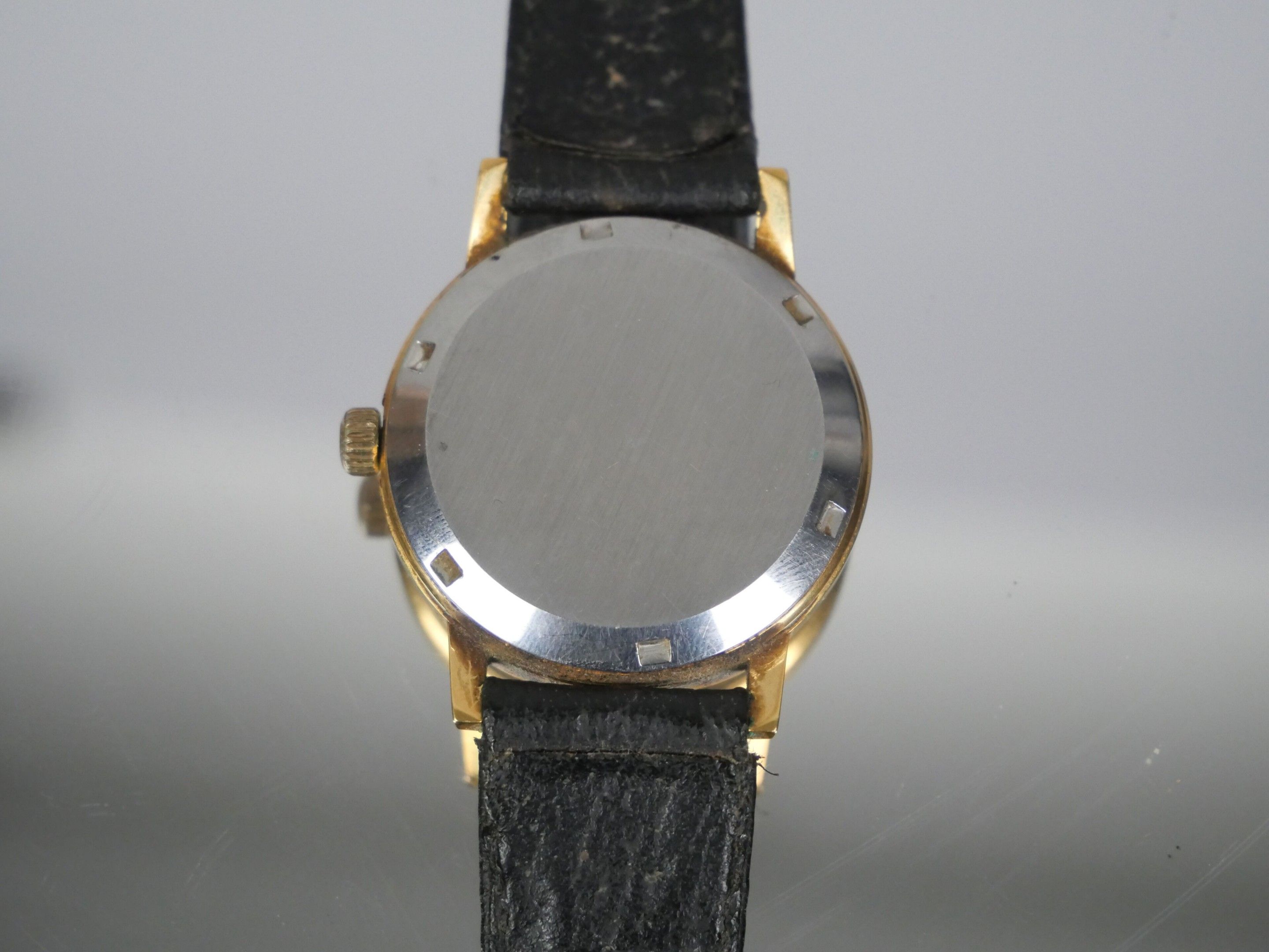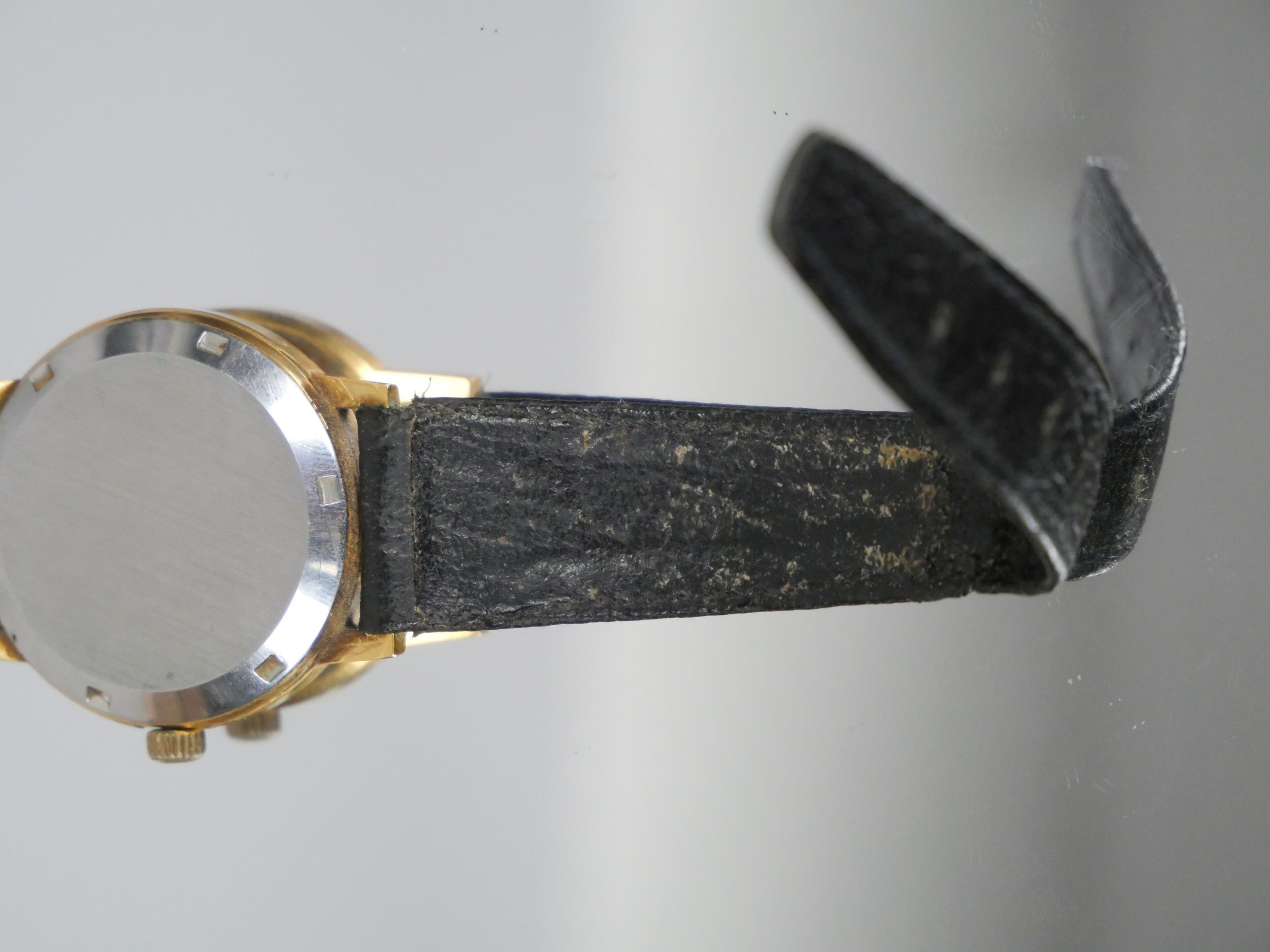 Gentlemen's watch, AUTOMATIC Genève Day - Date model, round gilt metal case, champagne dial with day and date window at 3 o'clock, baton hour-markers. Steel back. Self-winding mechanical movement. Used leather strap with attached pin buckle.