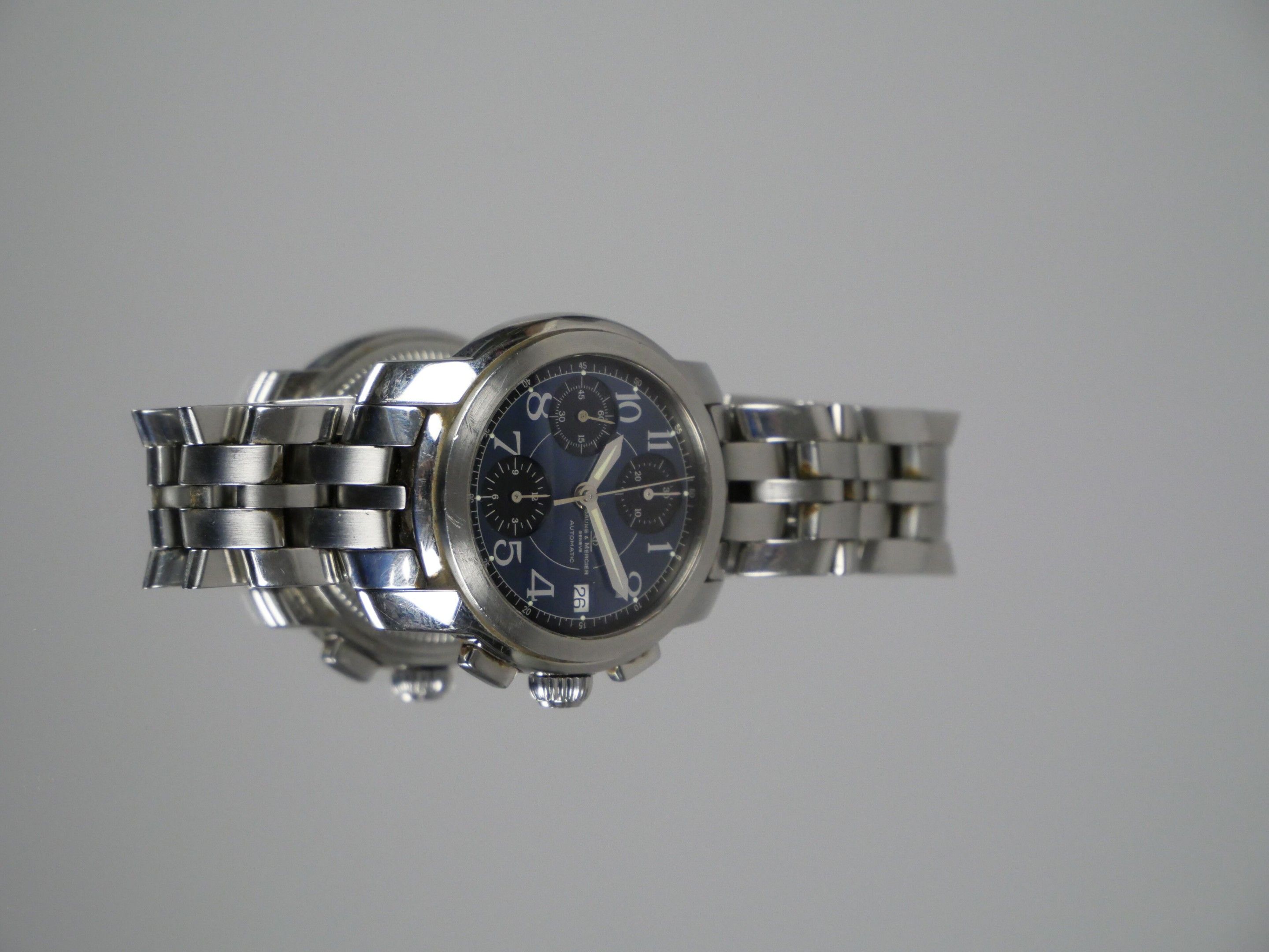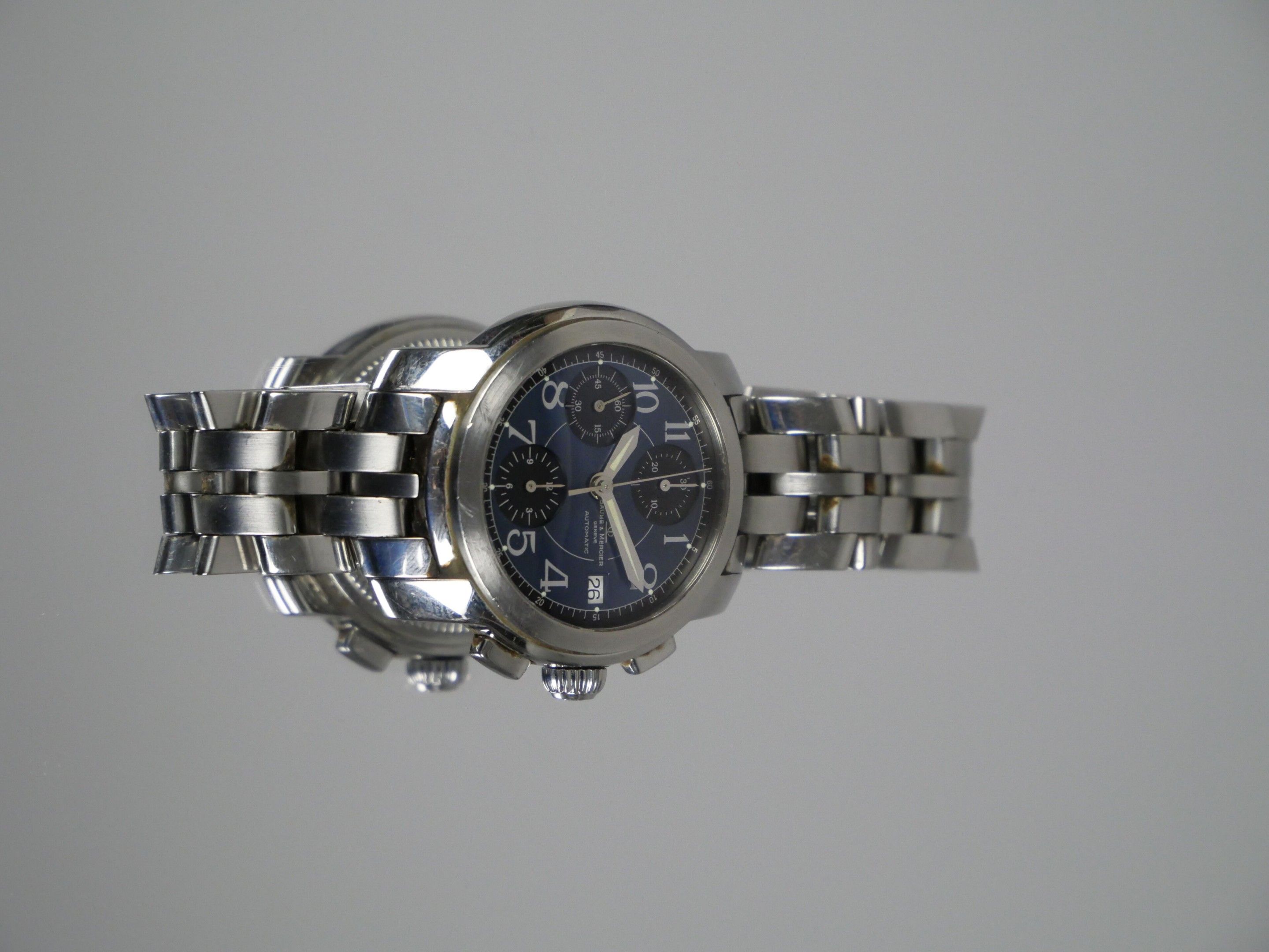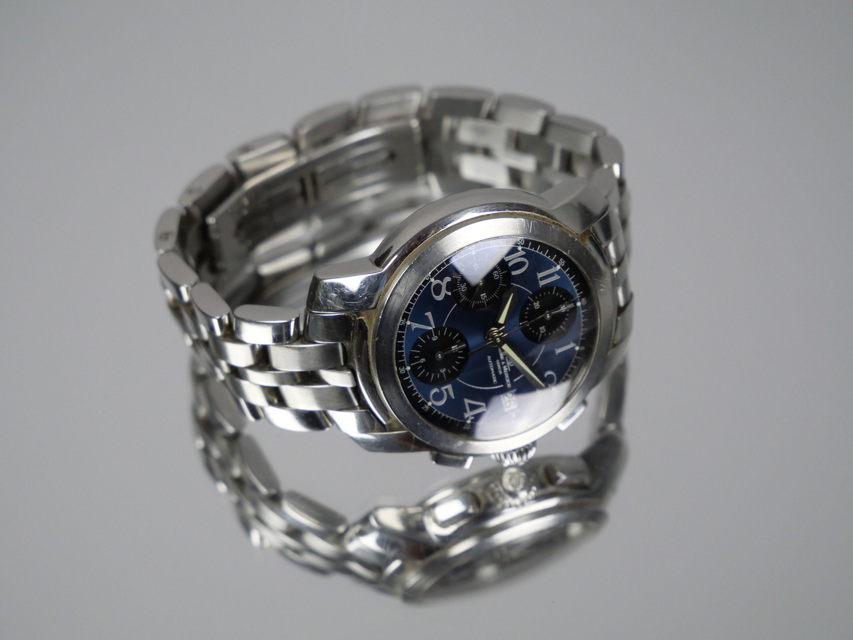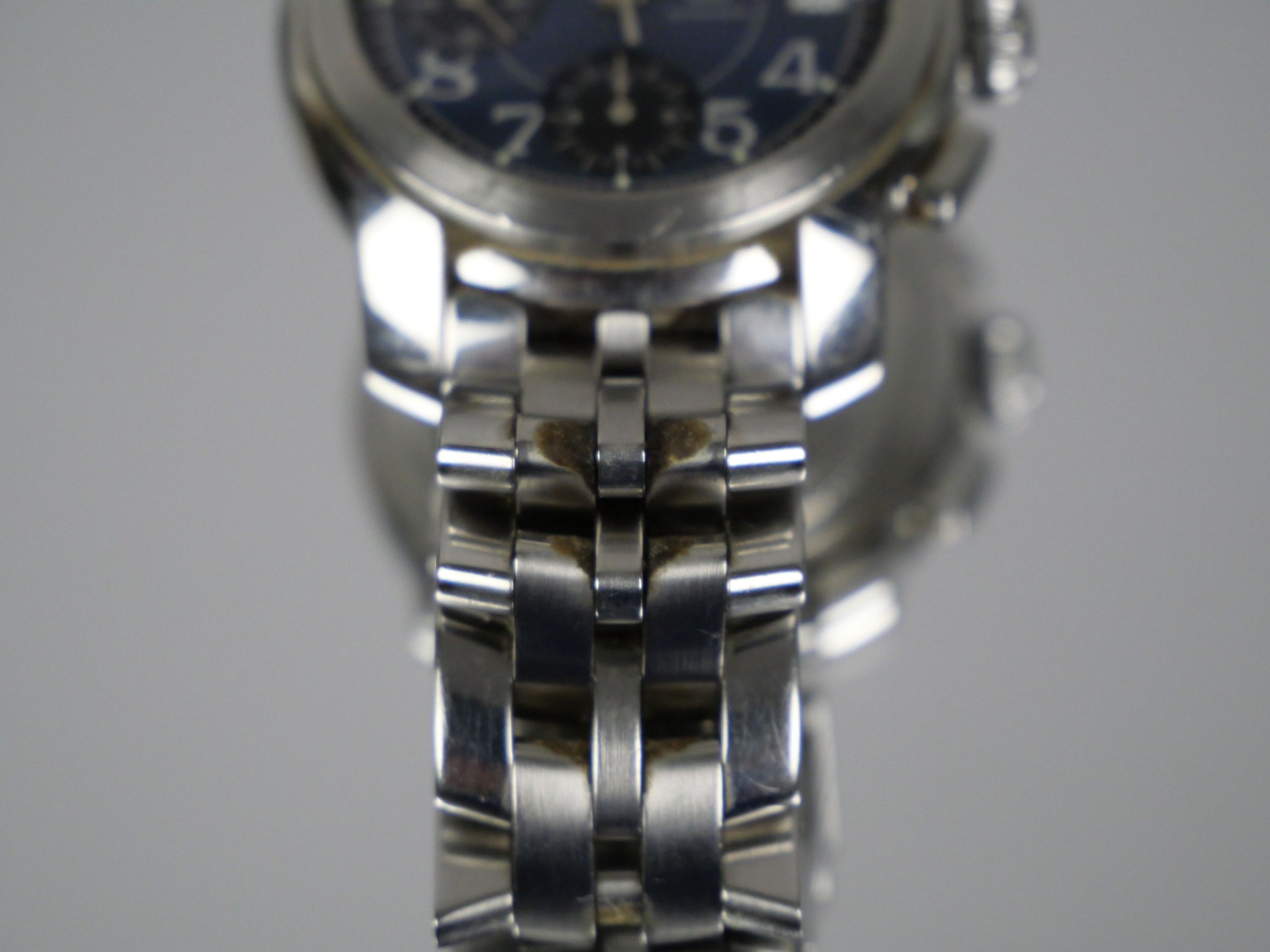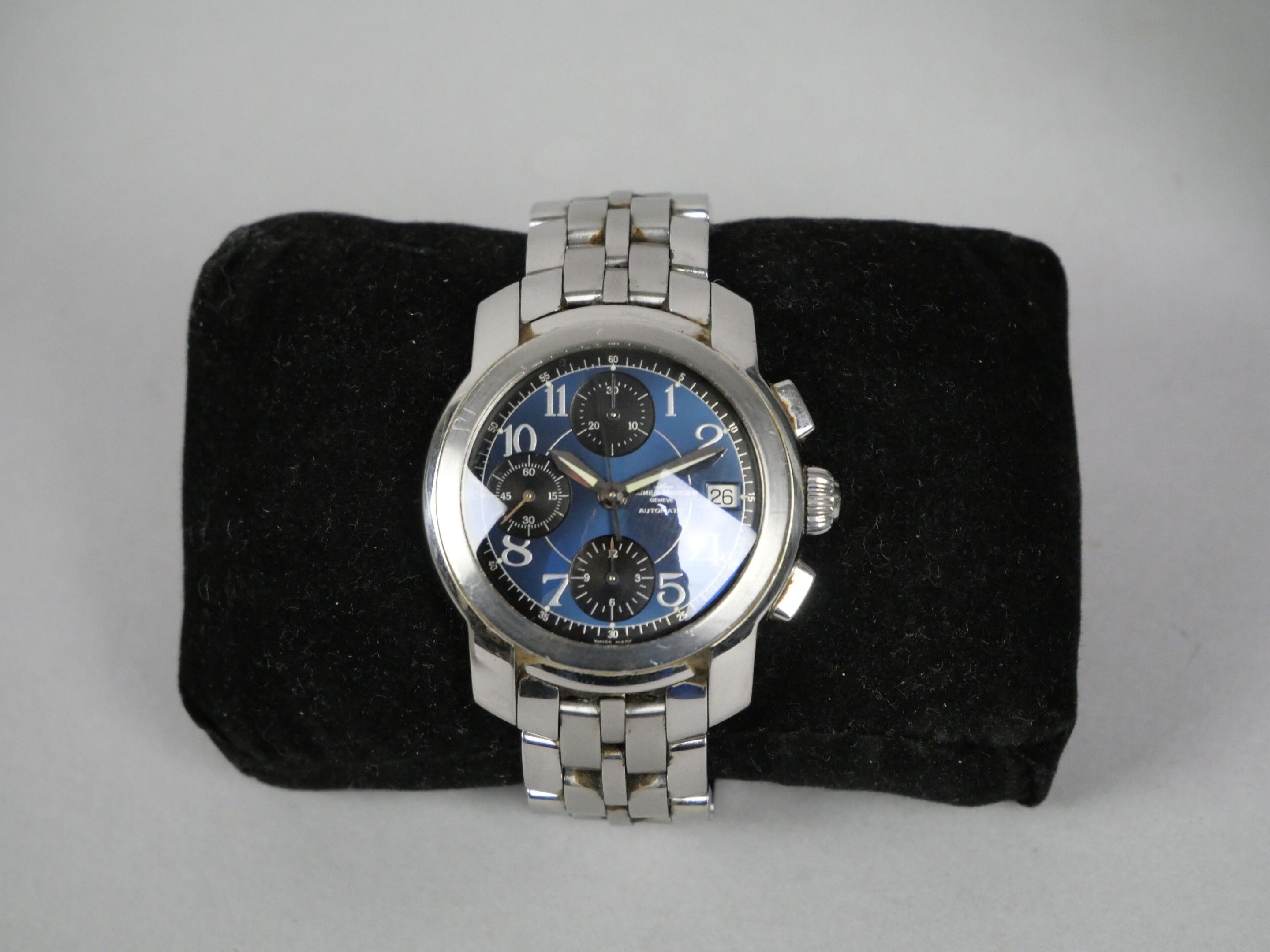 Dial: blue, three black counters, silvered Arabic numerals, date window at 3 o'clock.