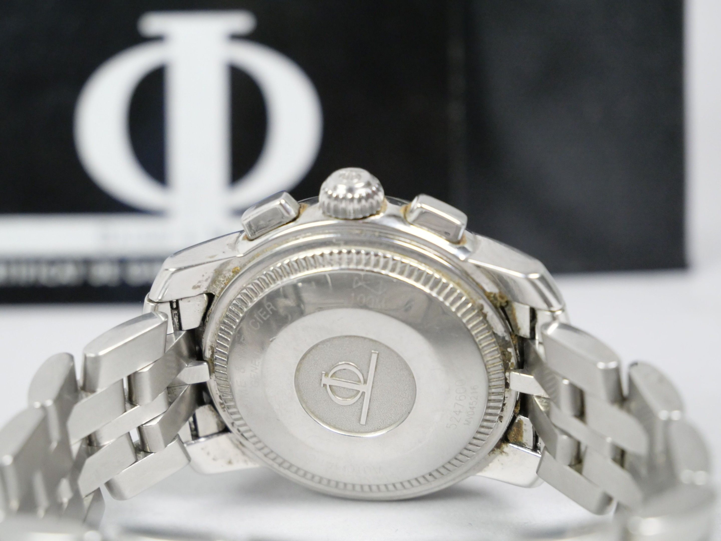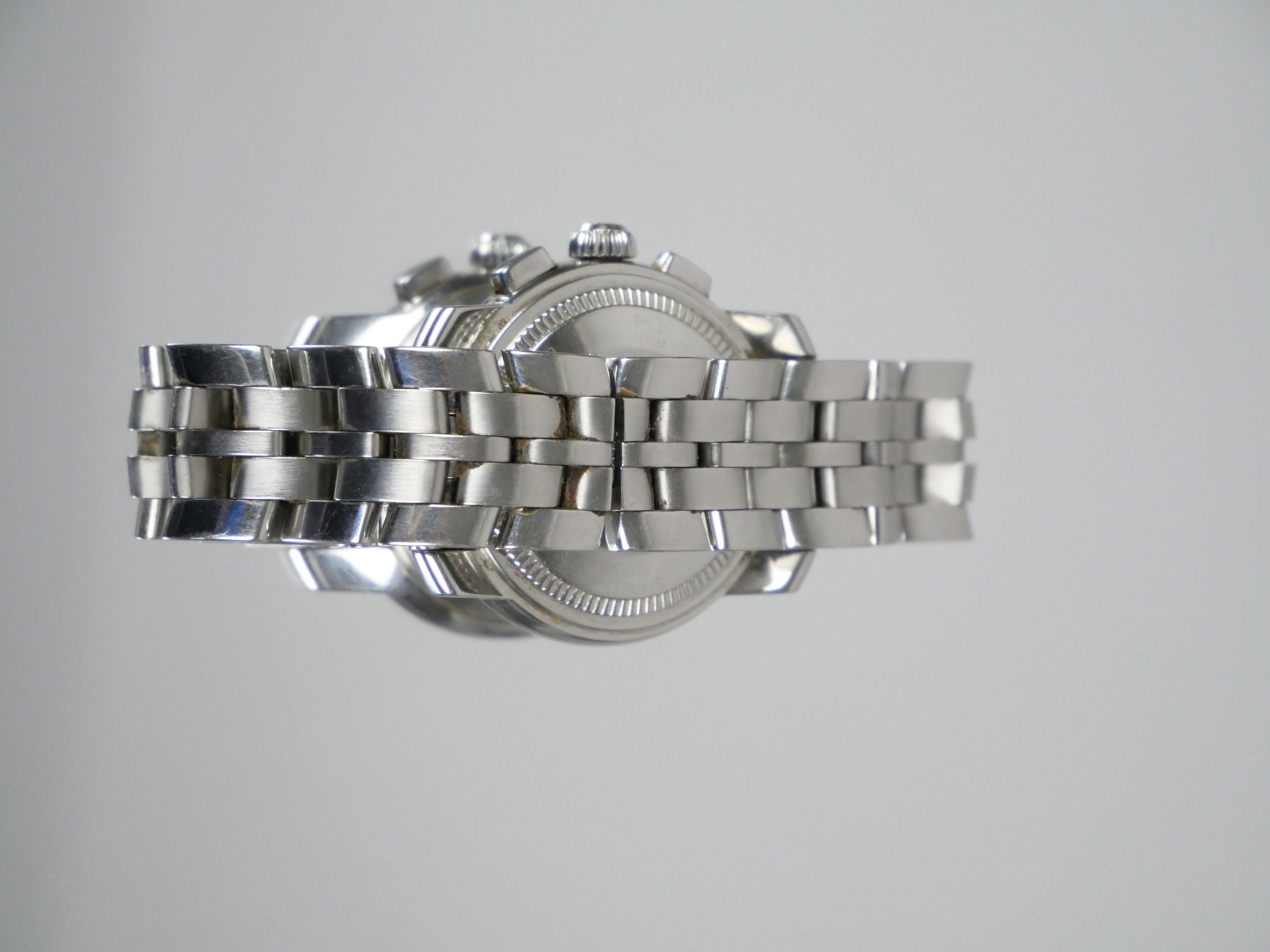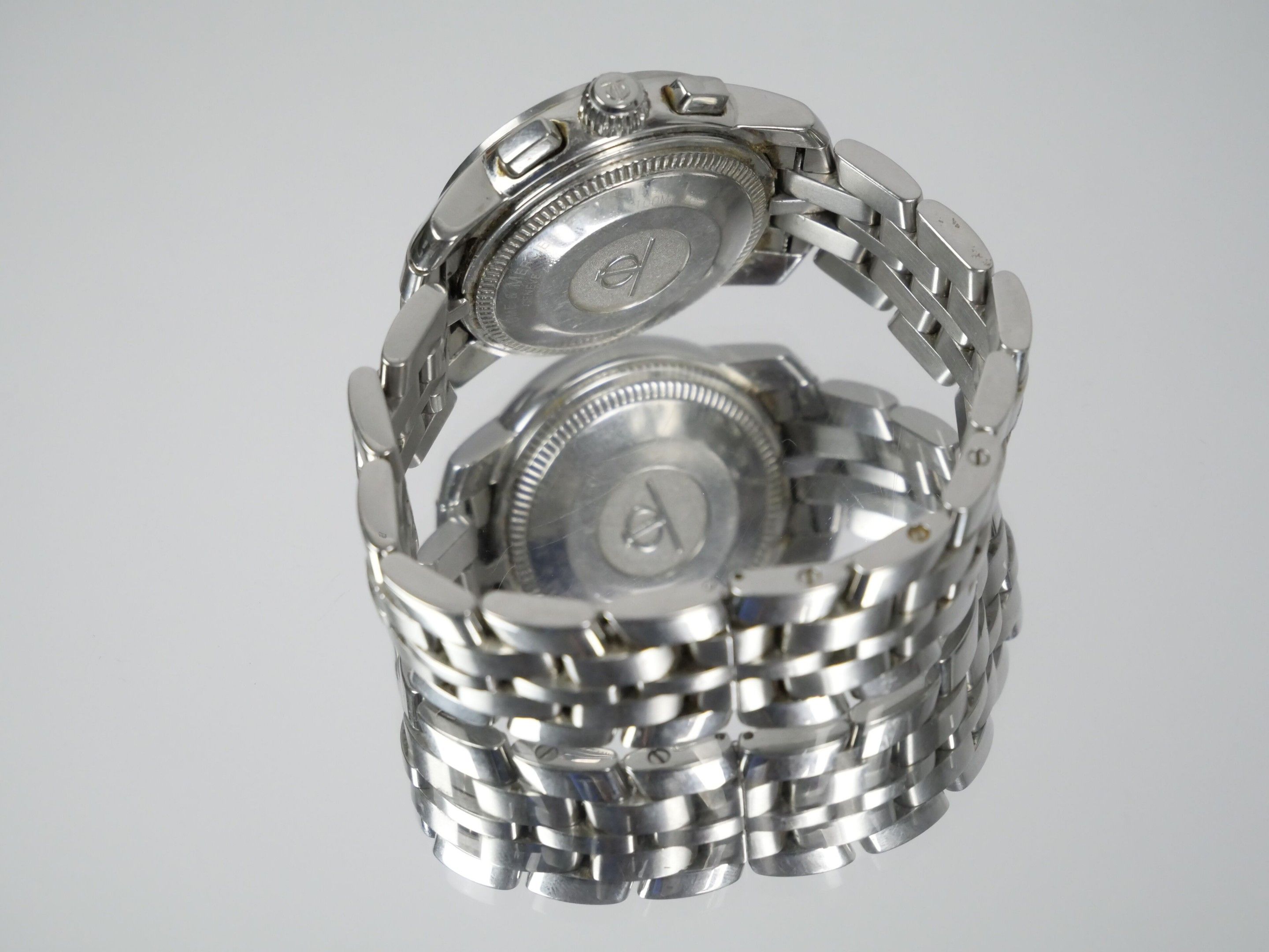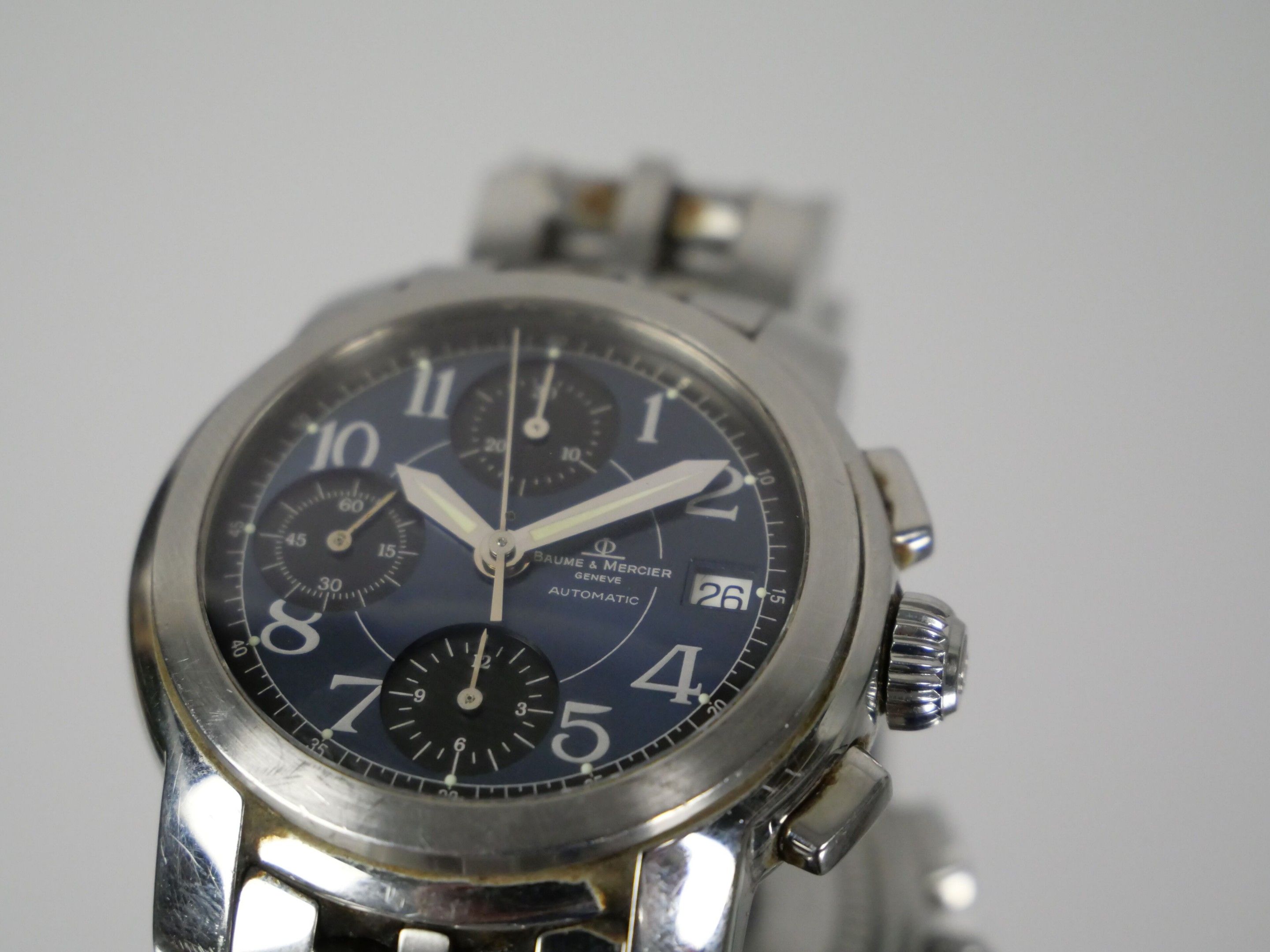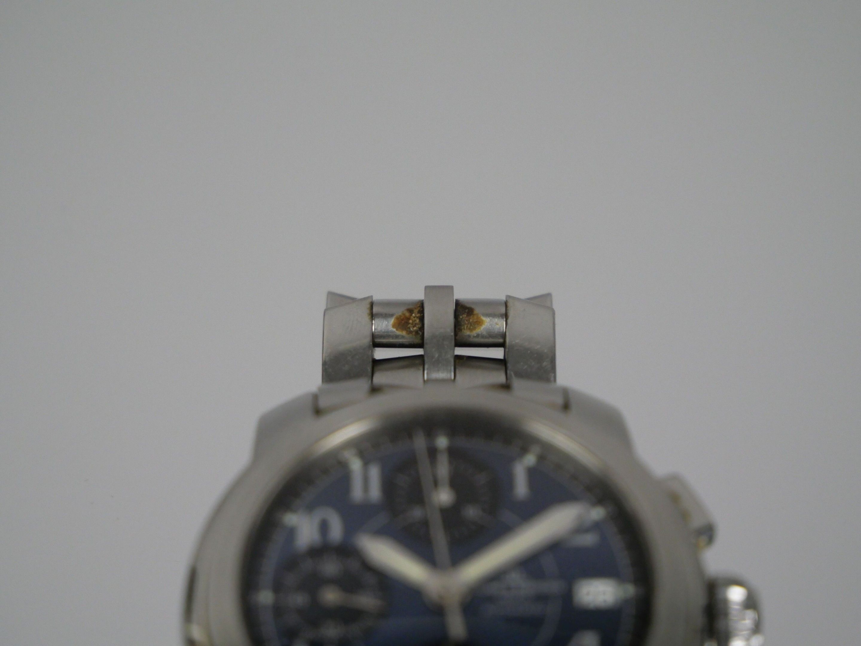 Dial: blue, three black counters, silvered Arabic numerals, date window at 3 o'clock.