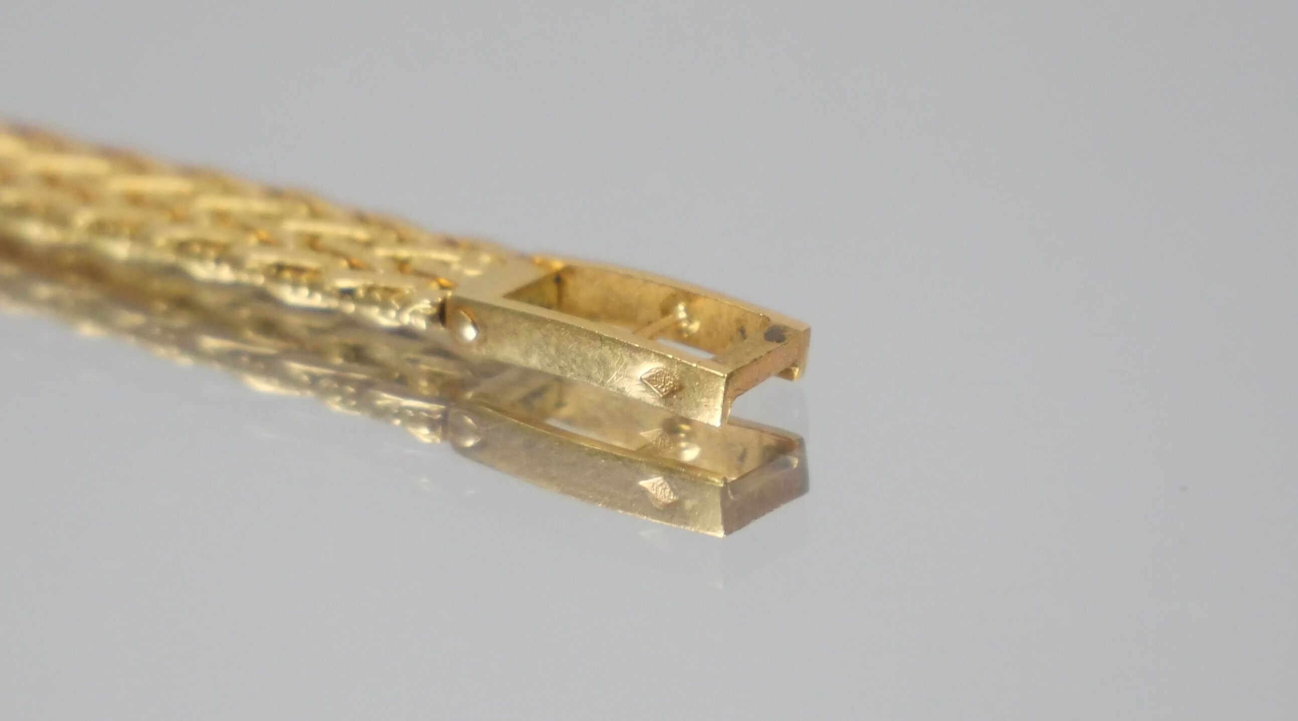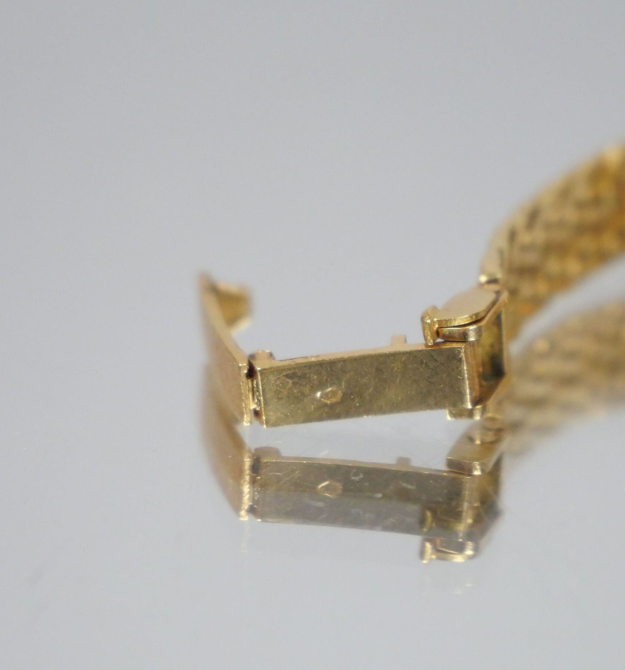 Ladies' wristwatch, case in 750 thousandths yellow gold, round dial with hour-markers on a champagne background, numbered 44489. Flexible bracelet in 750 thousandths yellow gold with herringbone plaited mesh and folding clasp.