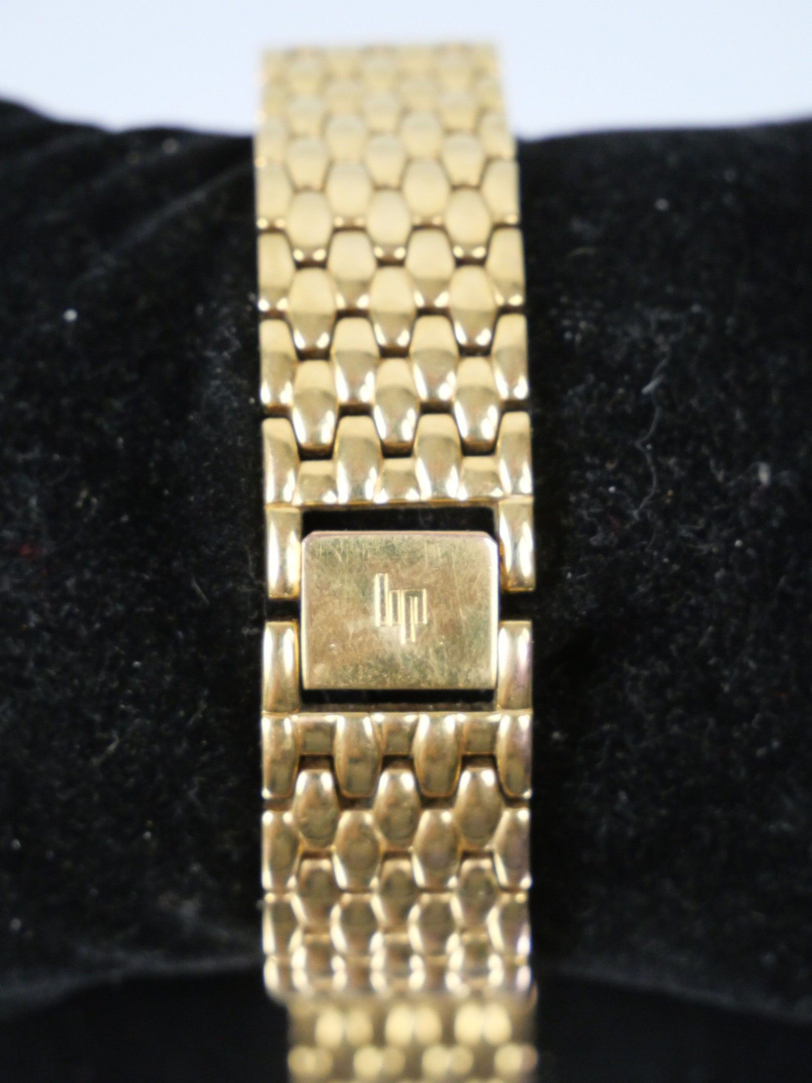 Ladies' wristwatch in gilt metal, rectangular case, dial with Roman numerals and hour markers, rhinestone-set bezel. Steel caseback numbered 1080912. Braided mesh bracelet with folding clasp.