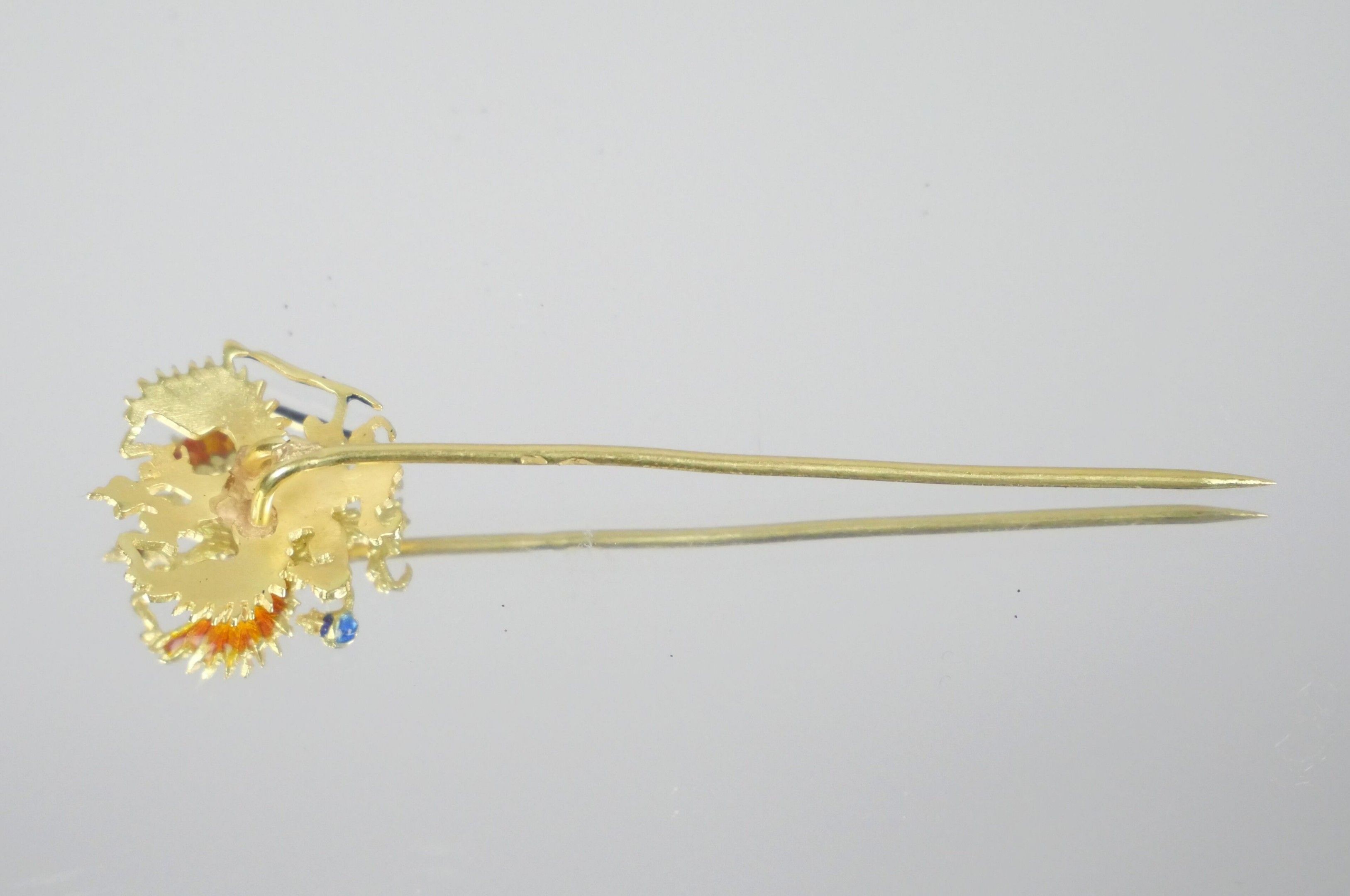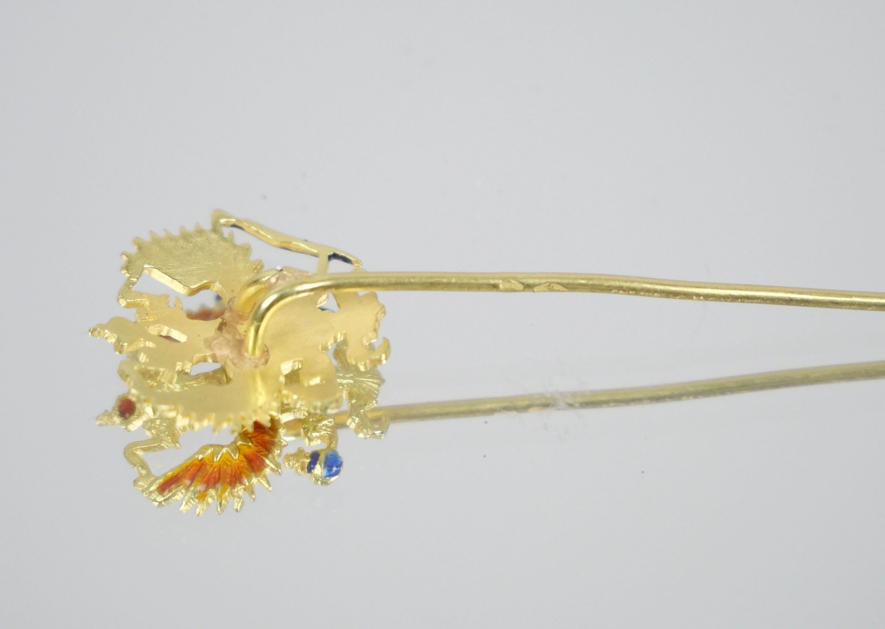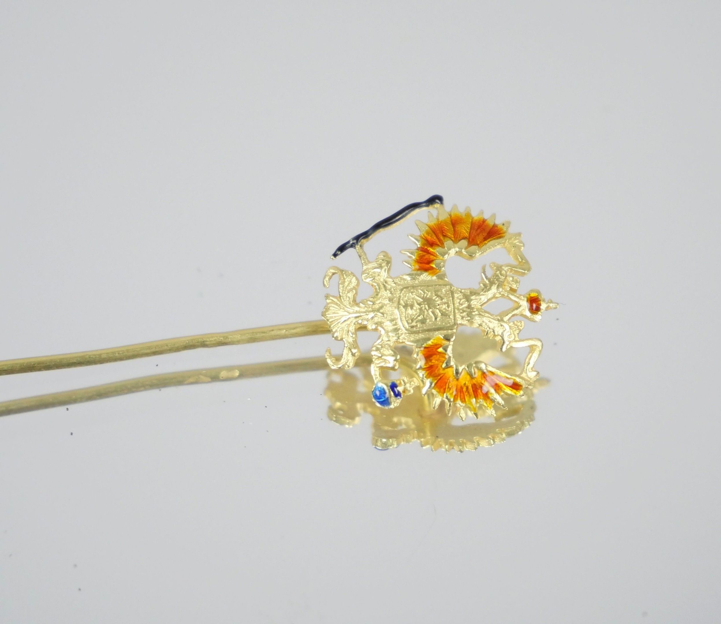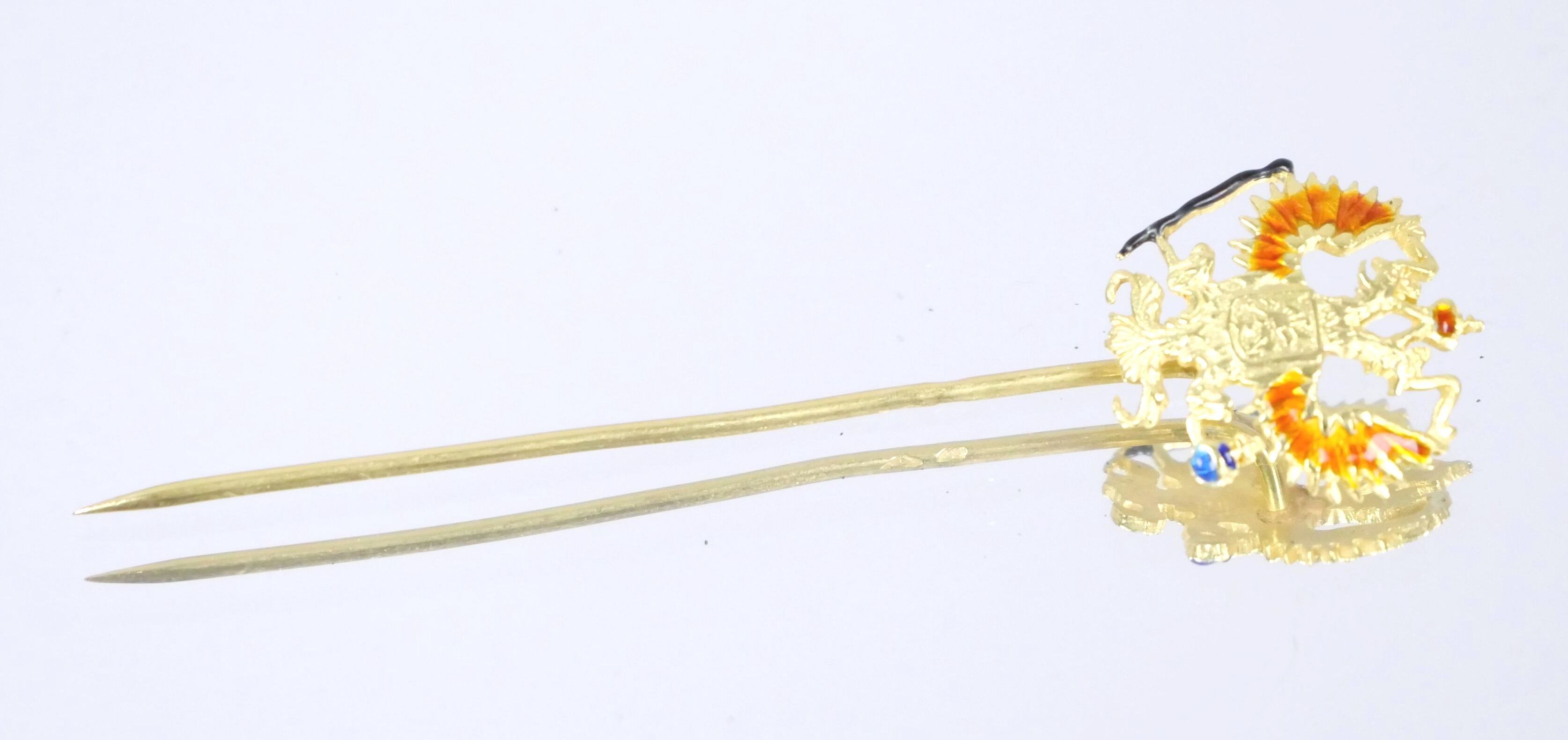 Gold tie pin (585 thousandths), the end formed by the double-headed imperial eagle of Russia centred on the coat of arms of the city of Moscow, enamelled polychrome. The pin is in French gold (750 thousandths).