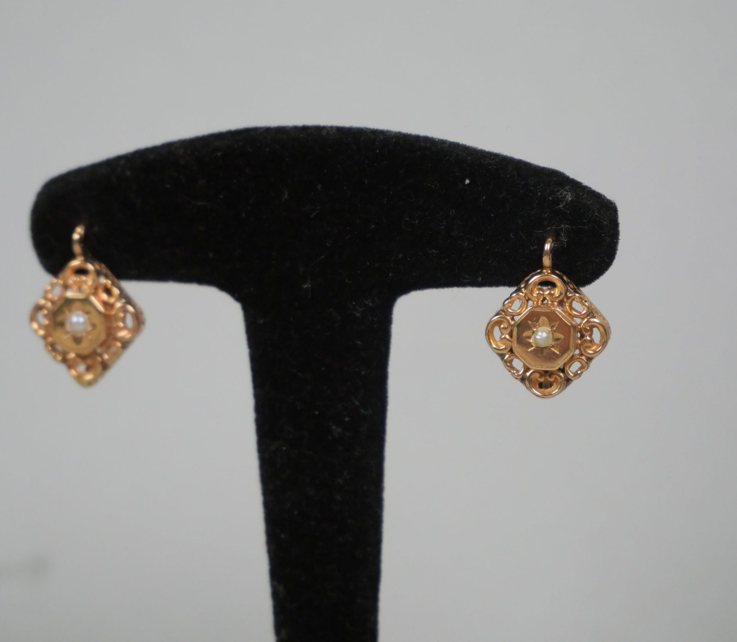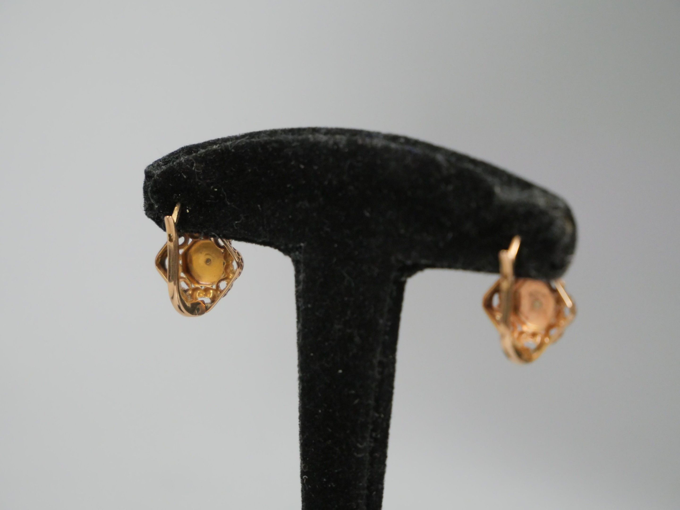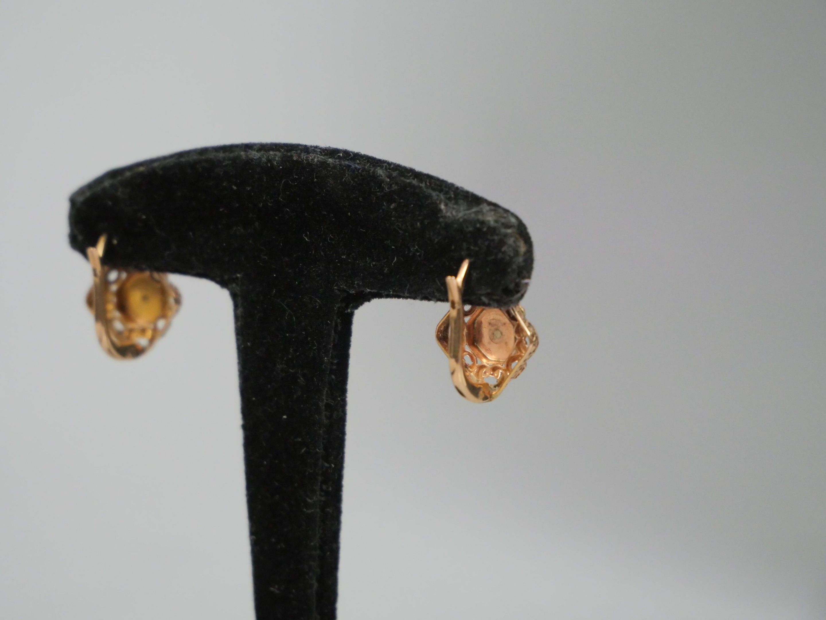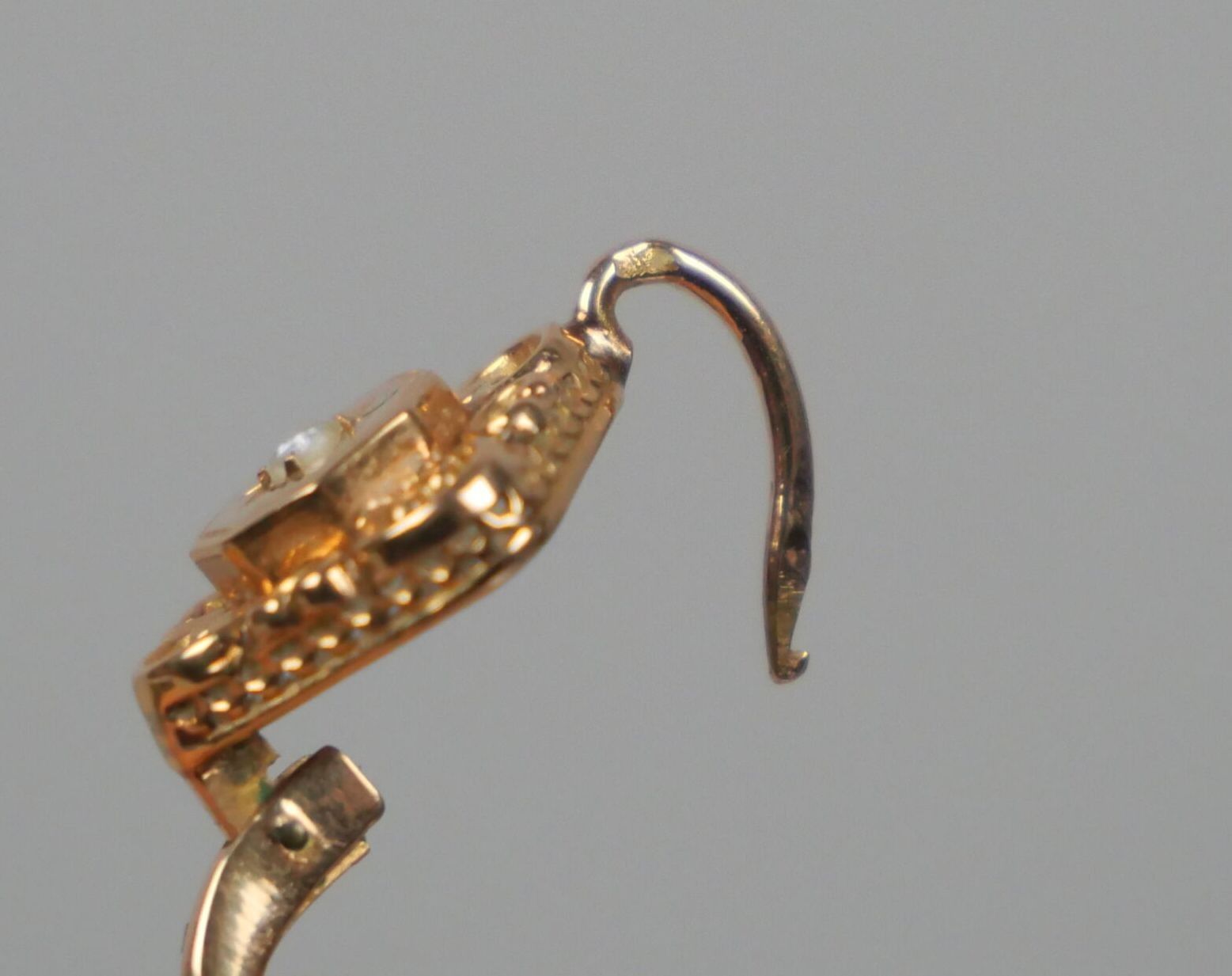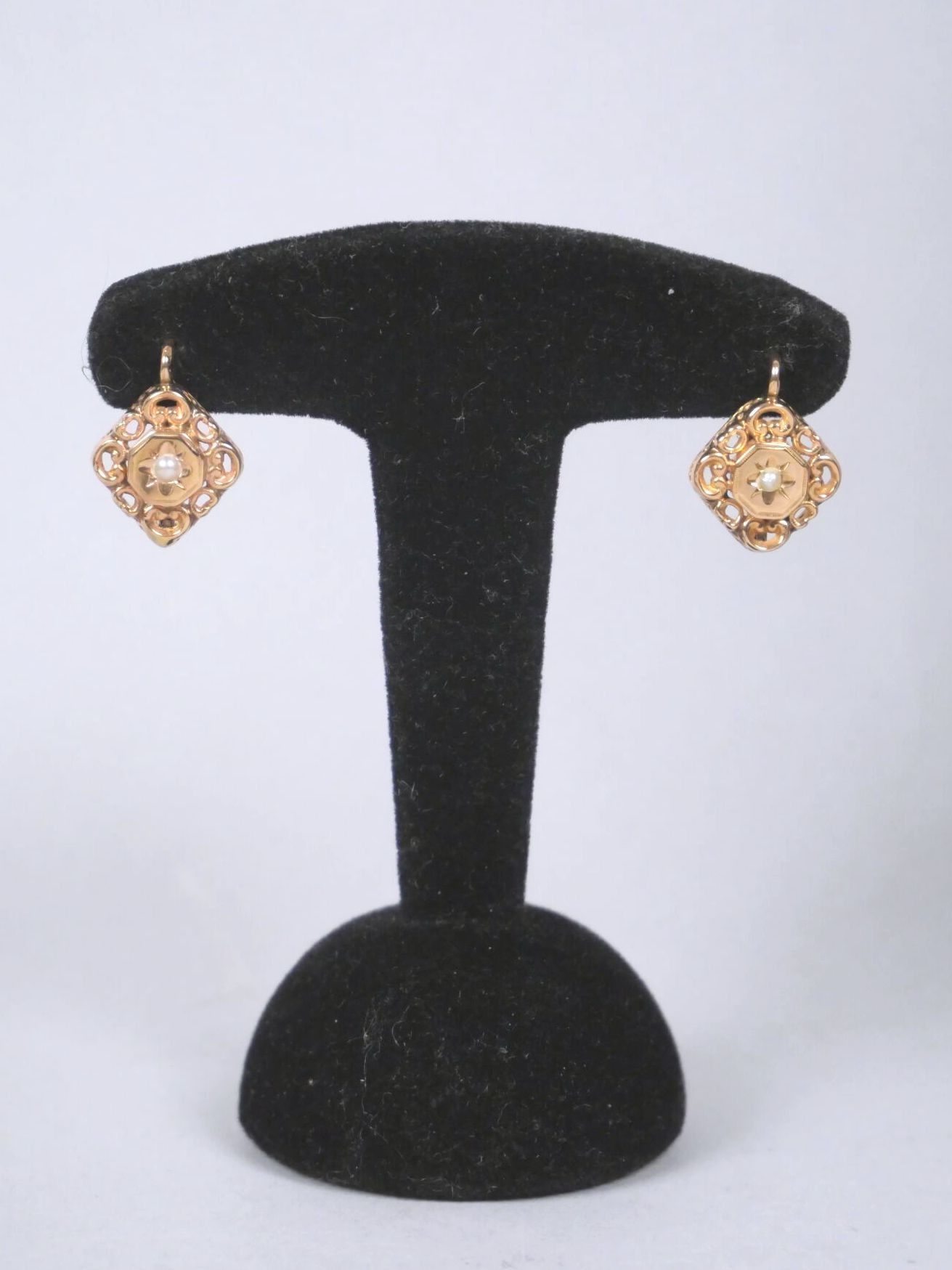 Pair of 750 thousandths yellow gold "dormeuses", centred on a cultured pearl, set in an openwork scrollwork design.