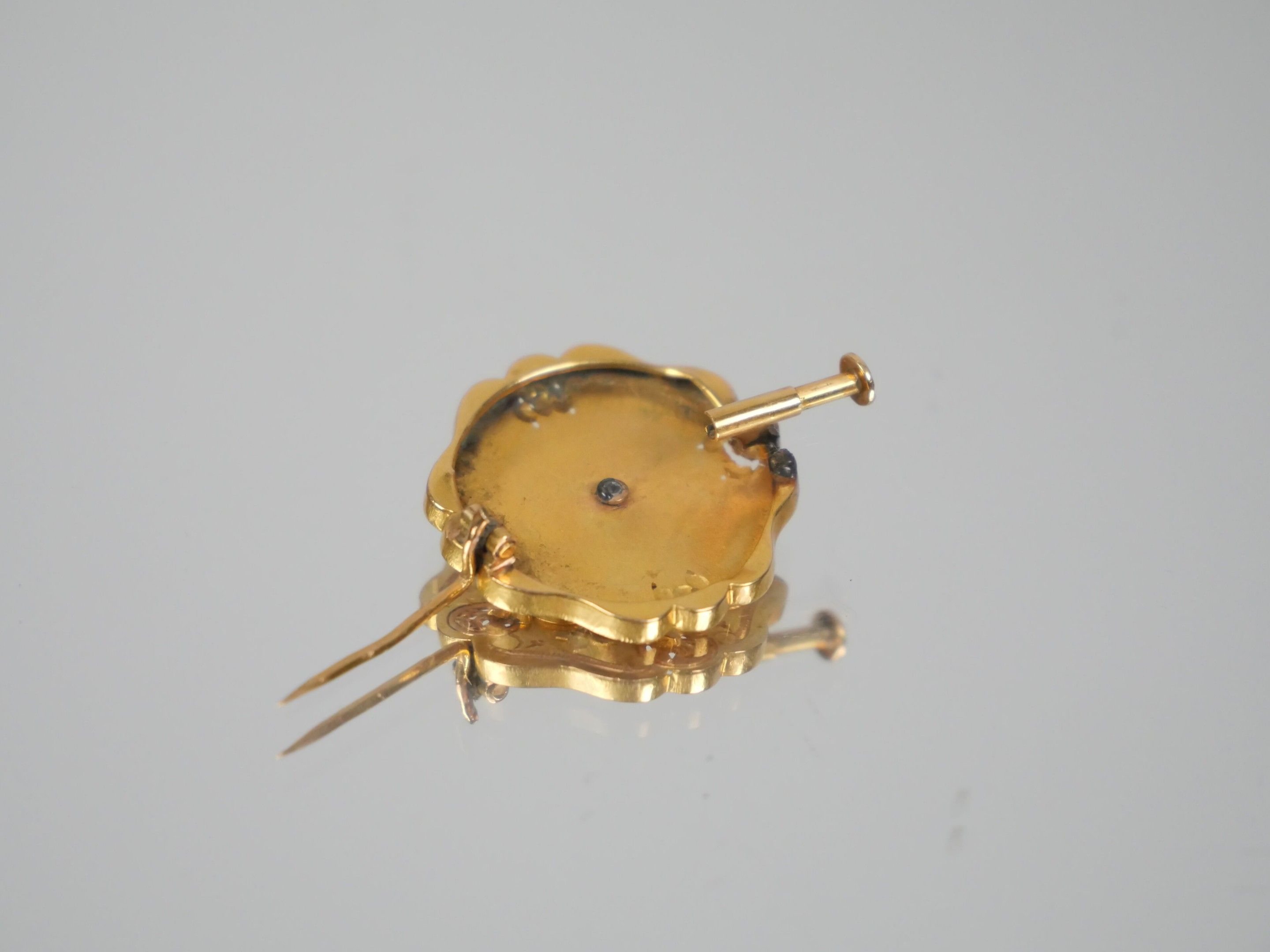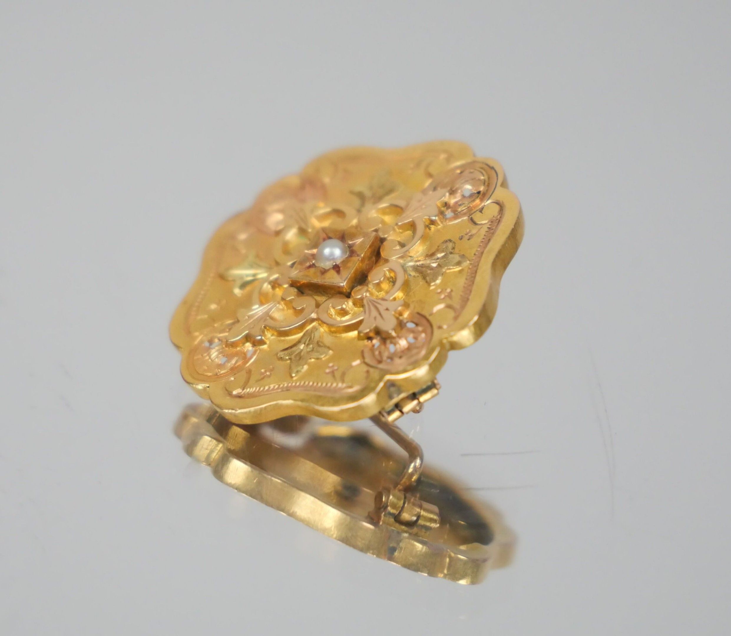 Brooch in 750 thousandths yellow gold with moving contours and rich chased and partially openwork decoration of fleurons and foliate scrolls, centred on a cultured half-pearl.