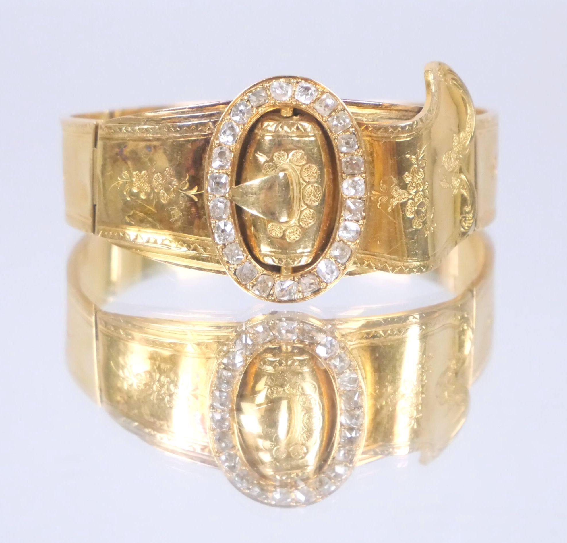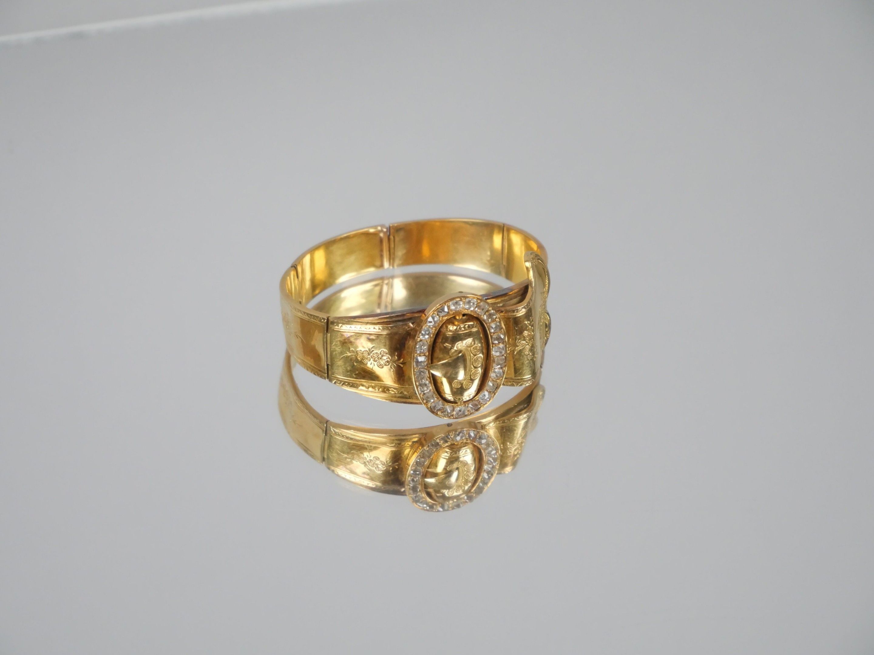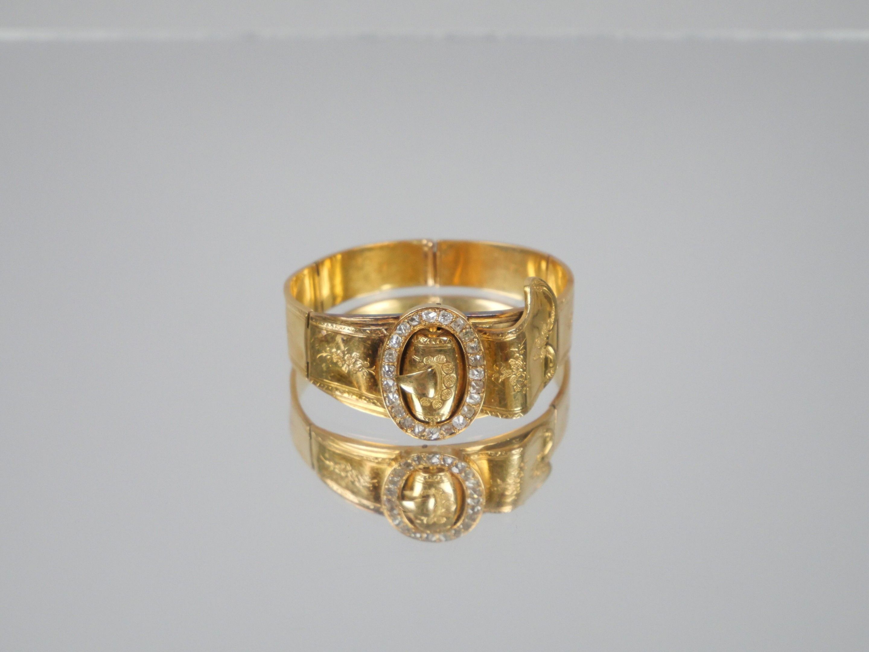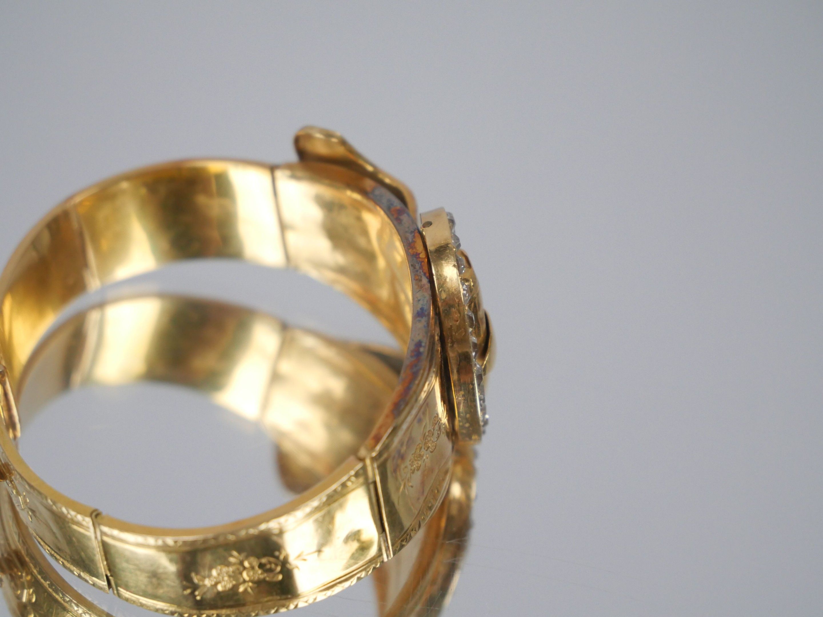 Openwork articulated bracelet in 750 thousandths yellow gold adorned with a belt buckle motif decorated with chased floral friezes, the buckle set with 23 brilliant old-cut diamonds. Ratchet clasp.