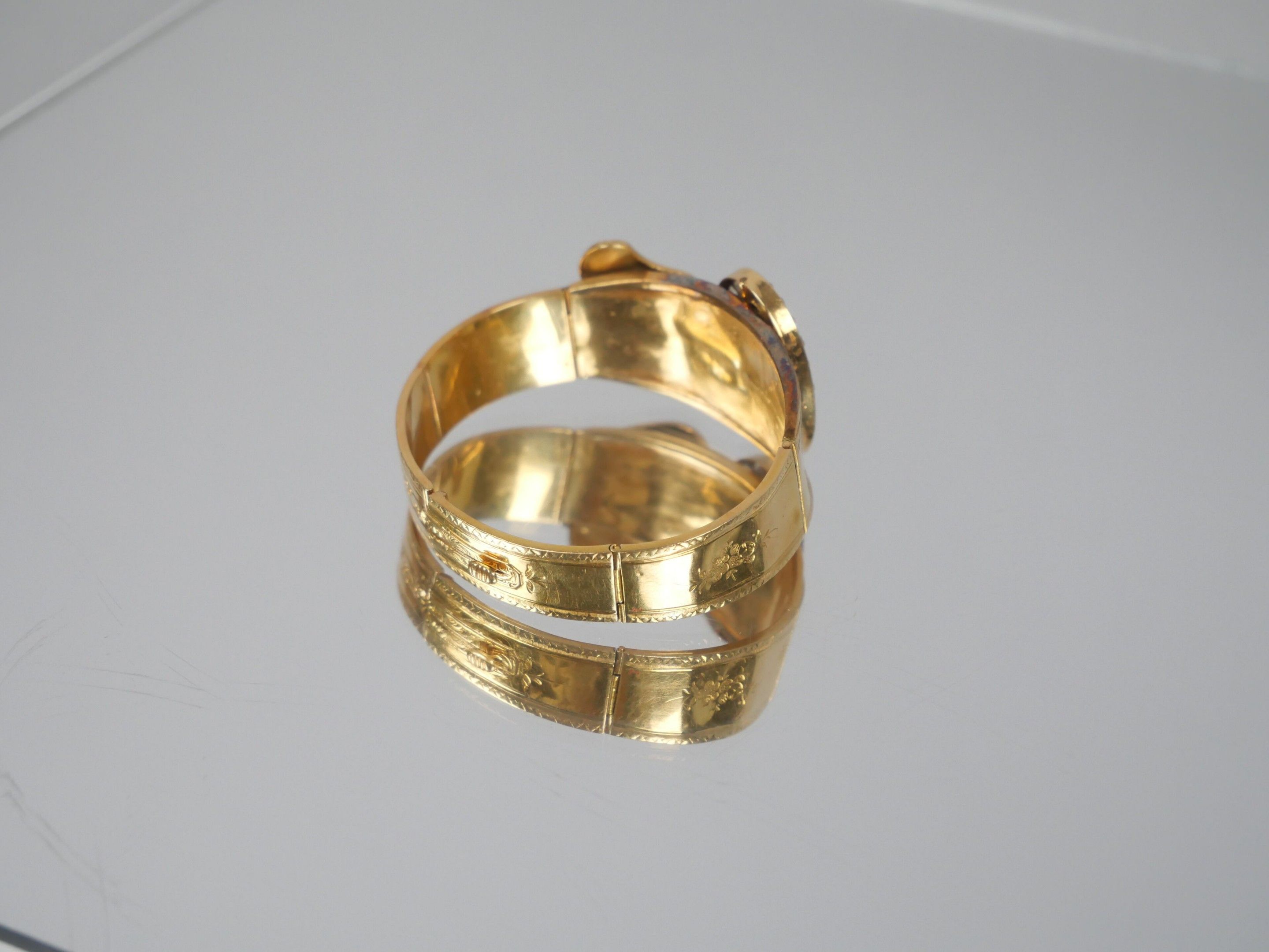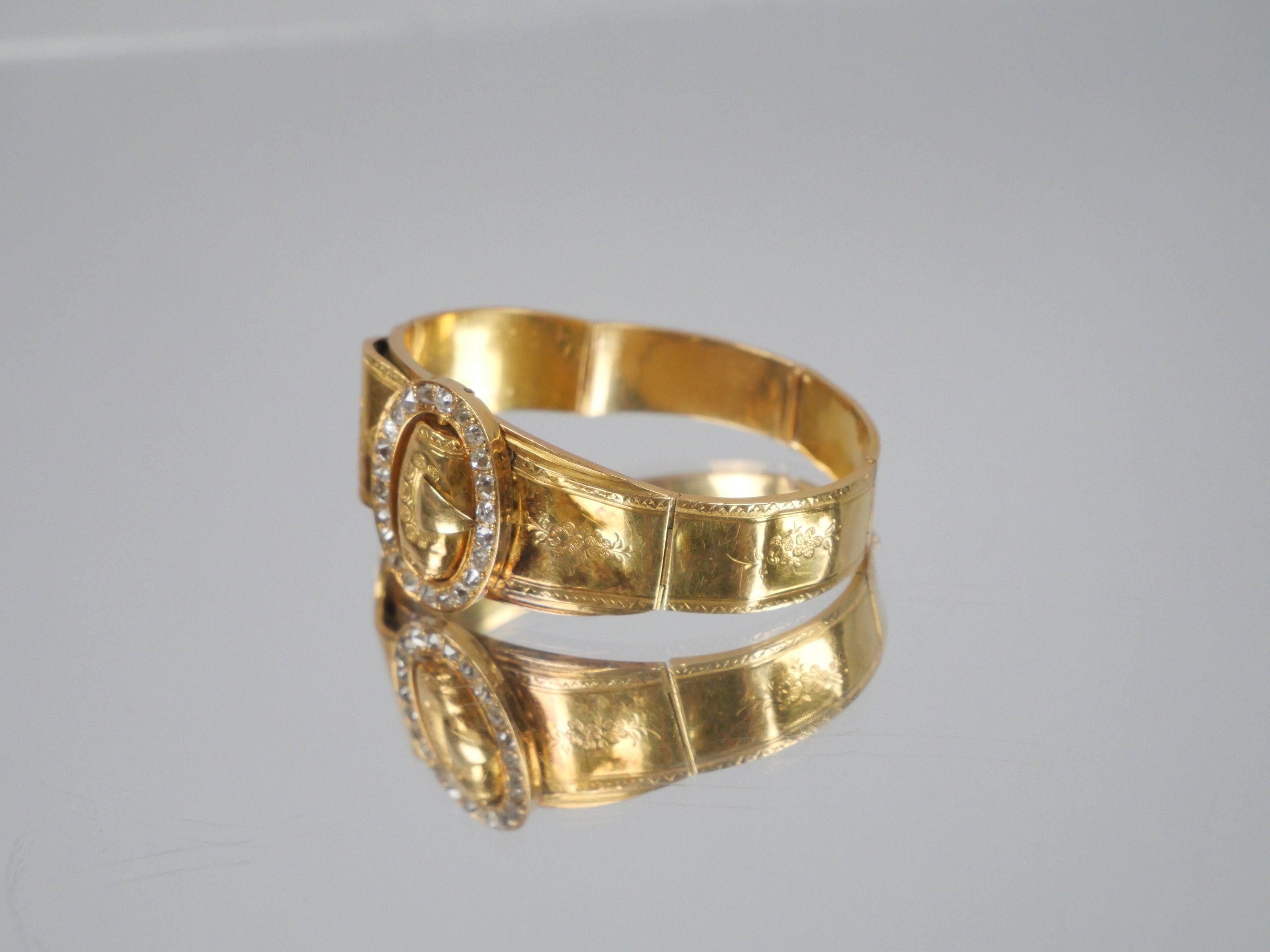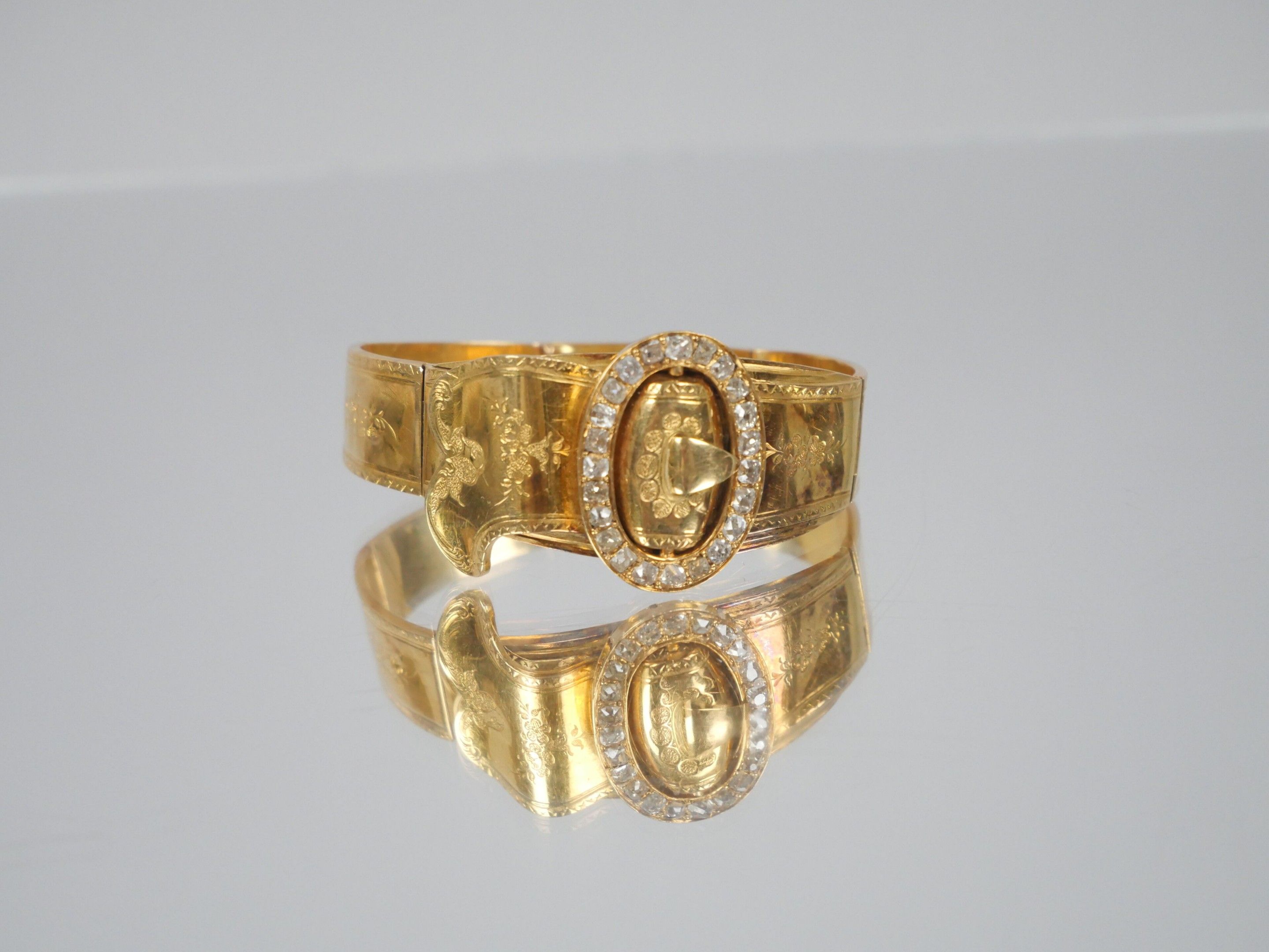 Openwork articulated bracelet in 750 thousandths yellow gold adorned with a belt buckle motif decorated with chased floral friezes, the buckle set with 23 brilliant old-cut diamonds. Ratchet clasp.