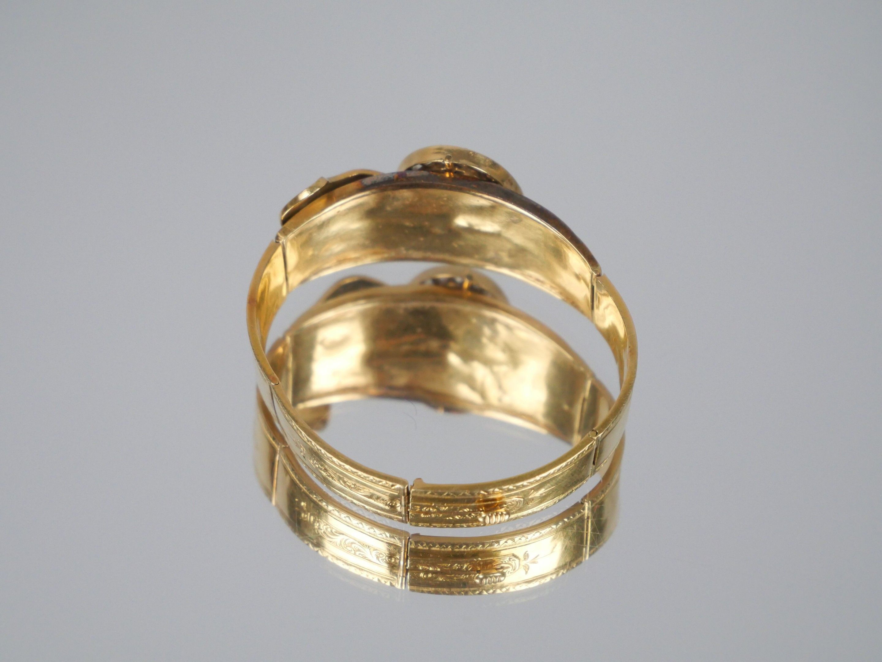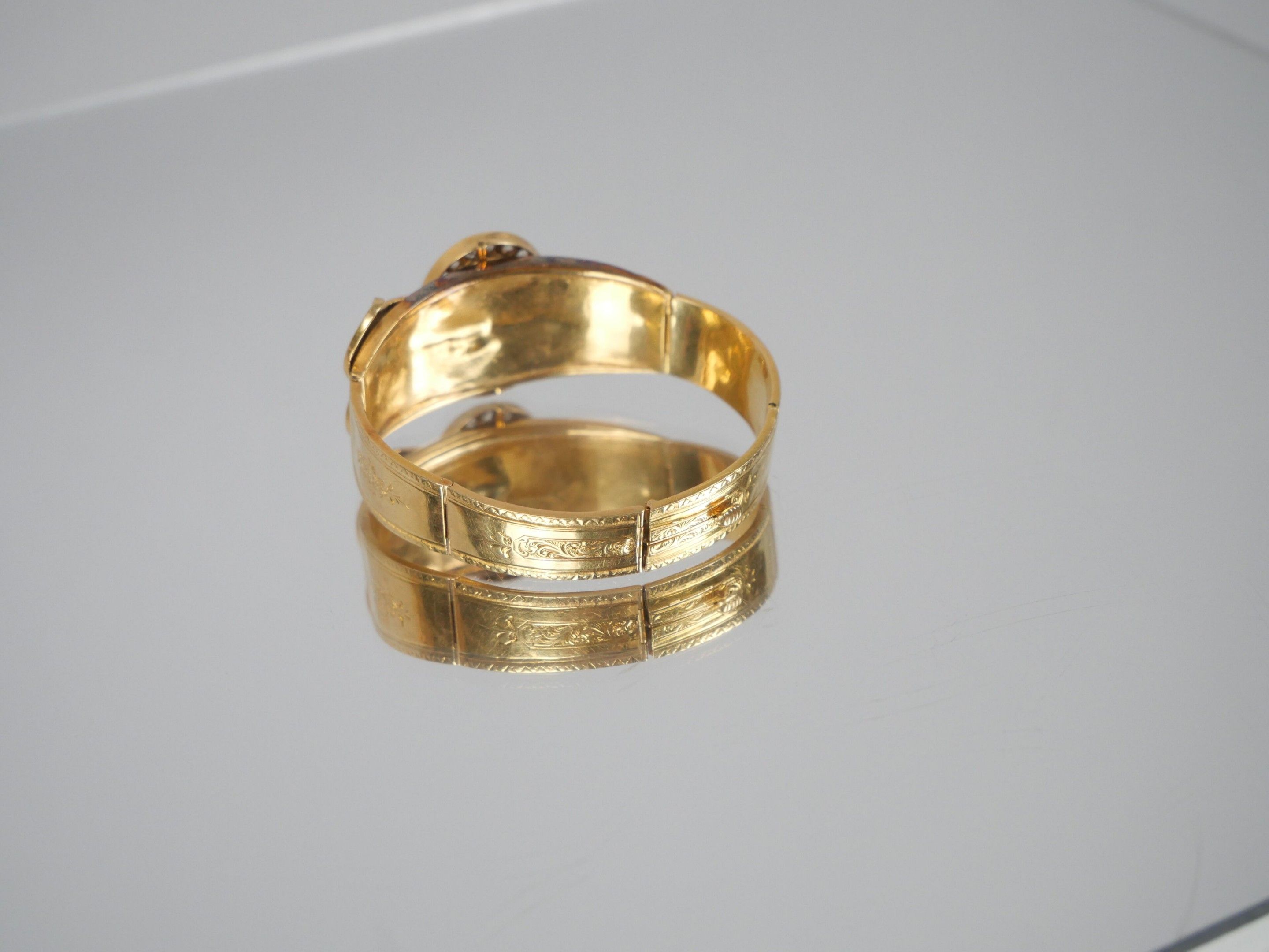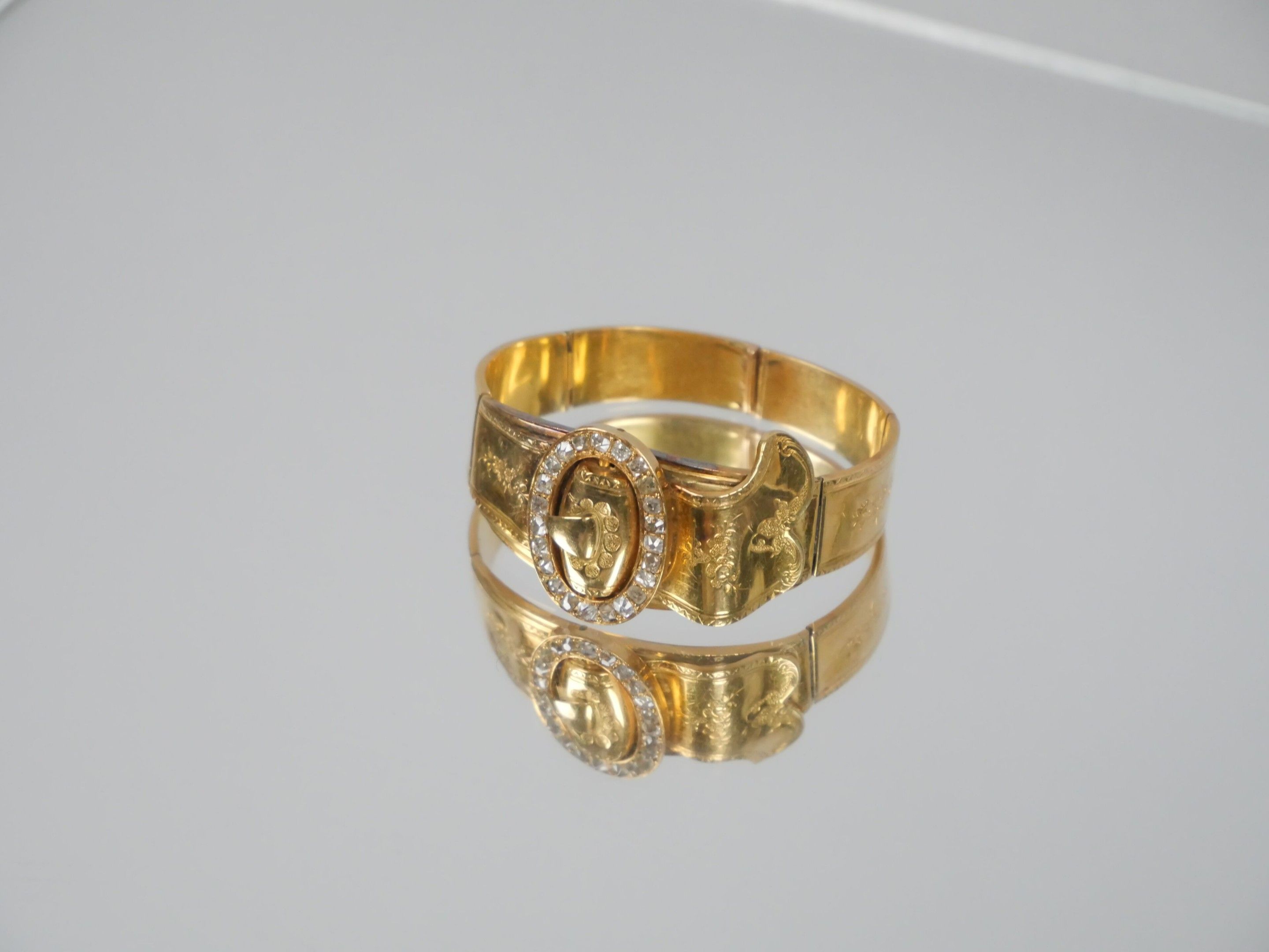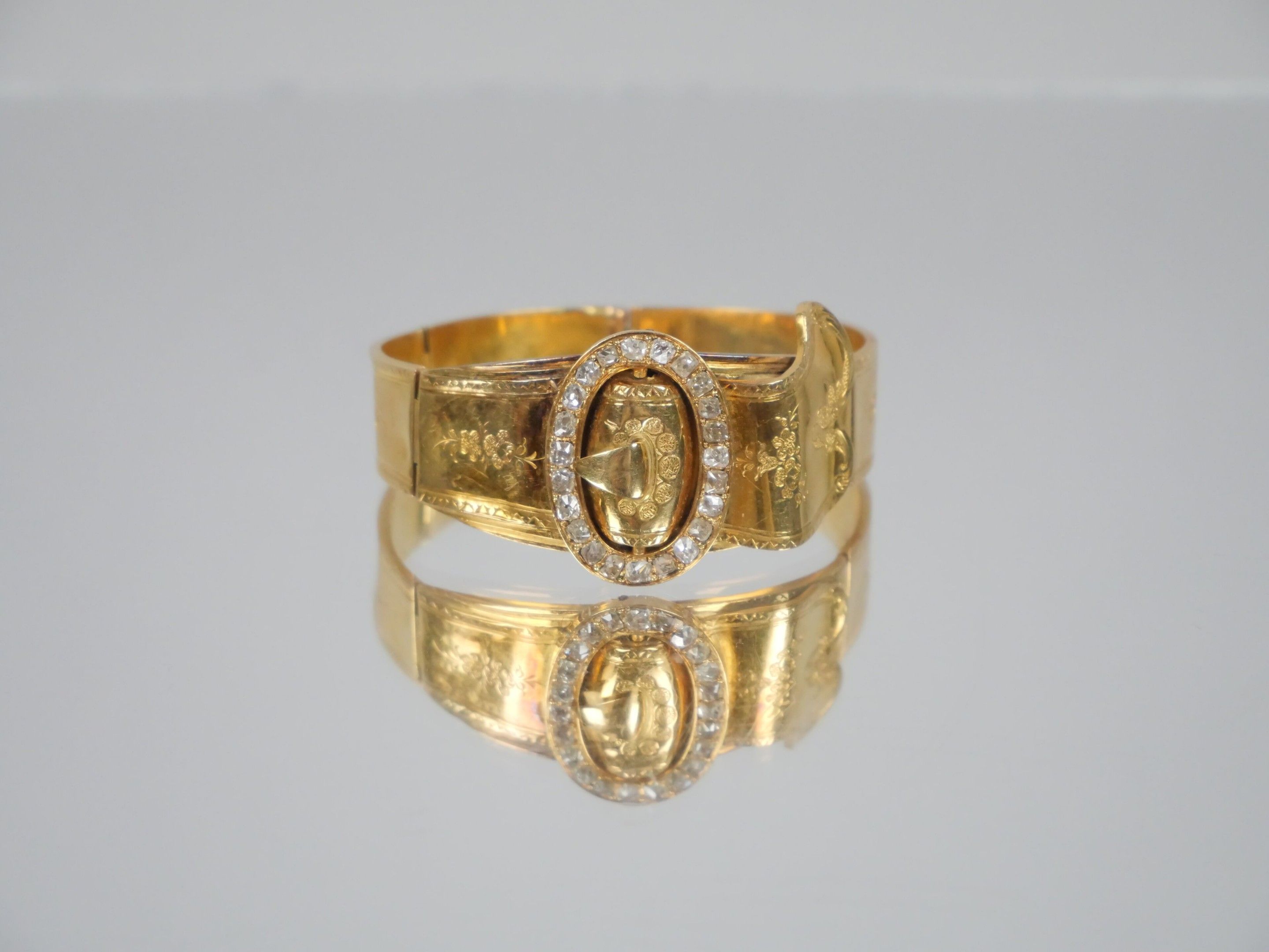 Openwork articulated bracelet in 750 thousandths yellow gold adorned with a belt buckle motif decorated with chased floral friezes, the buckle set with 23 brilliant old-cut diamonds. Ratchet clasp.
