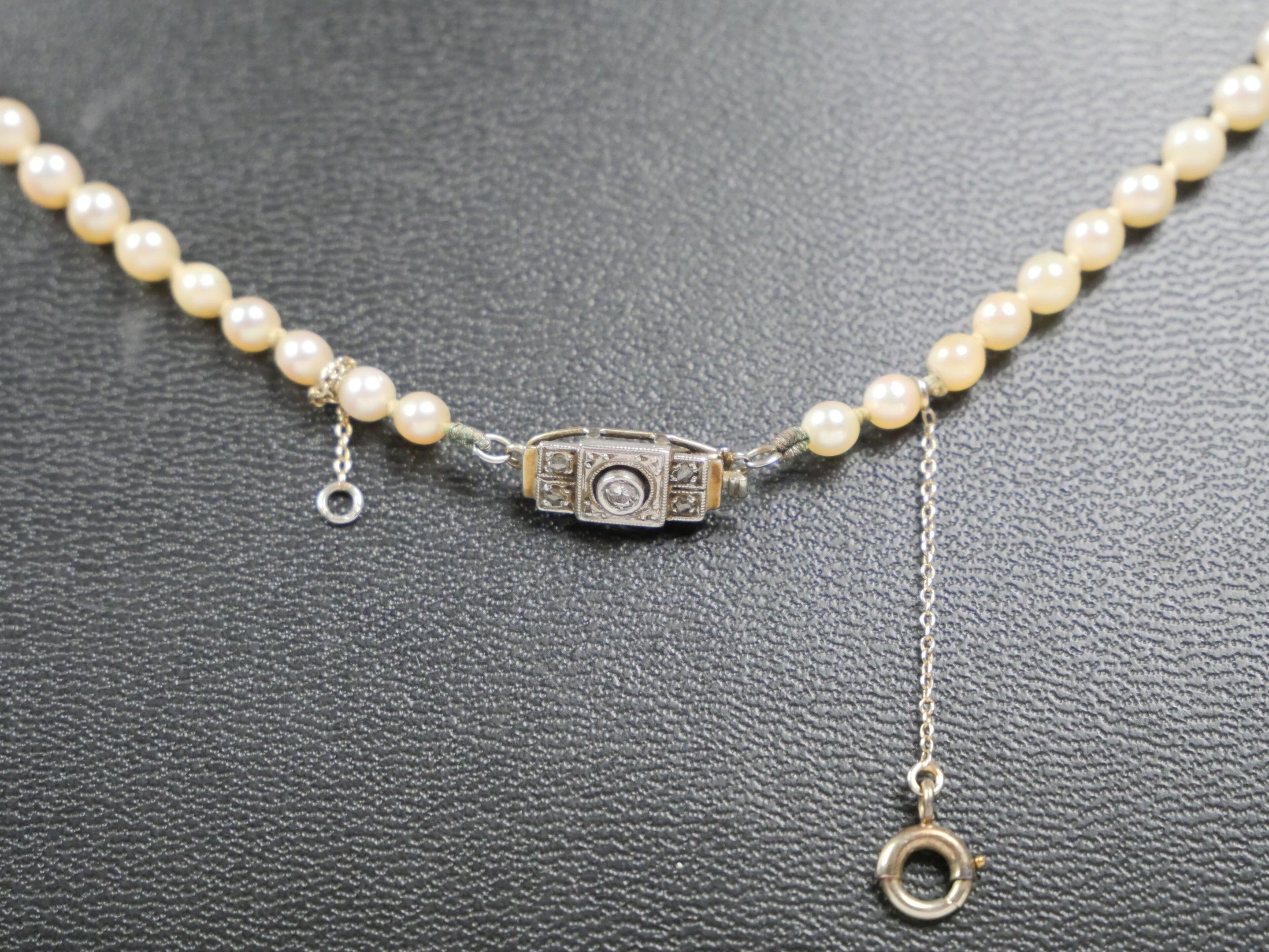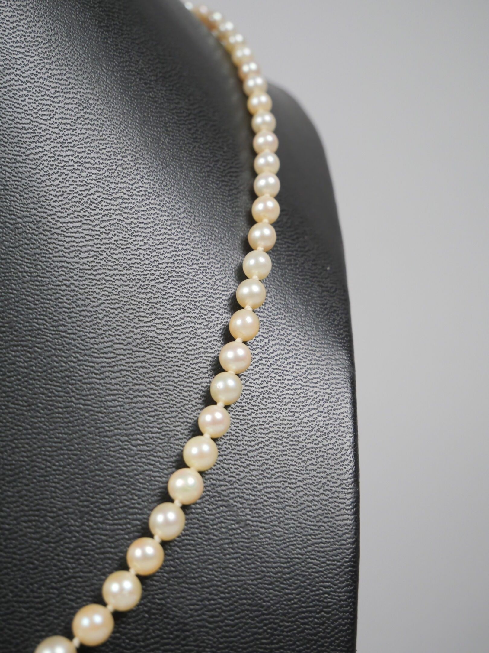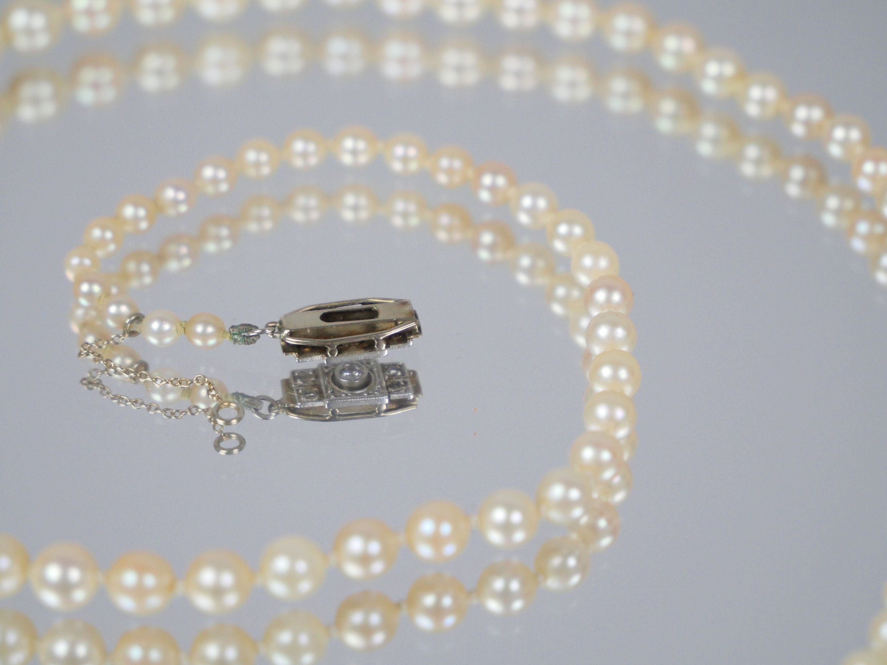 Necklace of 85 cultured pearls. Ratchet clasp in 750 thousandths white gold embellished with a small old-cut diamond. Safety chain.