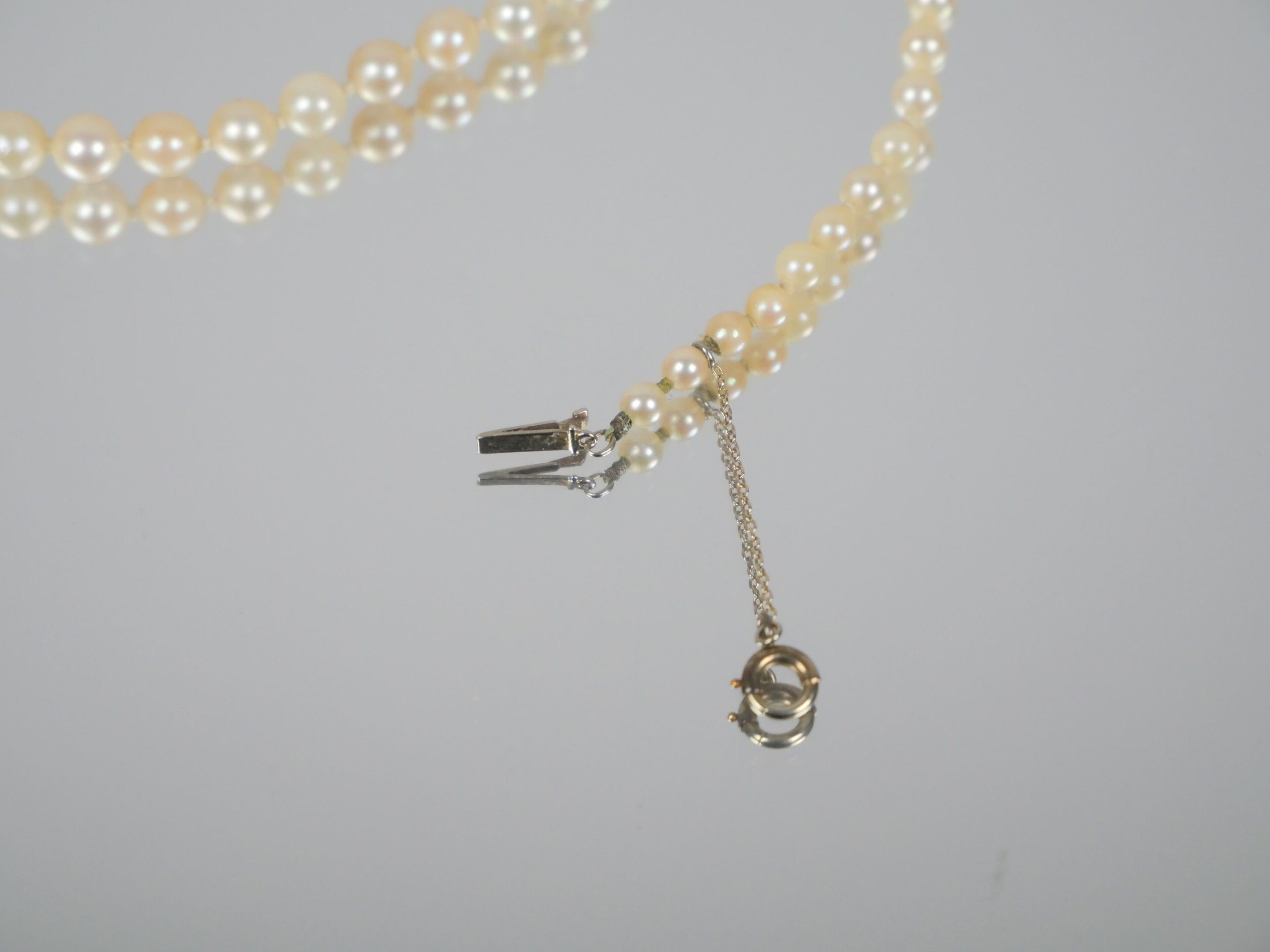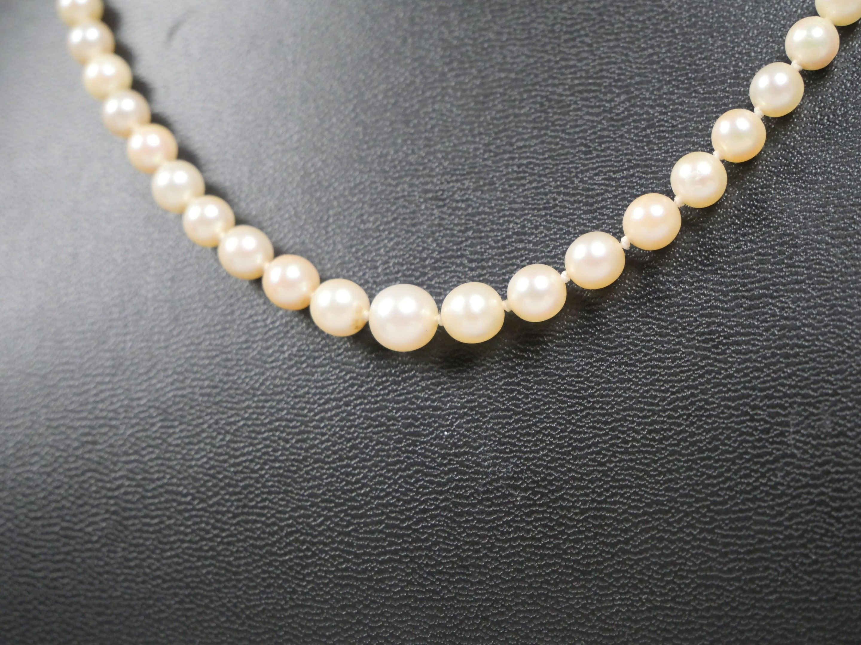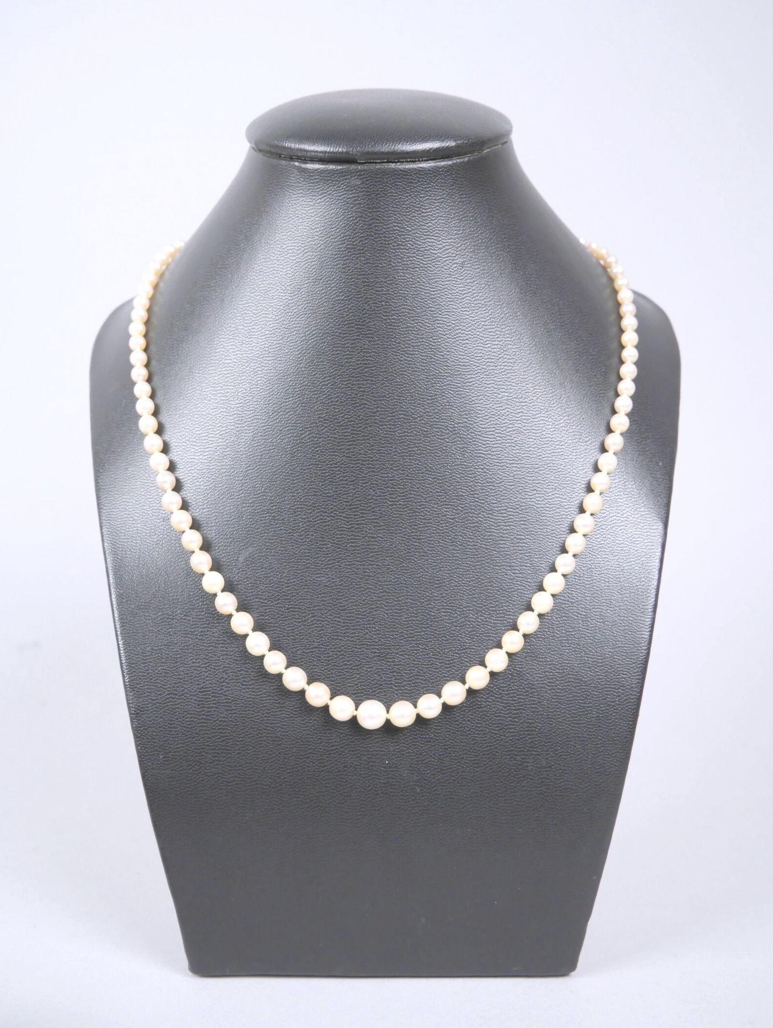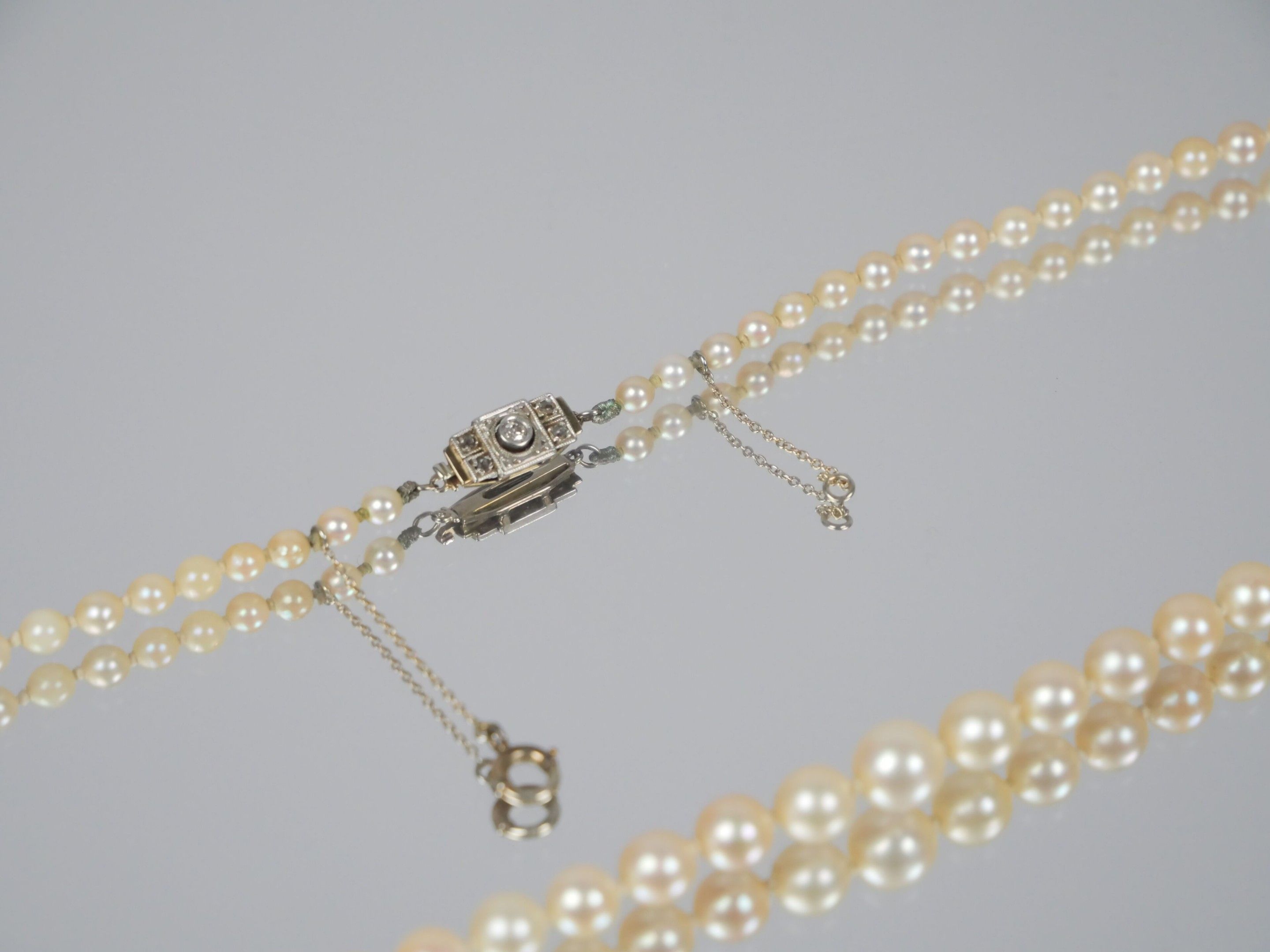 Necklace of 85 cultured pearls. Ratchet clasp in 750 thousandths white gold embellished with a small old-cut diamond. Safety chain.