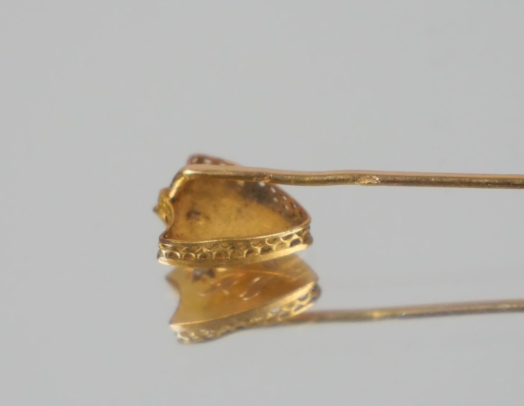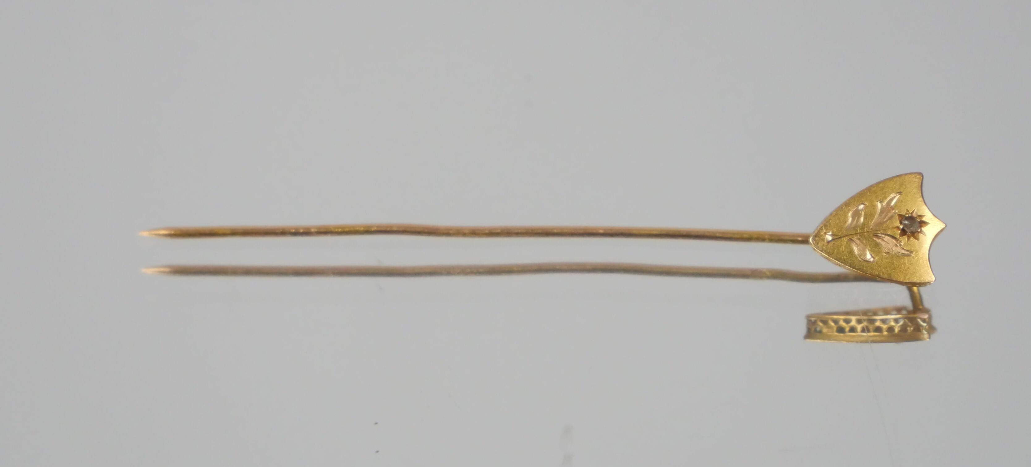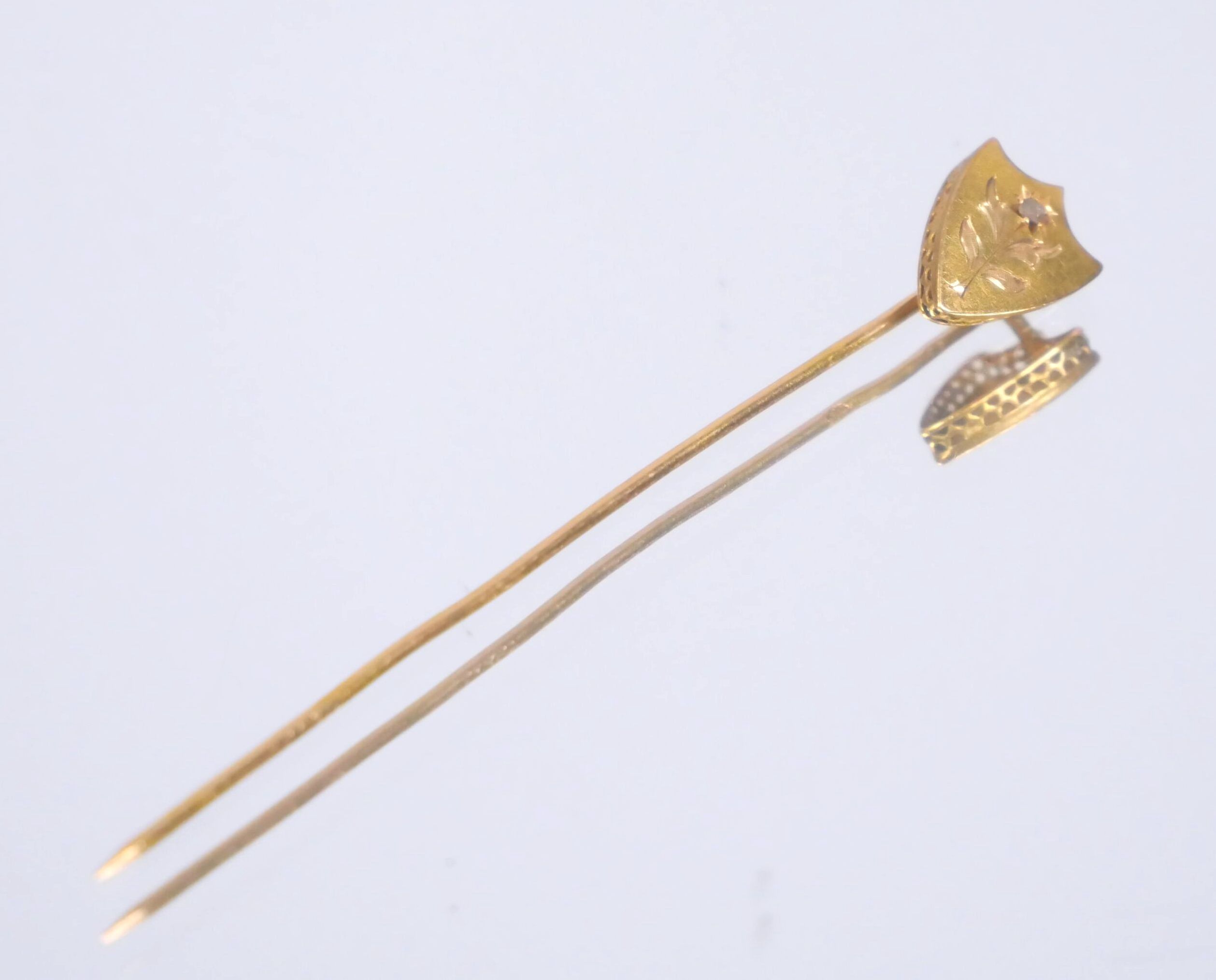 Tie-pin in 750 thousandths yellow gold, the head in the shape of a shield with a chased flower.