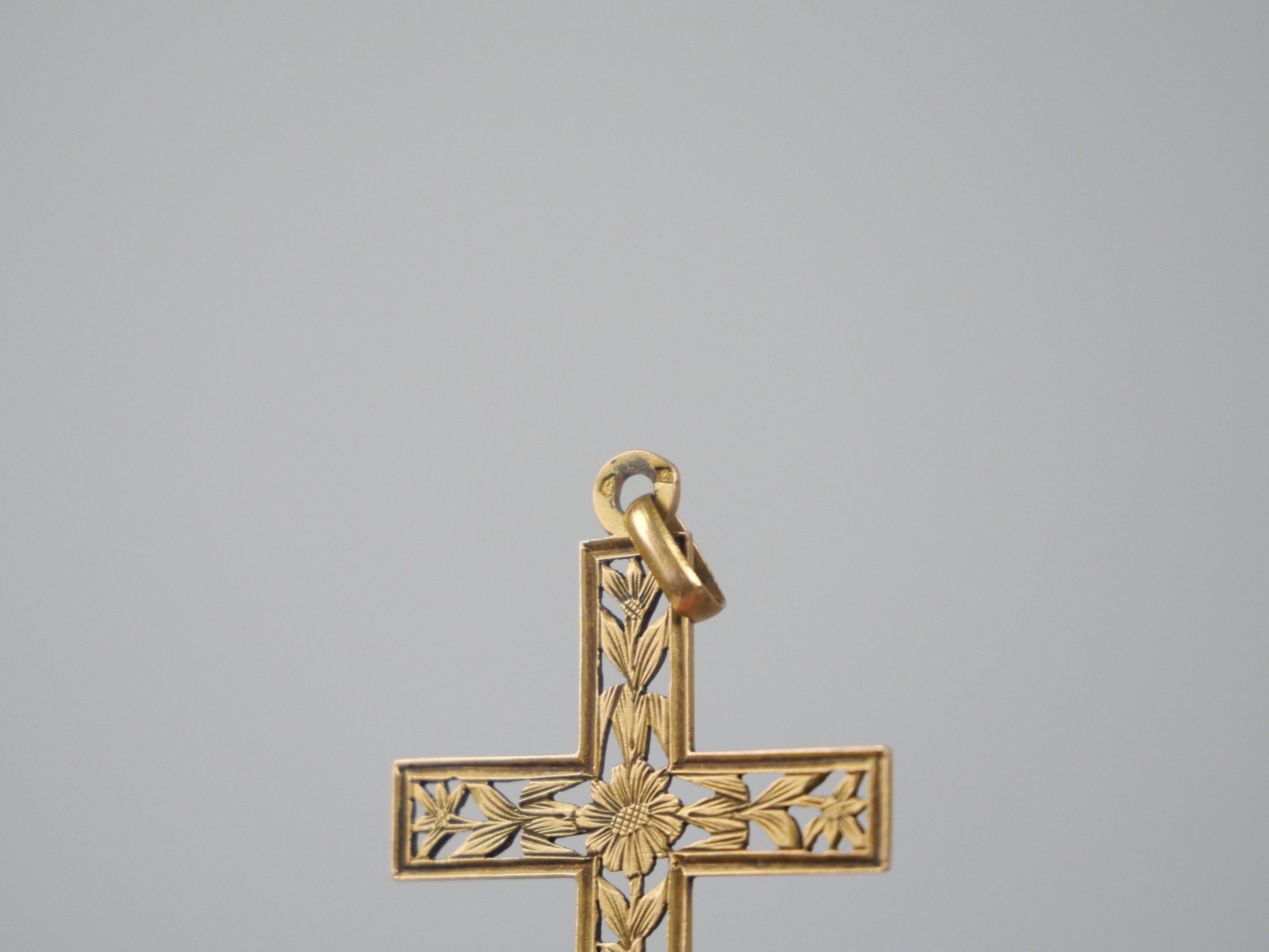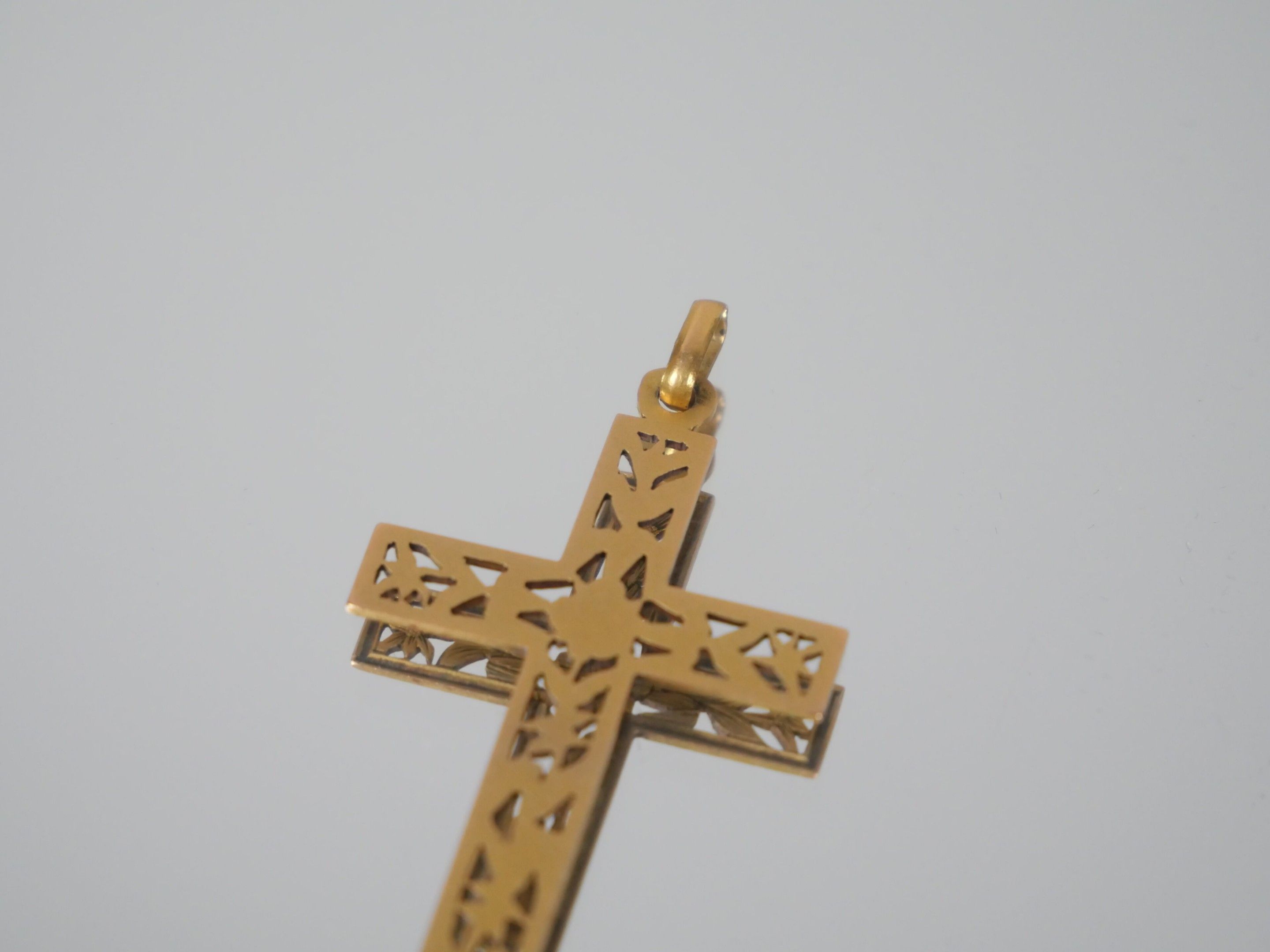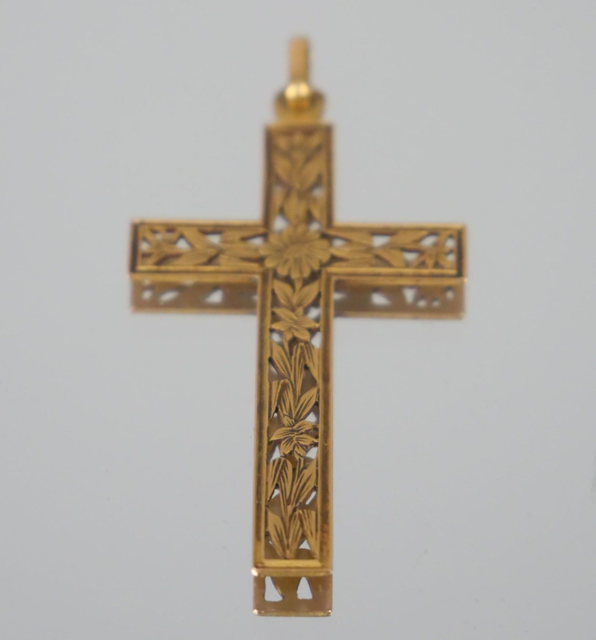 Pendant cross in 750 thousandths yellow gold with an openwork design of engraved flowering branches.
