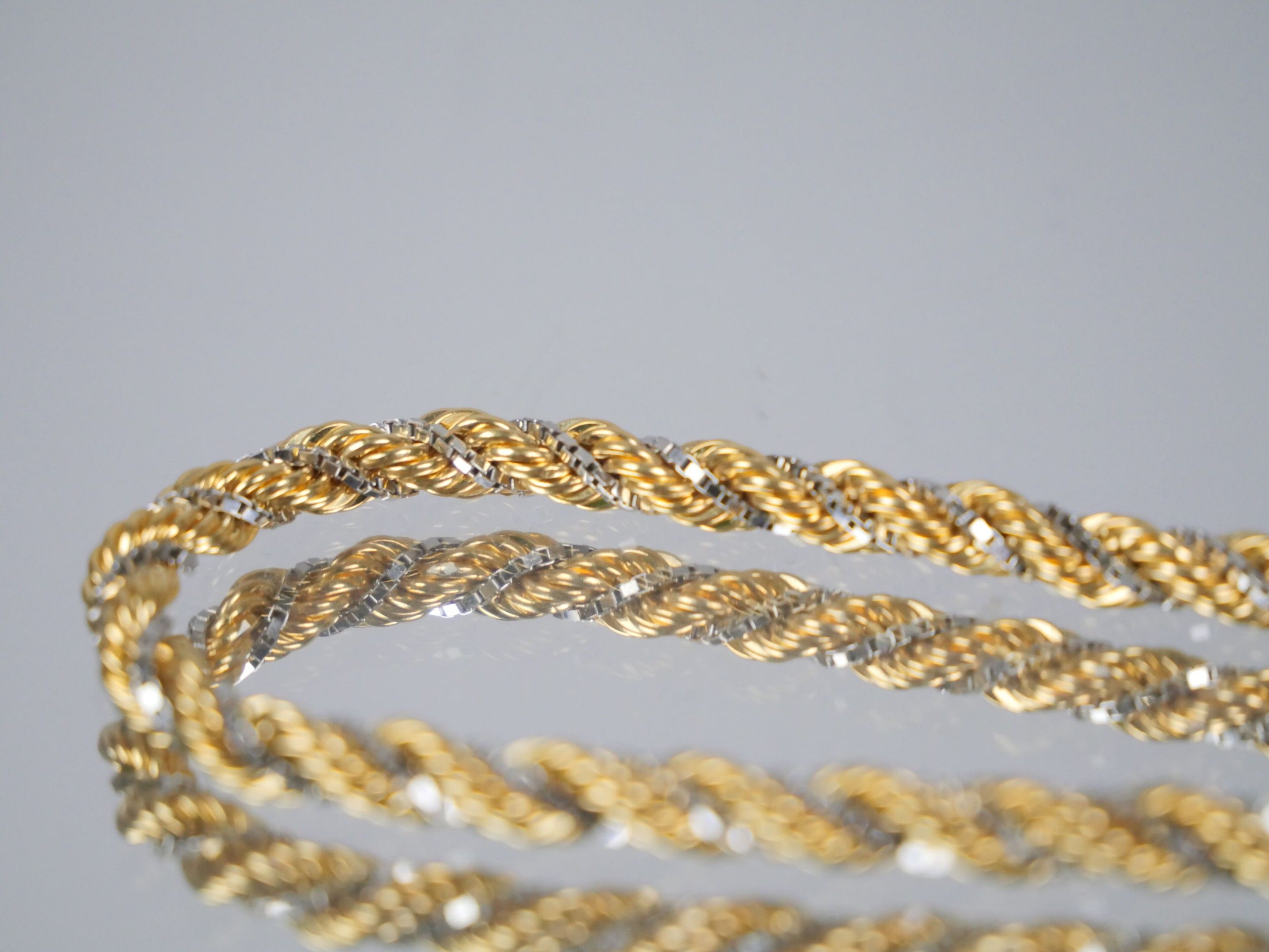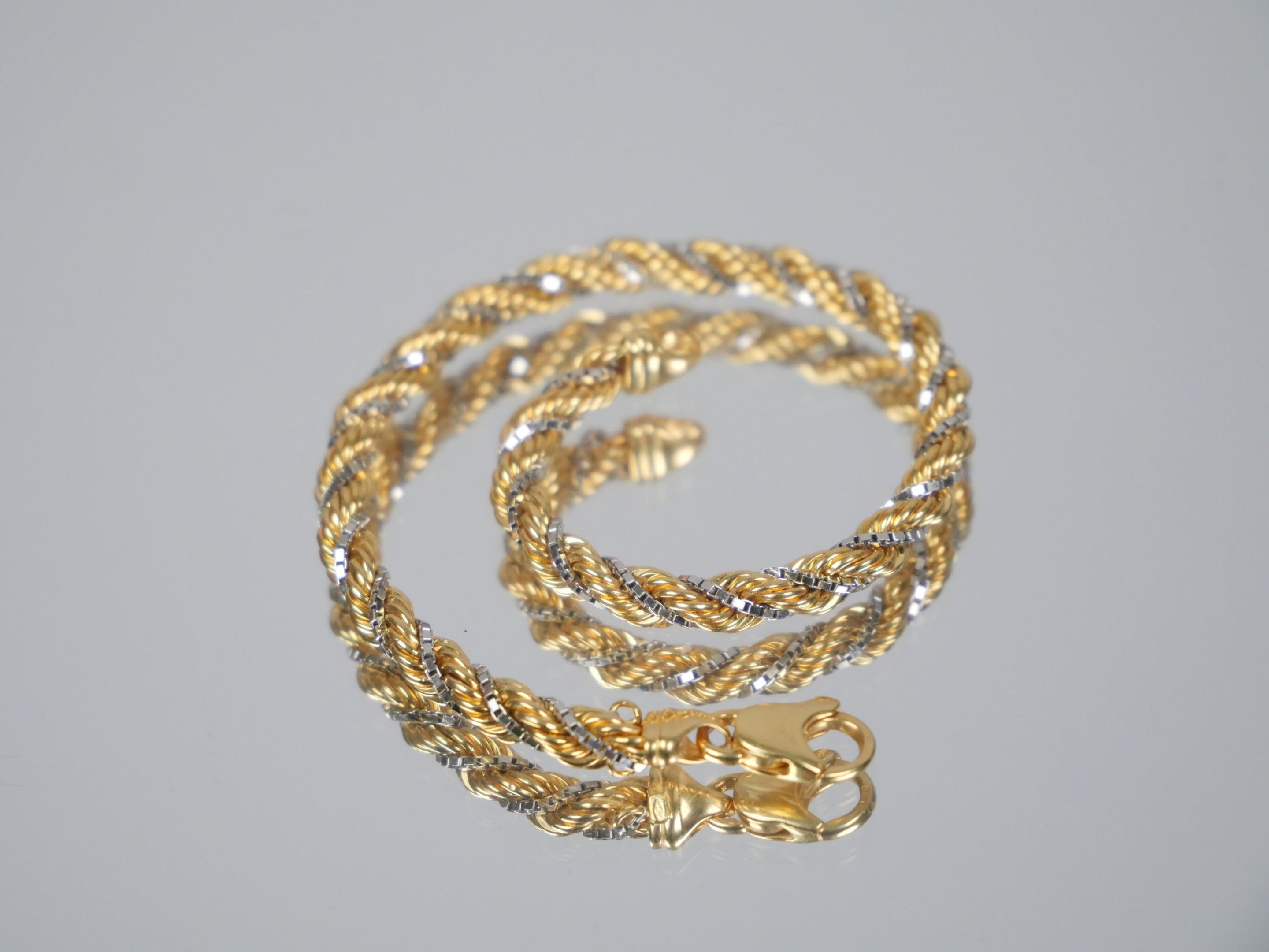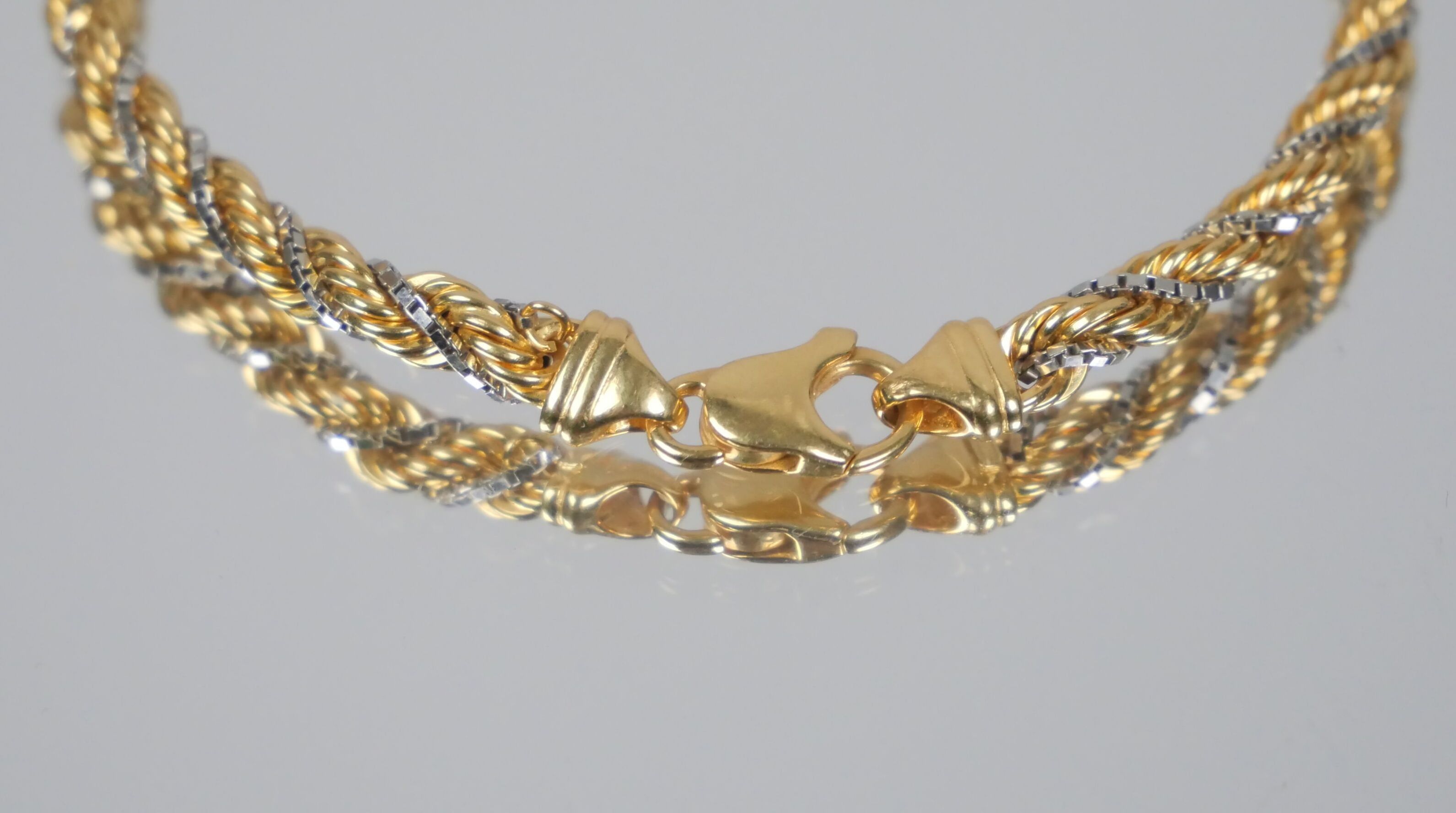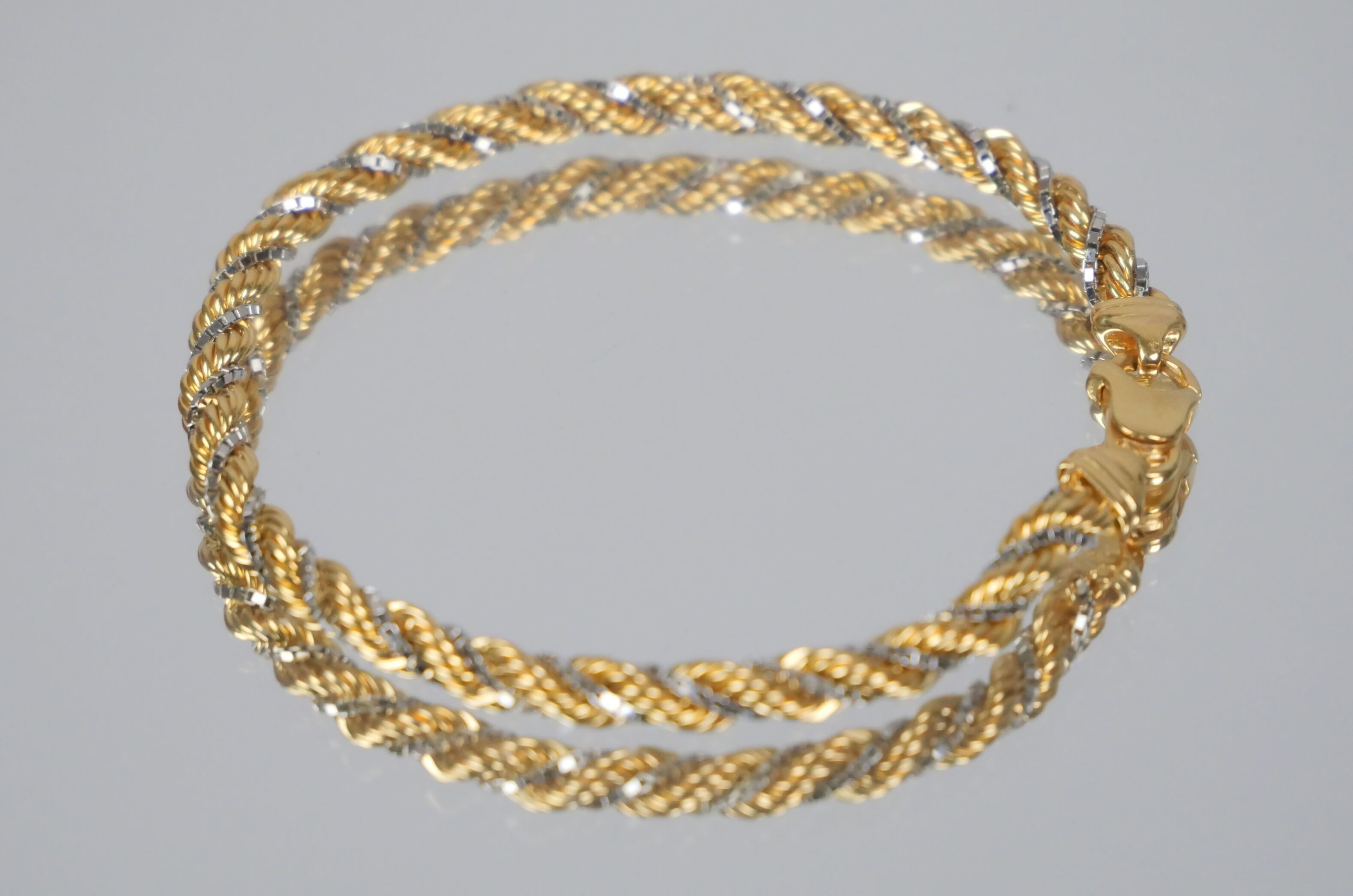 Bracelet in yellow and white gold 750 thousandths with twisted mesh. Lobster clasp.