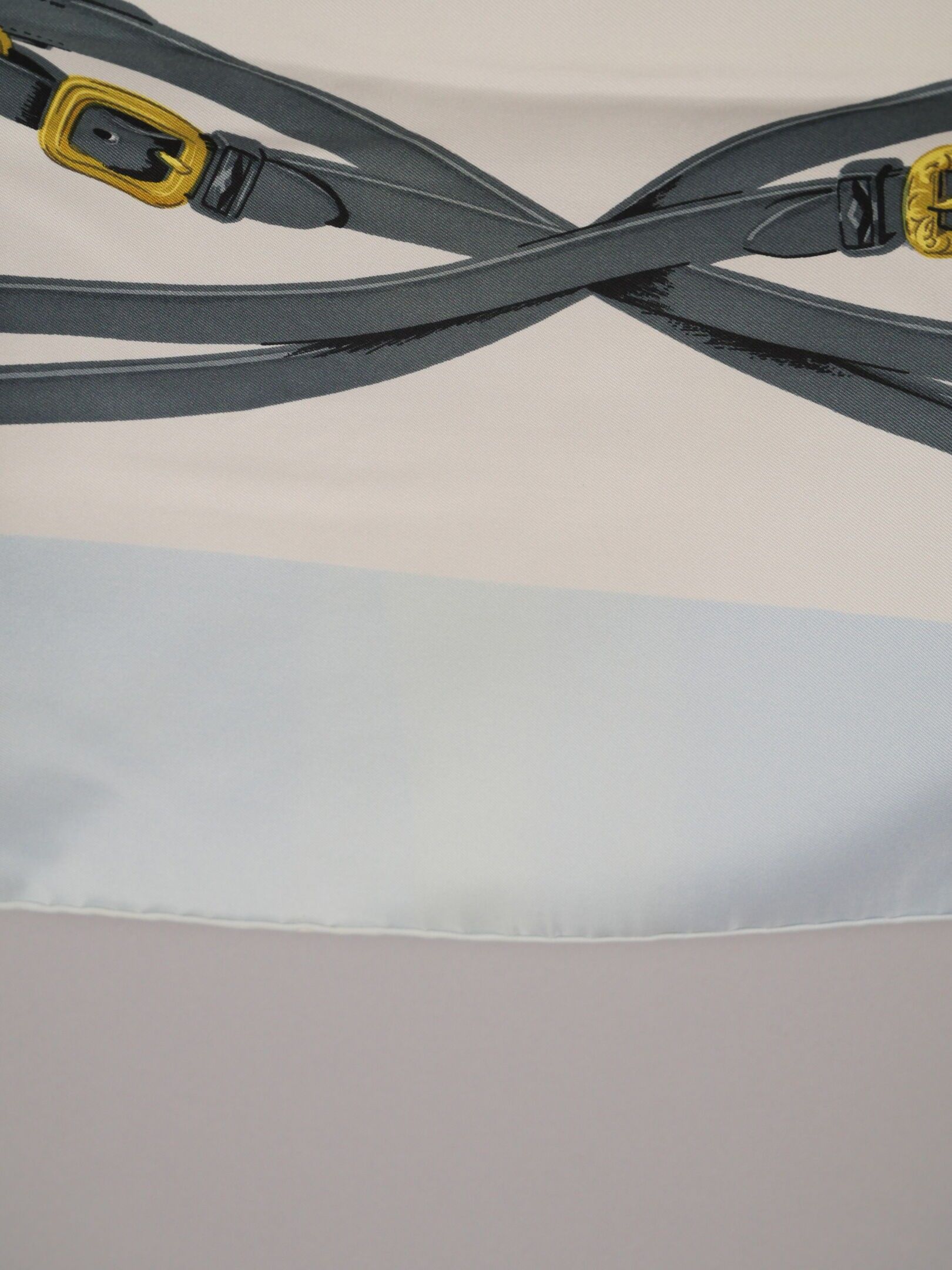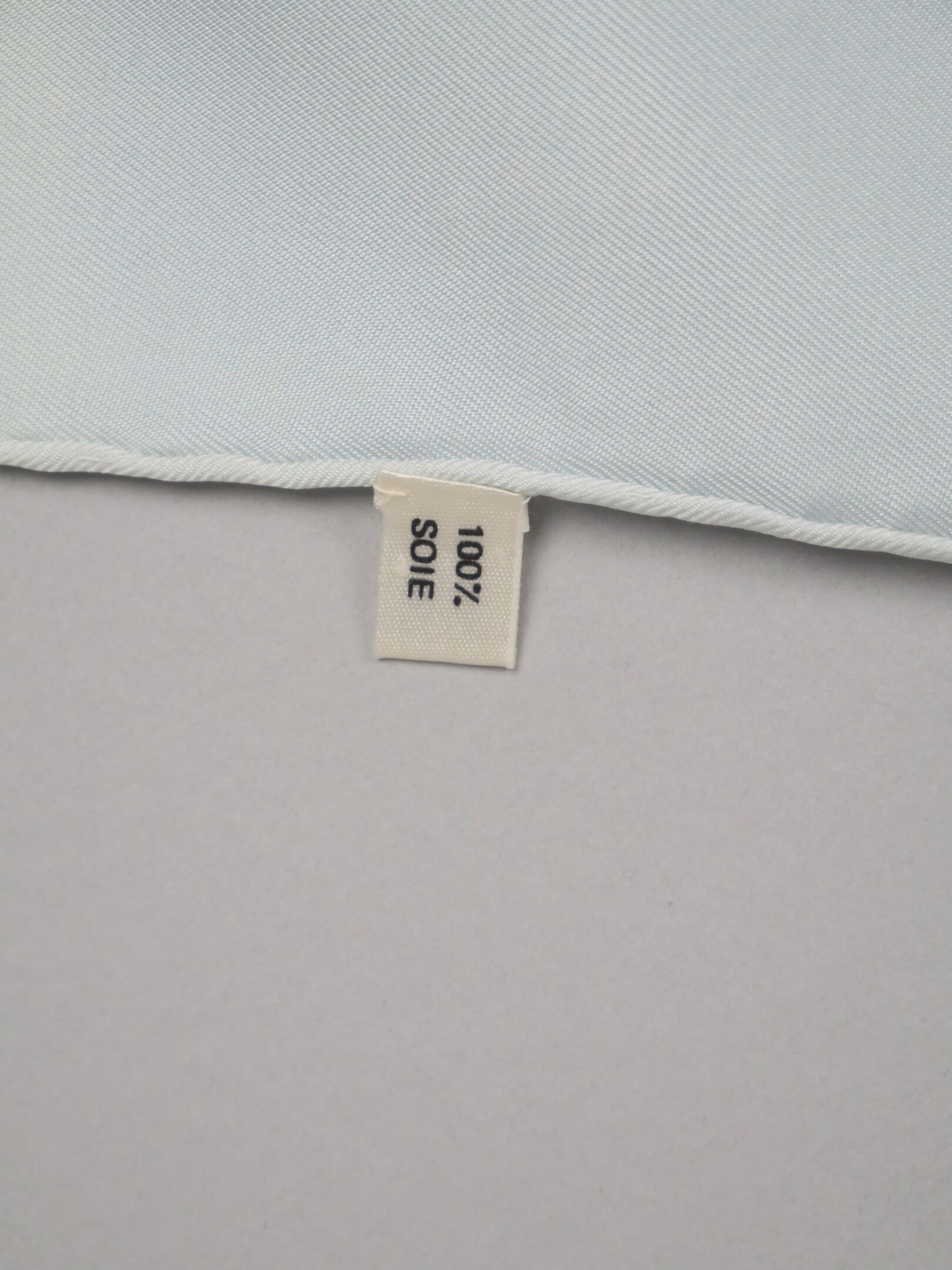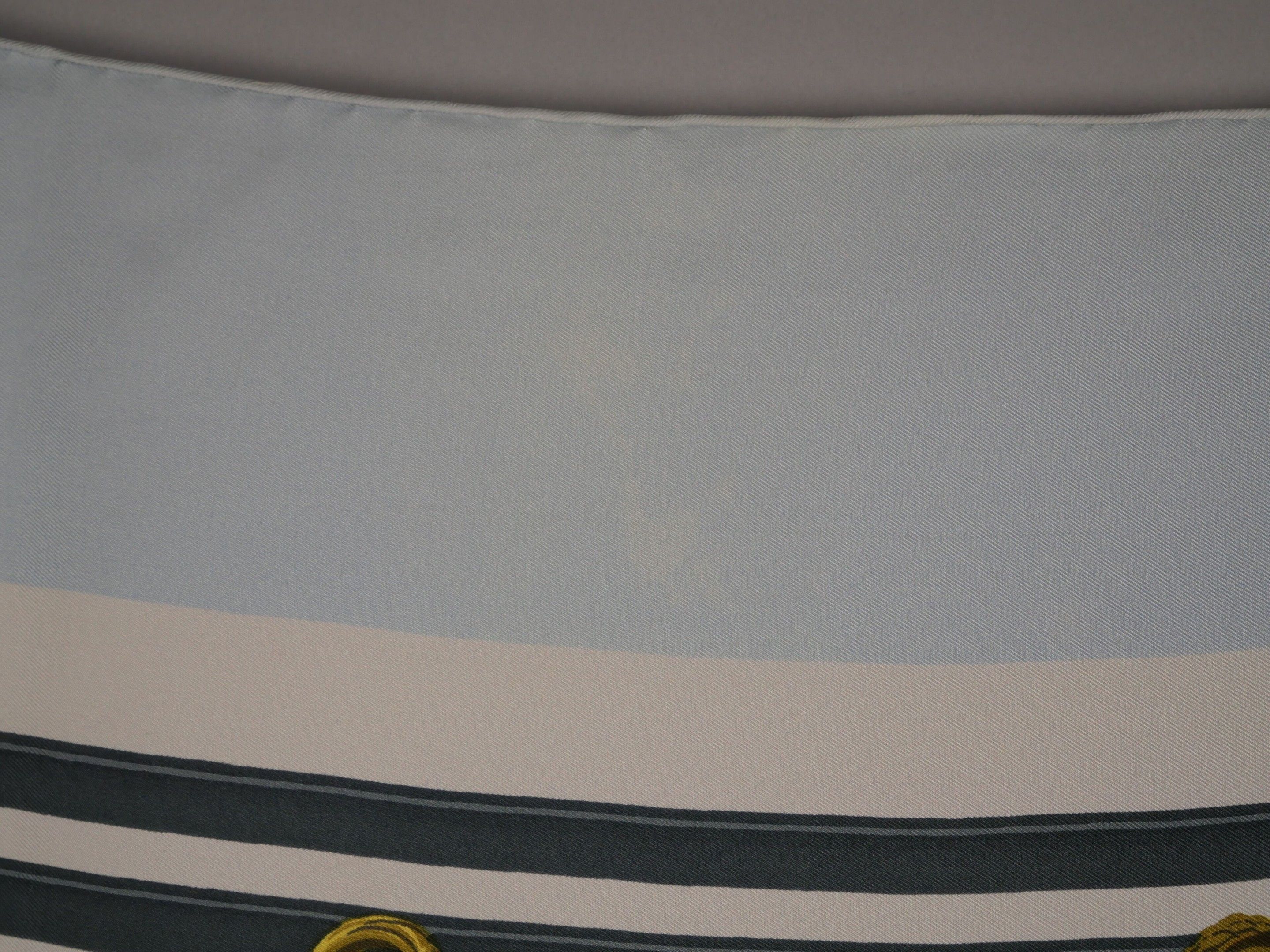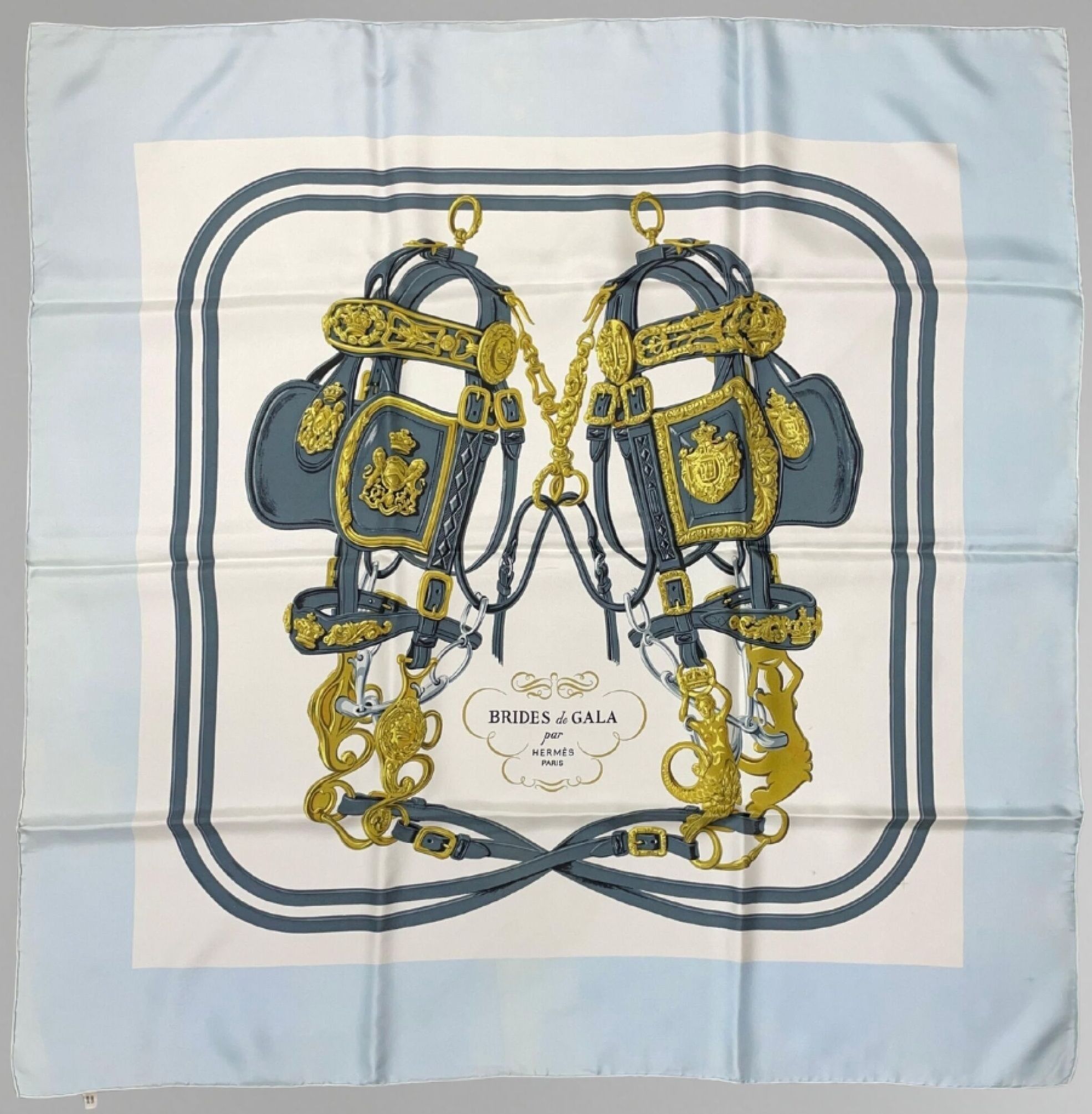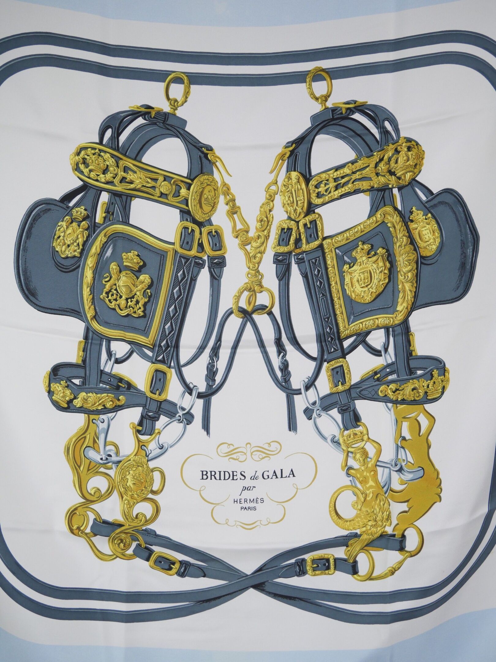 Silk twill square, titled "Brides de Gala" in shades of grey, ivory and gold, with a sky-blue border.