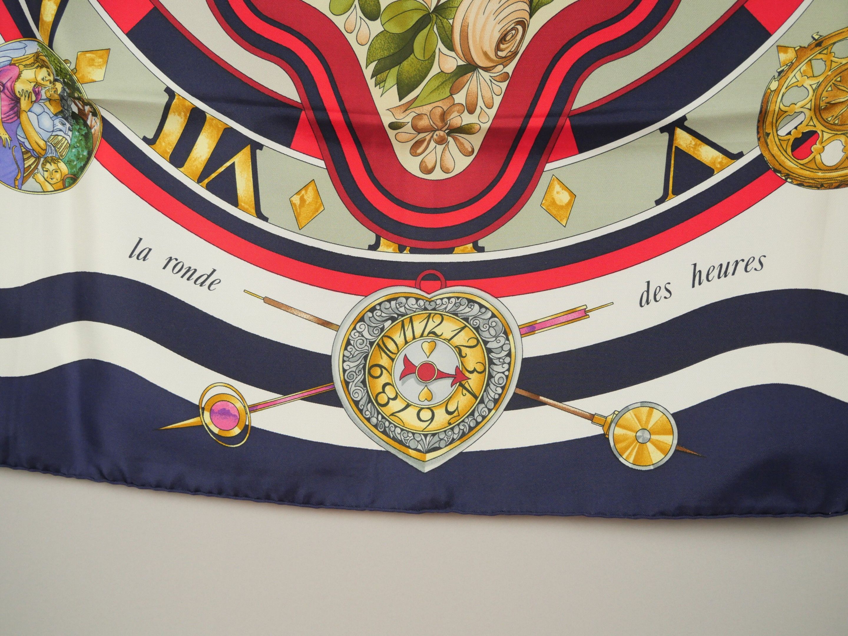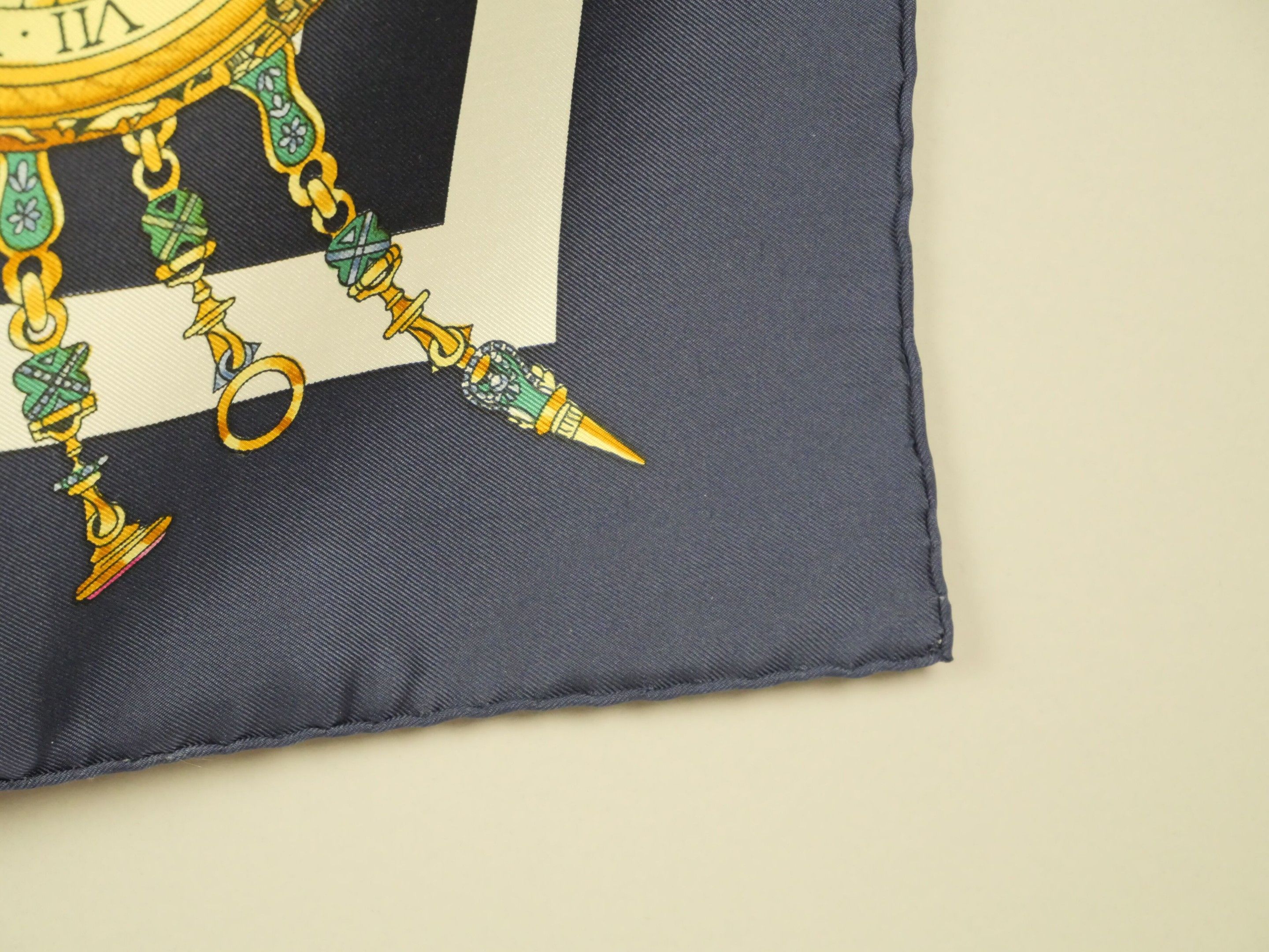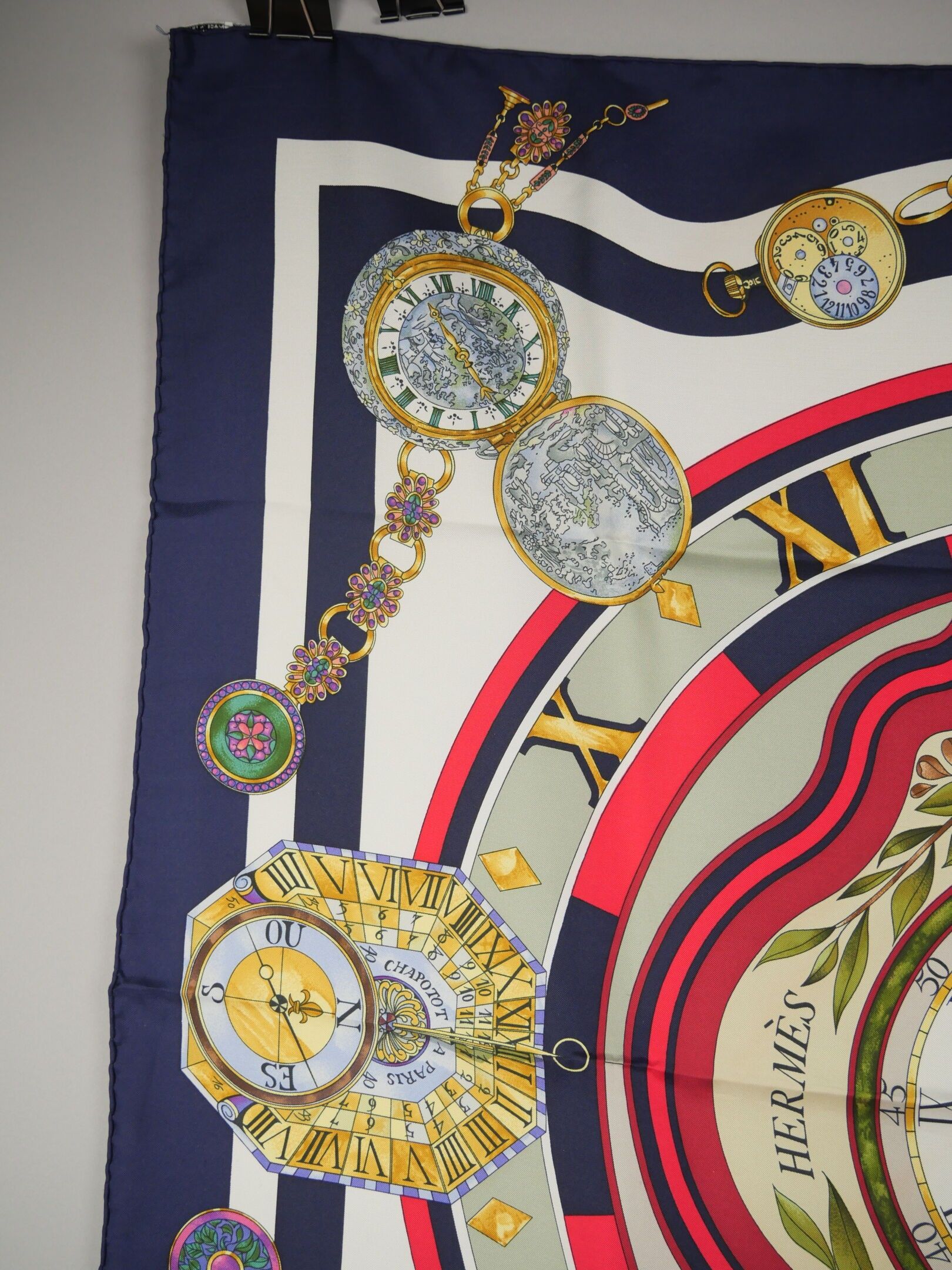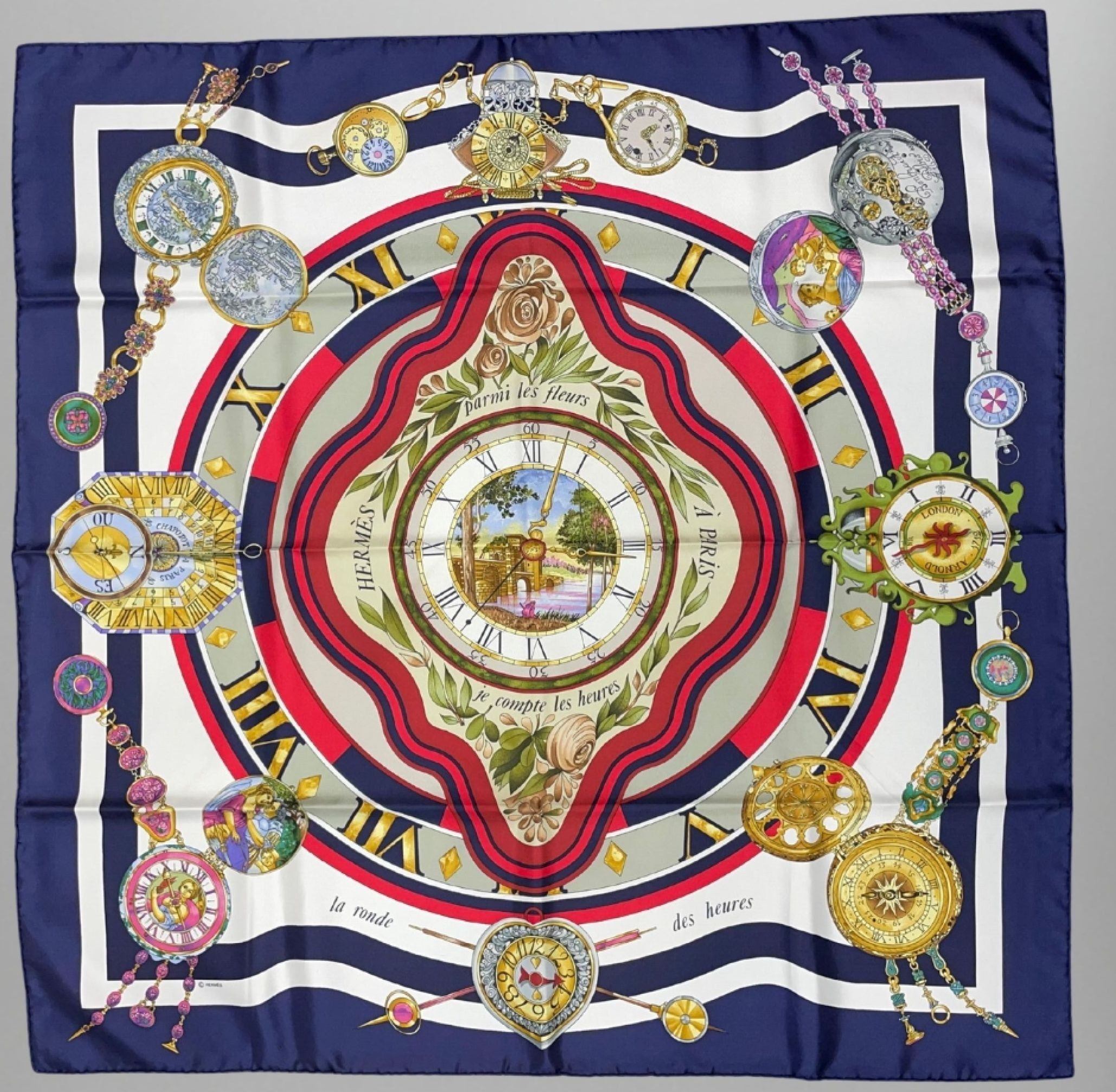 Square in printed silk twill, titled "La Ronde des Heures", in shades of blue.