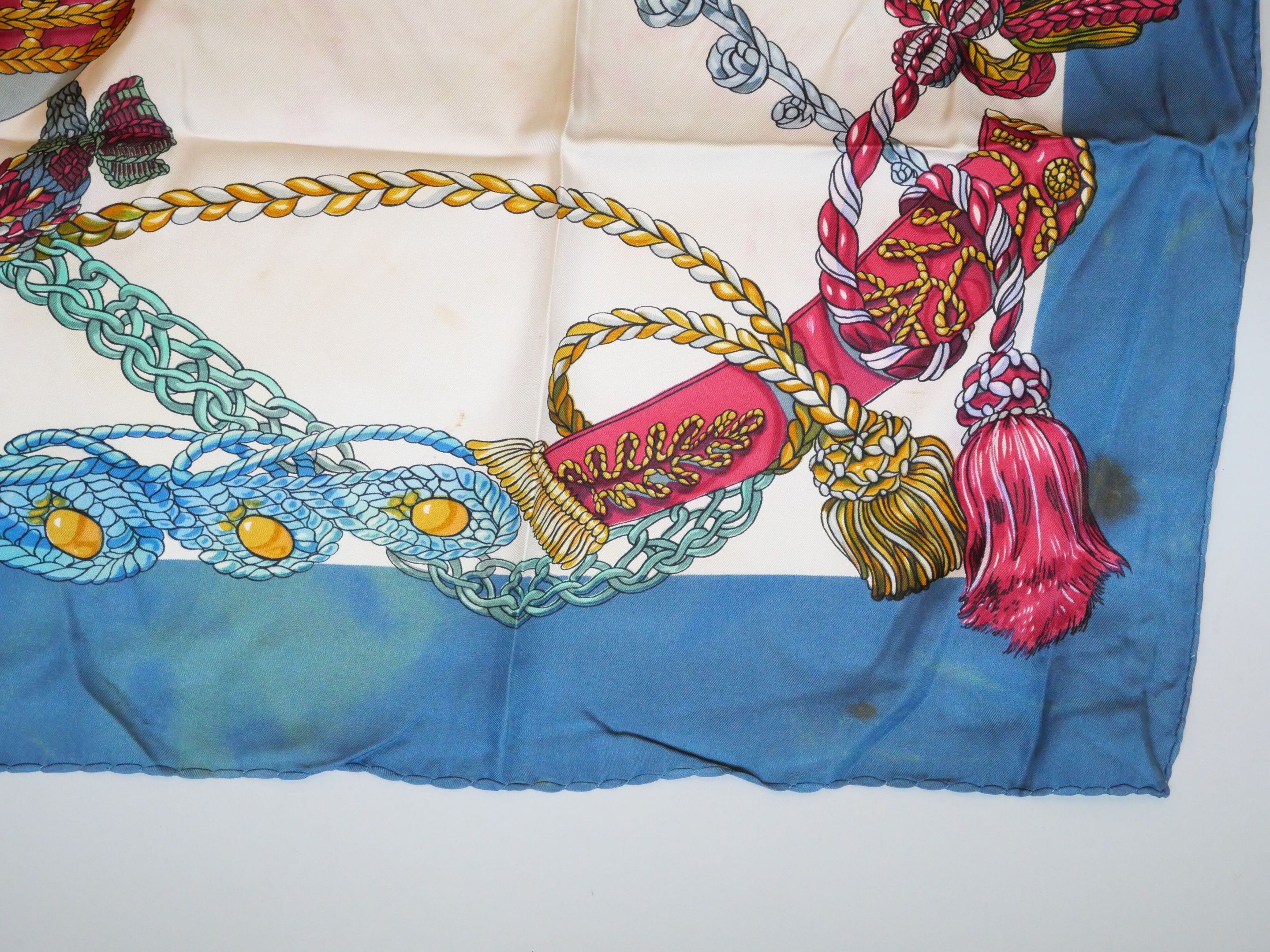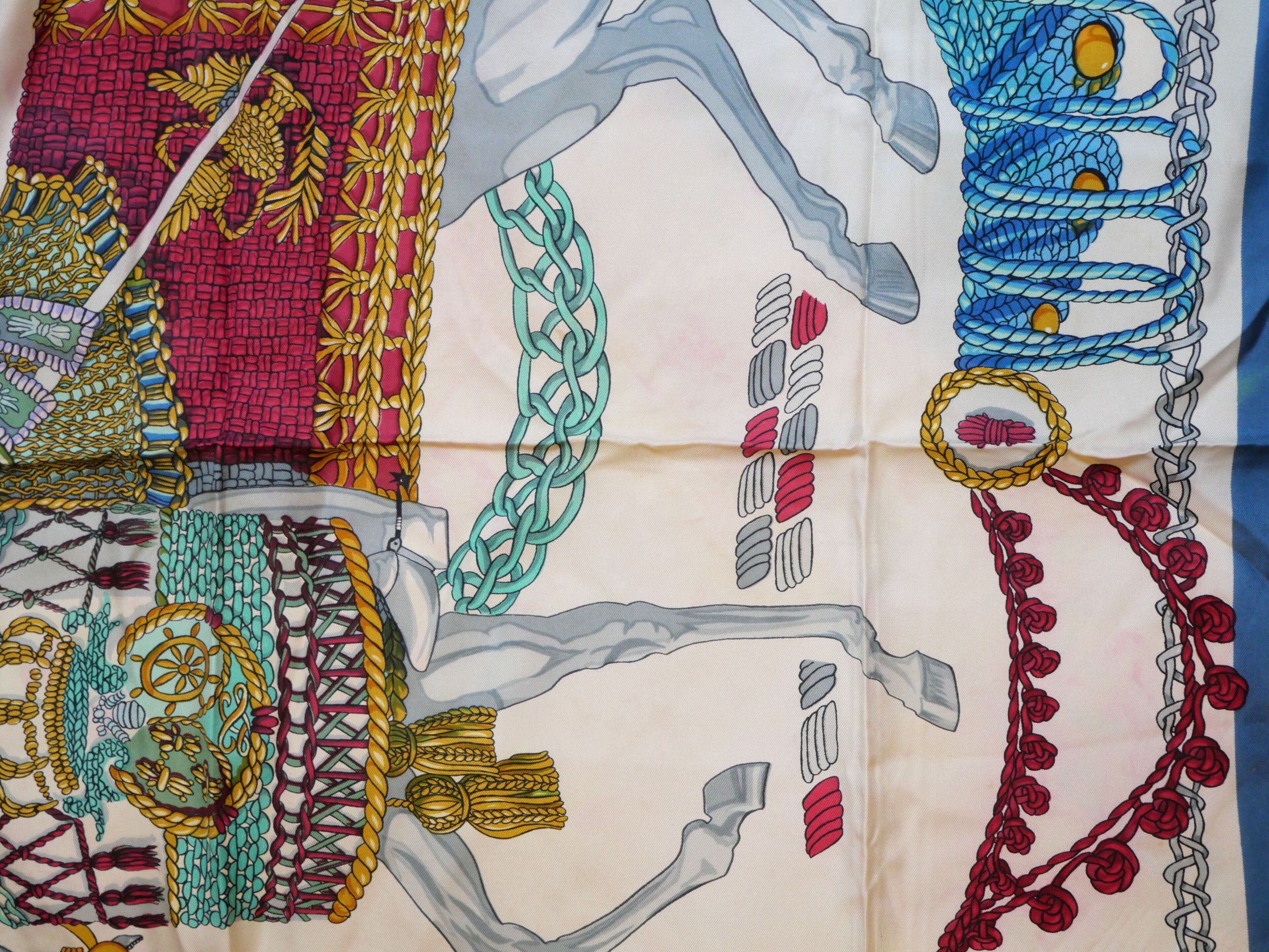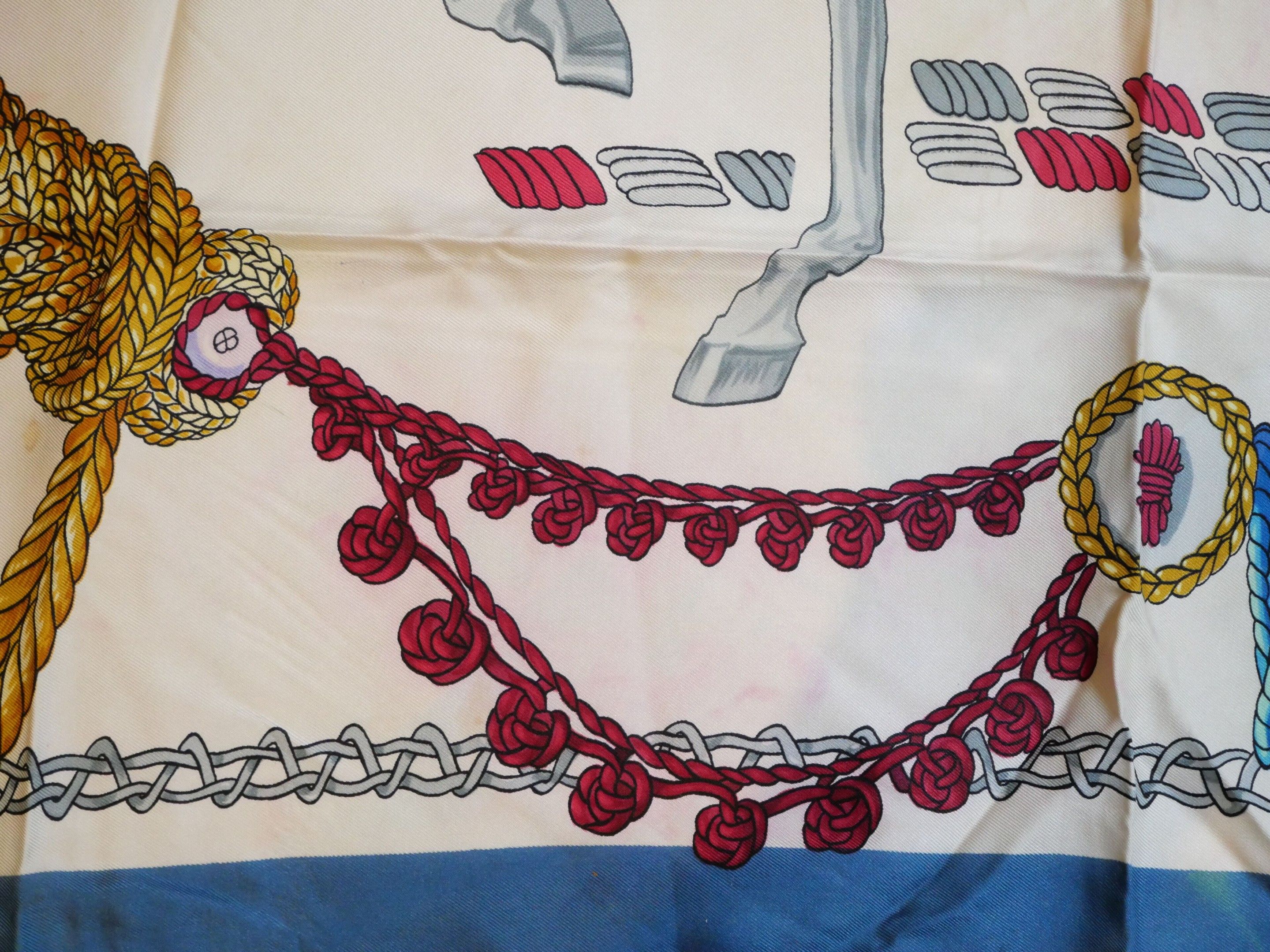 Silk twill square, "Le timbalier" model with polychrome decoration on an ivory background, blue borders.