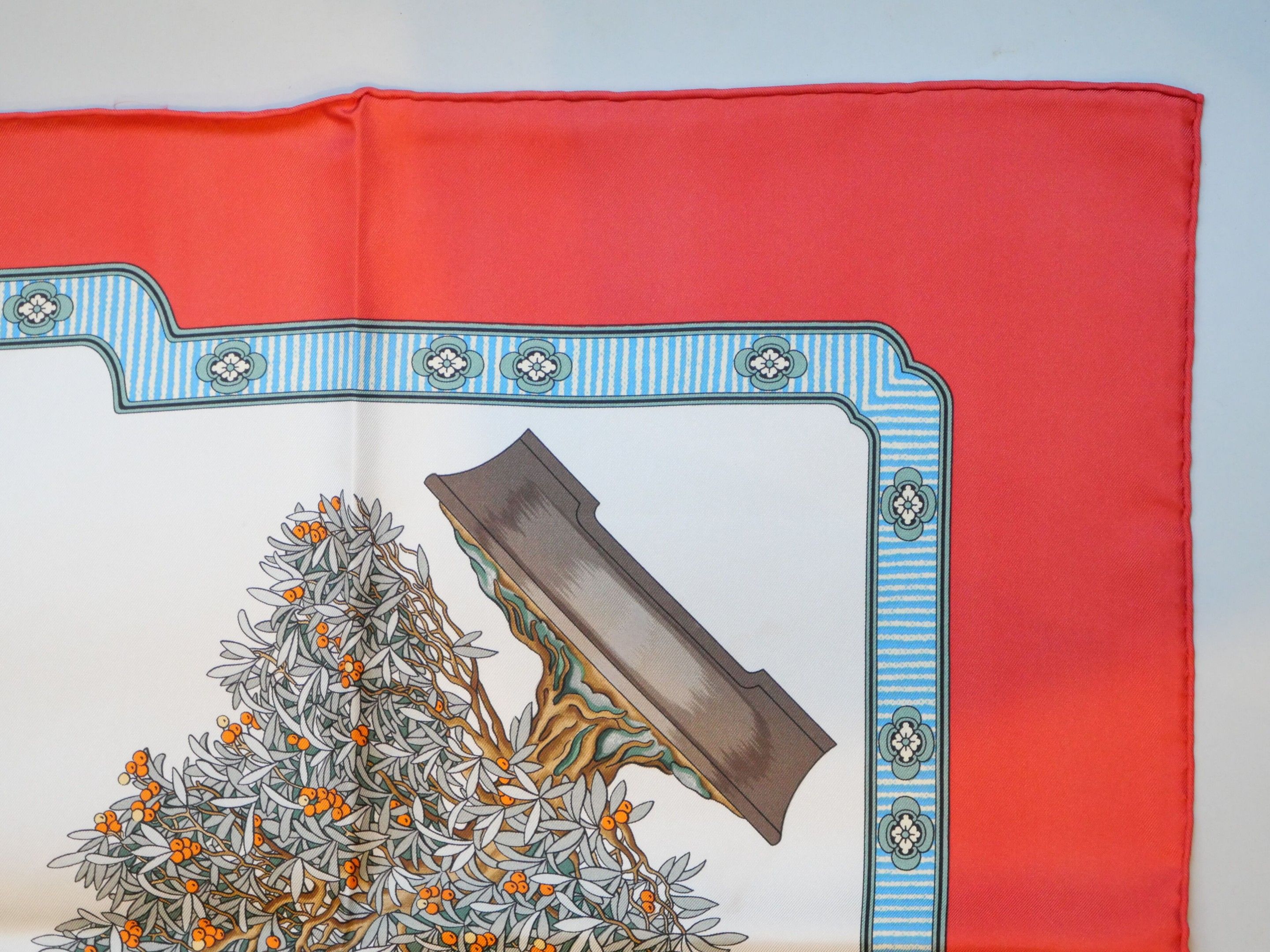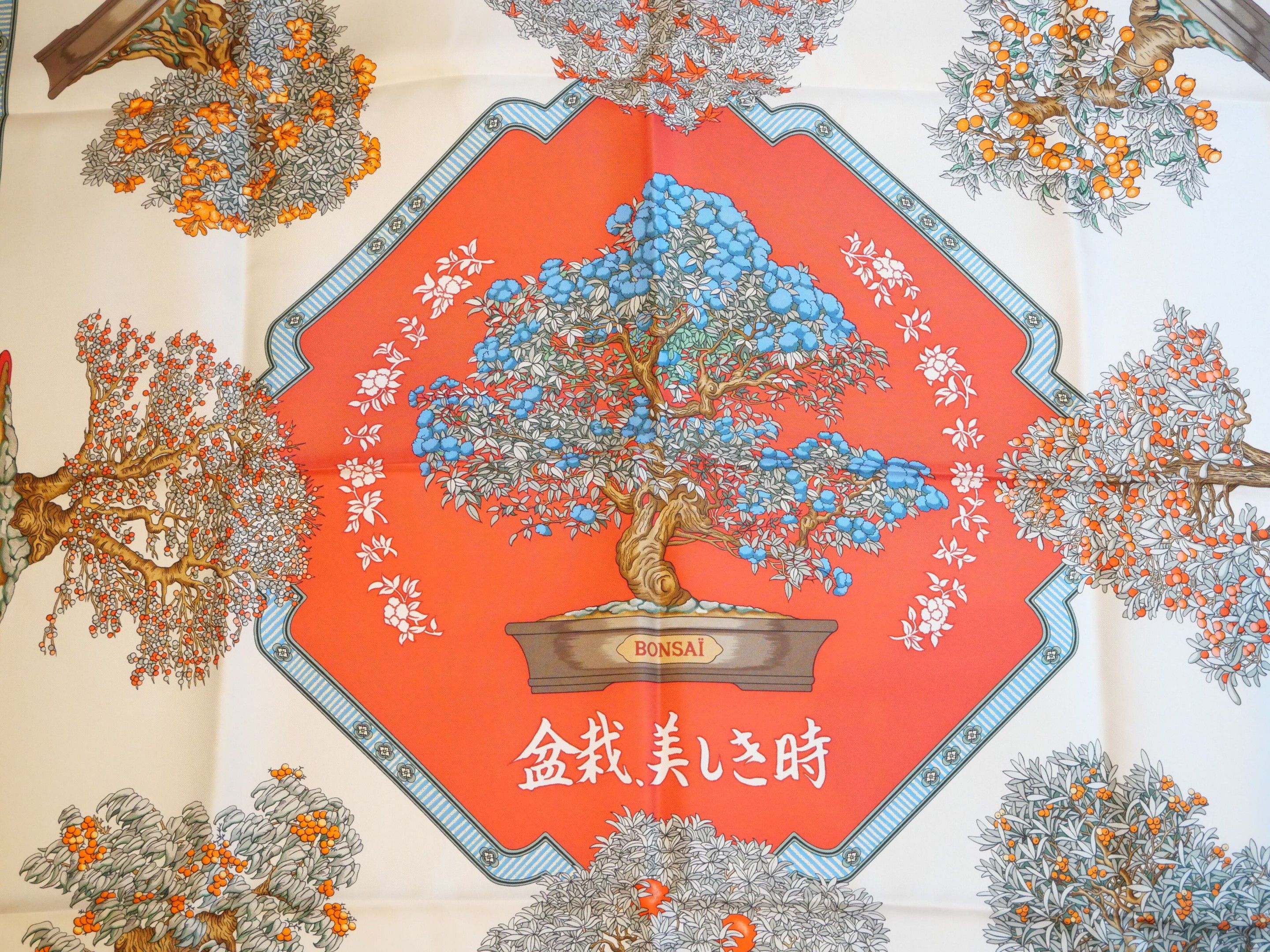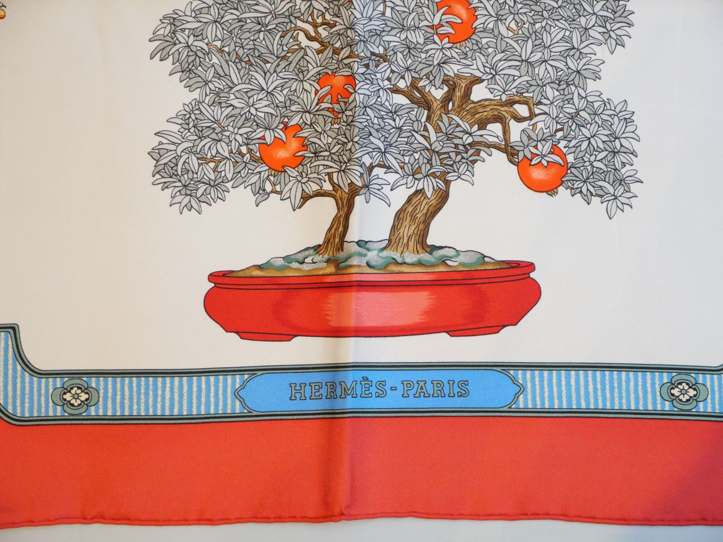 HERMES, Paris Square in silk twill, titled "Bonsaï", white b…