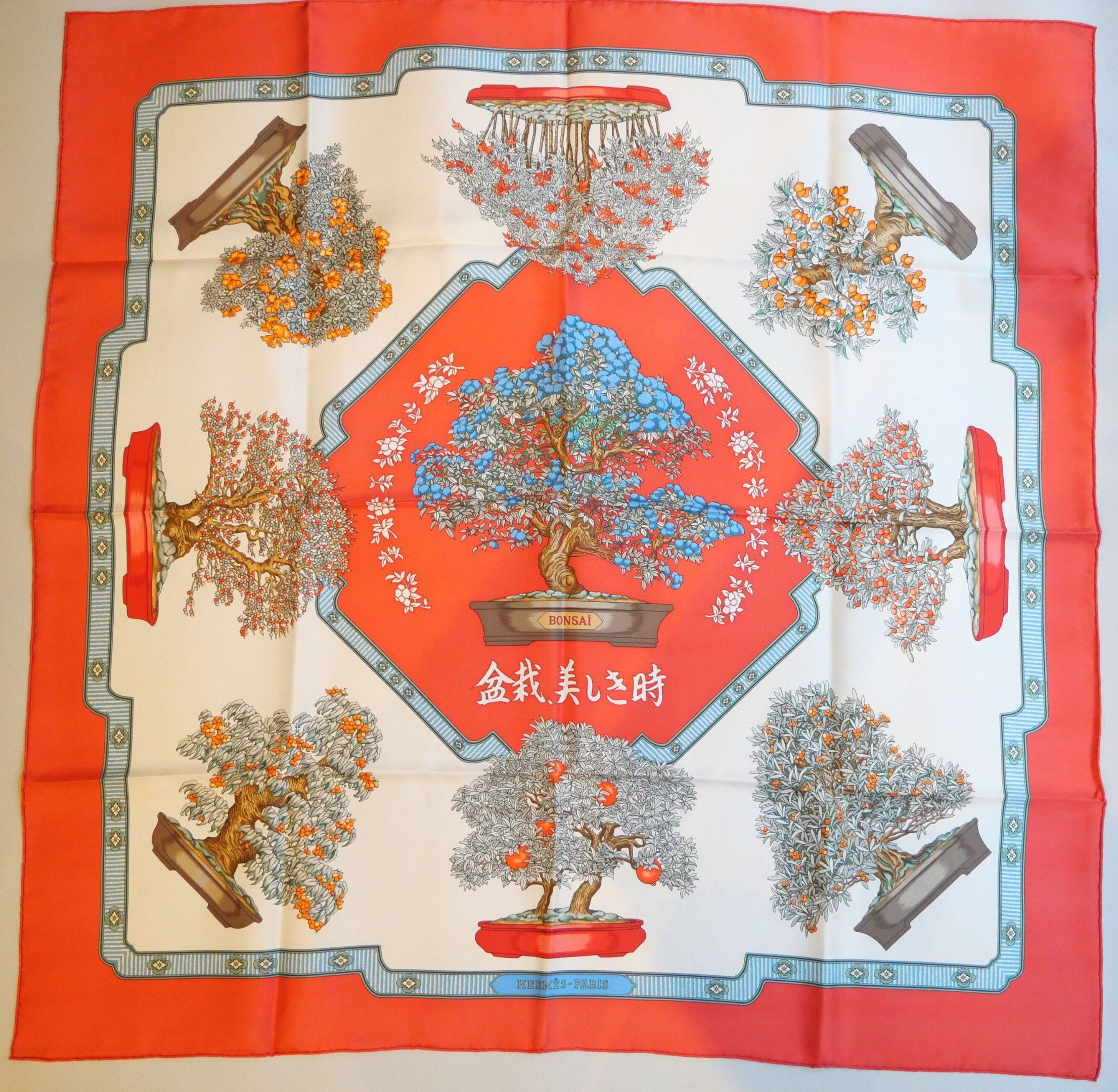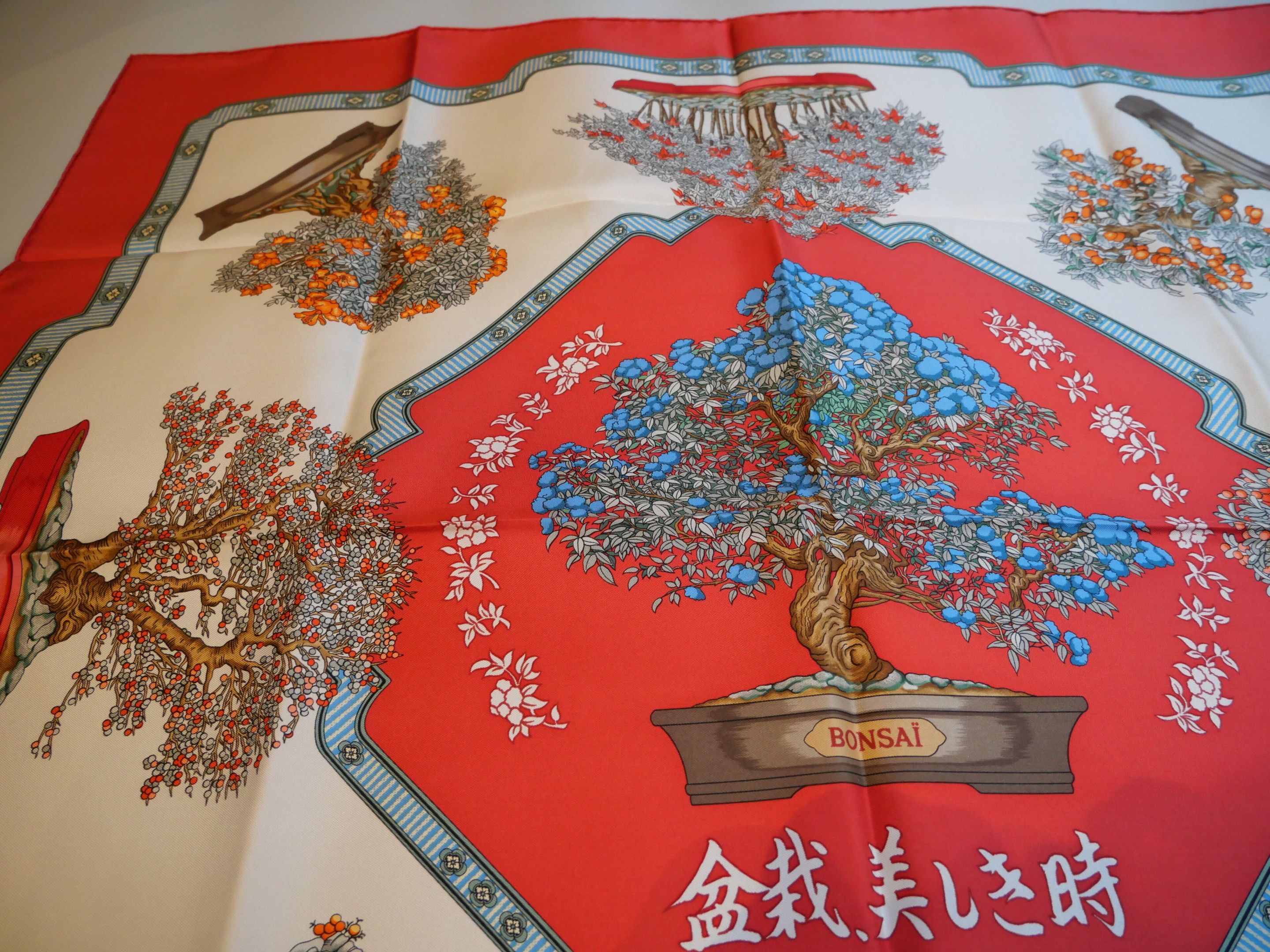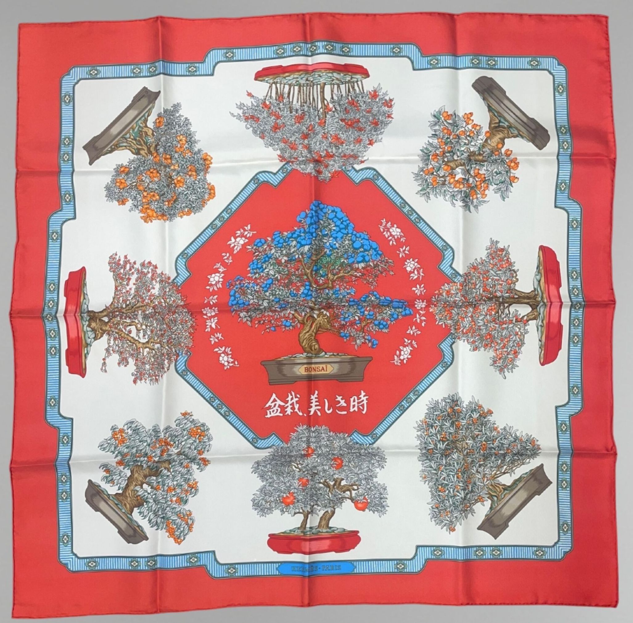 Square in silk twill, titled "Bonsaï", white background and red border.