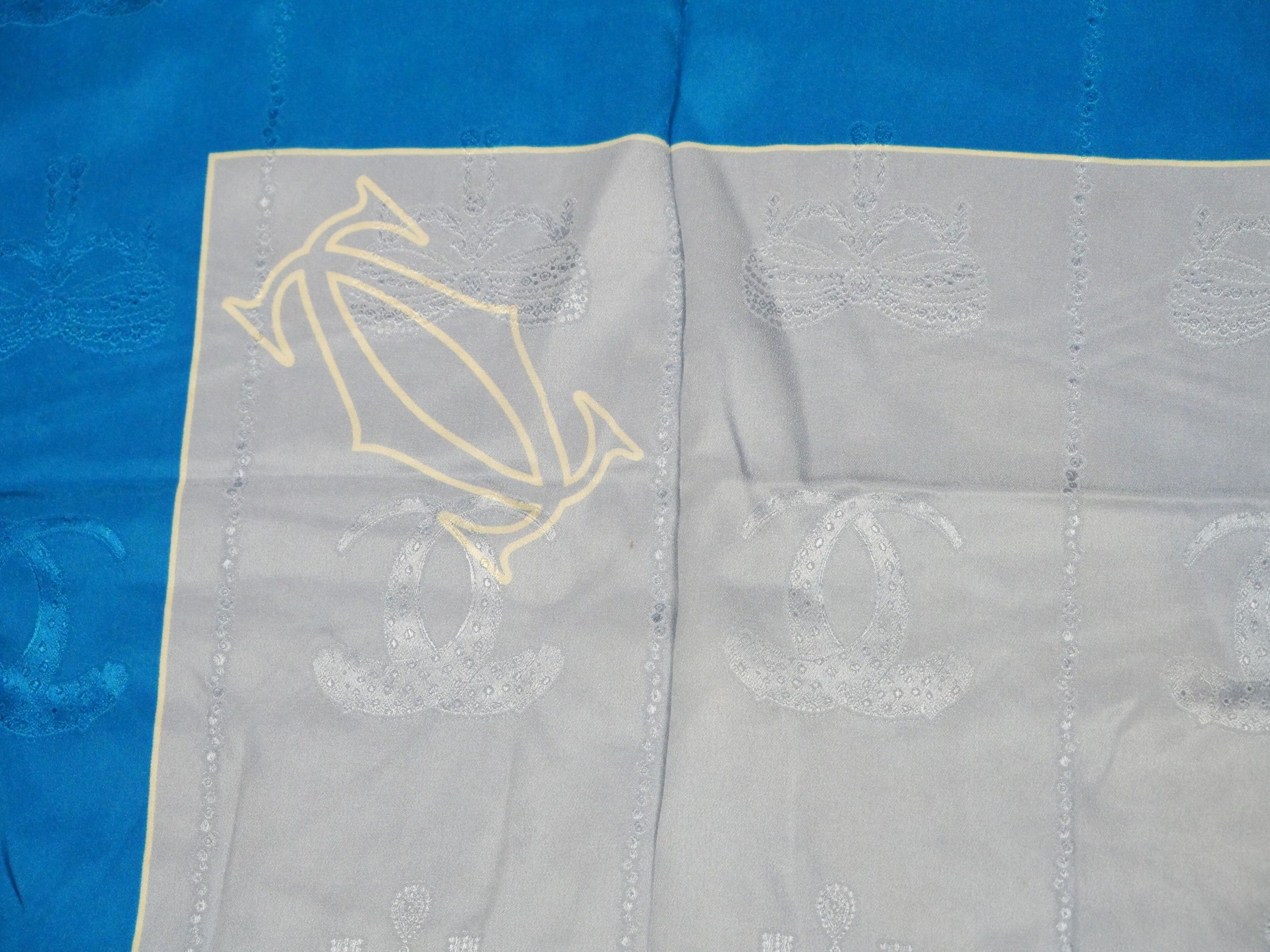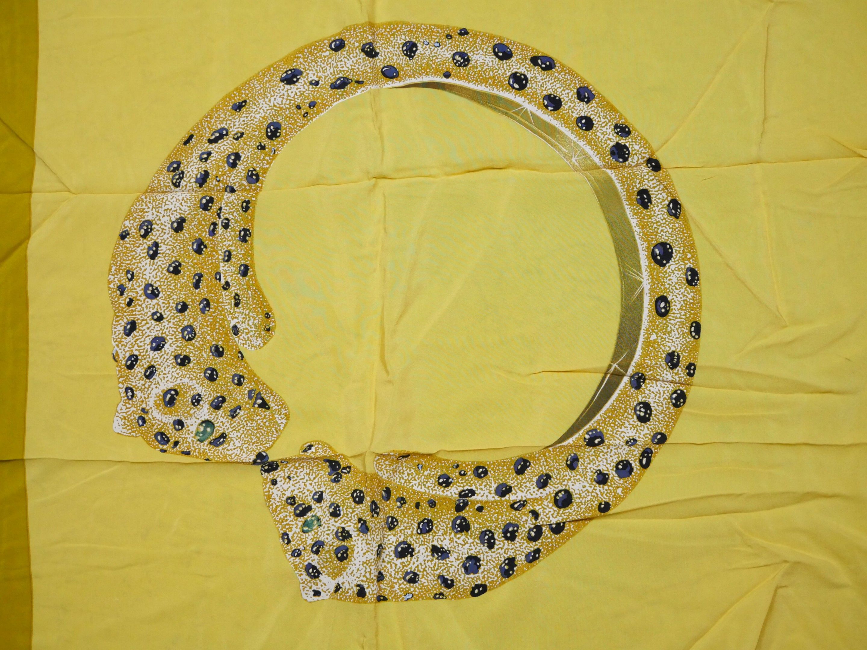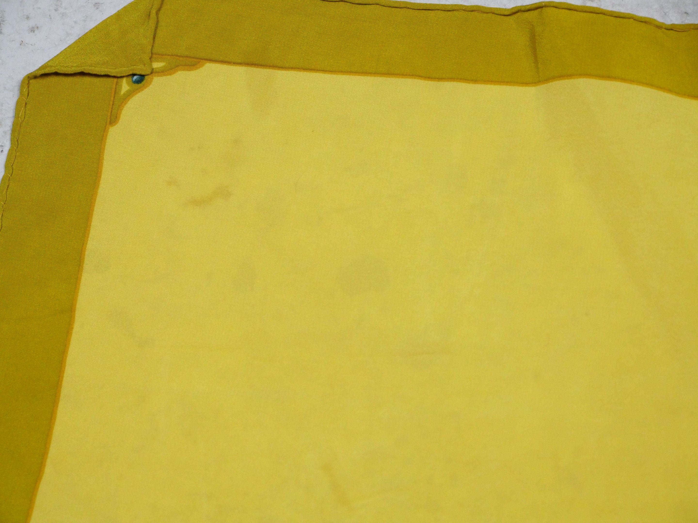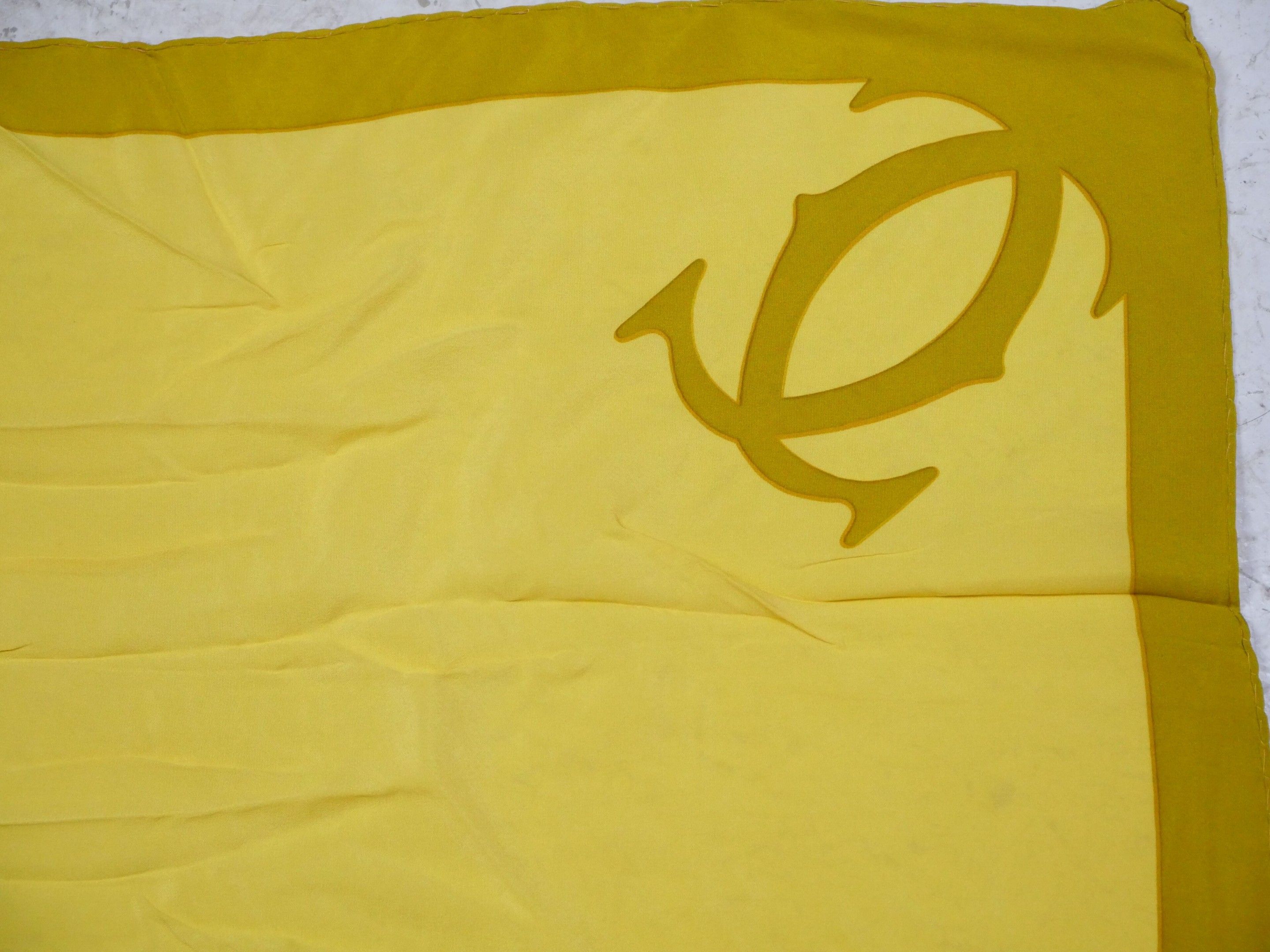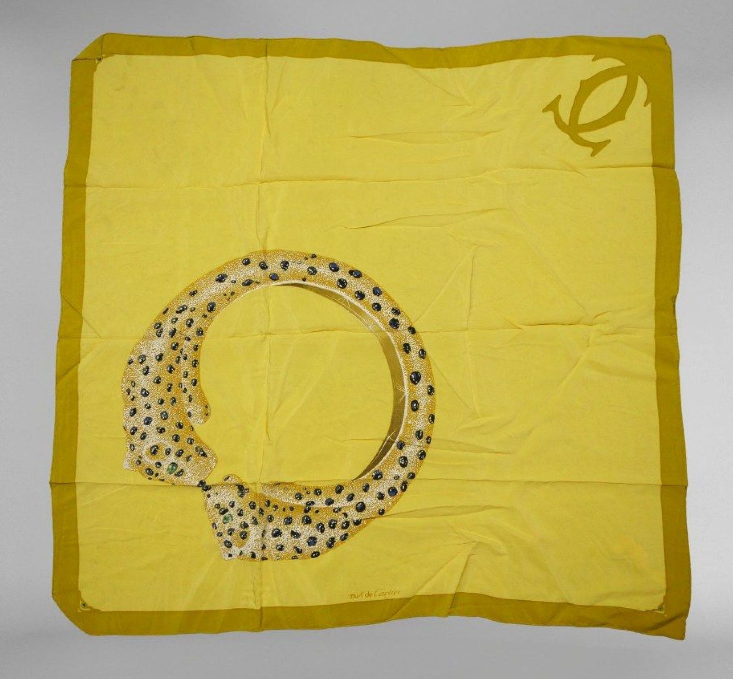 Set of three squares in silk twill, one decorated with a panther bracelet on a yellow background, the other two with signed motifs, red or blue borders.