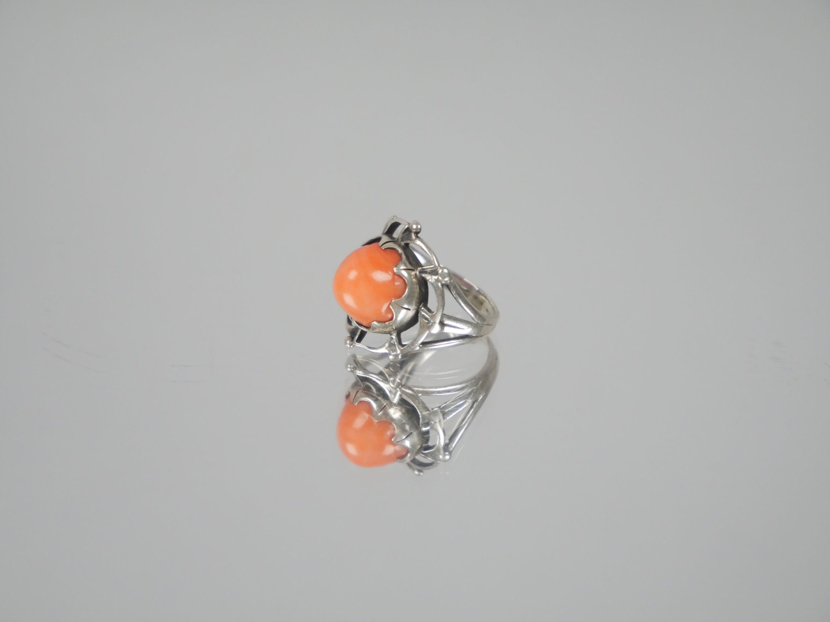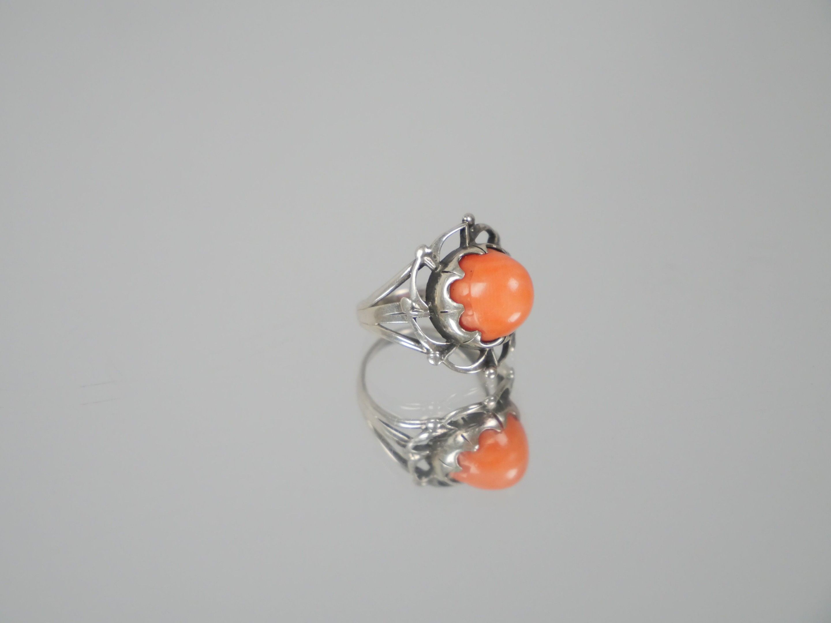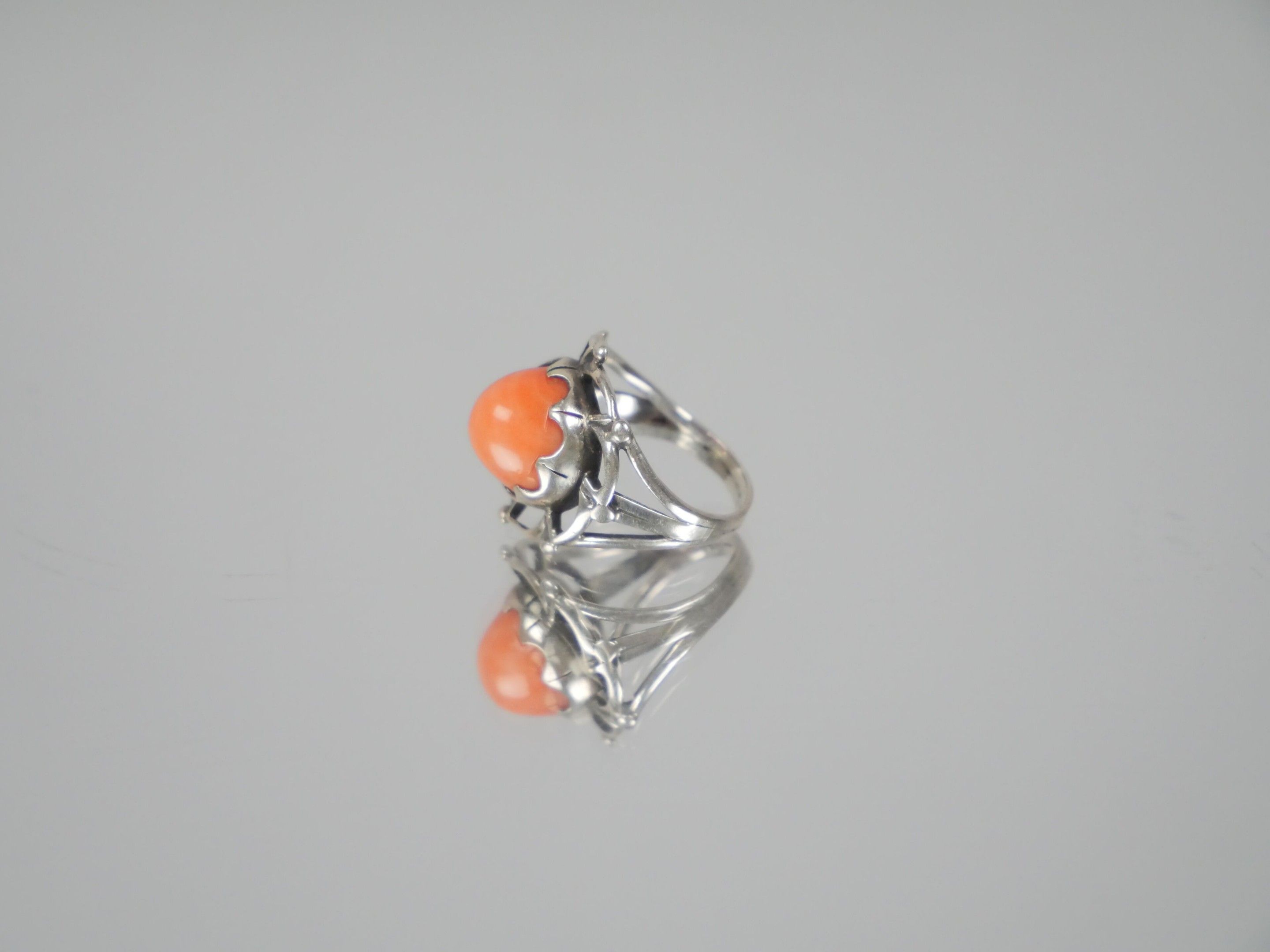 Ring, openwork setting in 800 thousandths silver set with a coral cabochon.
