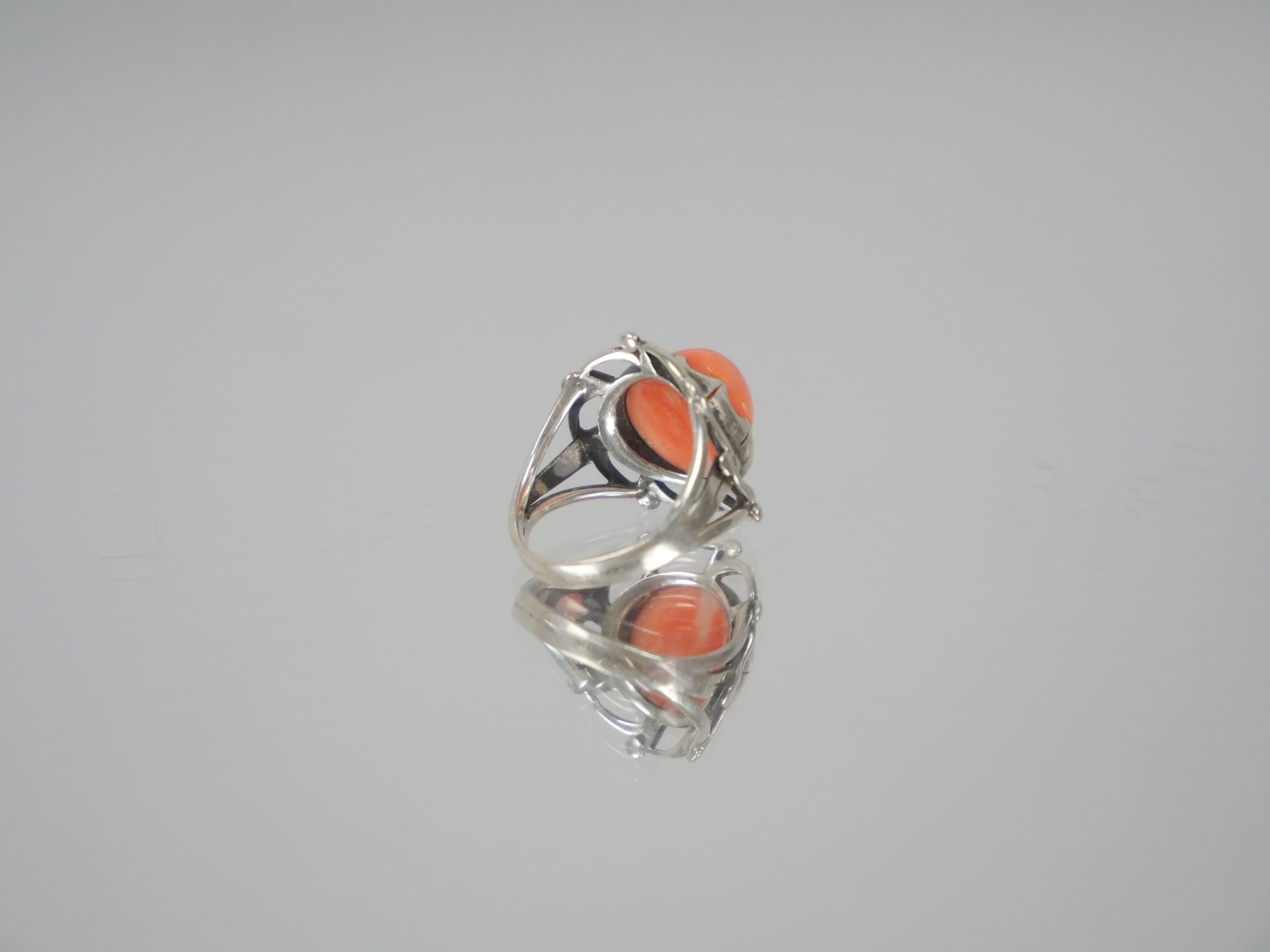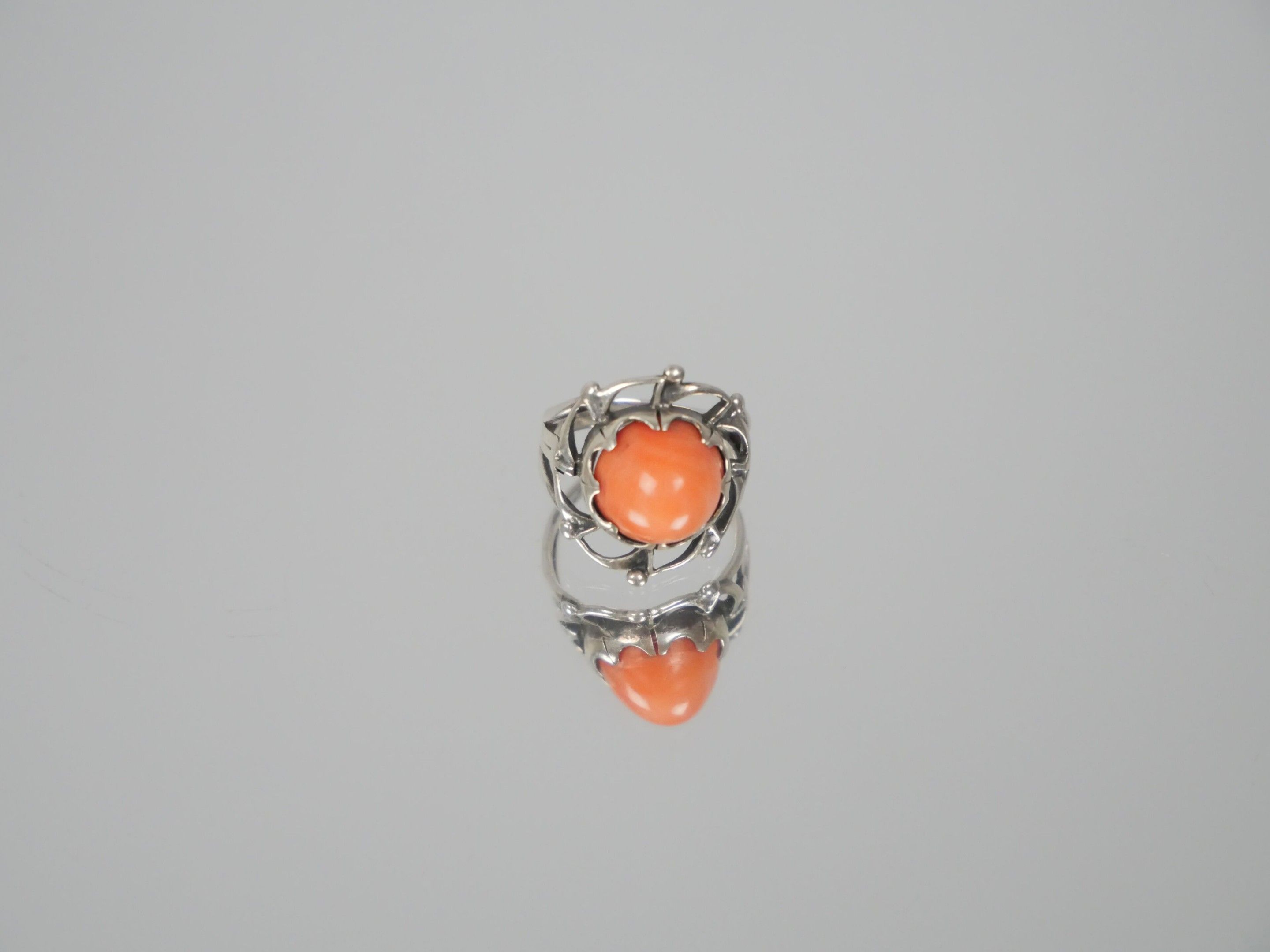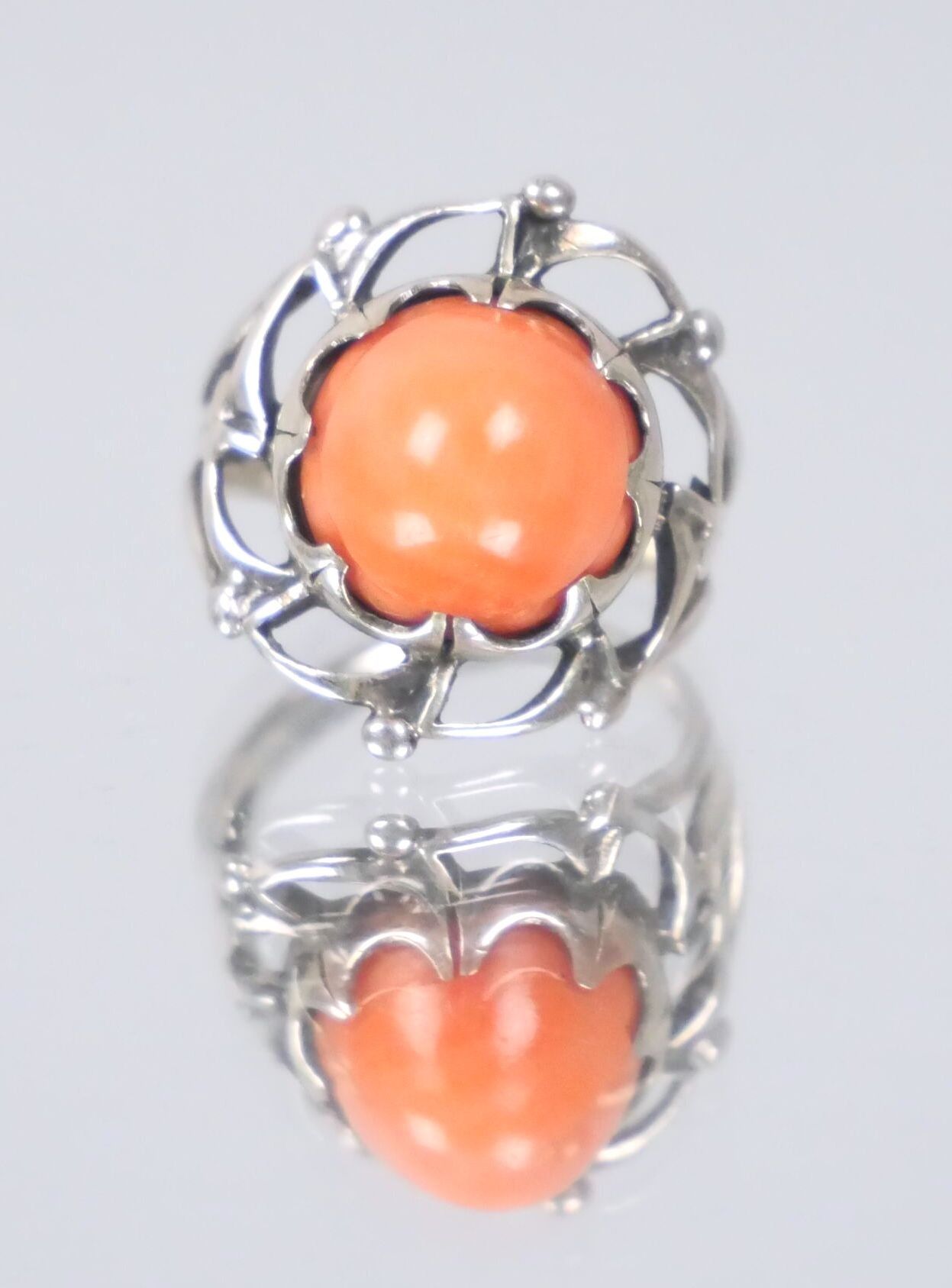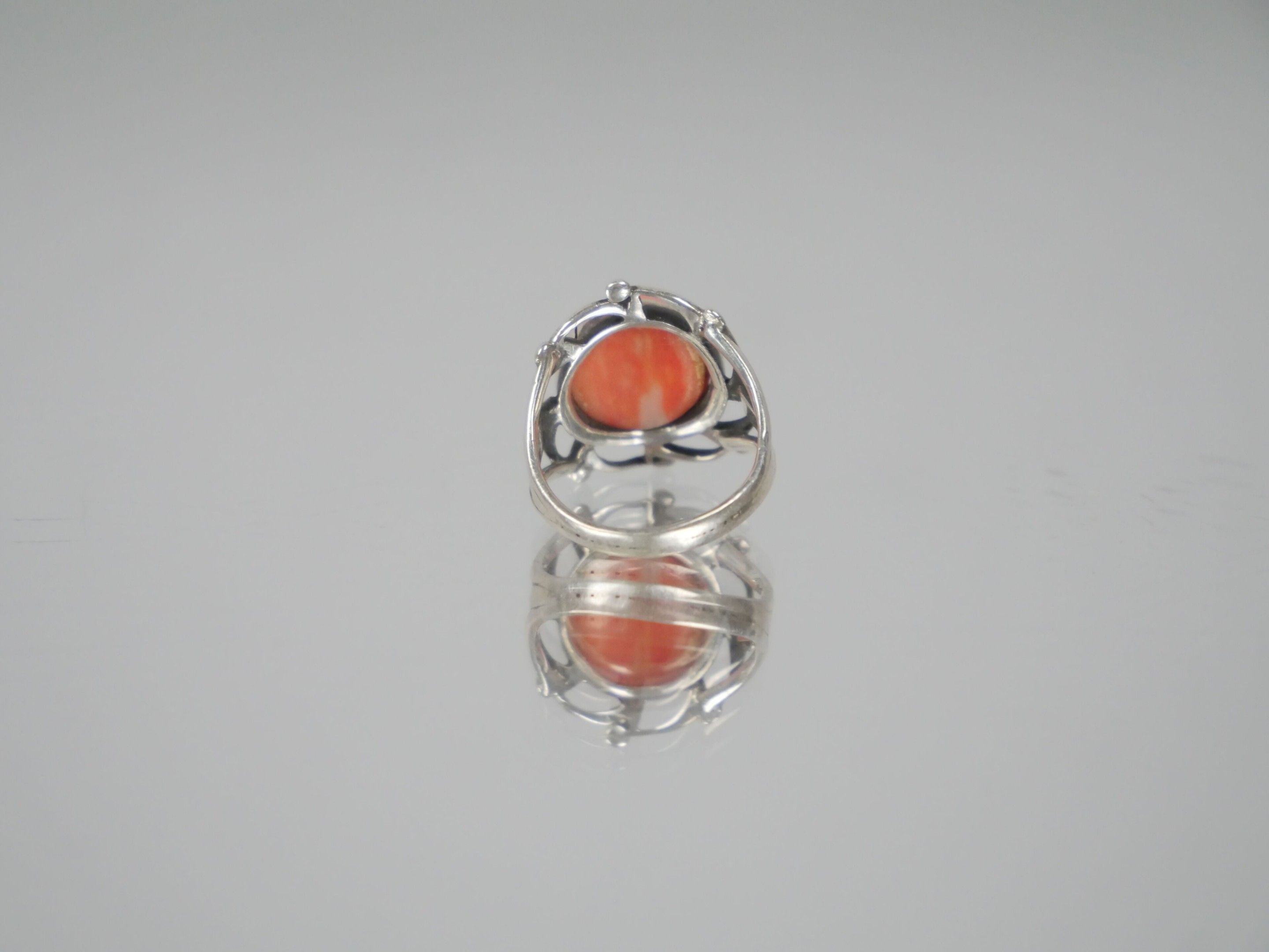 Ring, openwork setting in 800 thousandths silver set with a coral cabochon.