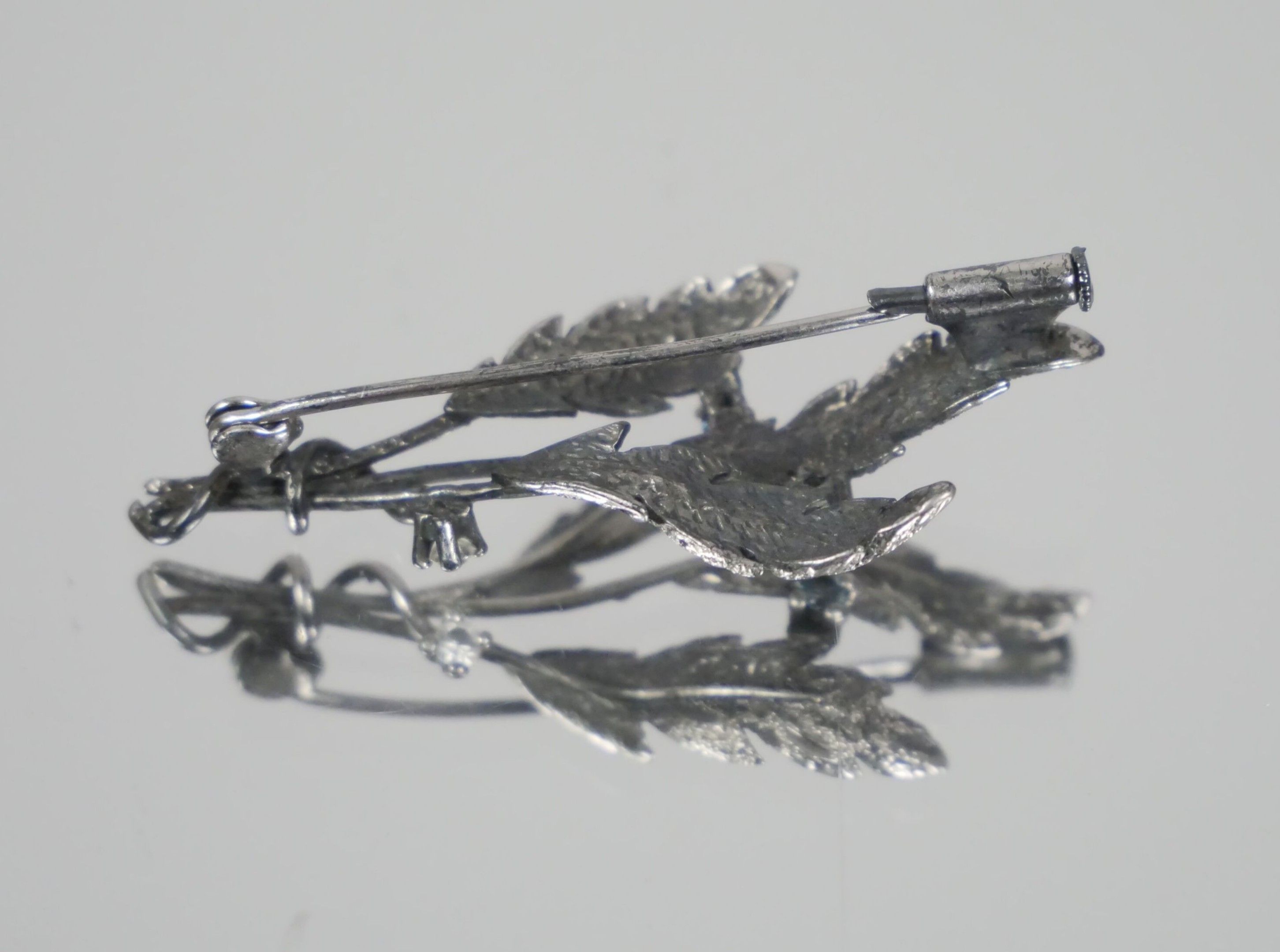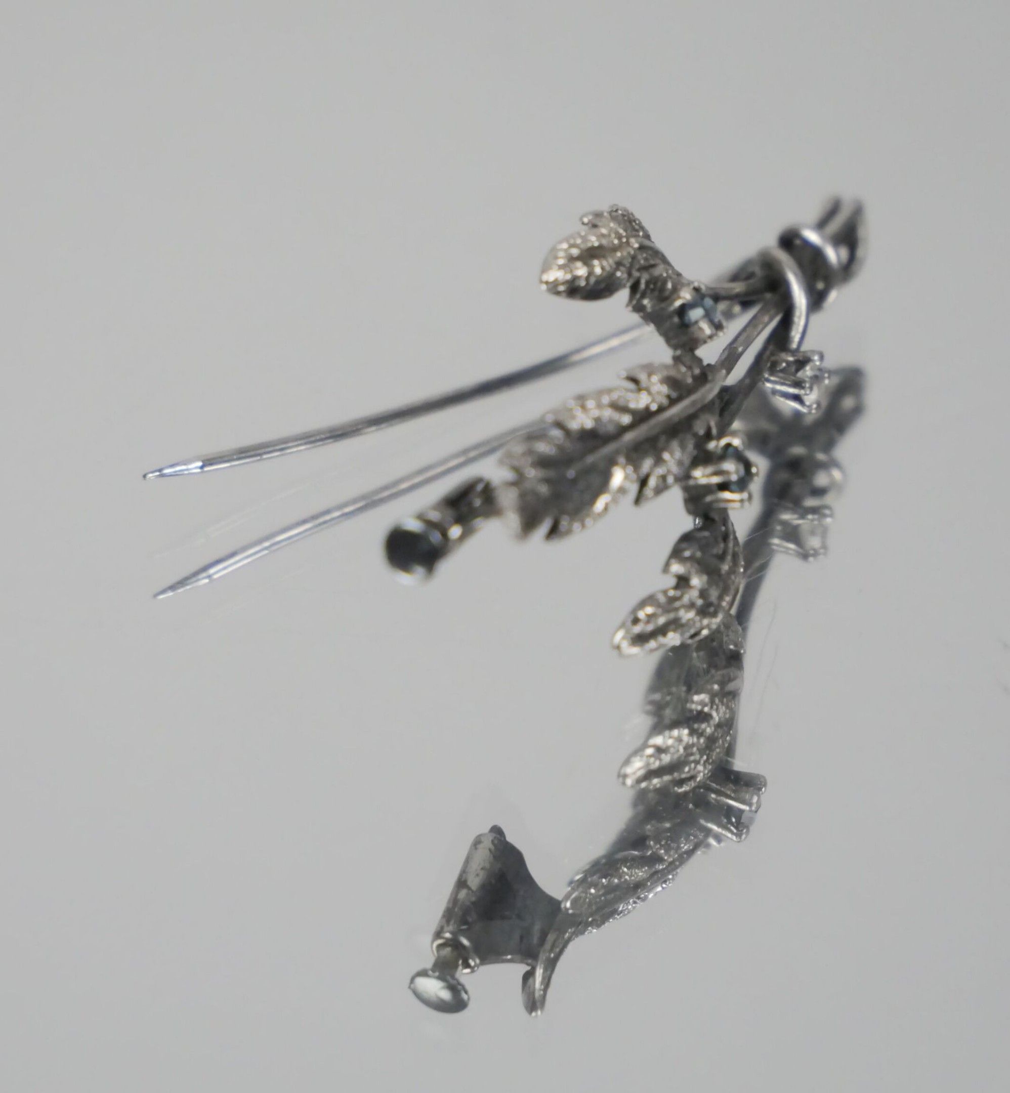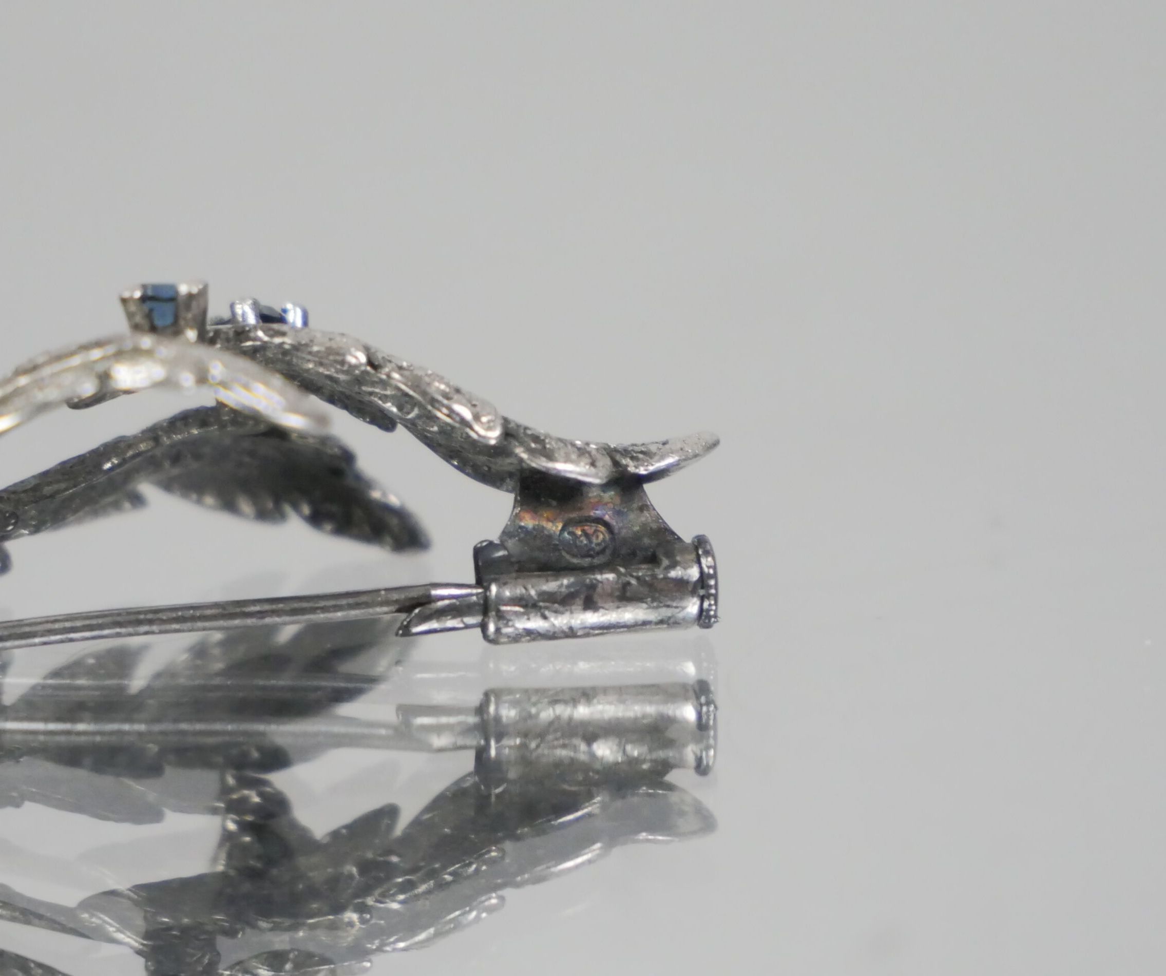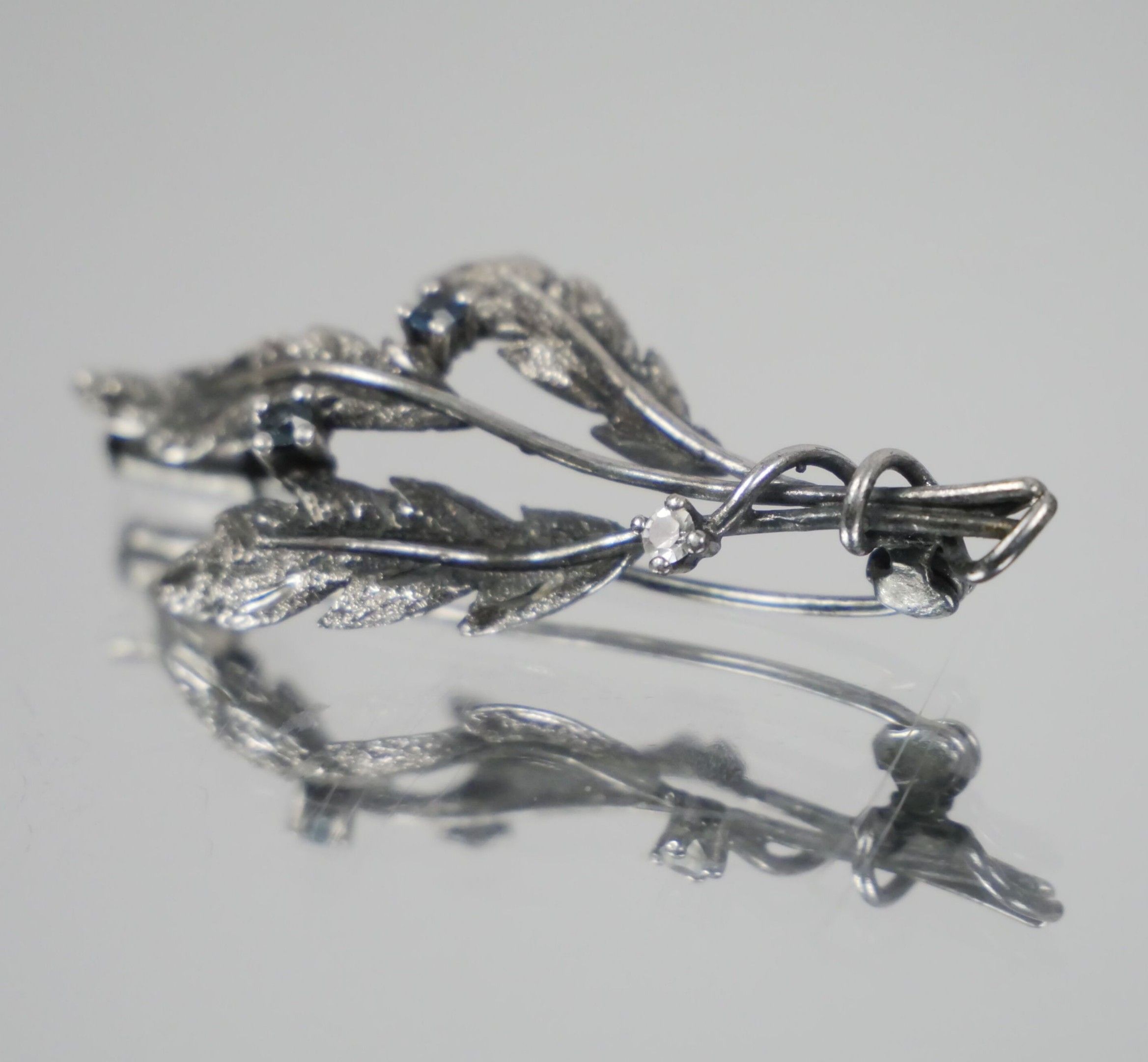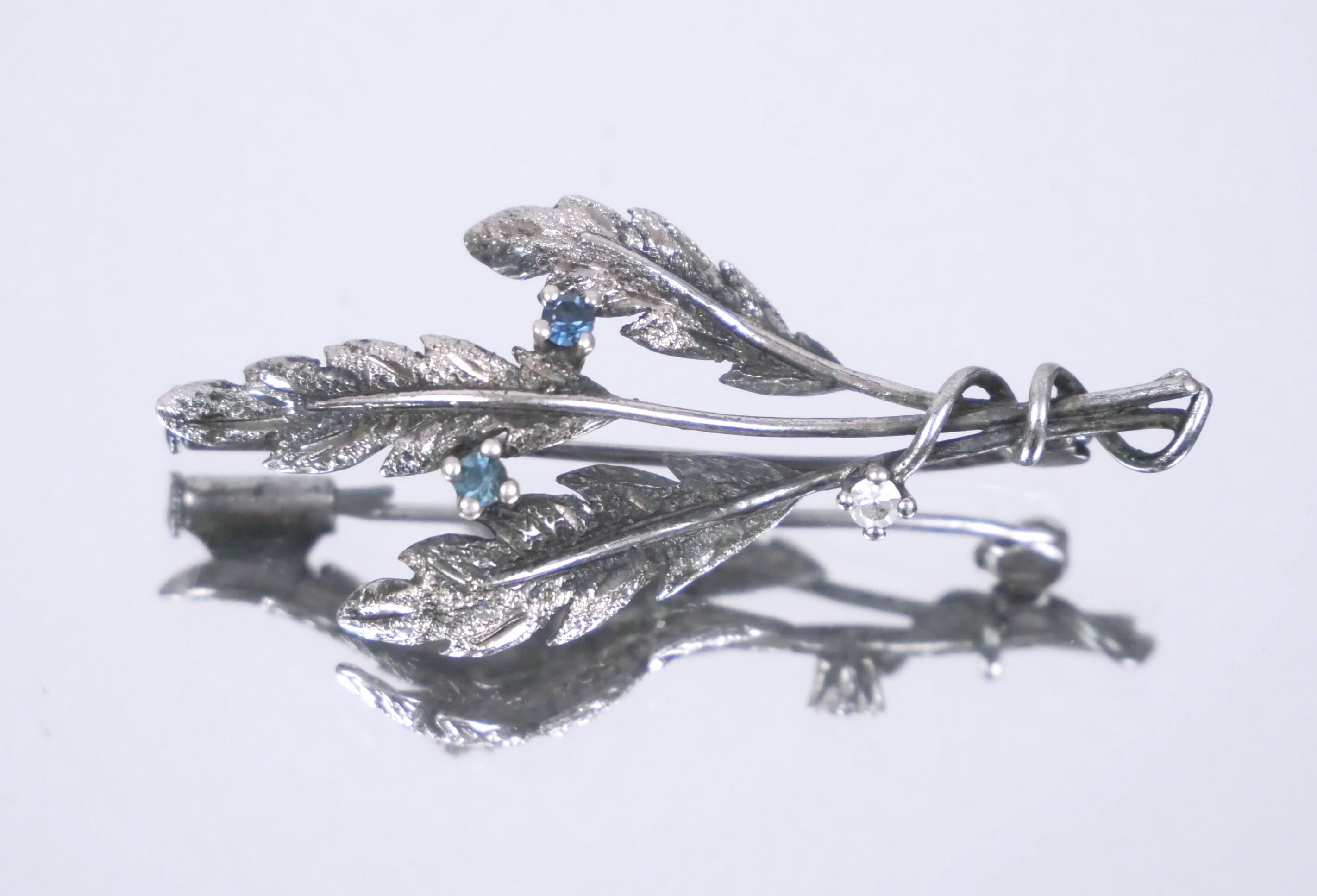 Silver-plated spray brooch with foliage set with faceted white and blue stones.