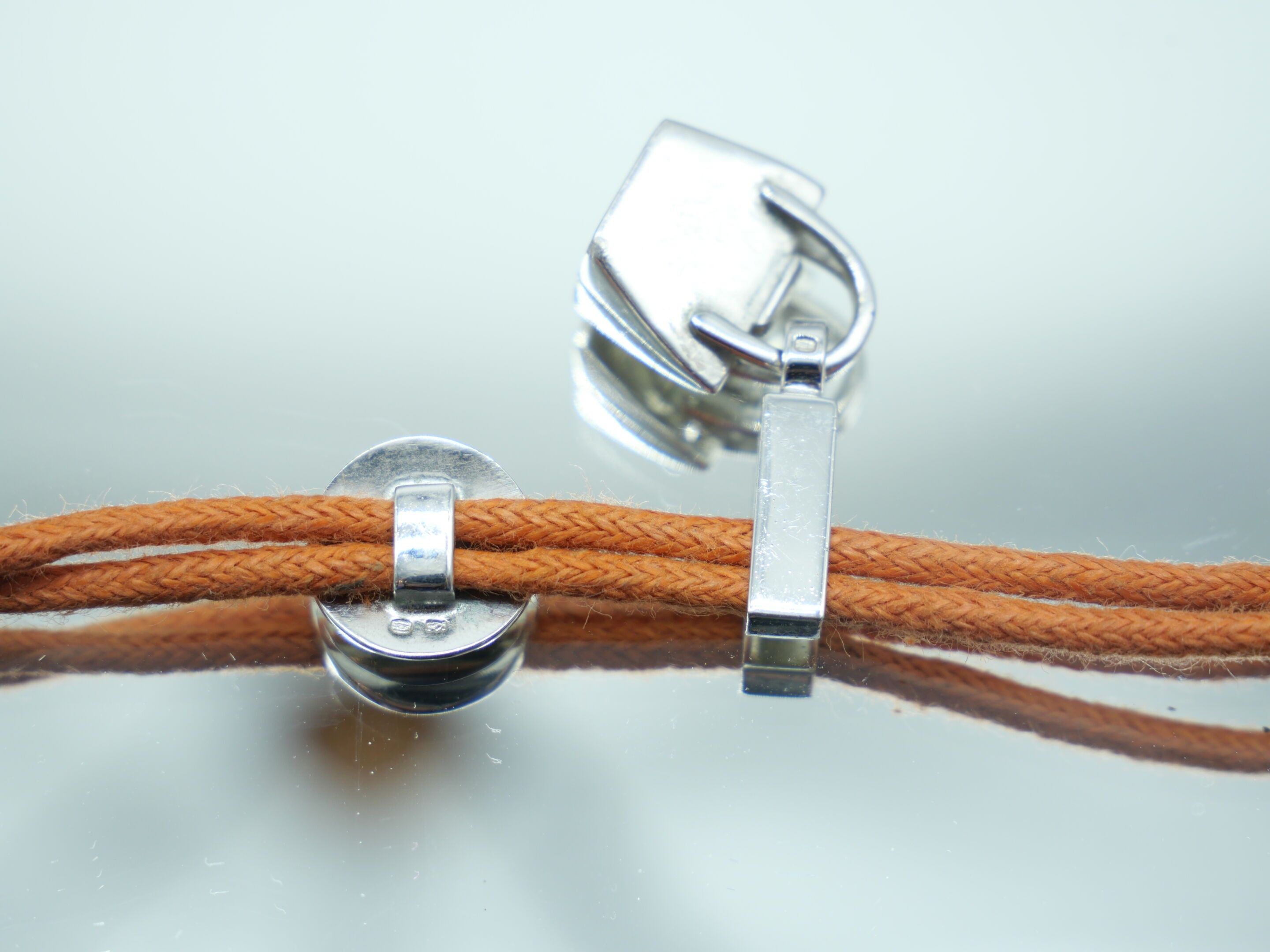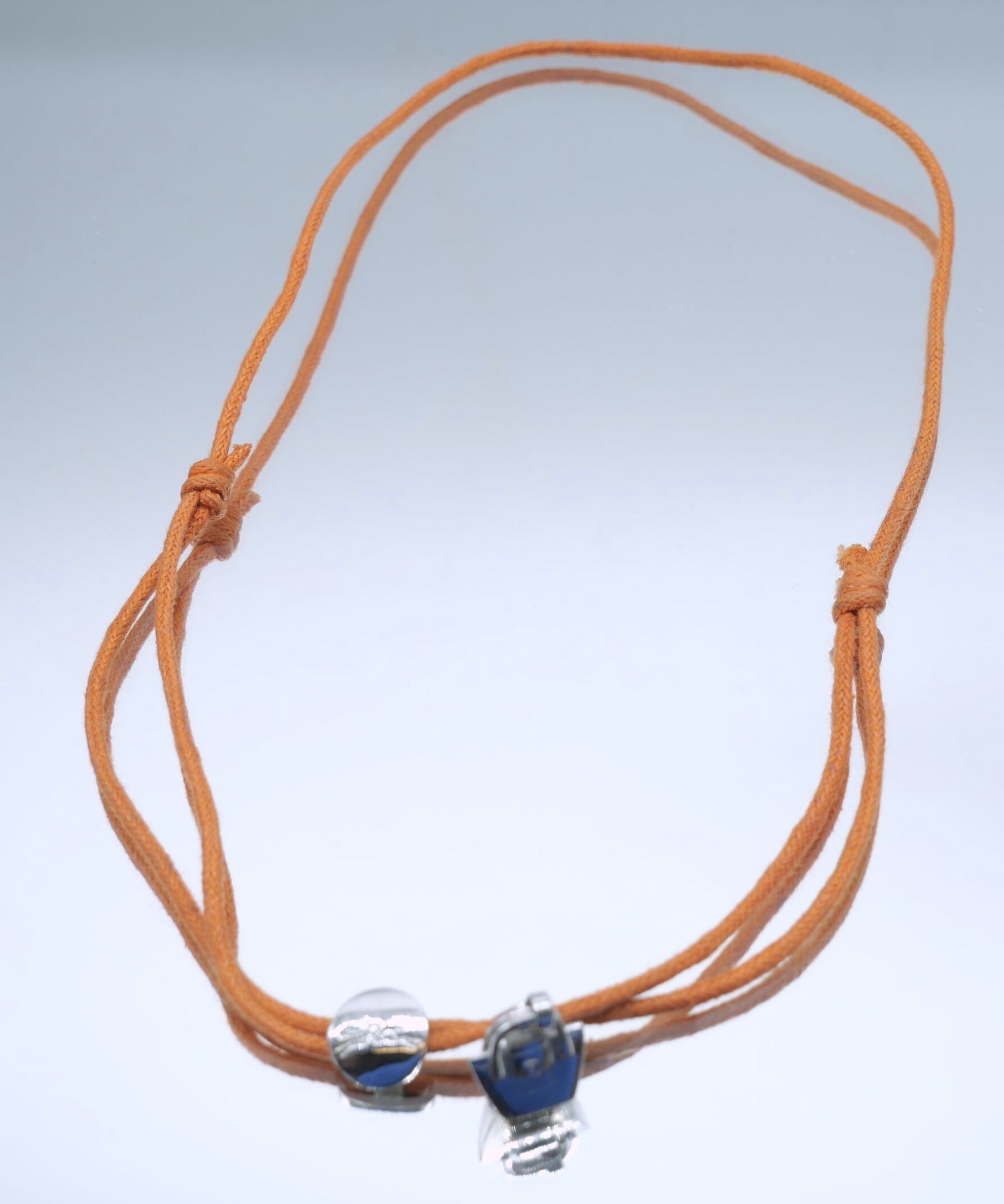 Silver-plated necklace featuring a bag, the cord in orange fabric.