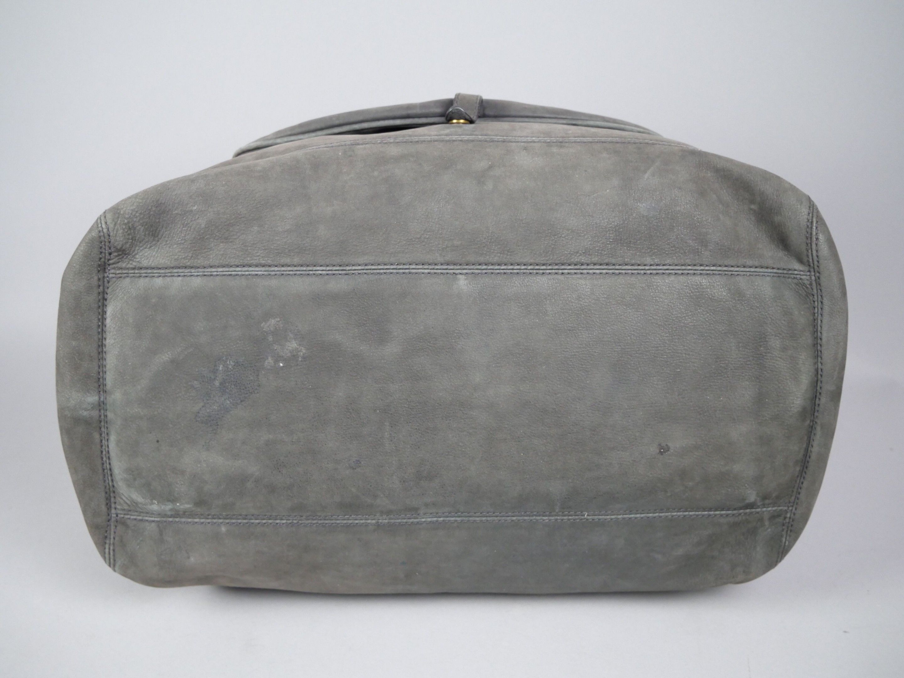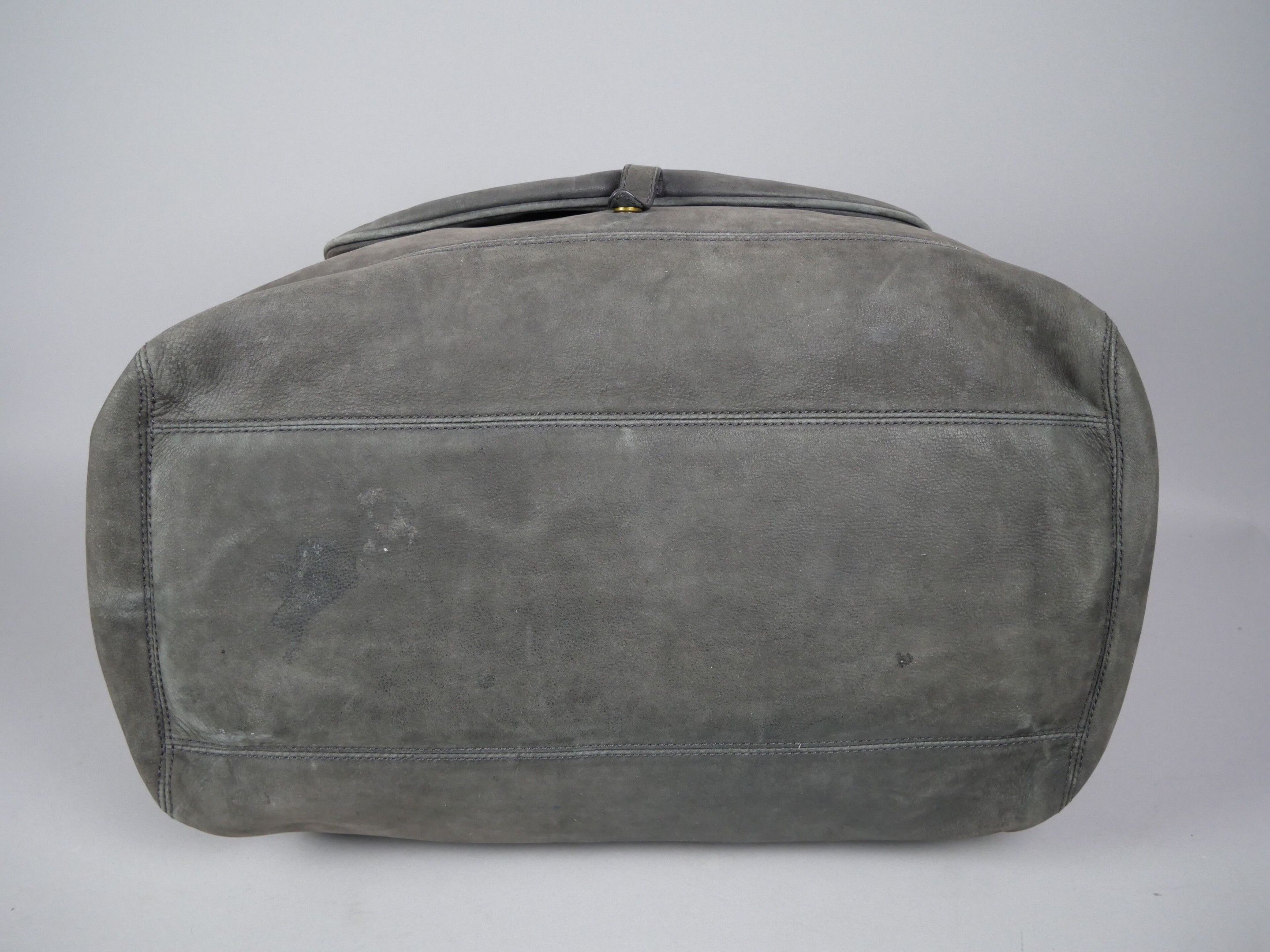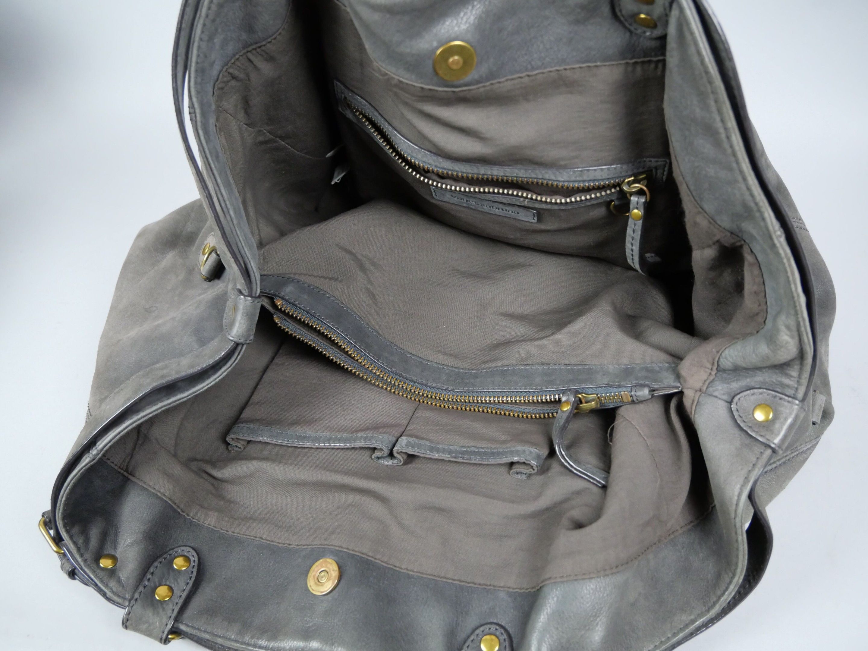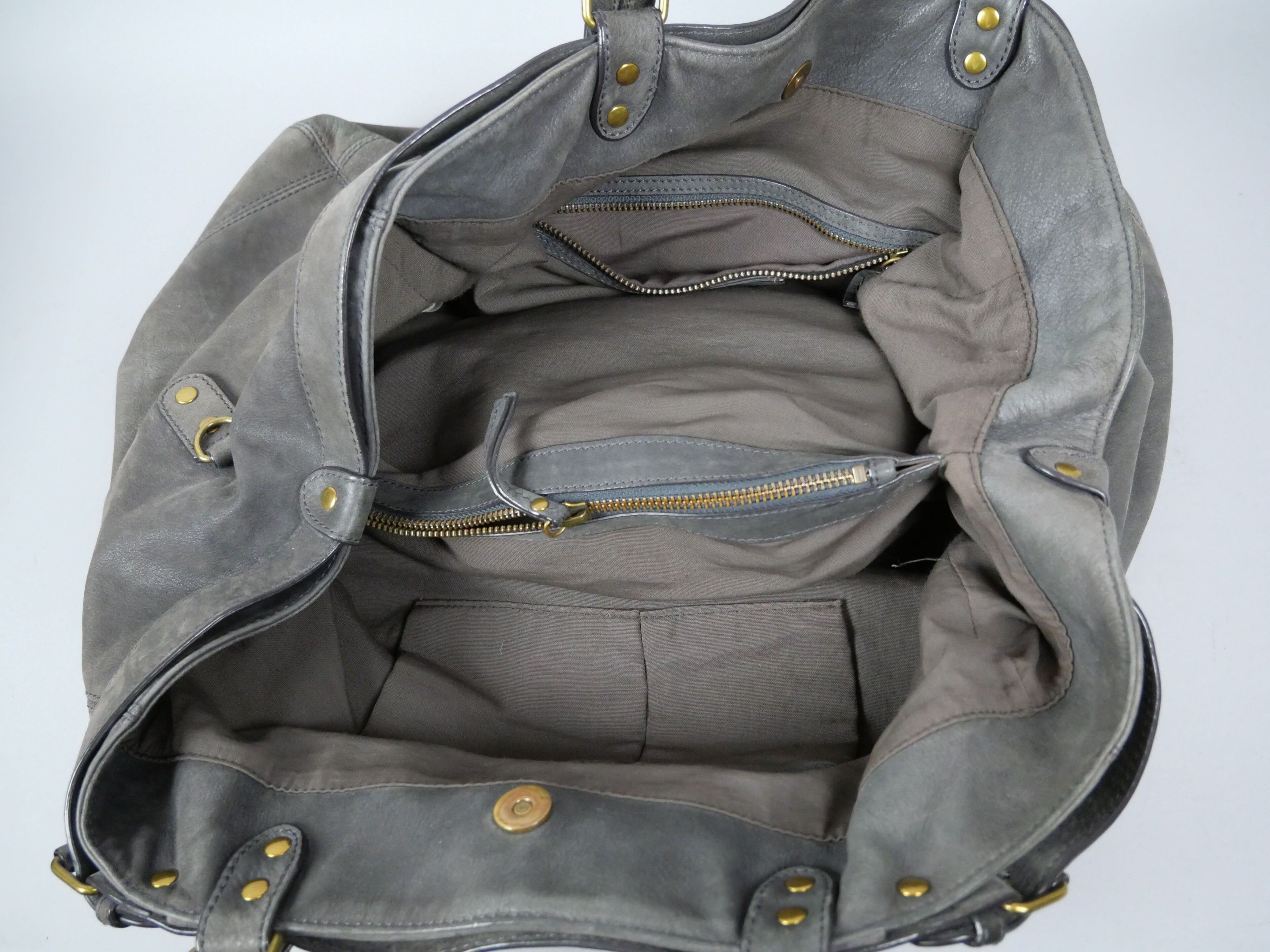 Moon" bag in smooth grey leather. Press stud fastening, two-compartment interior with zipped pockets.