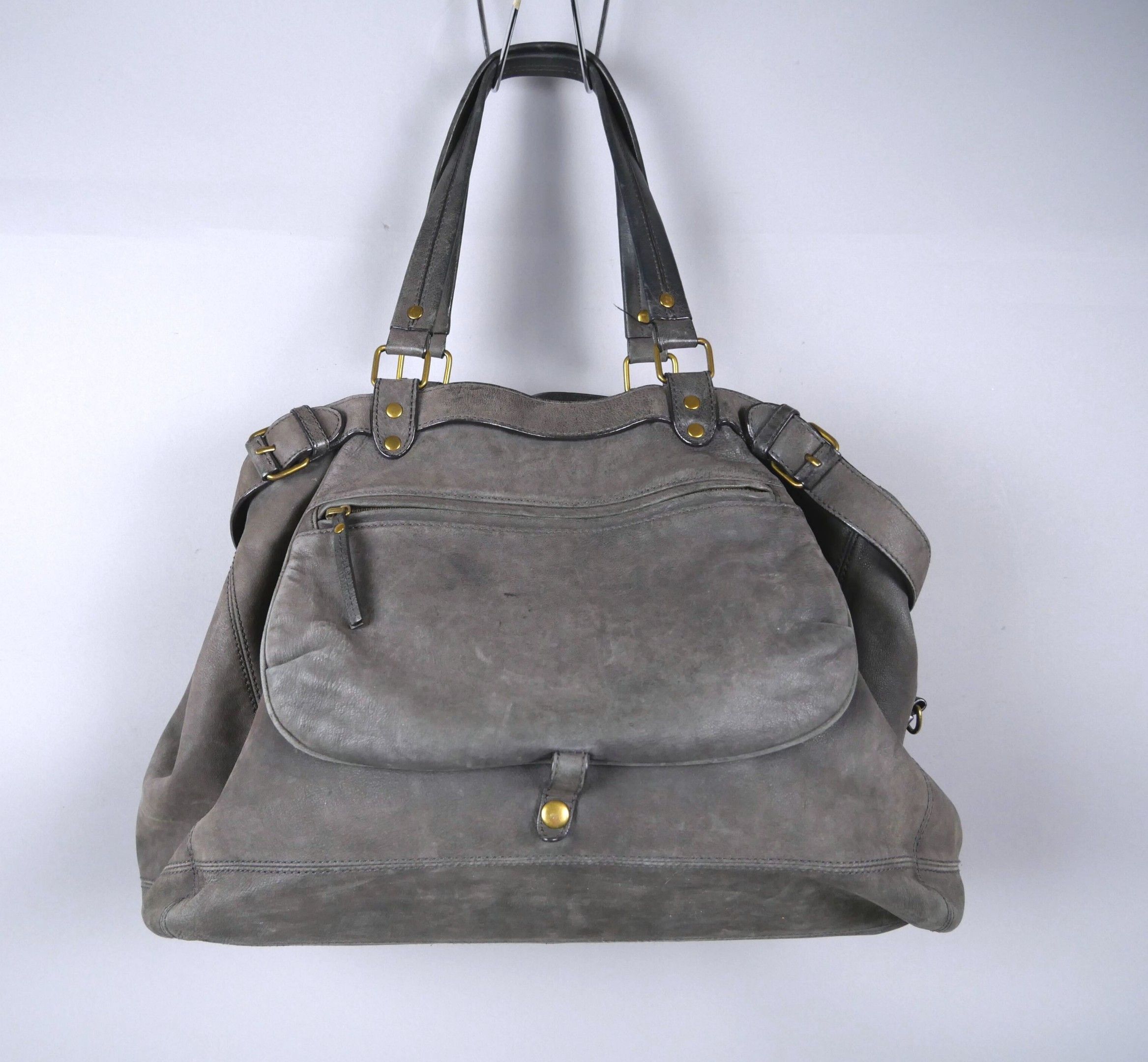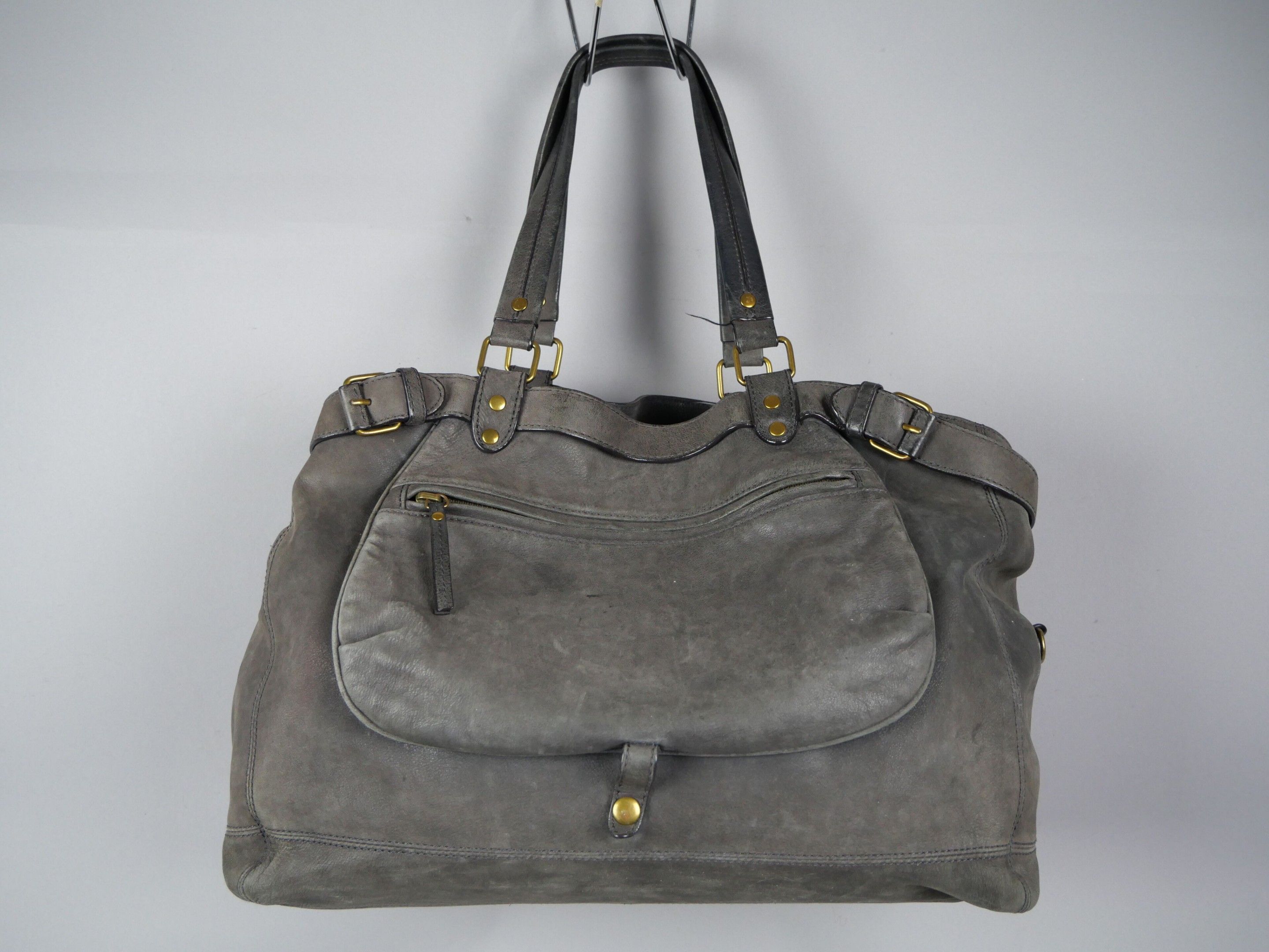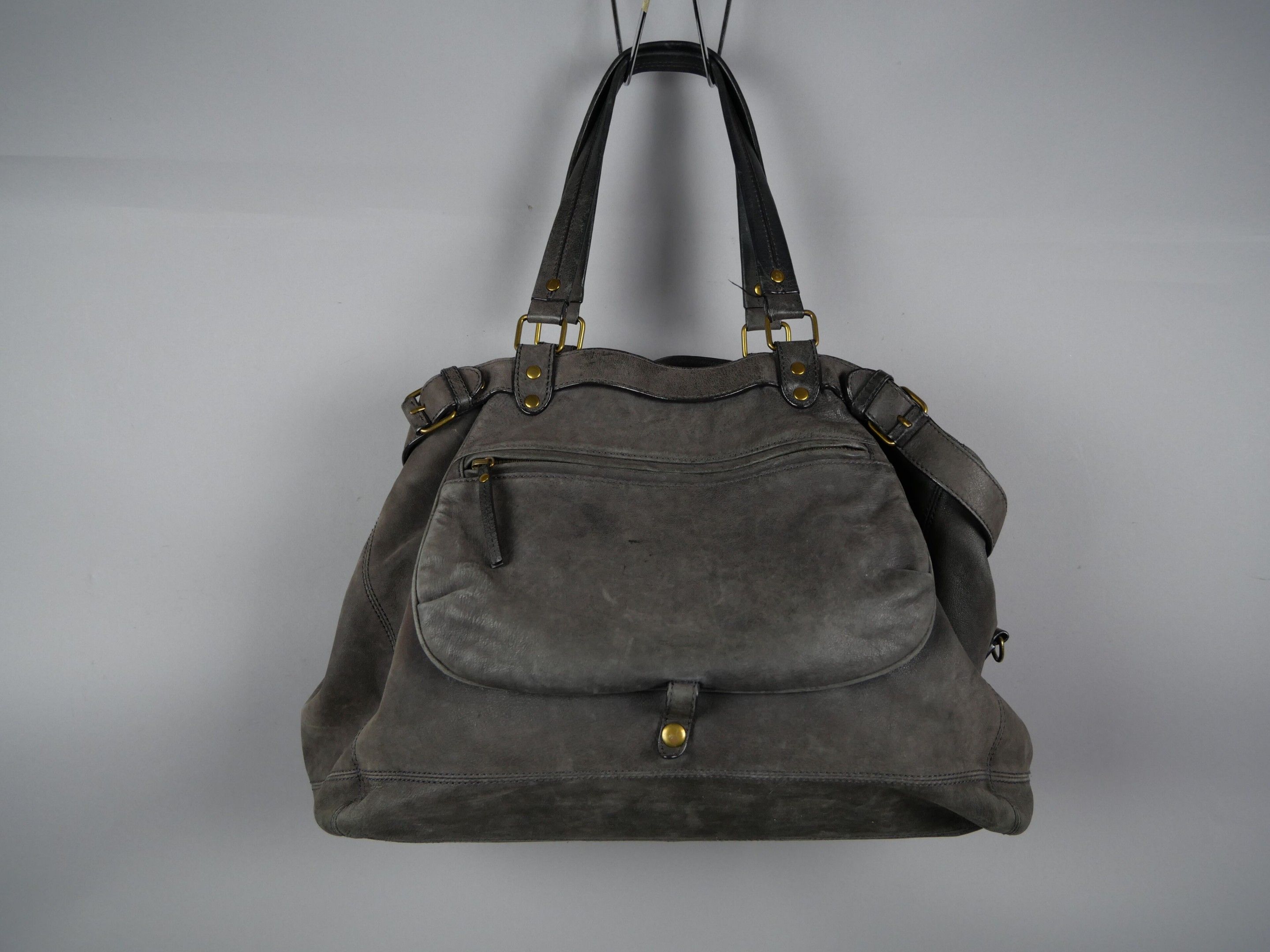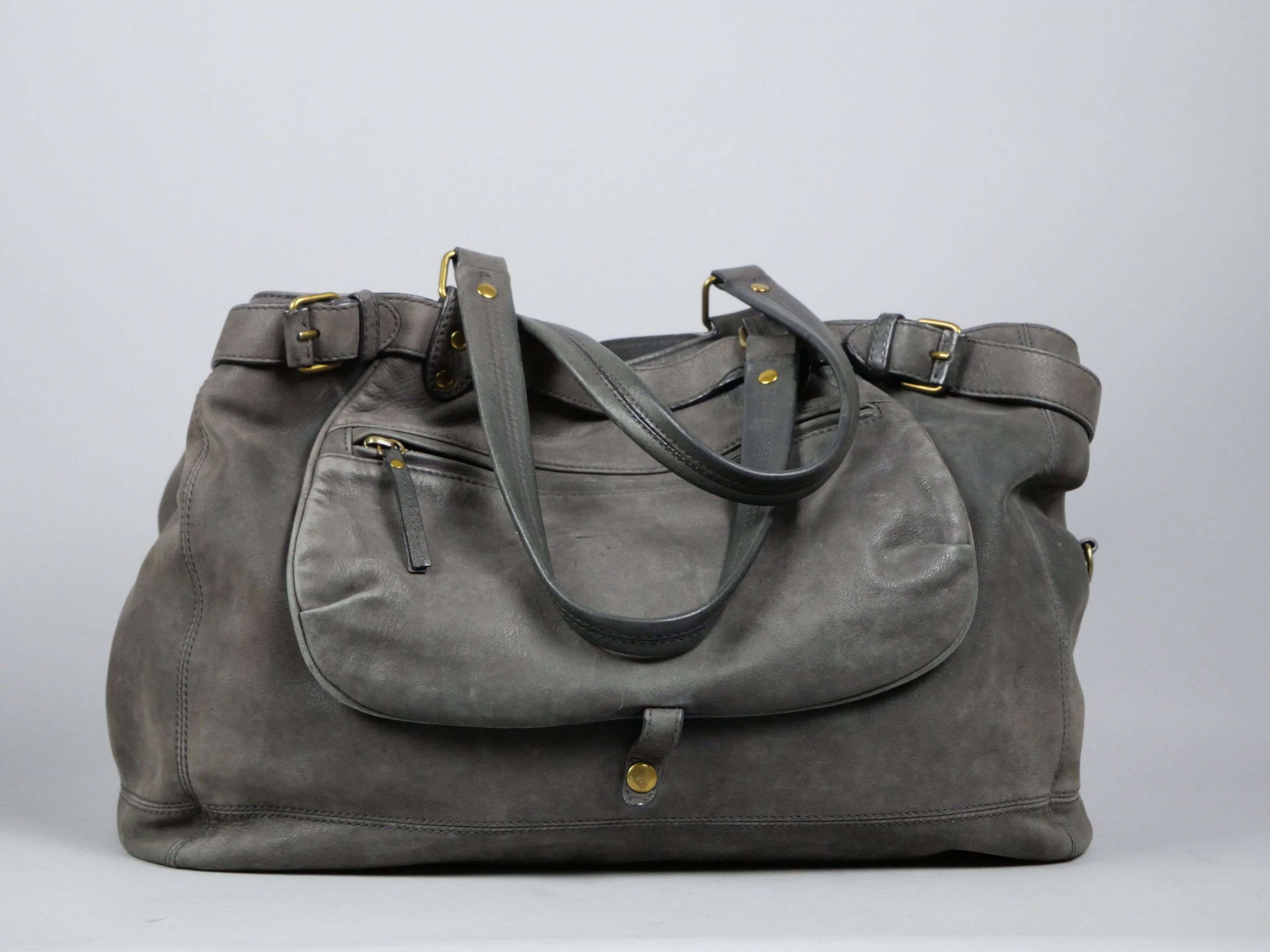 Moon" bag in smooth grey leather. Press stud fastening, two-compartment interior with zipped pockets.