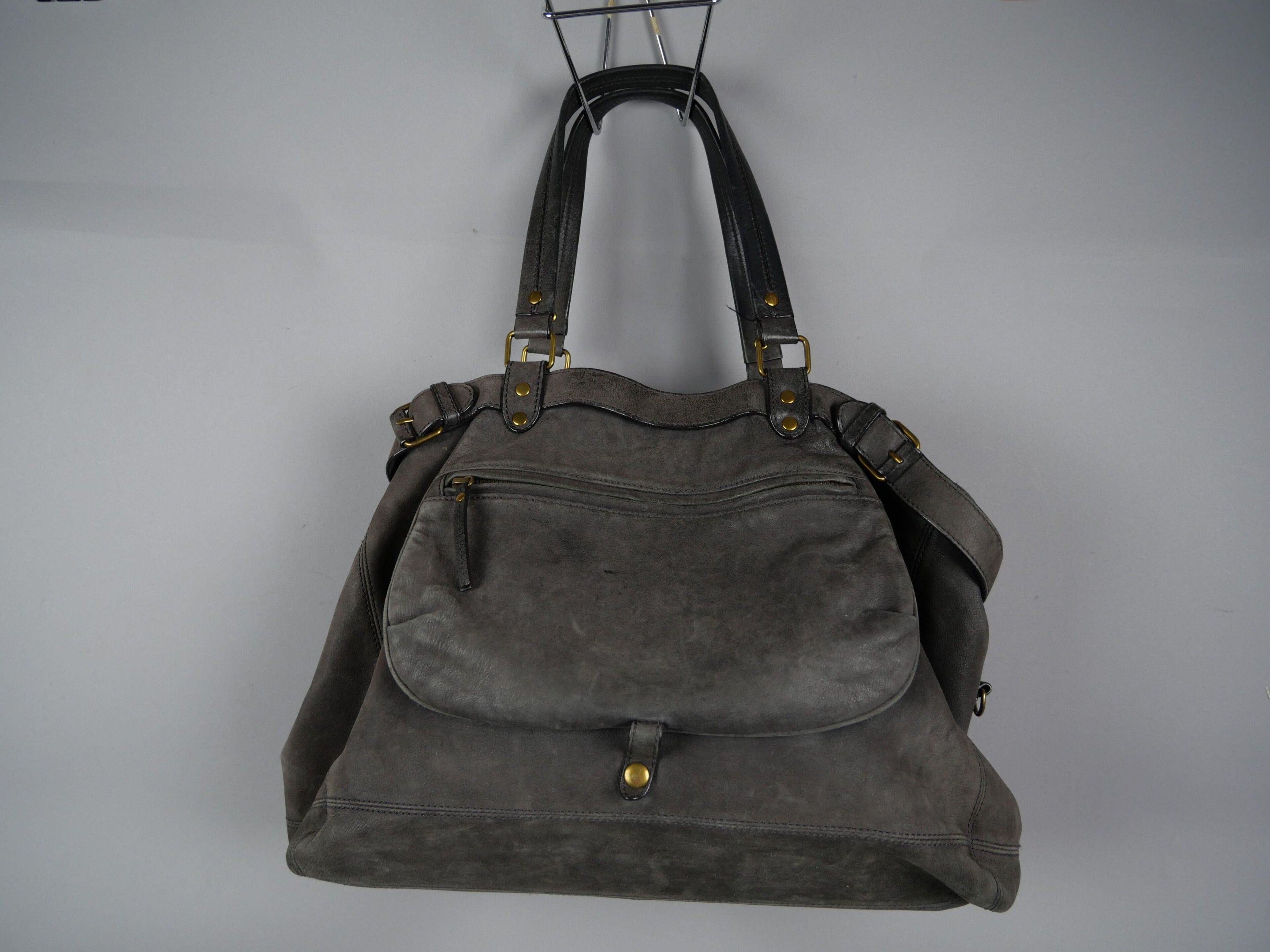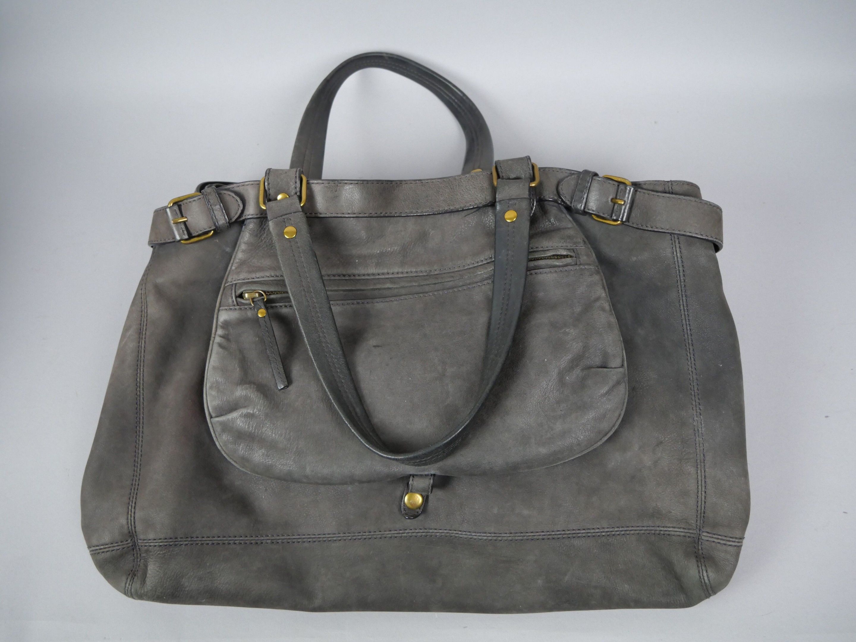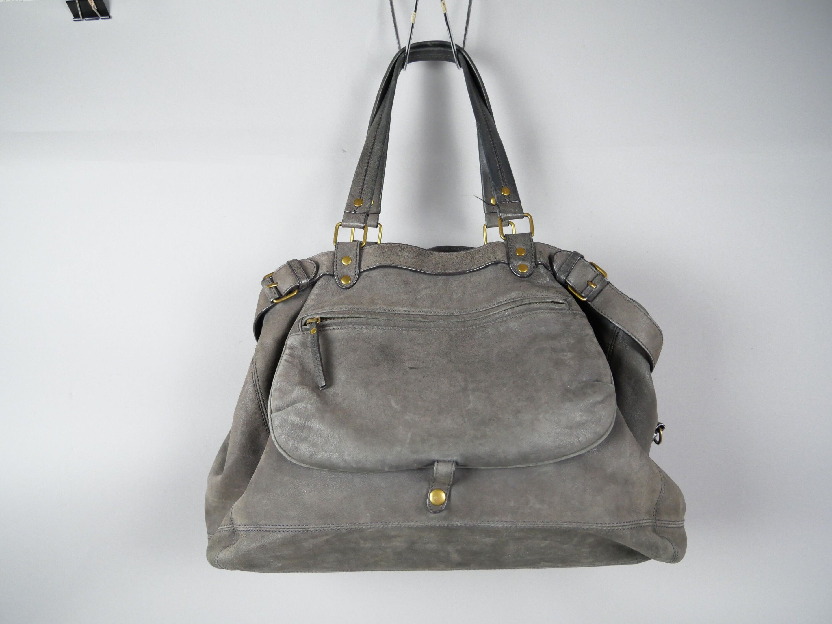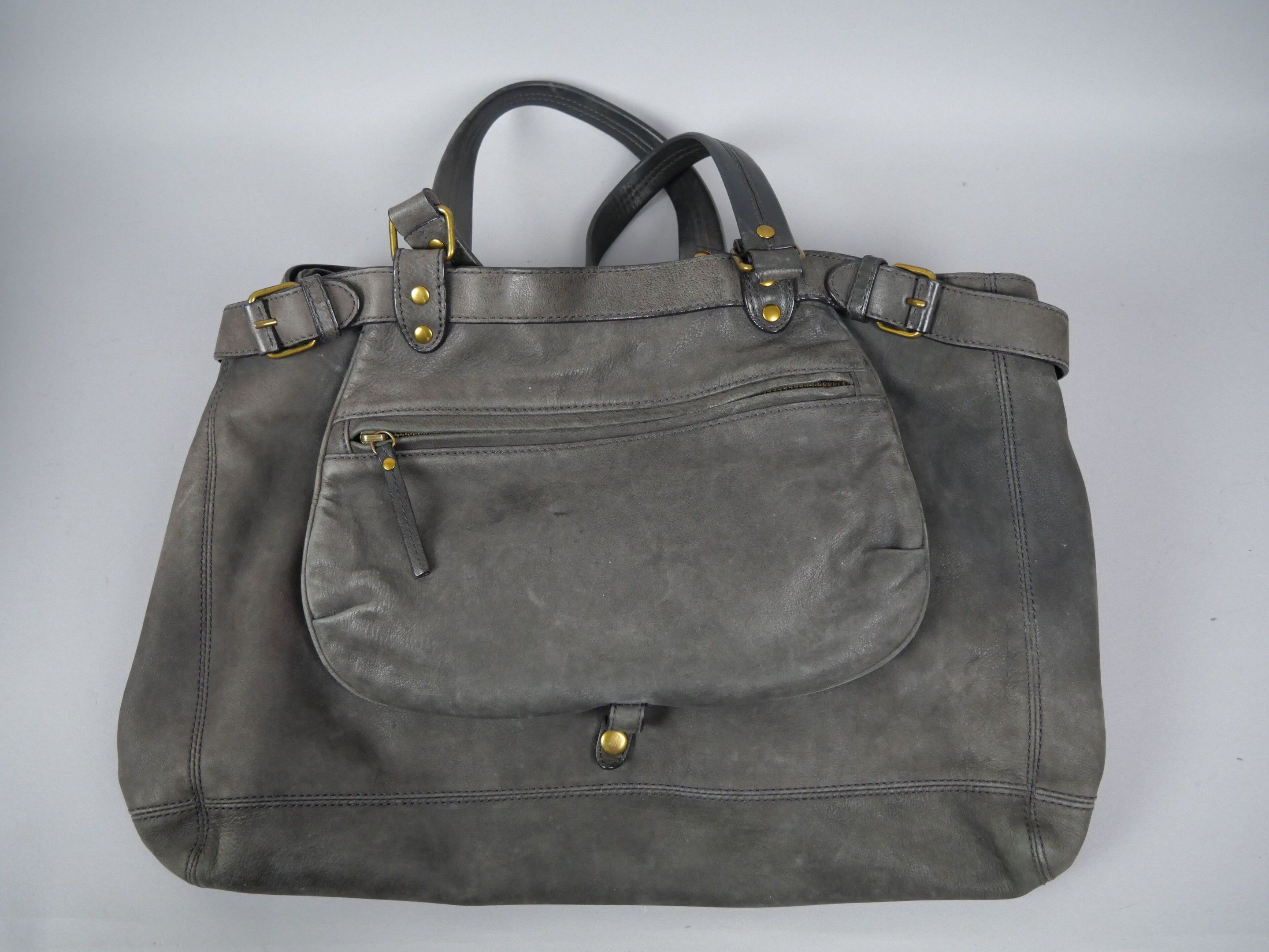 Moon" bag in smooth grey leather. Press stud fastening, two-compartment interior with zipped pockets.