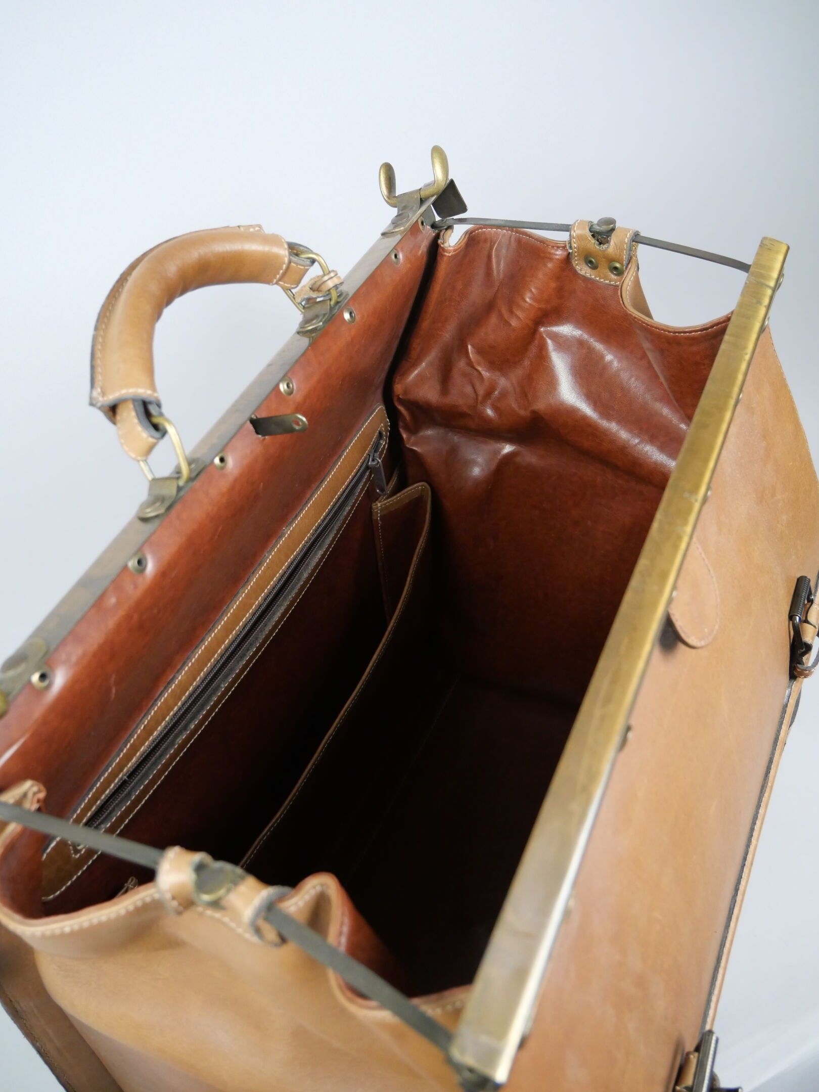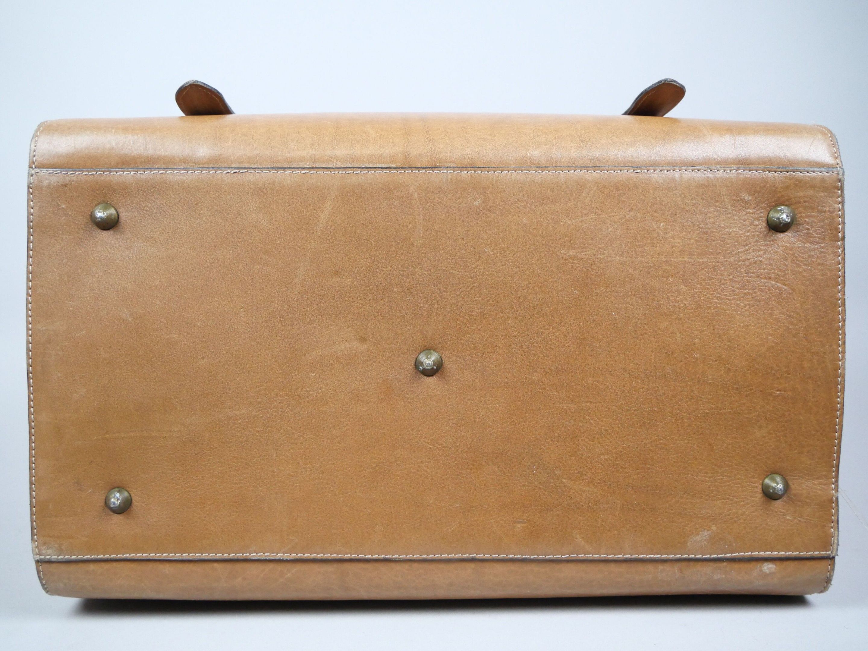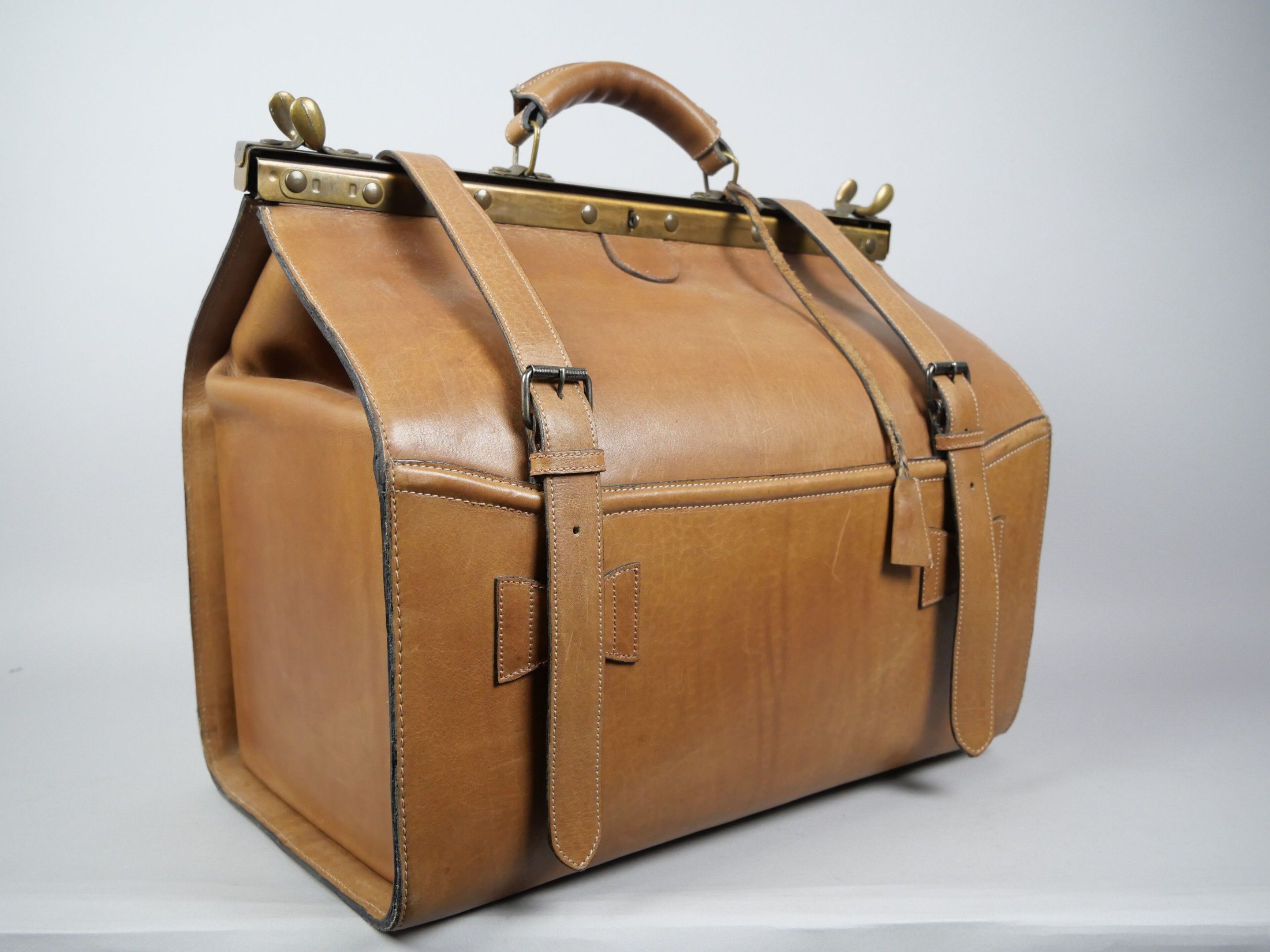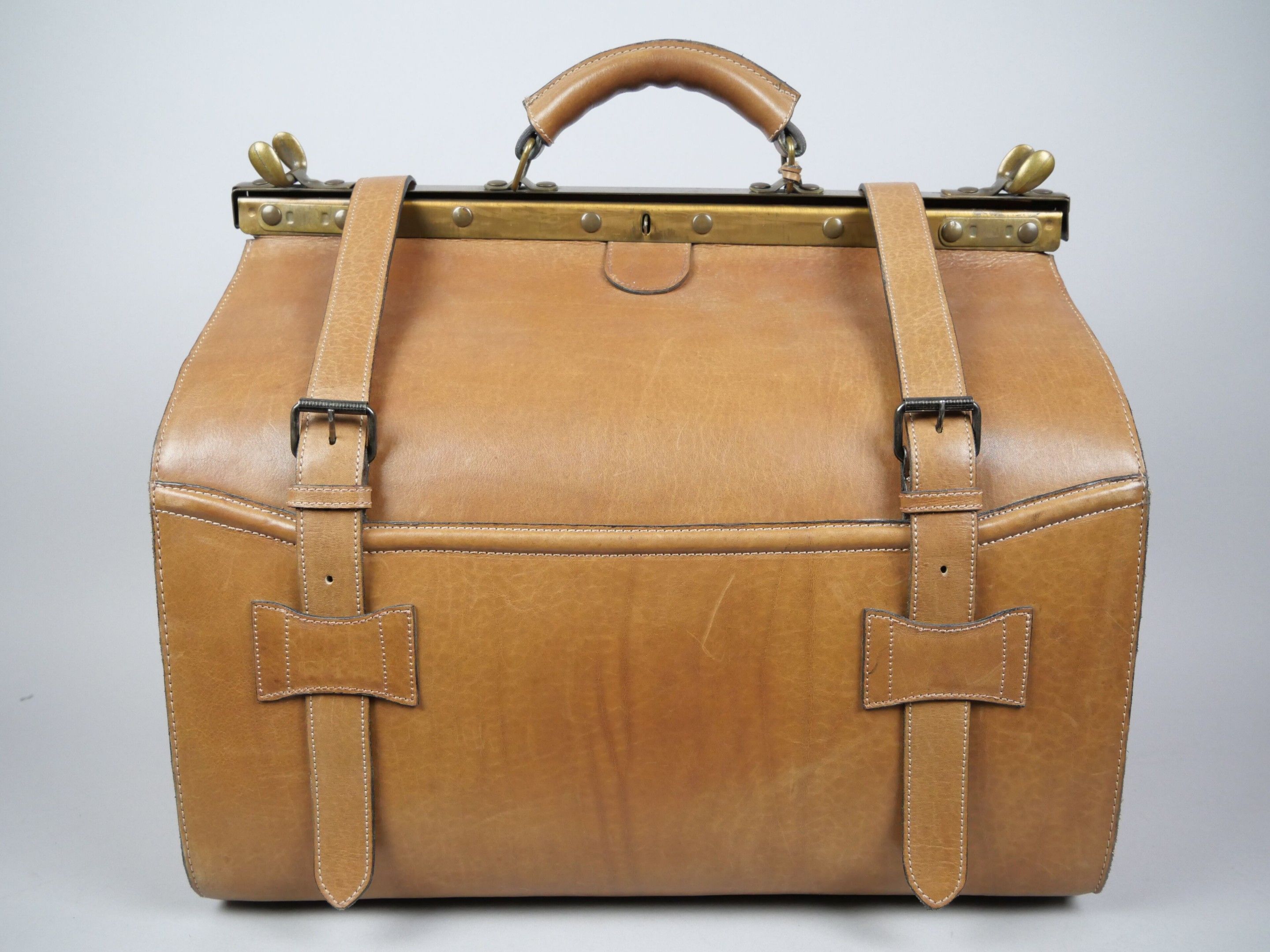 Camel leather travel bag in the style of a leather doctor's bag, with metal-finish hard closure and two straps. Leather-covered top handle. Compartmented interior and zipped pocket.