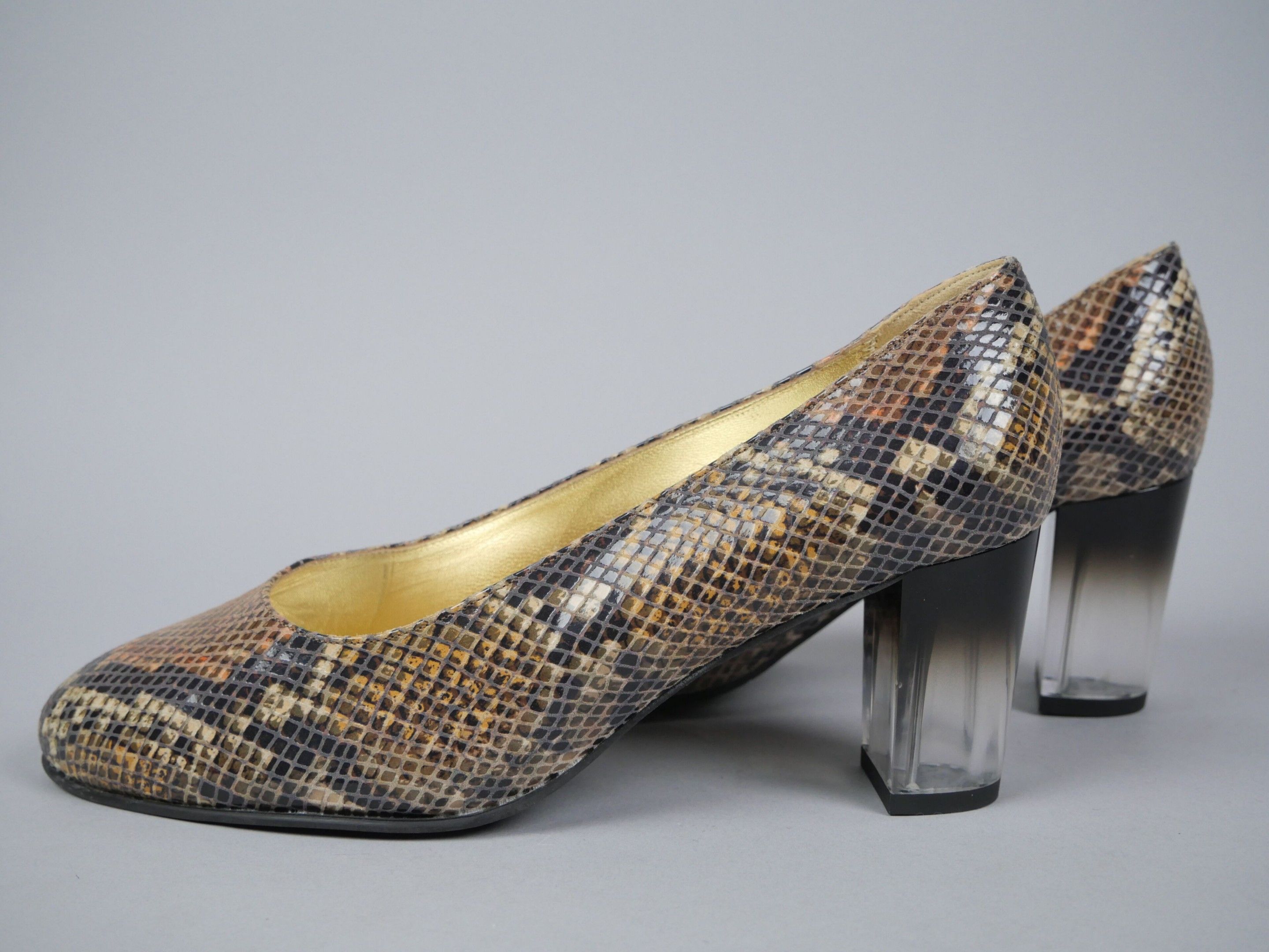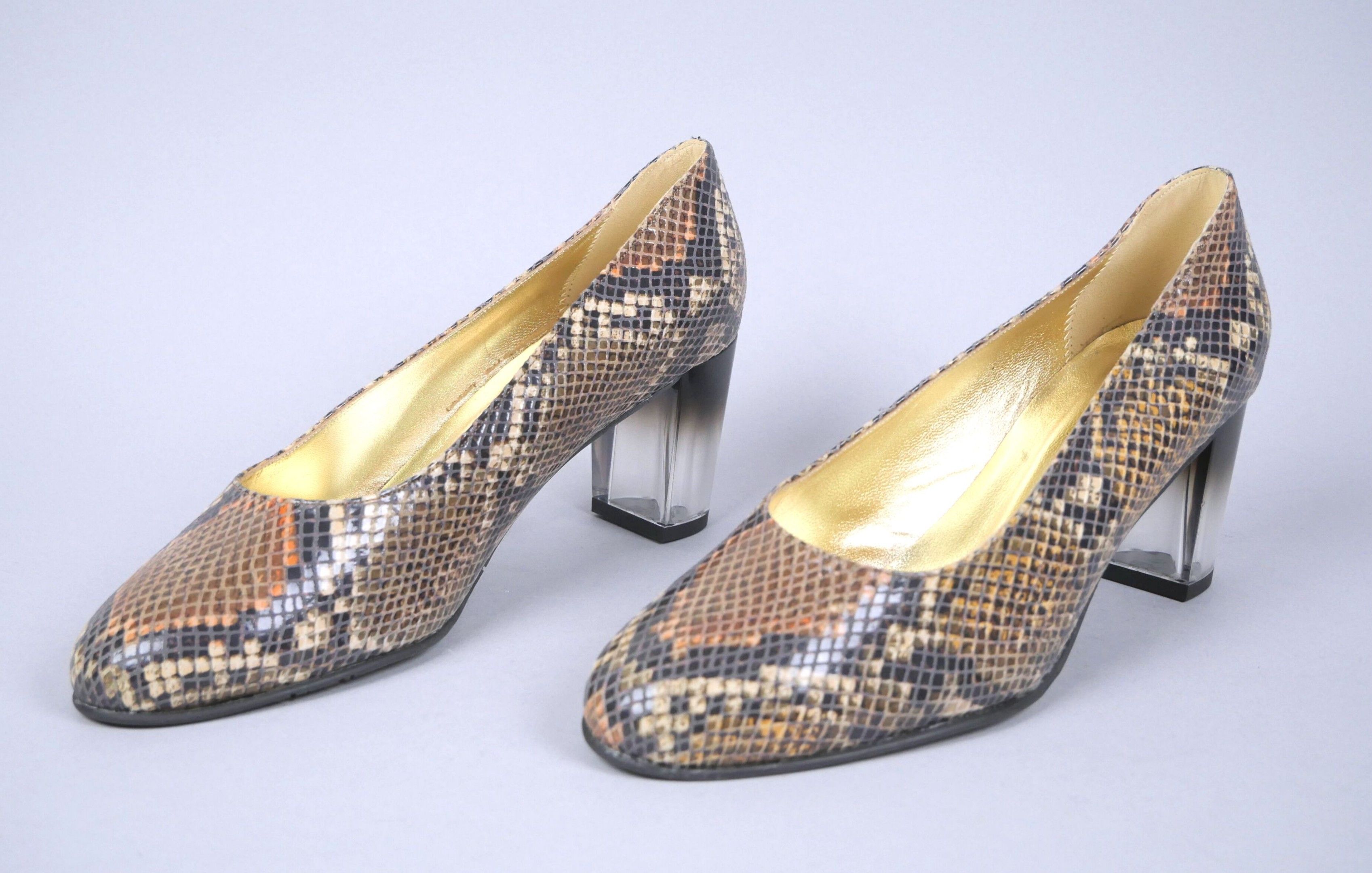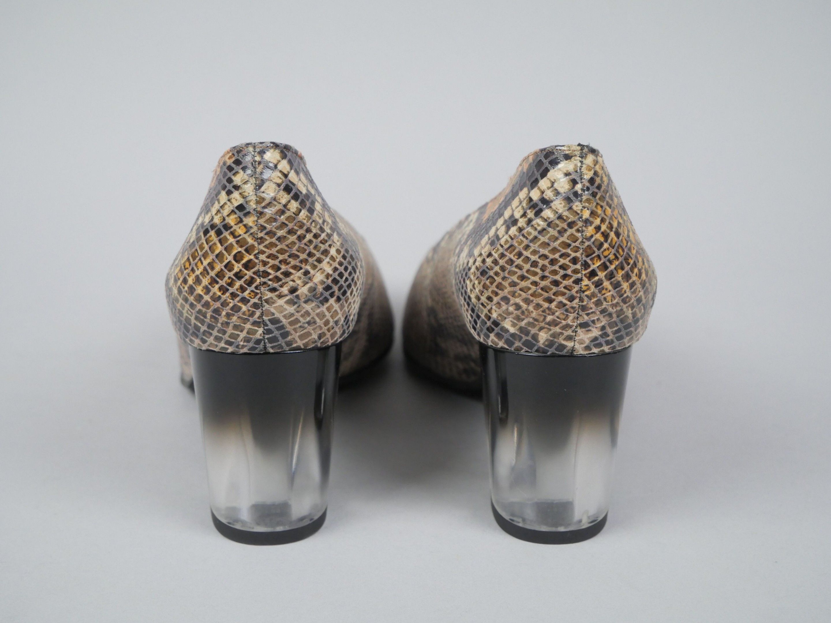 Pair of python-effect leather pumps. Translucent, slightly black gradient heel.