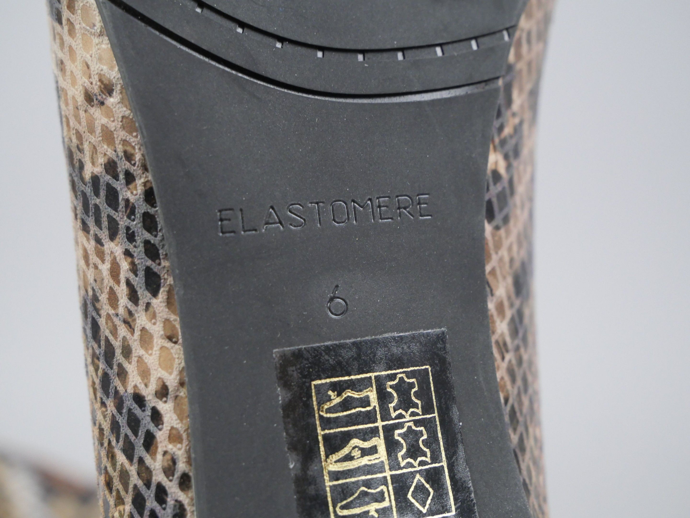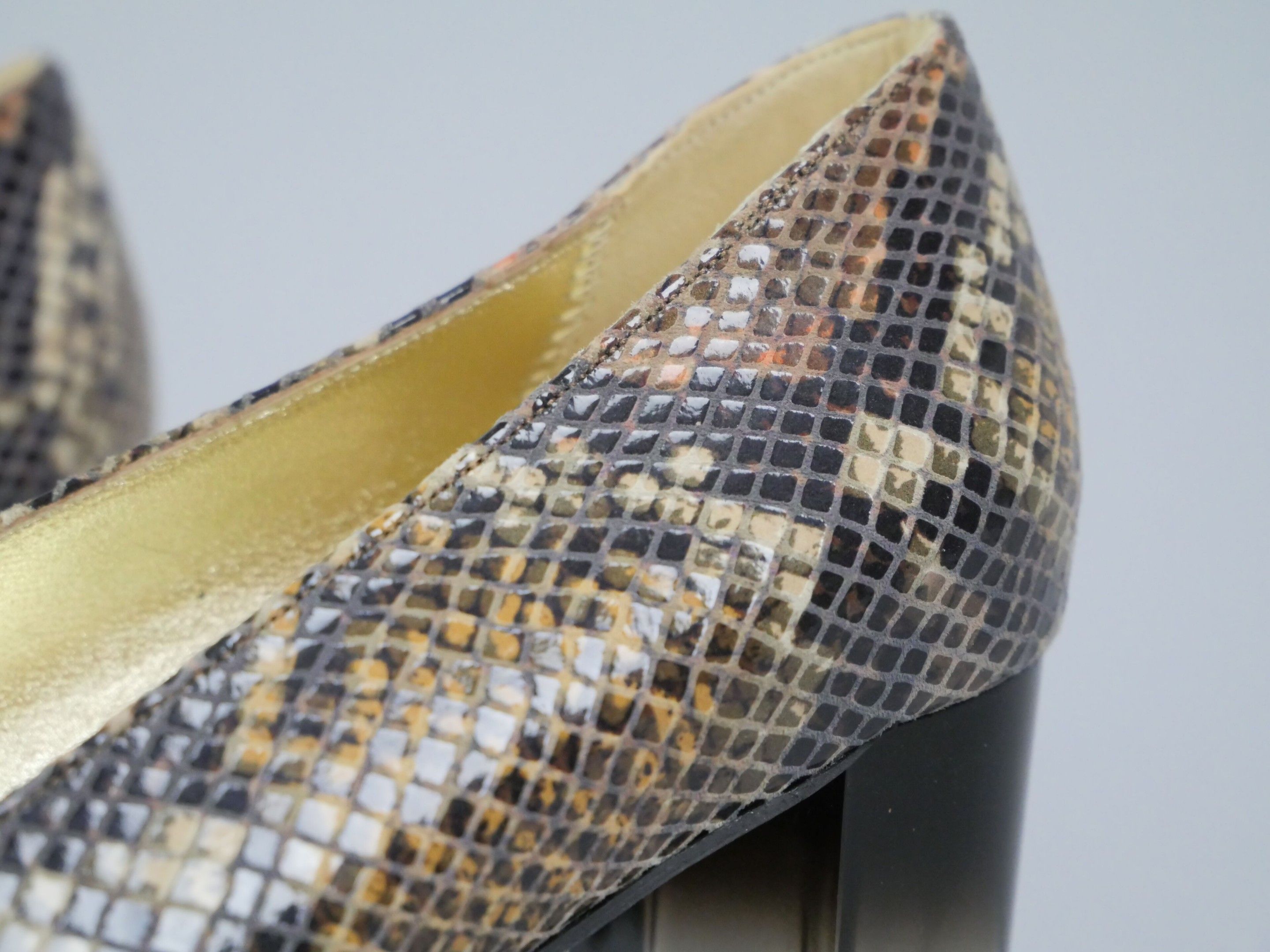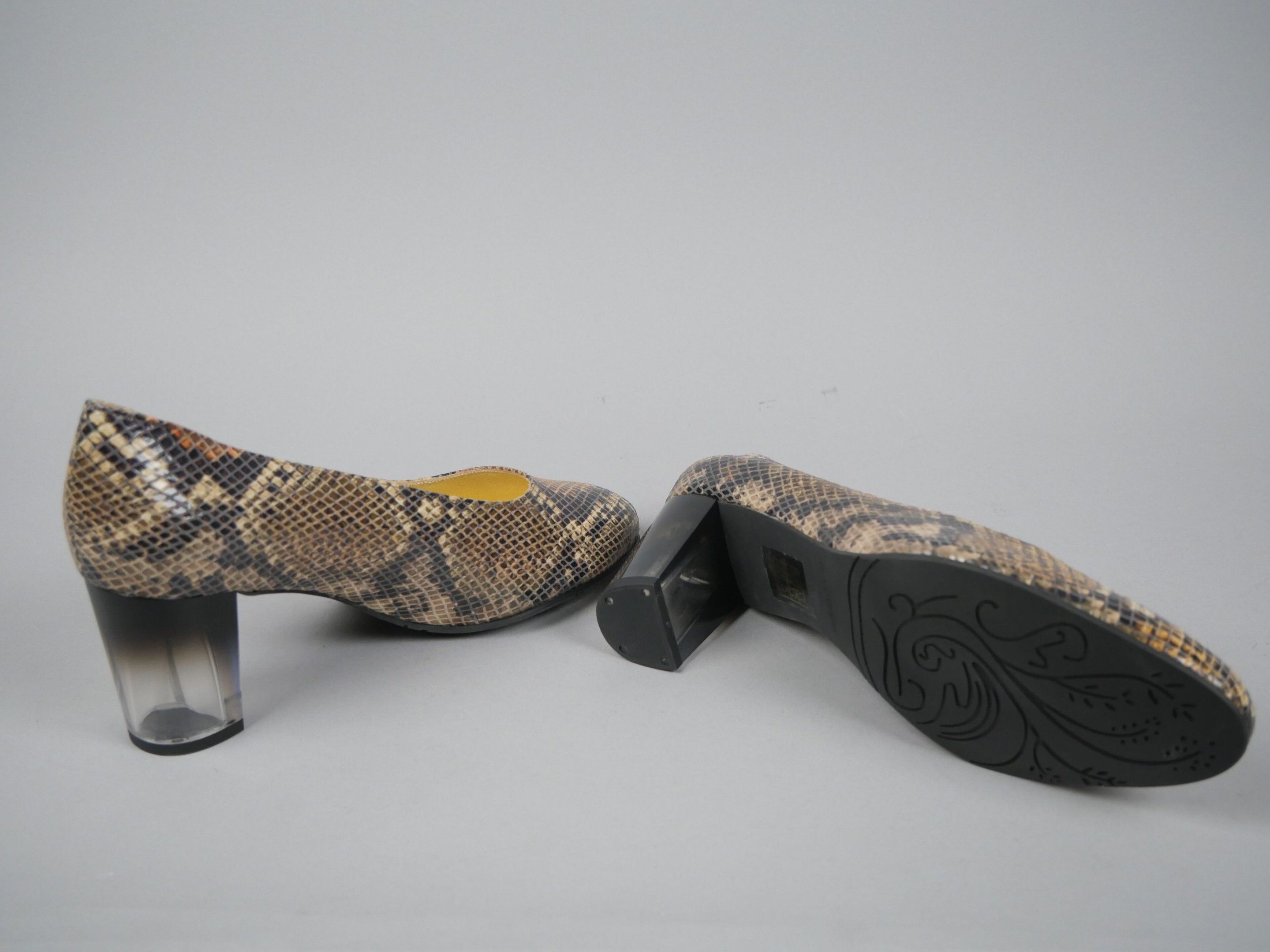 Pair of python-effect leather pumps. Translucent, slightly black gradient heel.