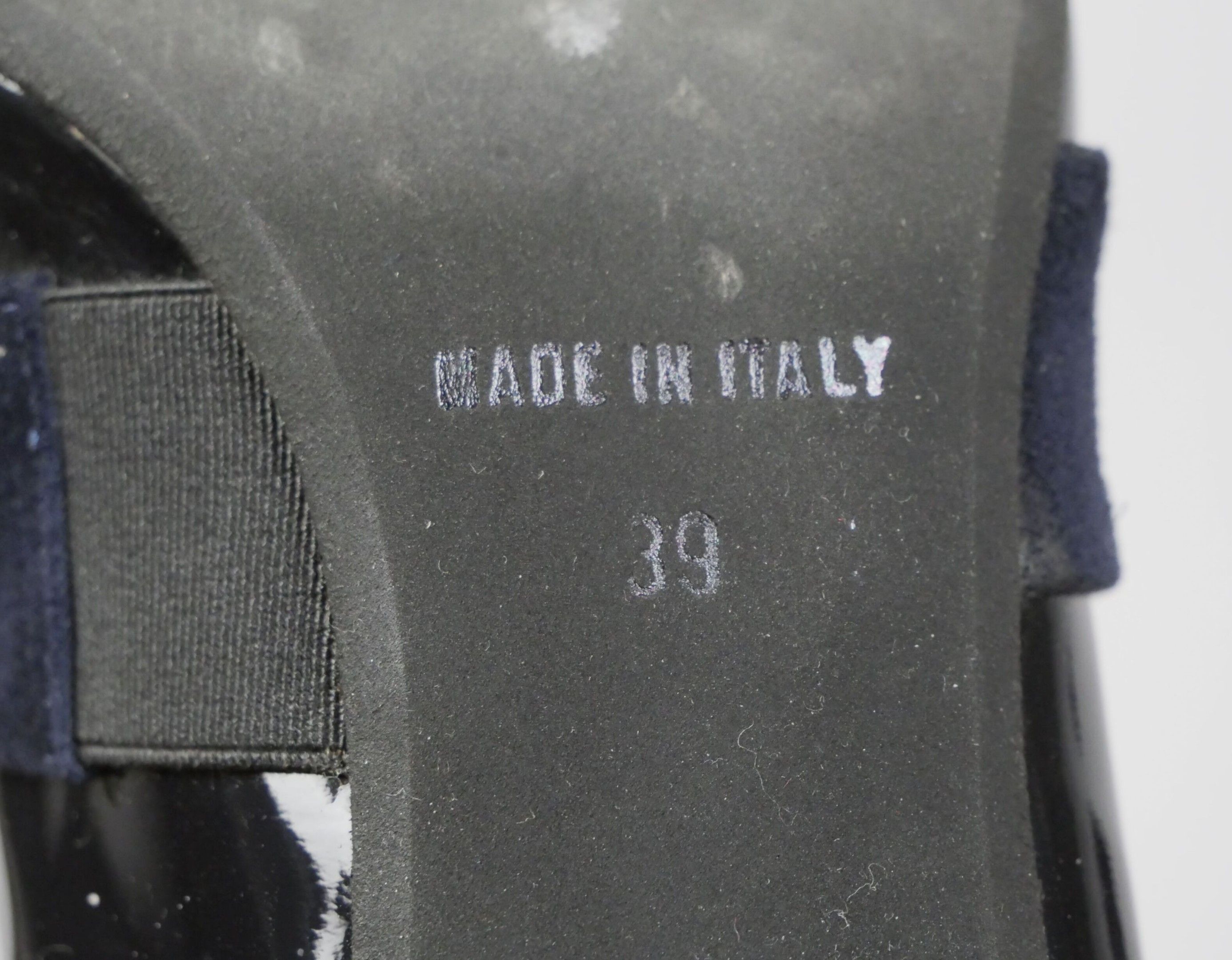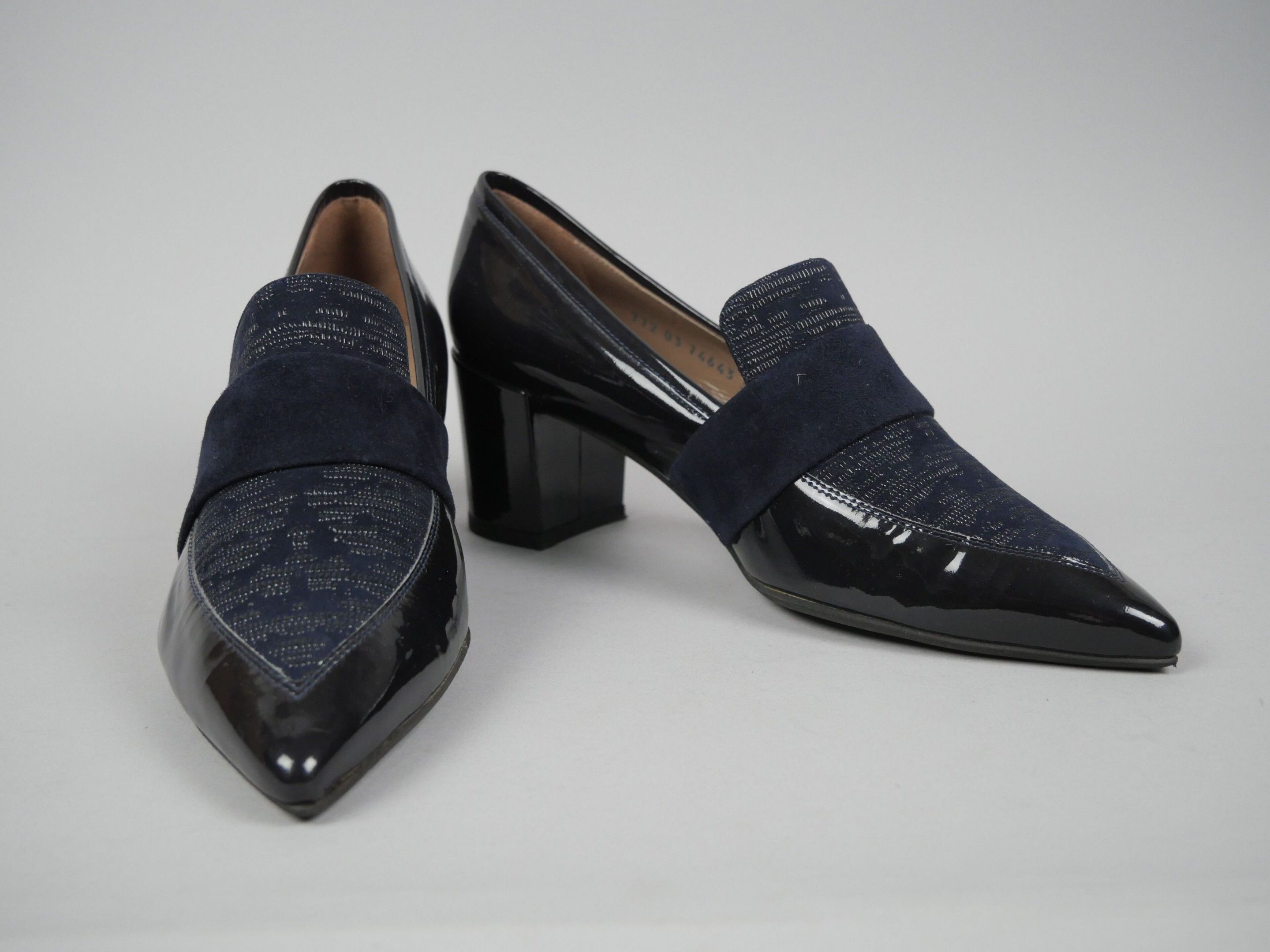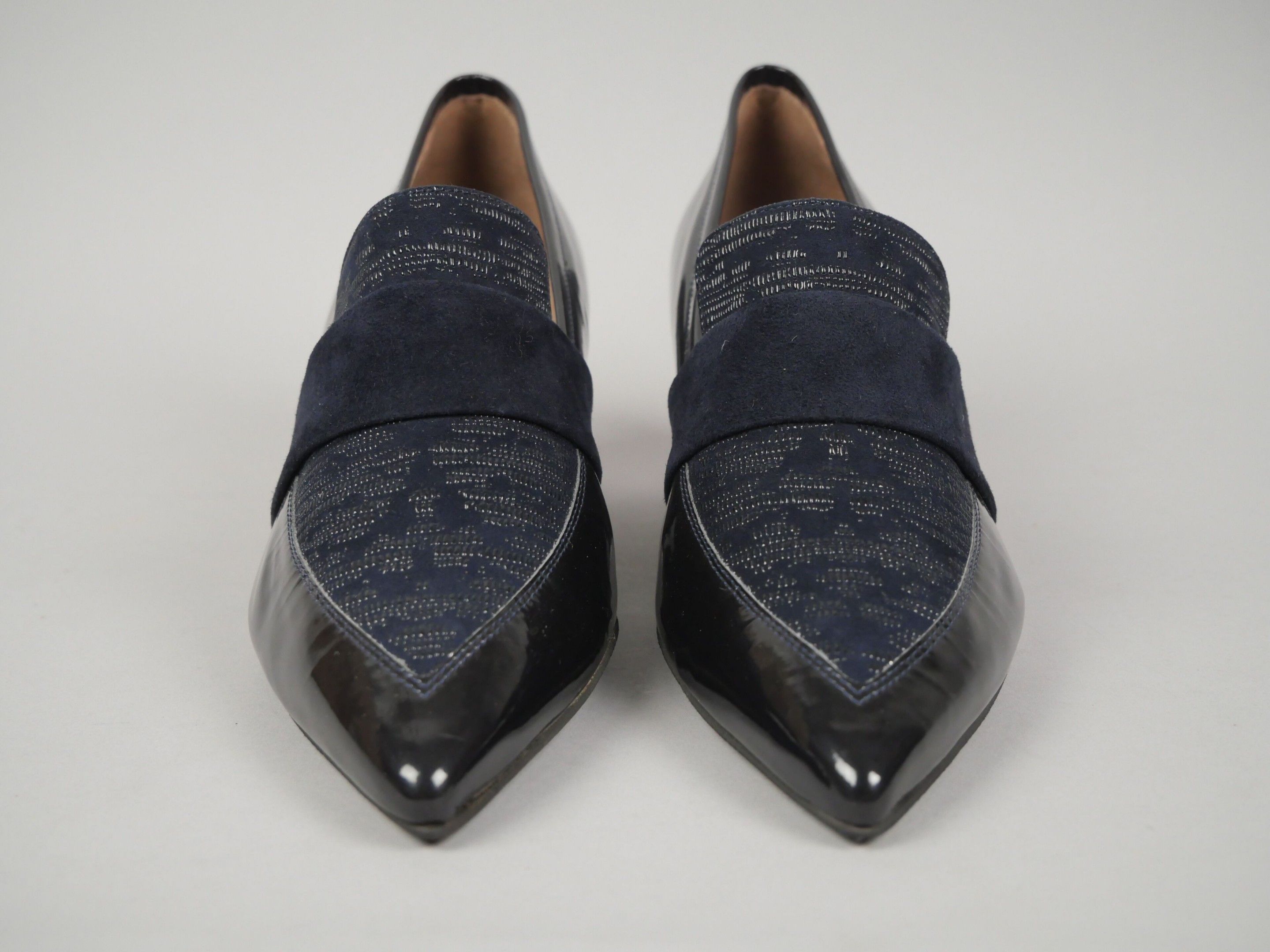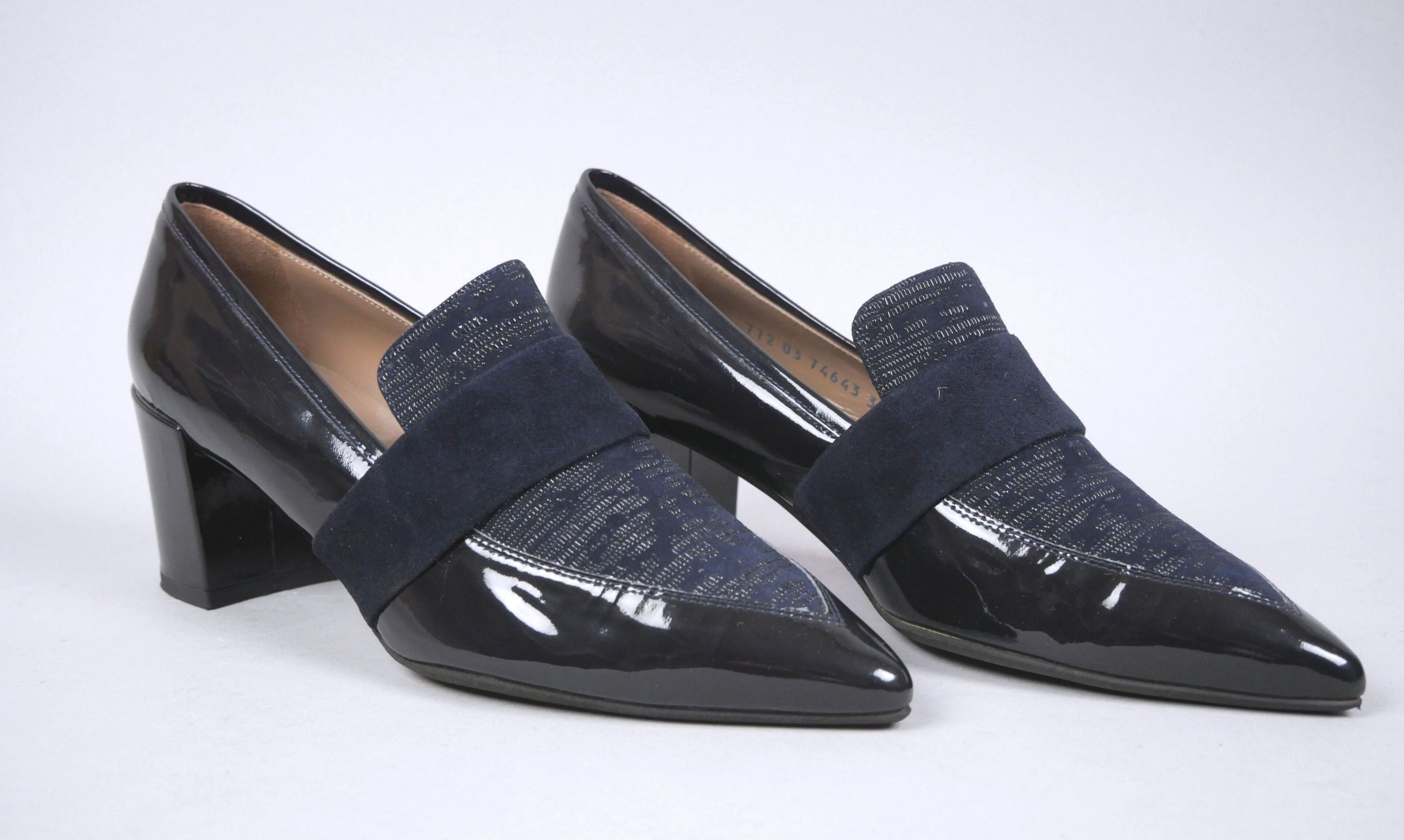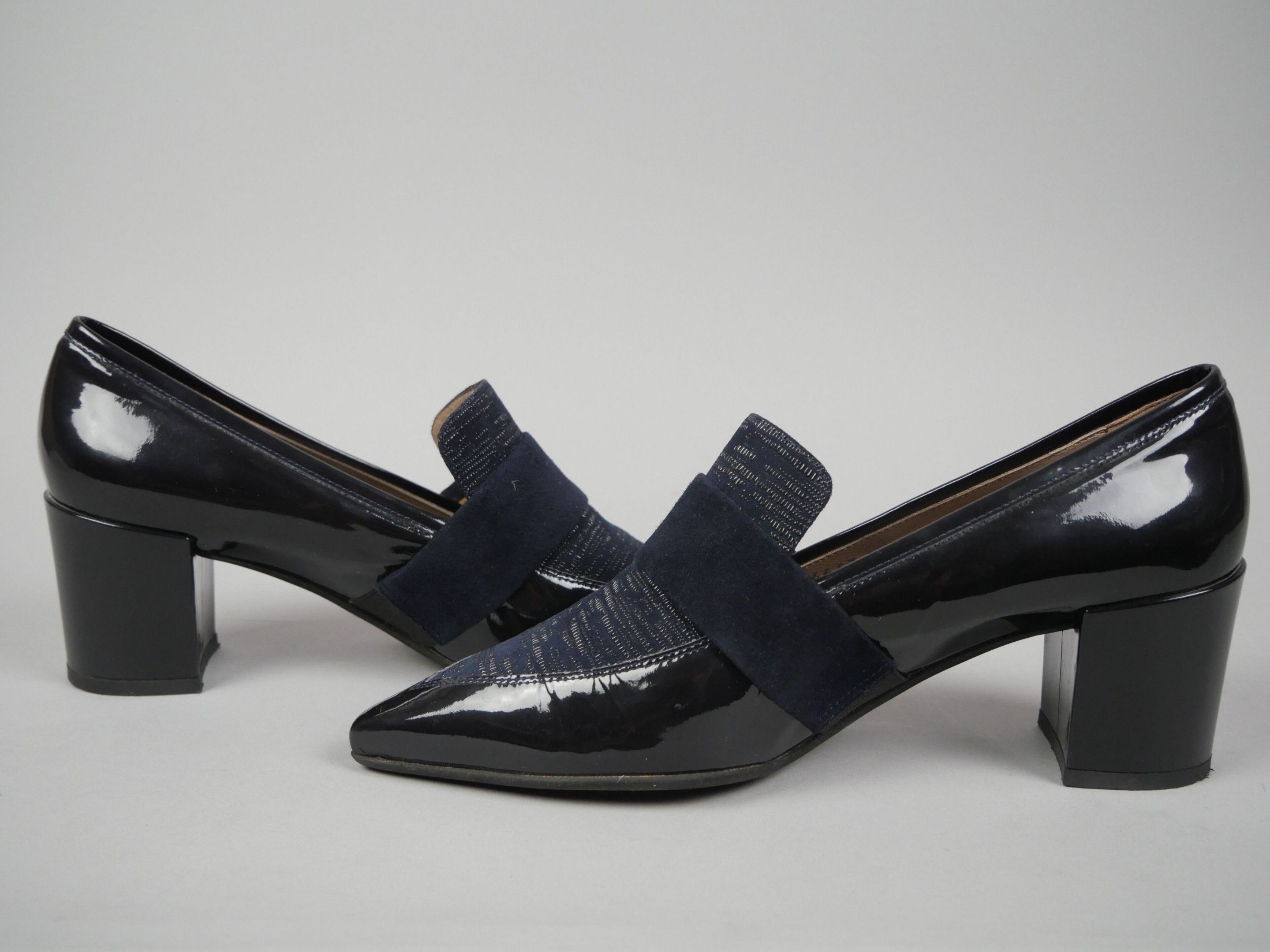 Pair of ladies' shoes in patent leather, velvet and navy blue tweed.