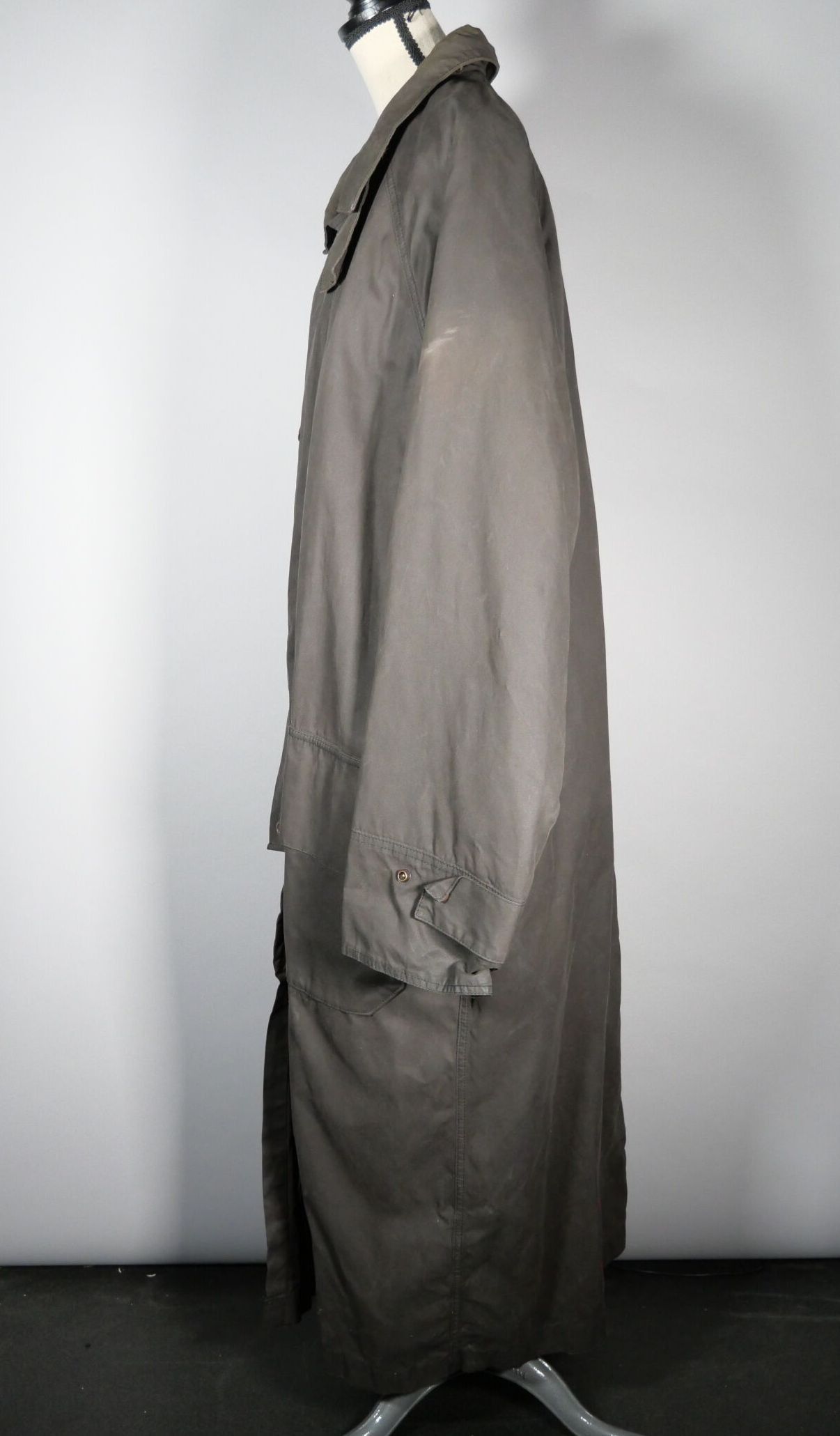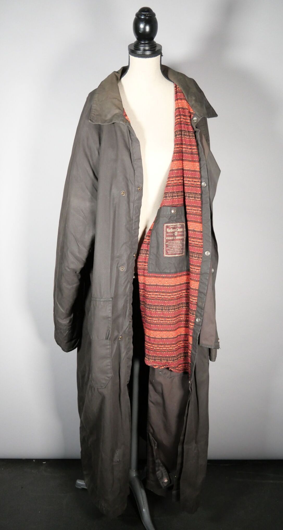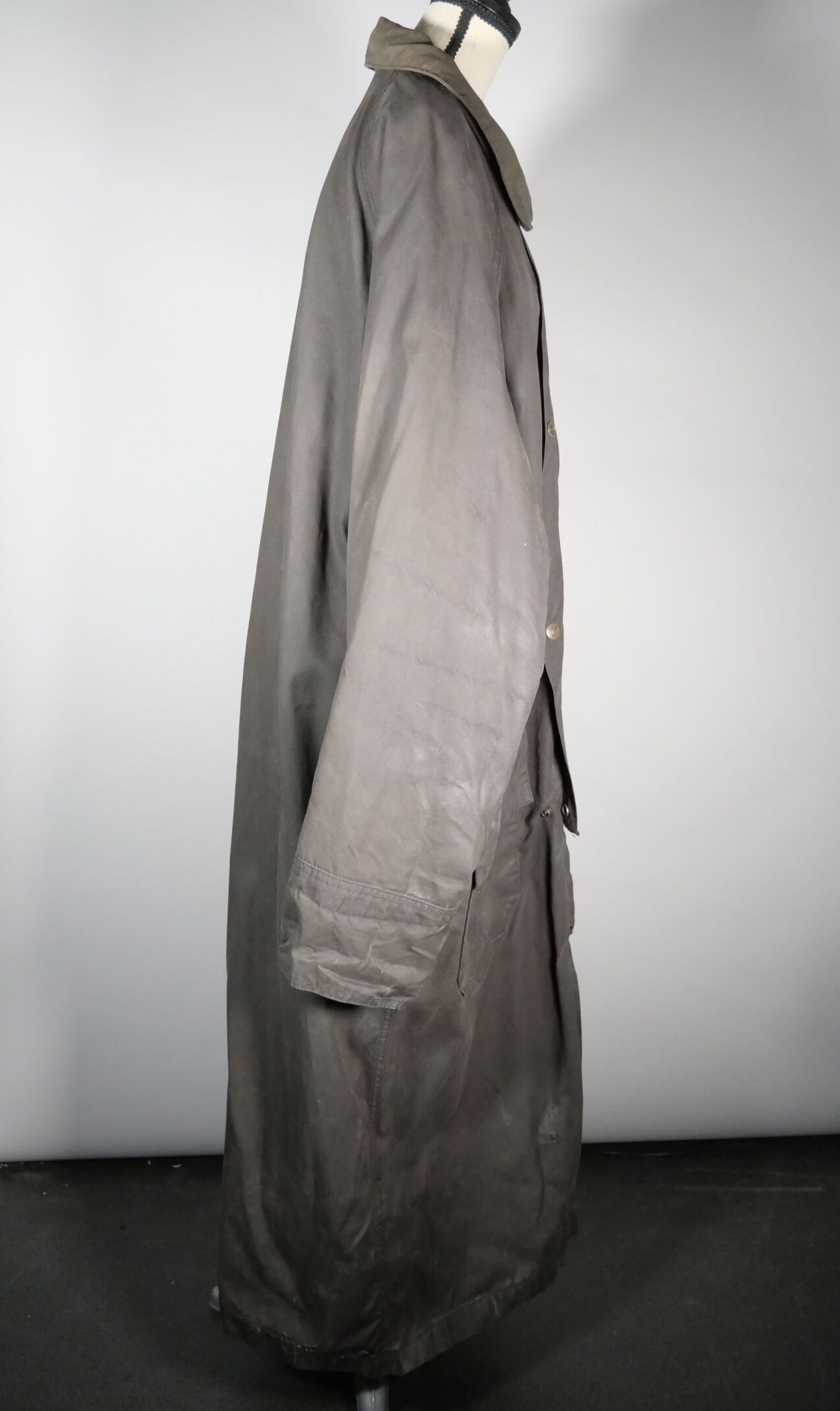 Men's coat in cotton blend (80%), "The original riding coat" model, long raglan sleeves, double snap button fastening, two flap pockets. Removable hood. Wool blend lining (45%) decorated with geometric frieze motifs in red tones.