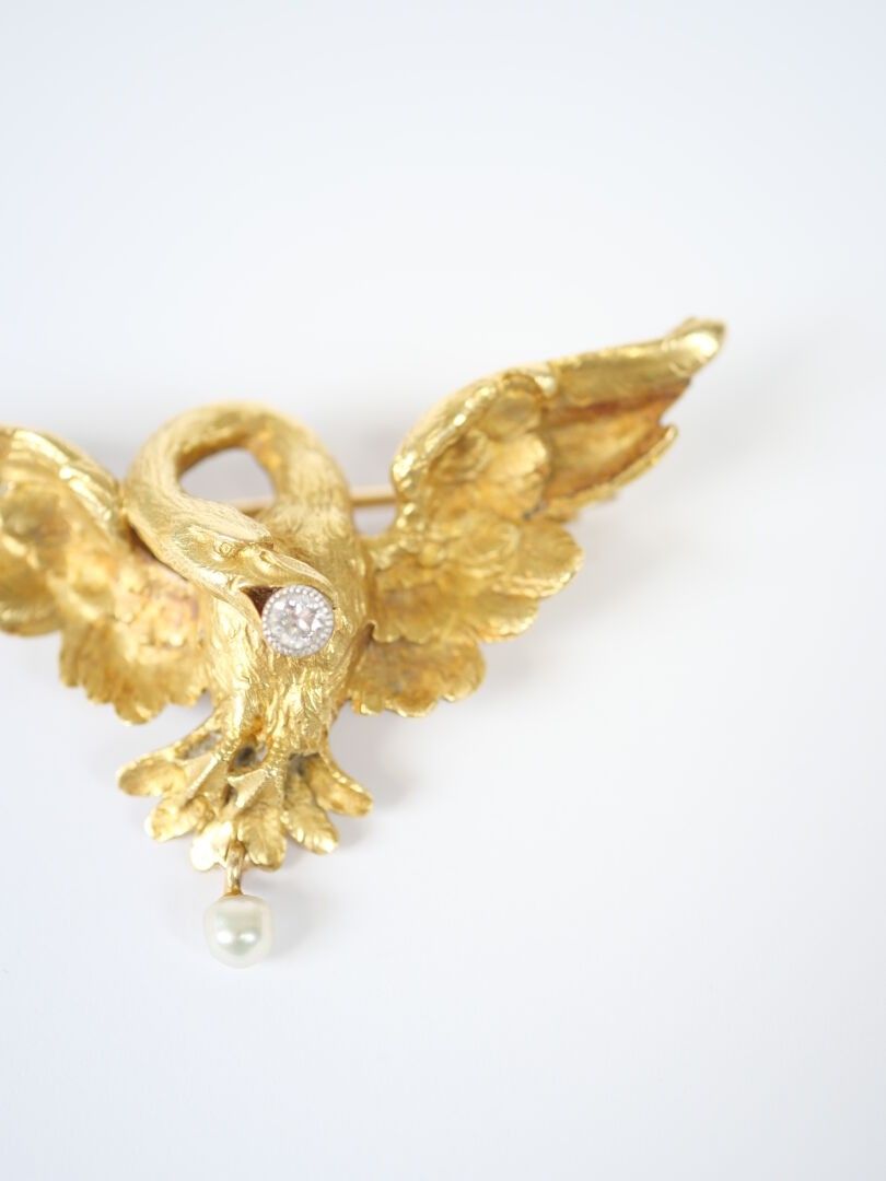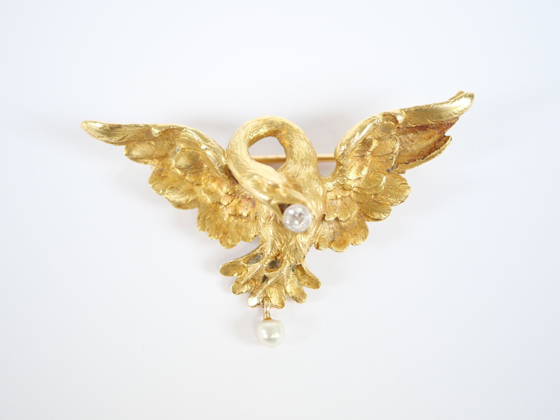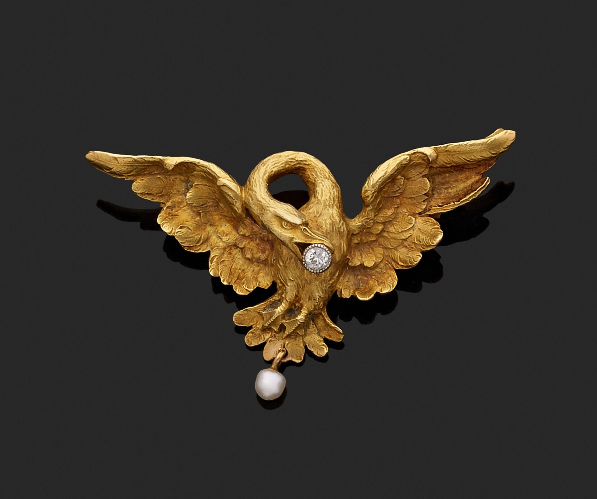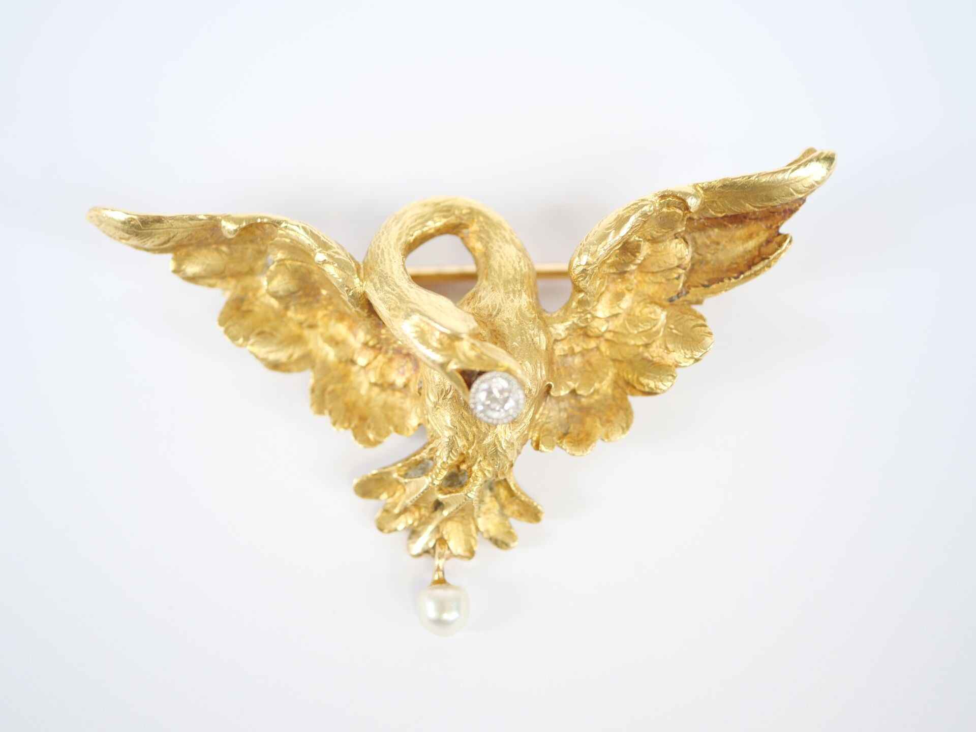 An important 18K (750‰) yellow gold pendant brooch decorated with a swan with outstretched wings, holding in its beak a small round old-cut diamond weighing approximately 0.07 carat, mounted in a closed setting and embellished with a small baroque pearl pendant.