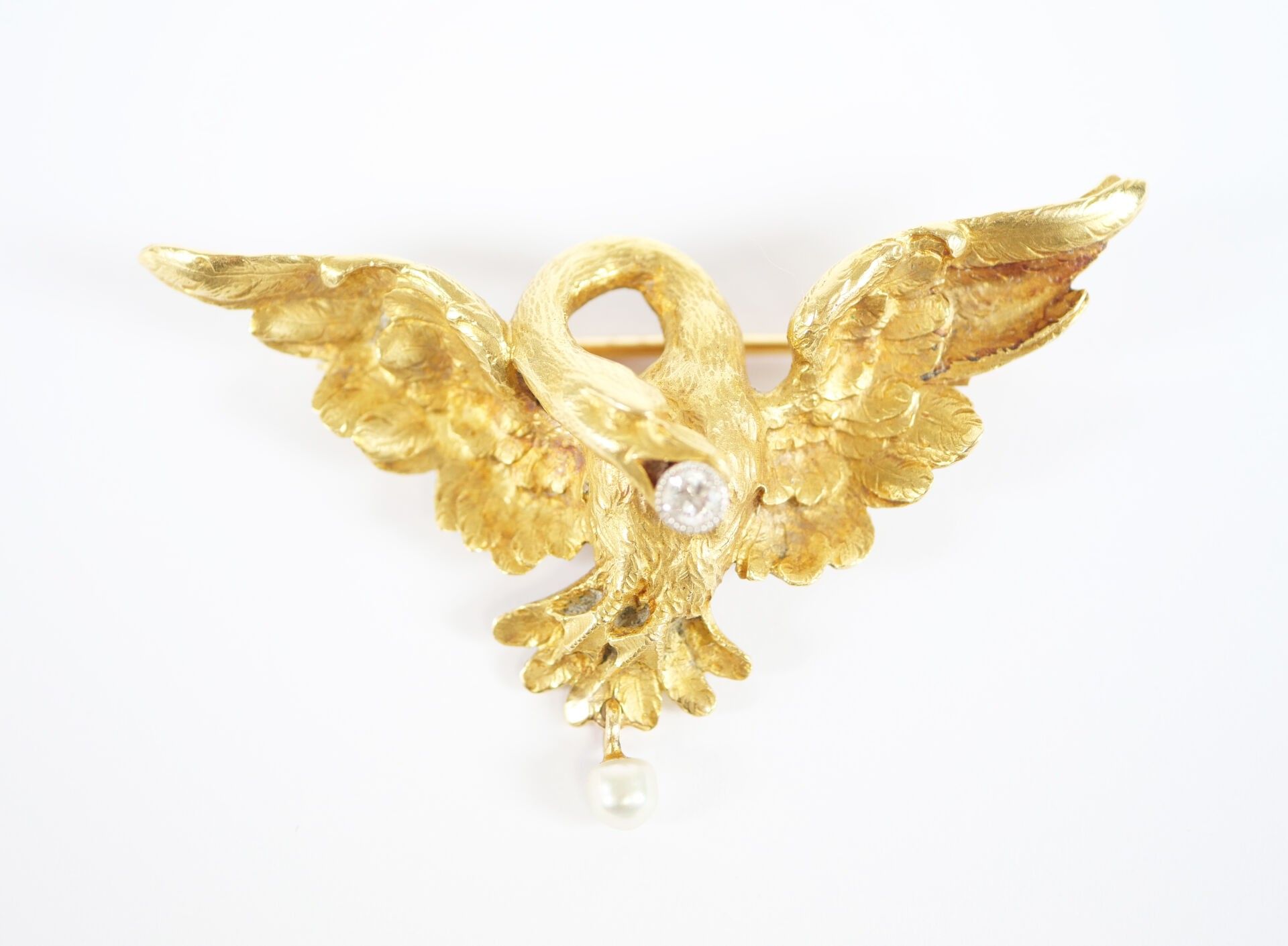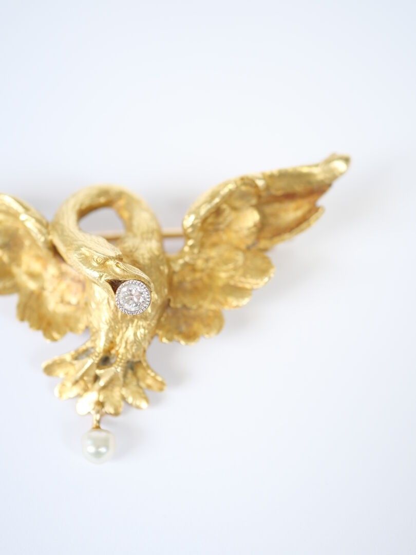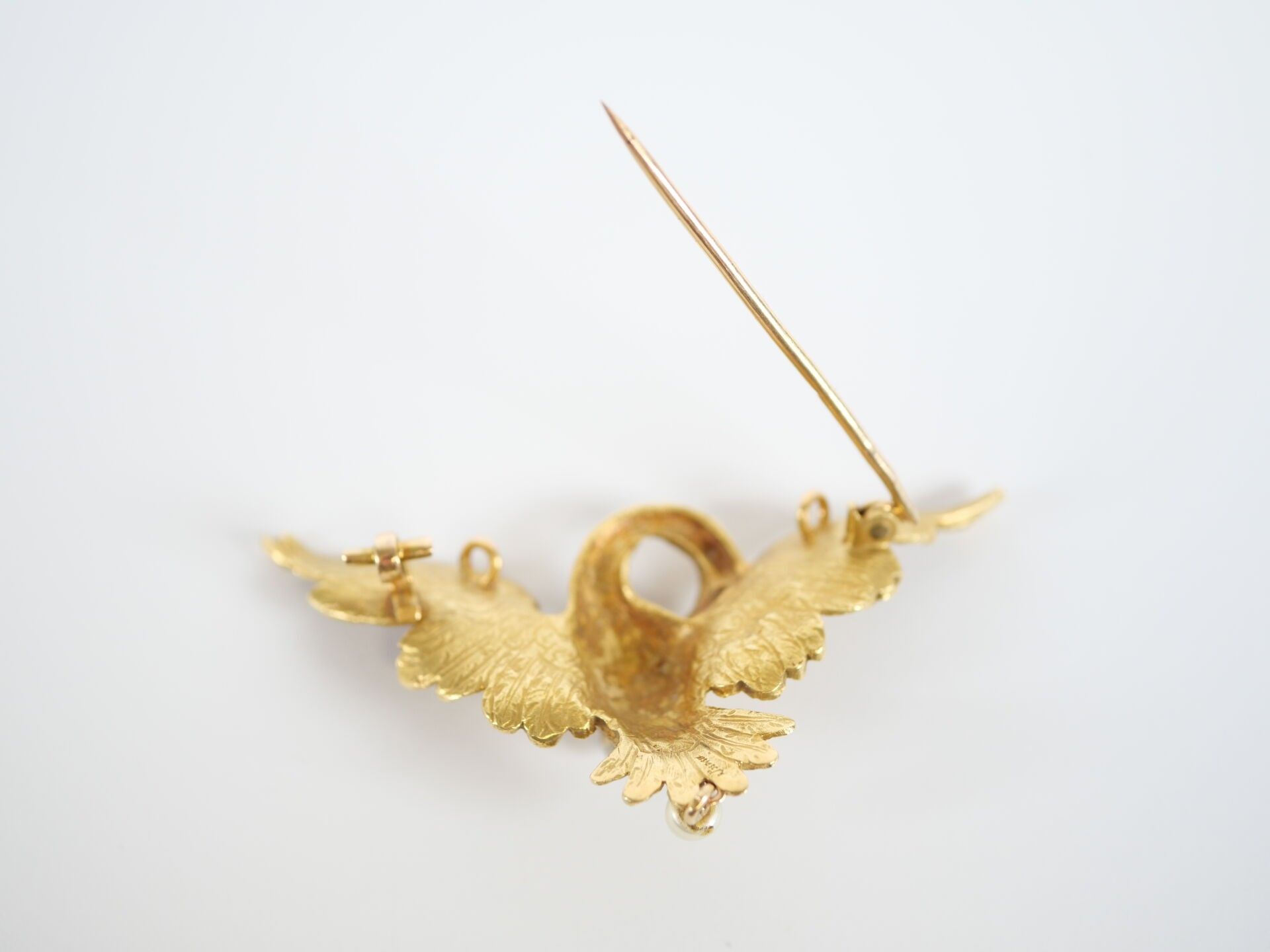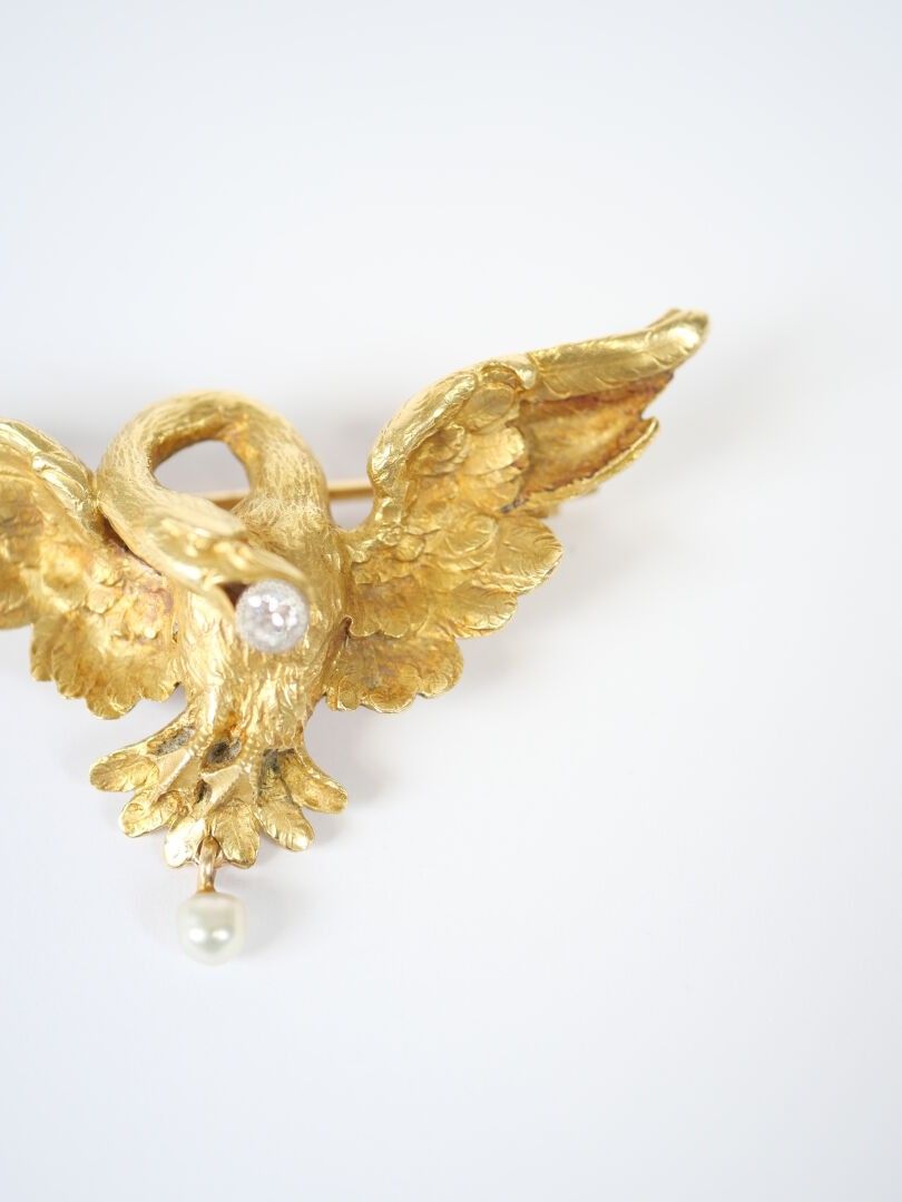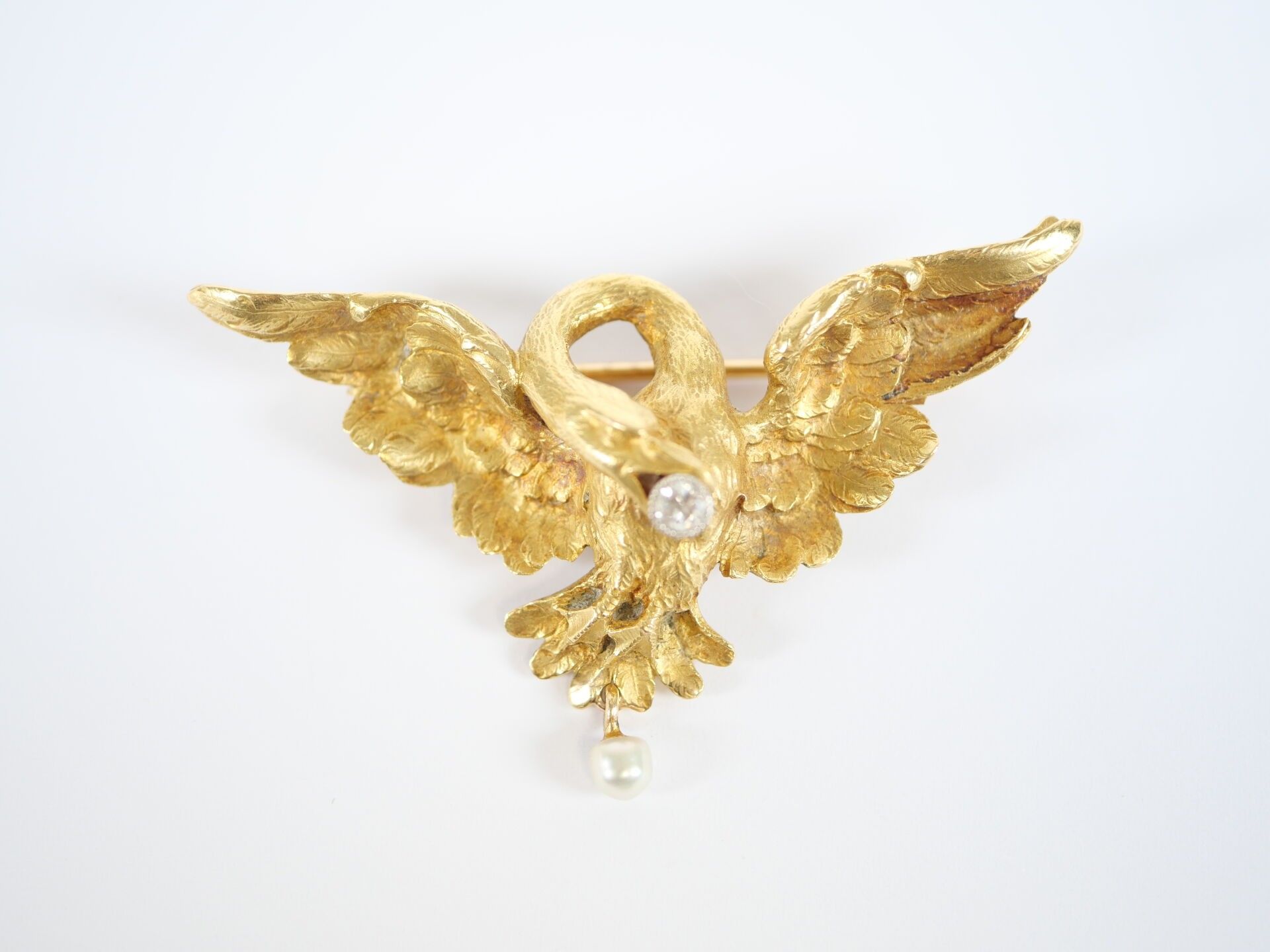 An important 18K (750‰) yellow gold pendant brooch decorated with a swan with outstretched wings, holding in its beak a small round old-cut diamond weighing approximately 0.07 carat, mounted in a closed setting and embellished with a small baroque pearl pendant.