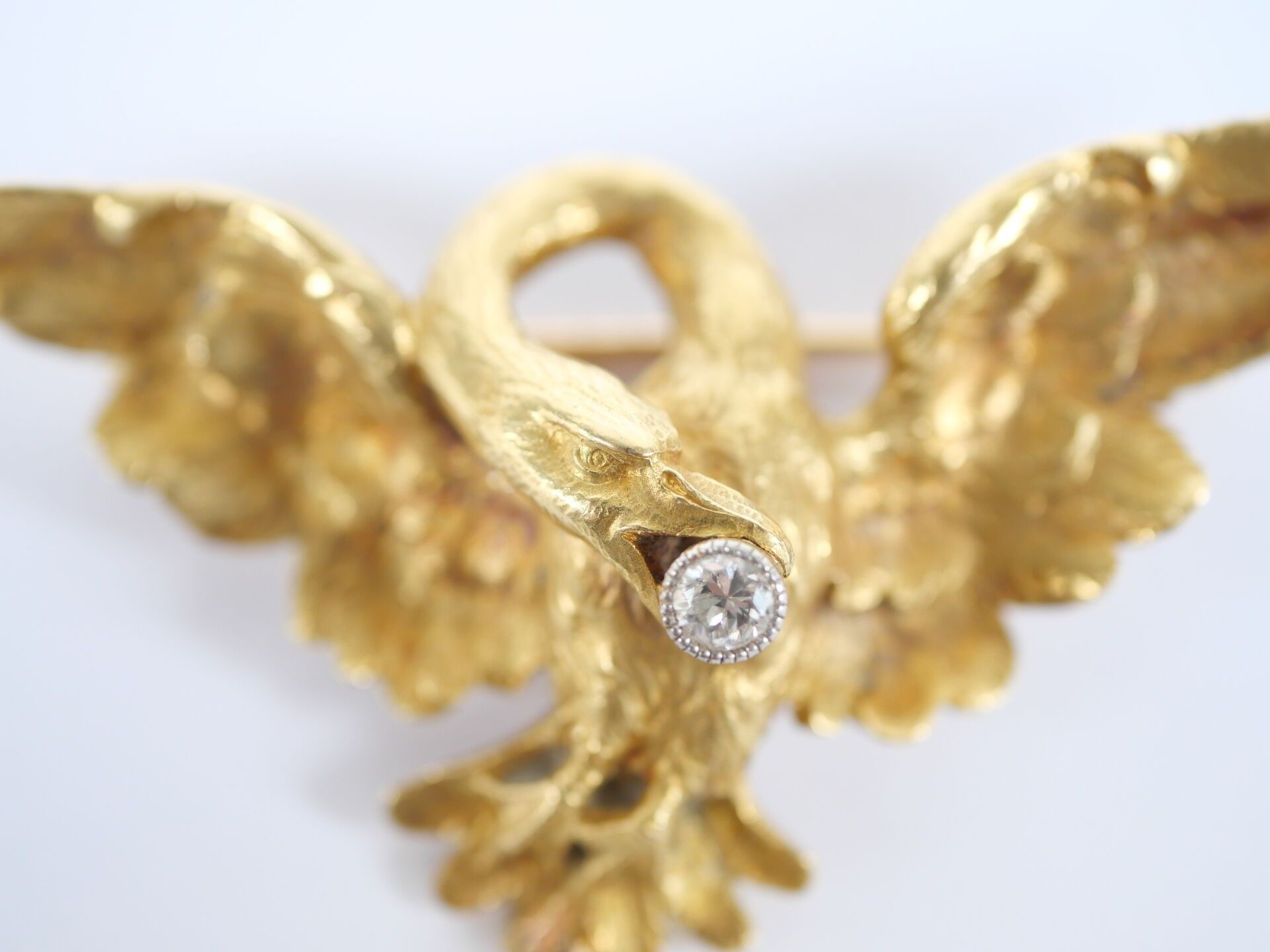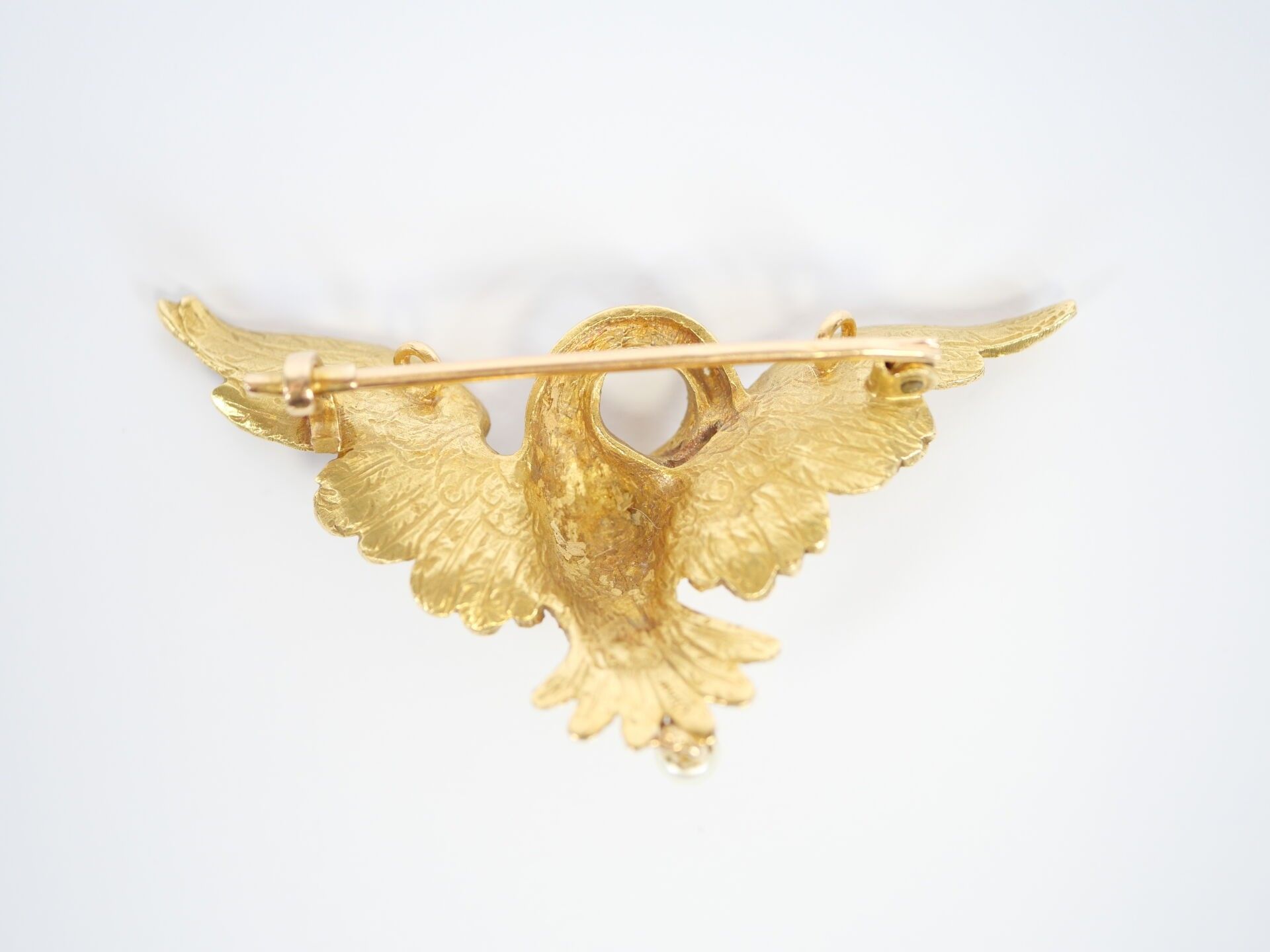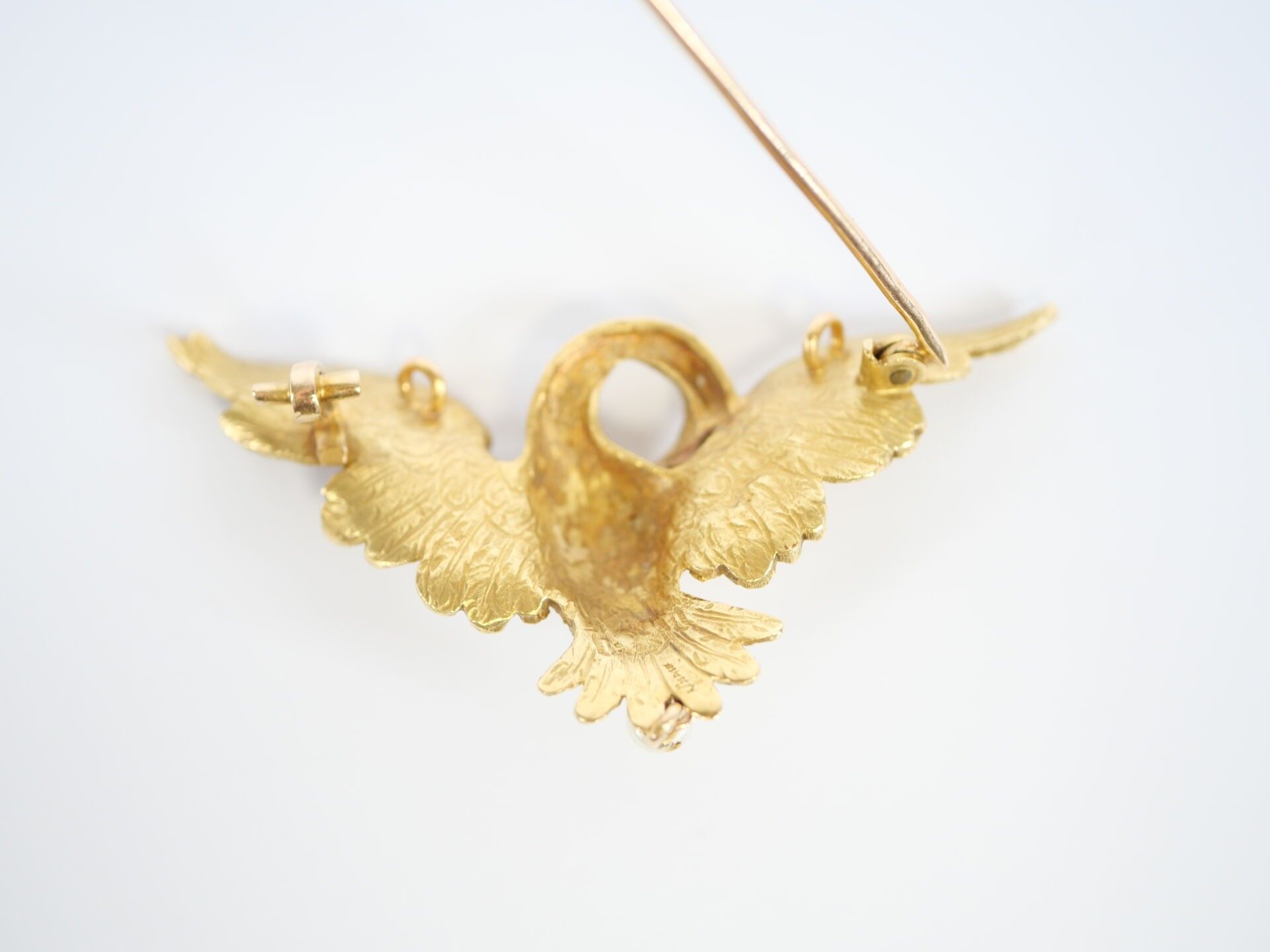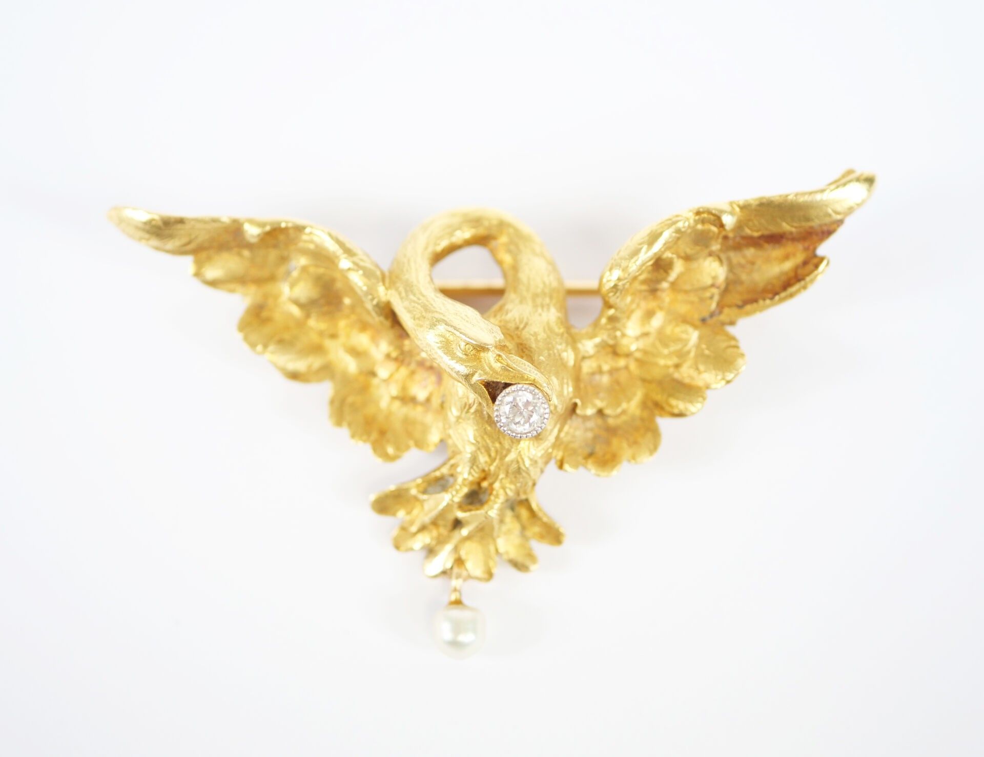 An important 18K (750‰) yellow gold pendant brooch decorated with a swan with outstretched wings, holding in its beak a small round old-cut diamond weighing approximately 0.07 carat, mounted in a closed setting and embellished with a small baroque pearl pendant.