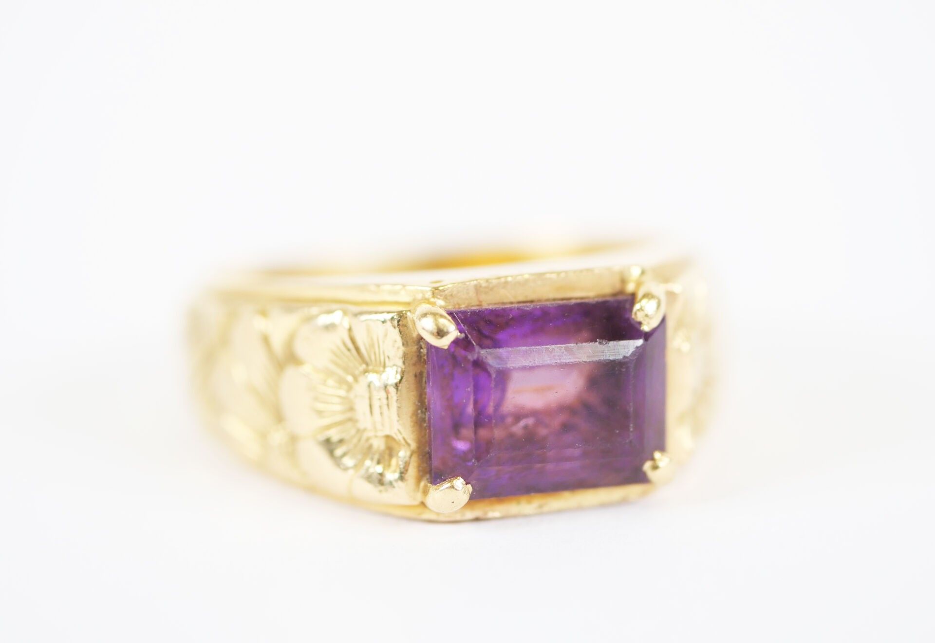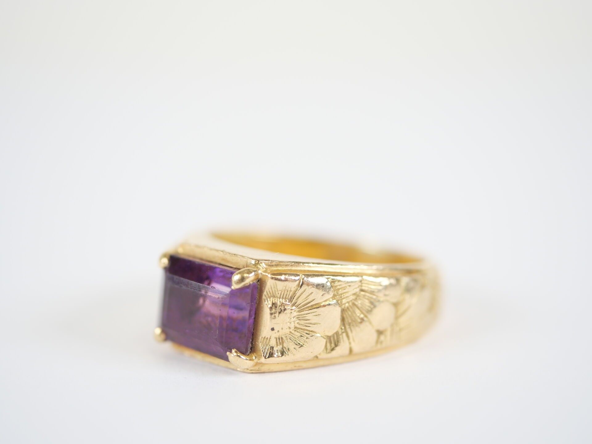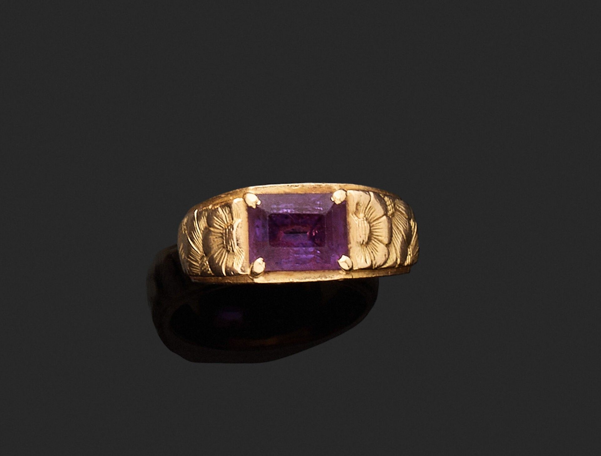 An important 18K (750‰) yellow gold ring set with an emerald-cut amethyst, approximately 10 x 8 mm, mounted in a claw-setting, the setting with a chased decoration of stylised flowers.