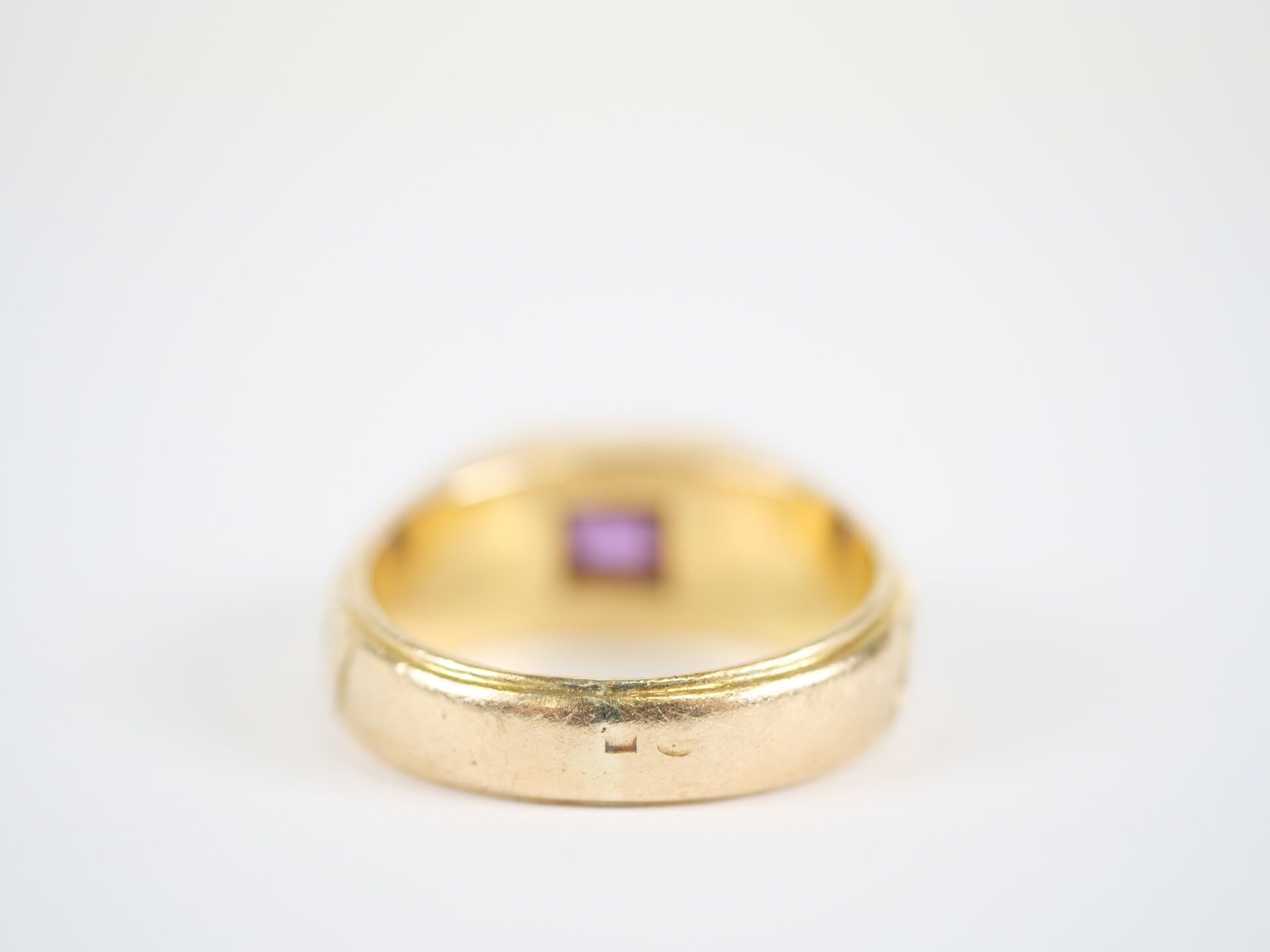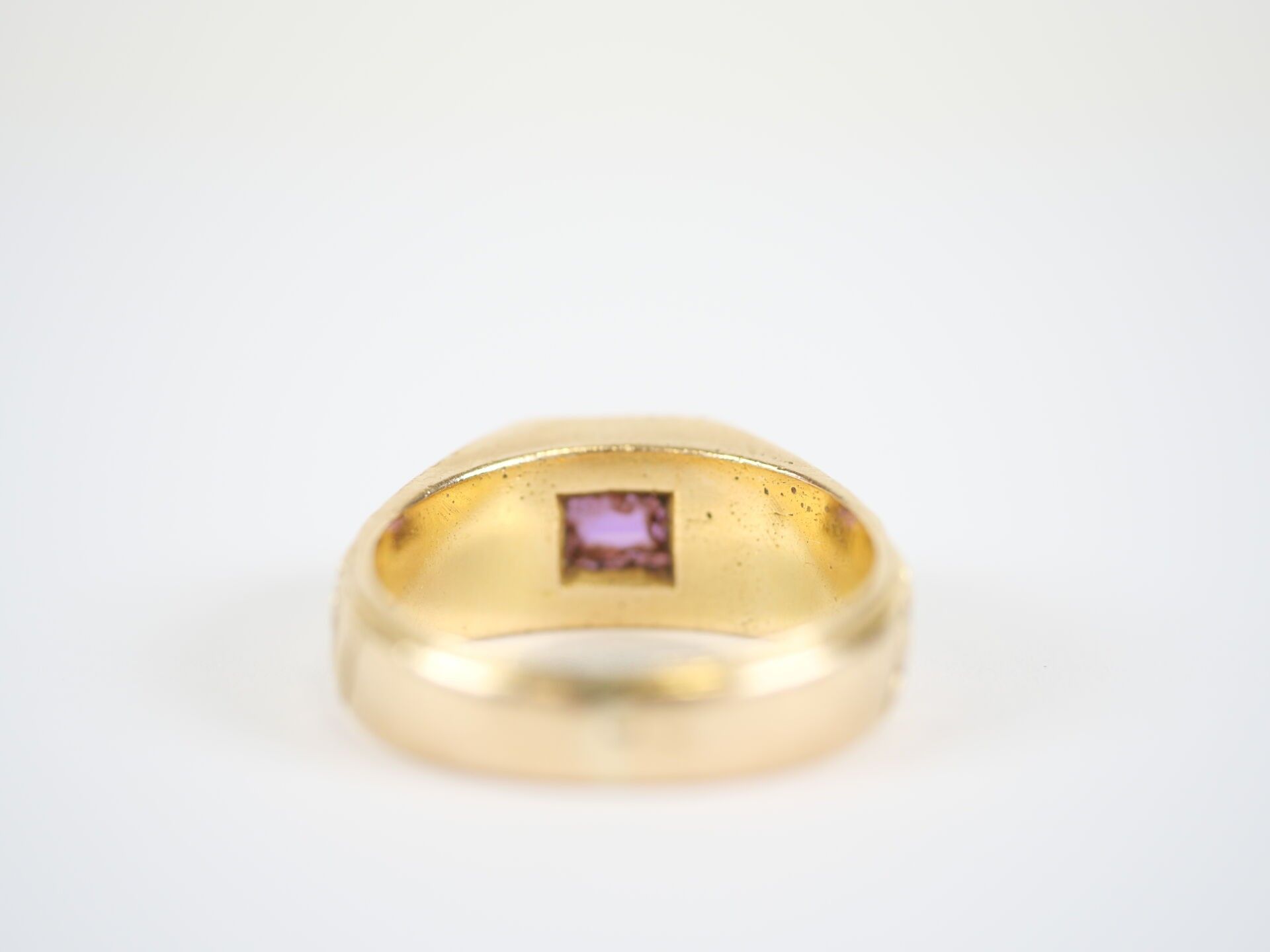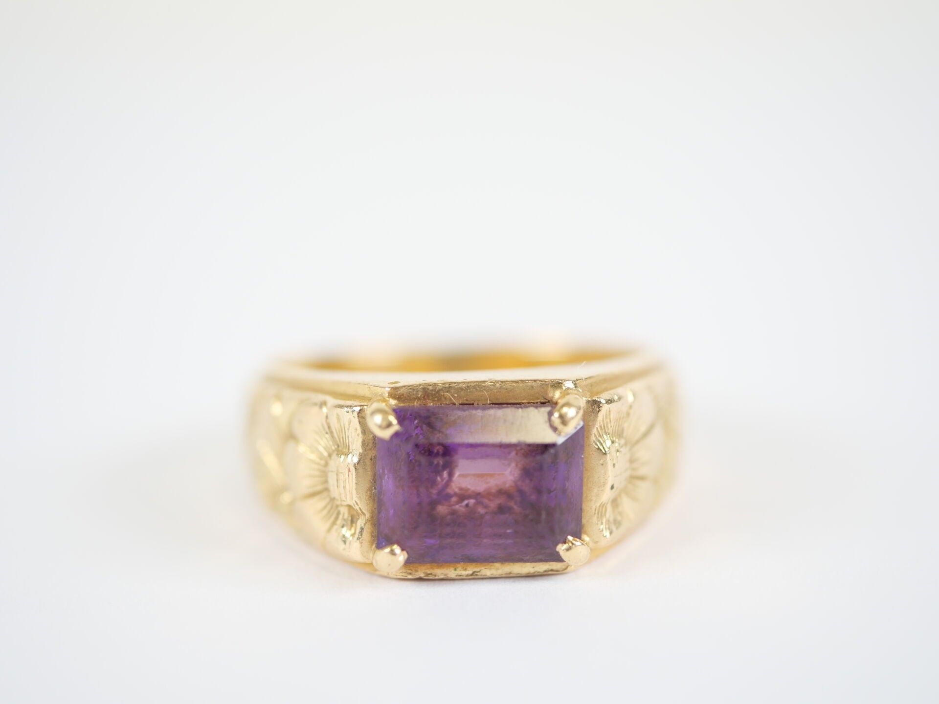 An important 18K (750‰) yellow gold ring set with an emerald-cut amethyst, approximately 10 x 8 mm, mounted in a claw-setting, the setting with a chased decoration of stylised flowers.