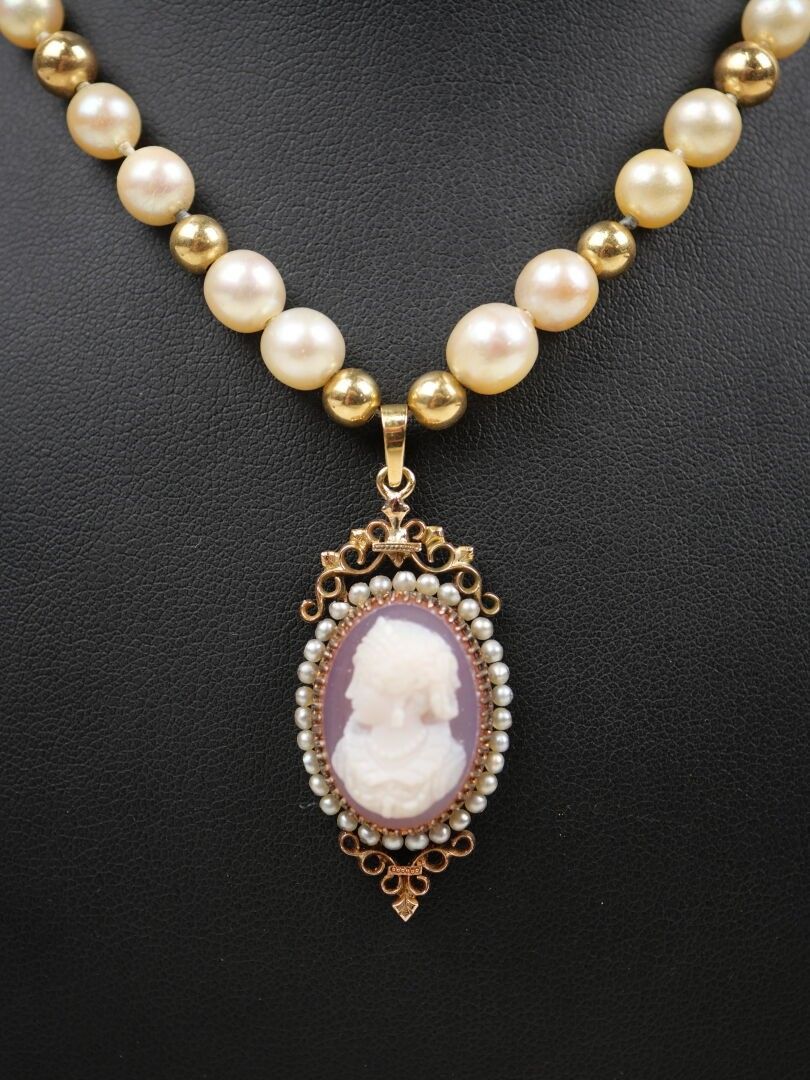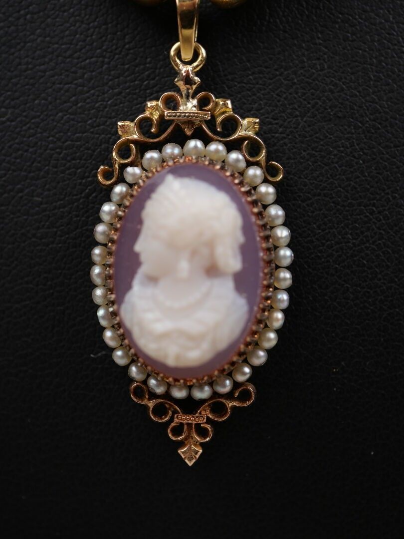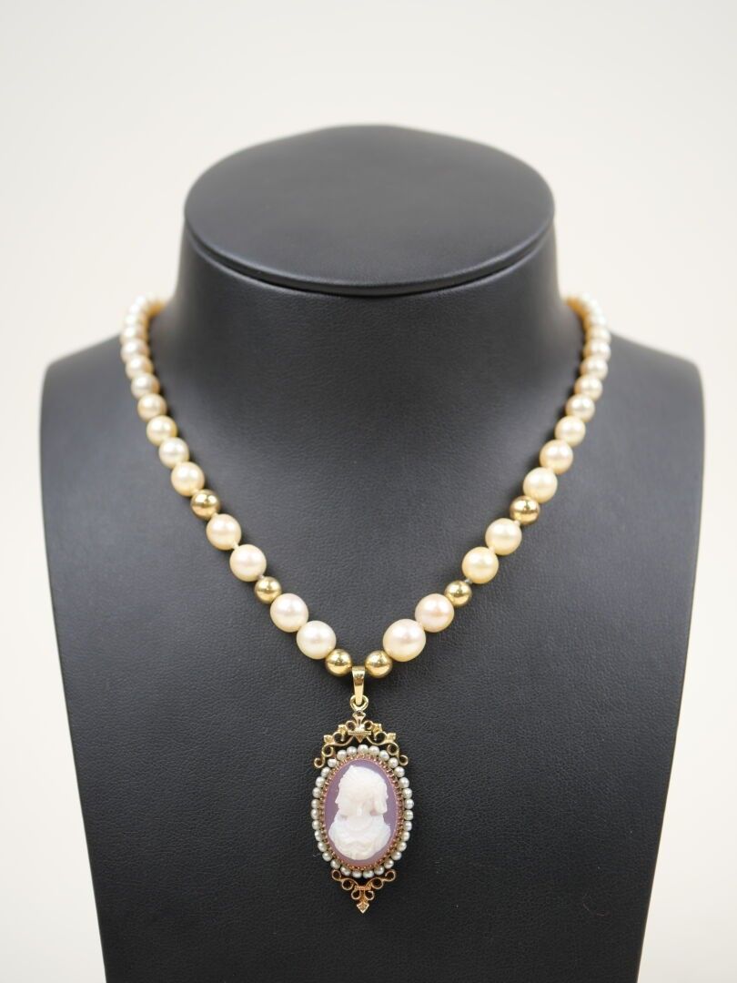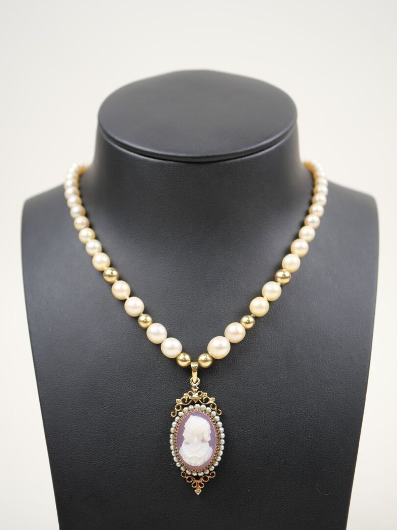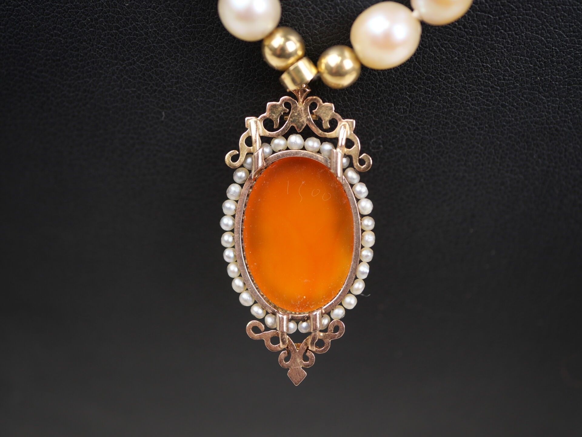 Necklace of falling cultured pearls alternating with six balls in 18K yellow gold (750‰), holding an oval pendant also in 18K yellow gold (750‰) embellished with a cameo on agate depicting a woman in profile bust, the rim adorned with fine pearls.
