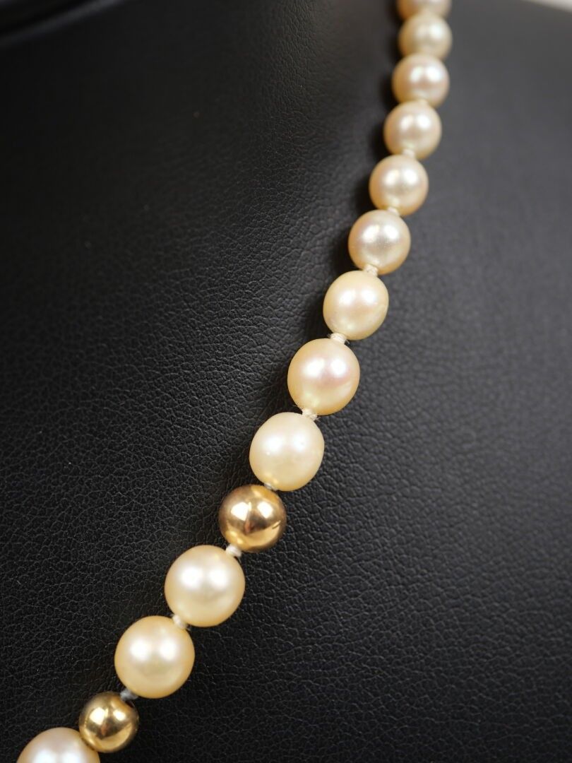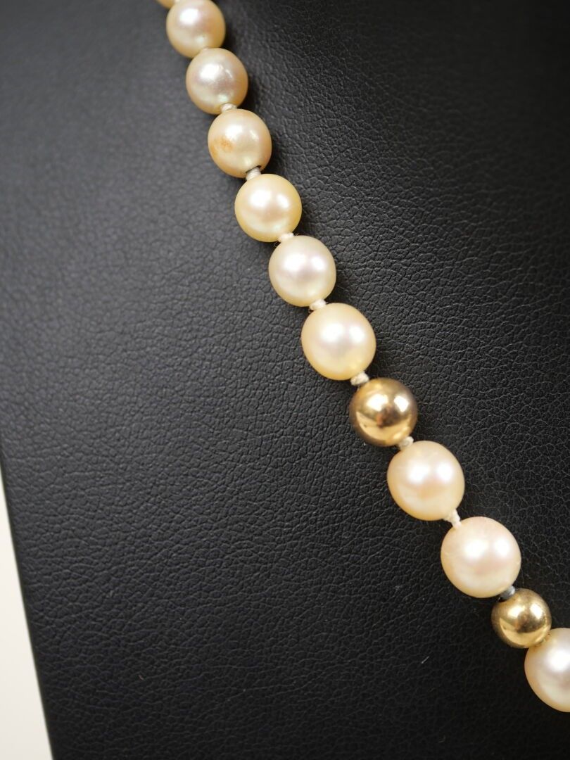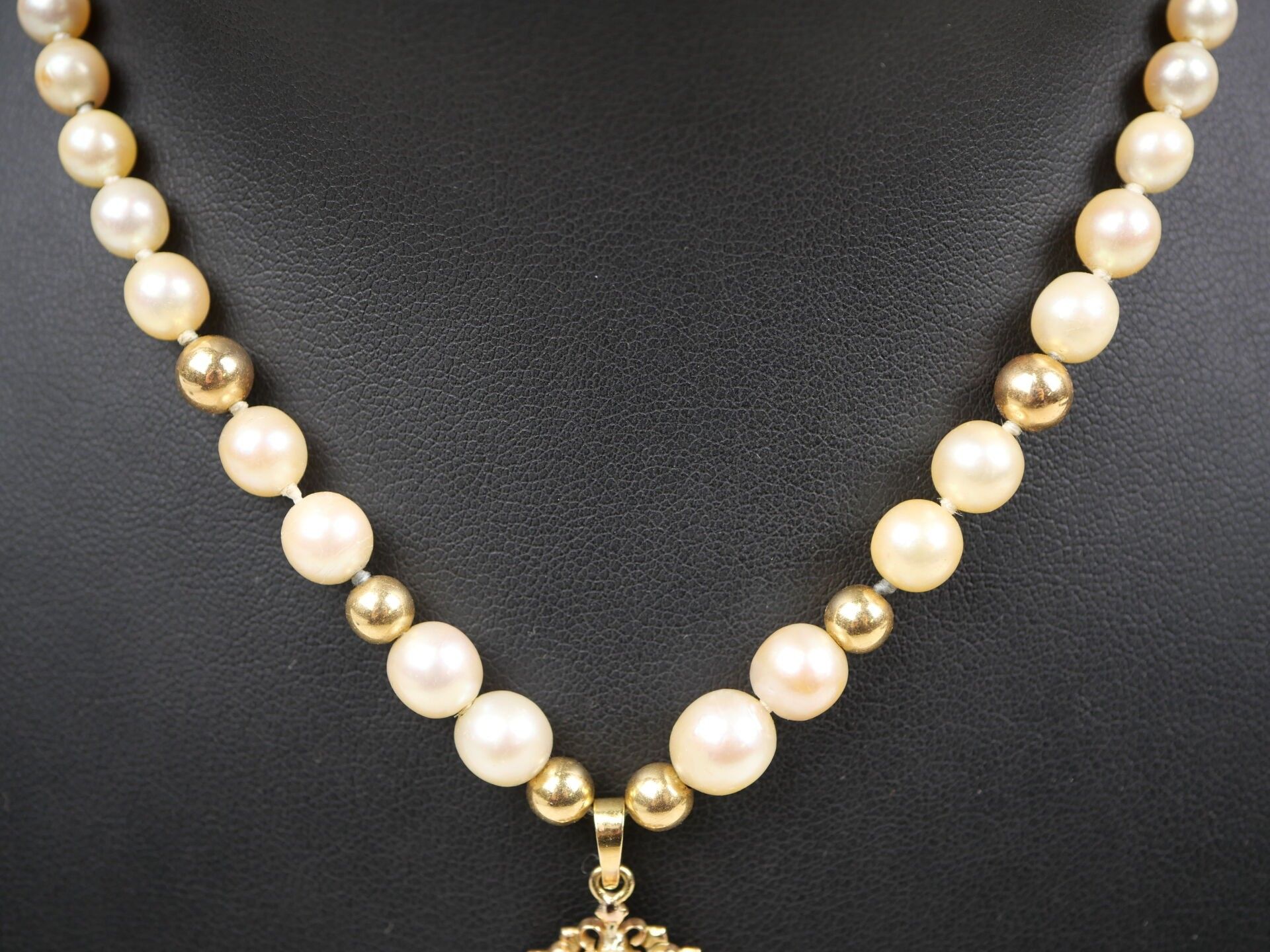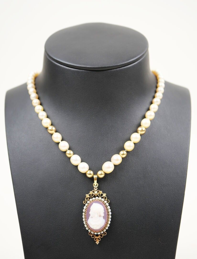 Necklace of falling cultured pearls alternating with six balls in 18K yellow gold (750‰), holding an oval pendant also in 18K yellow gold (750‰) embellished with a cameo on agate depicting a woman in profile bust, the rim adorned with fine pearls.