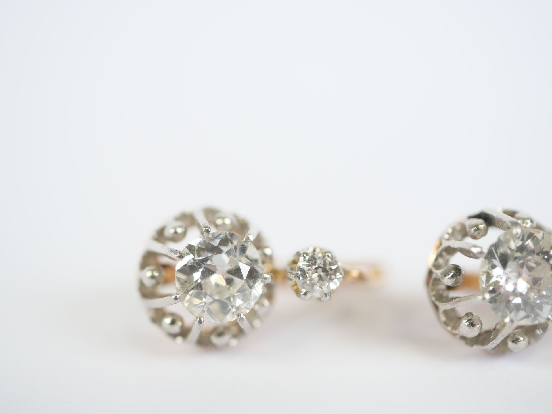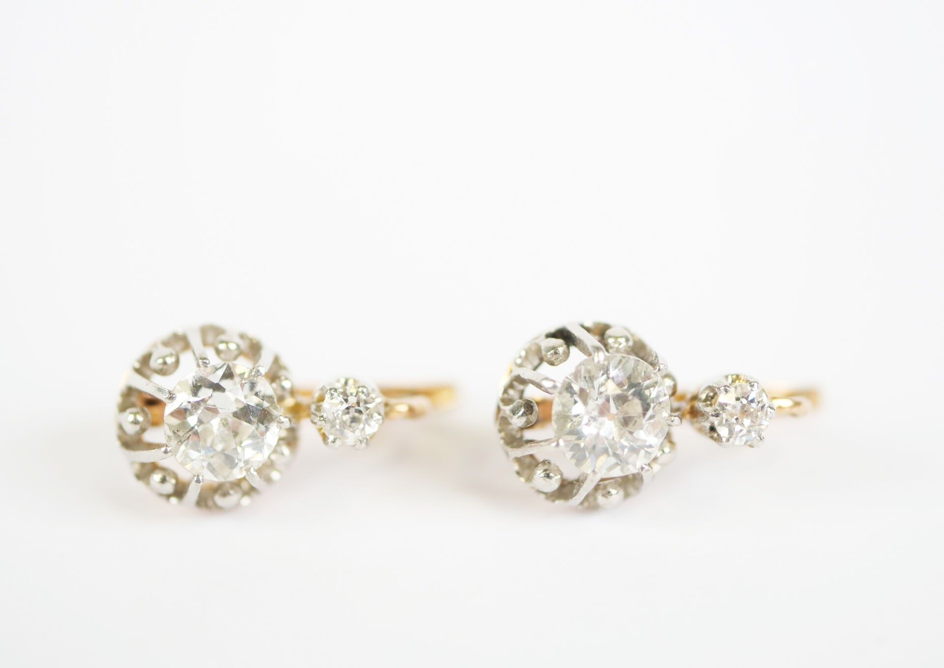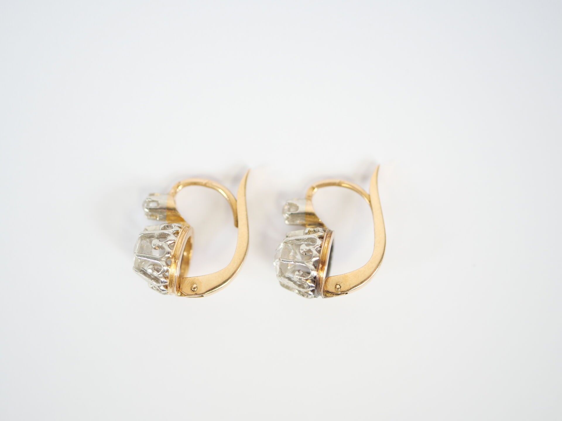 A pair of 18K (750‰) yellow gold and white gold or platinum "dormeuse" earrings, each set with a round old-cut diamond weighing approximately 0.50 carat, surmounted by a small old-cut diamond, the whole set in a claw-setting.