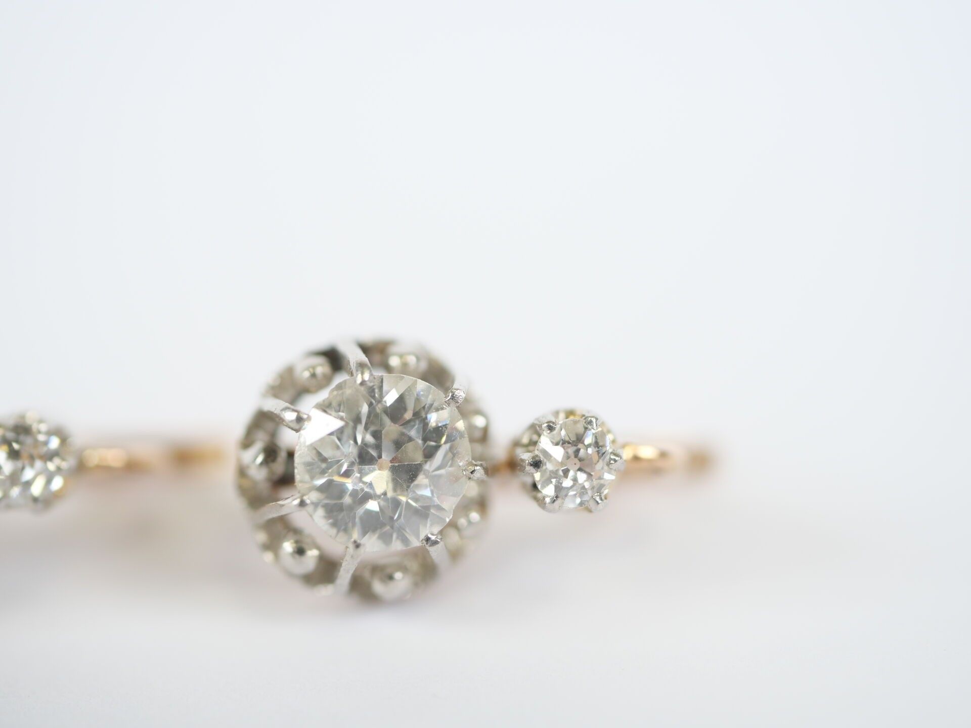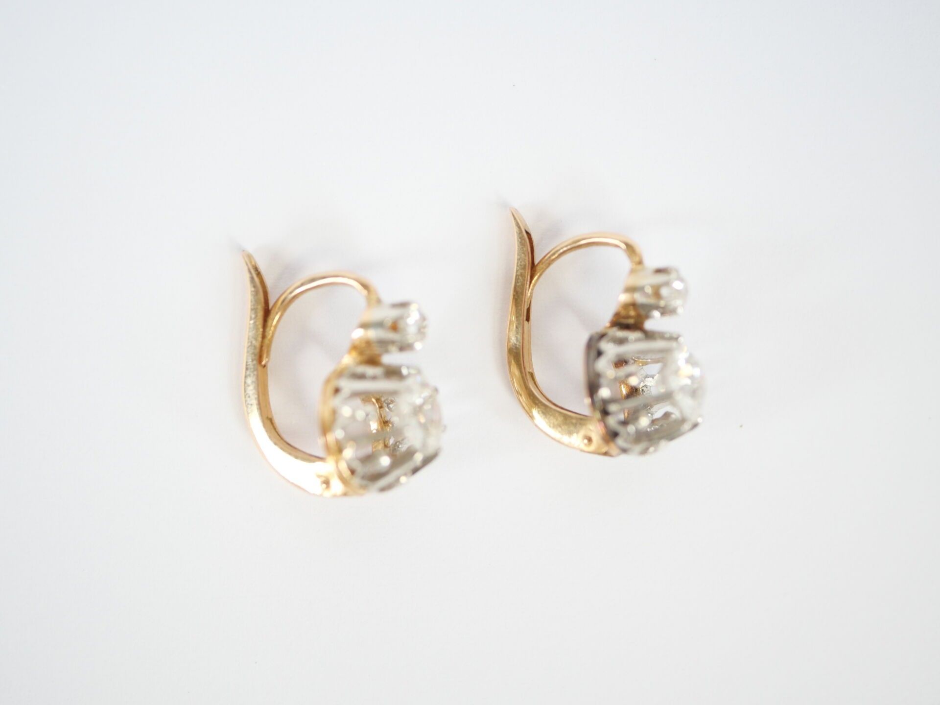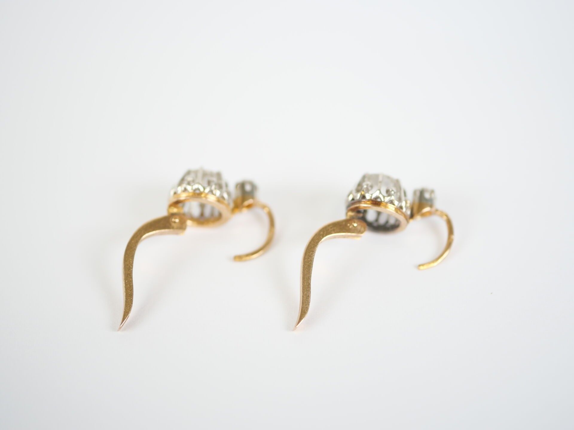 A pair of 18K (750‰) yellow gold and white gold or platinum "dormeuse" earrings, each set with a round old-cut diamond weighing approximately 0.50 carat, surmounted by a small old-cut diamond, the whole set in a claw-setting.