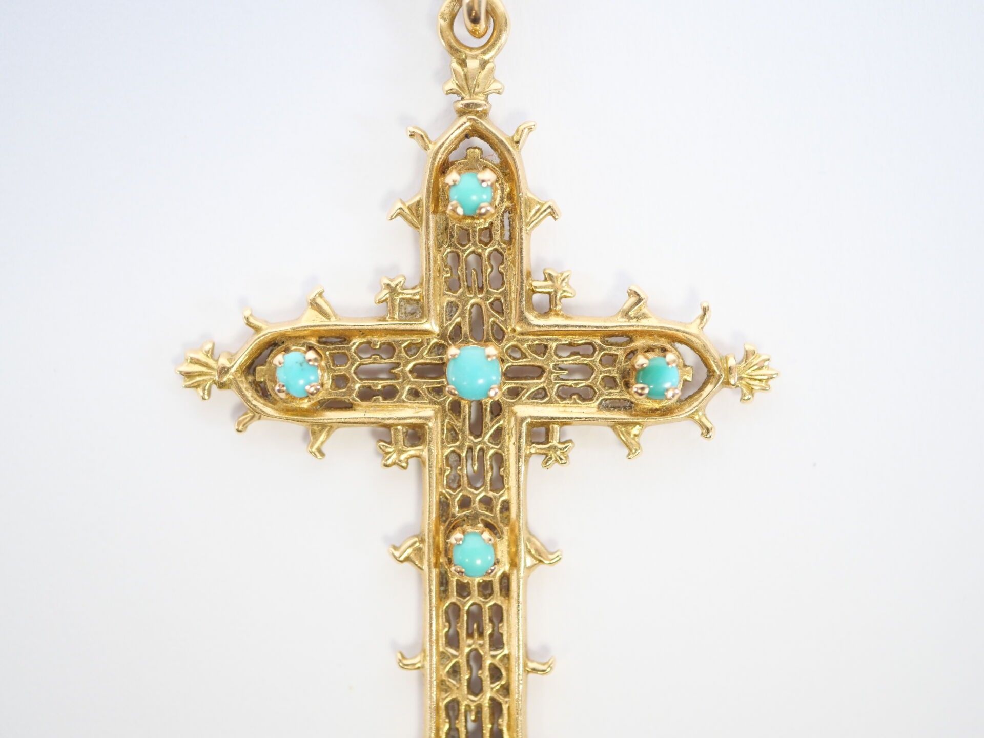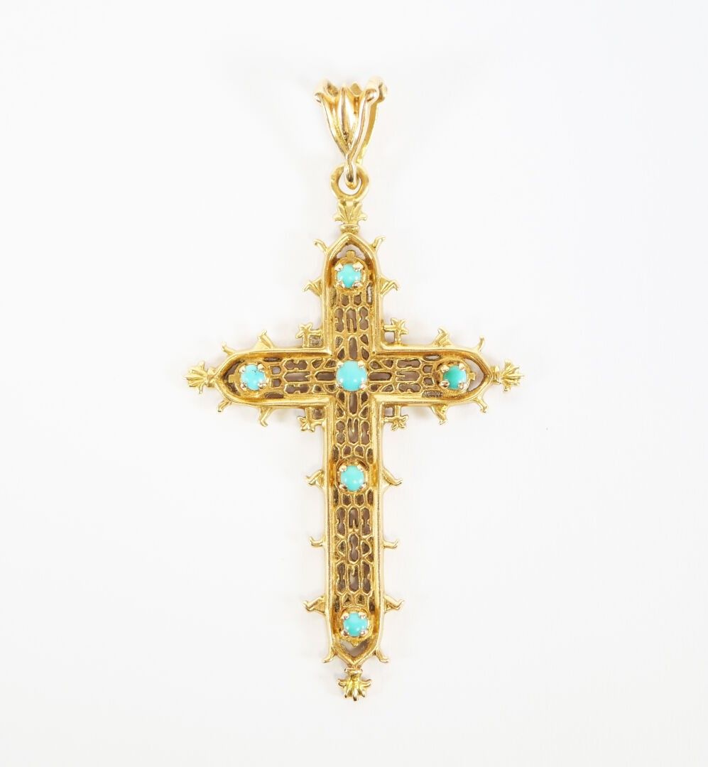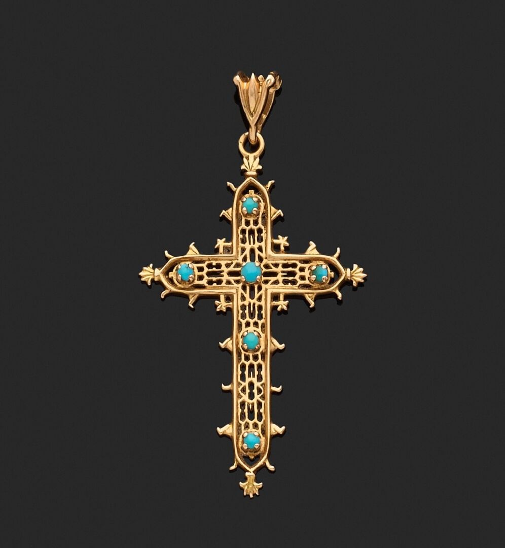 Pendant cross in 18K (750‰) yellow gold, known as the Pont d'Estaing cross, decorated with stylised openwork motifs, set with six small turquoise beads mounted in claw-sets.