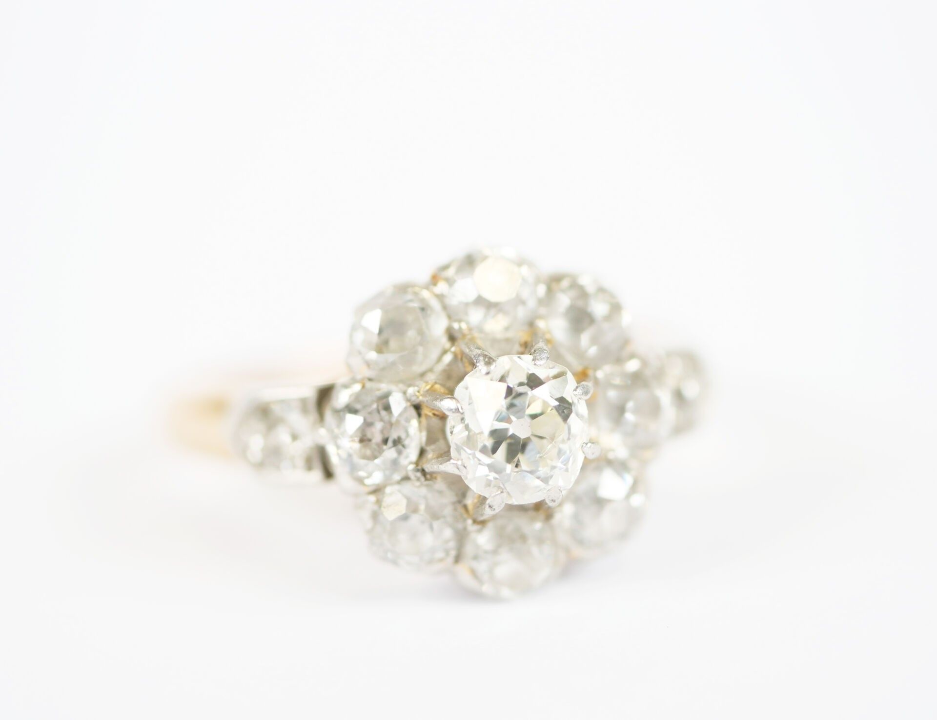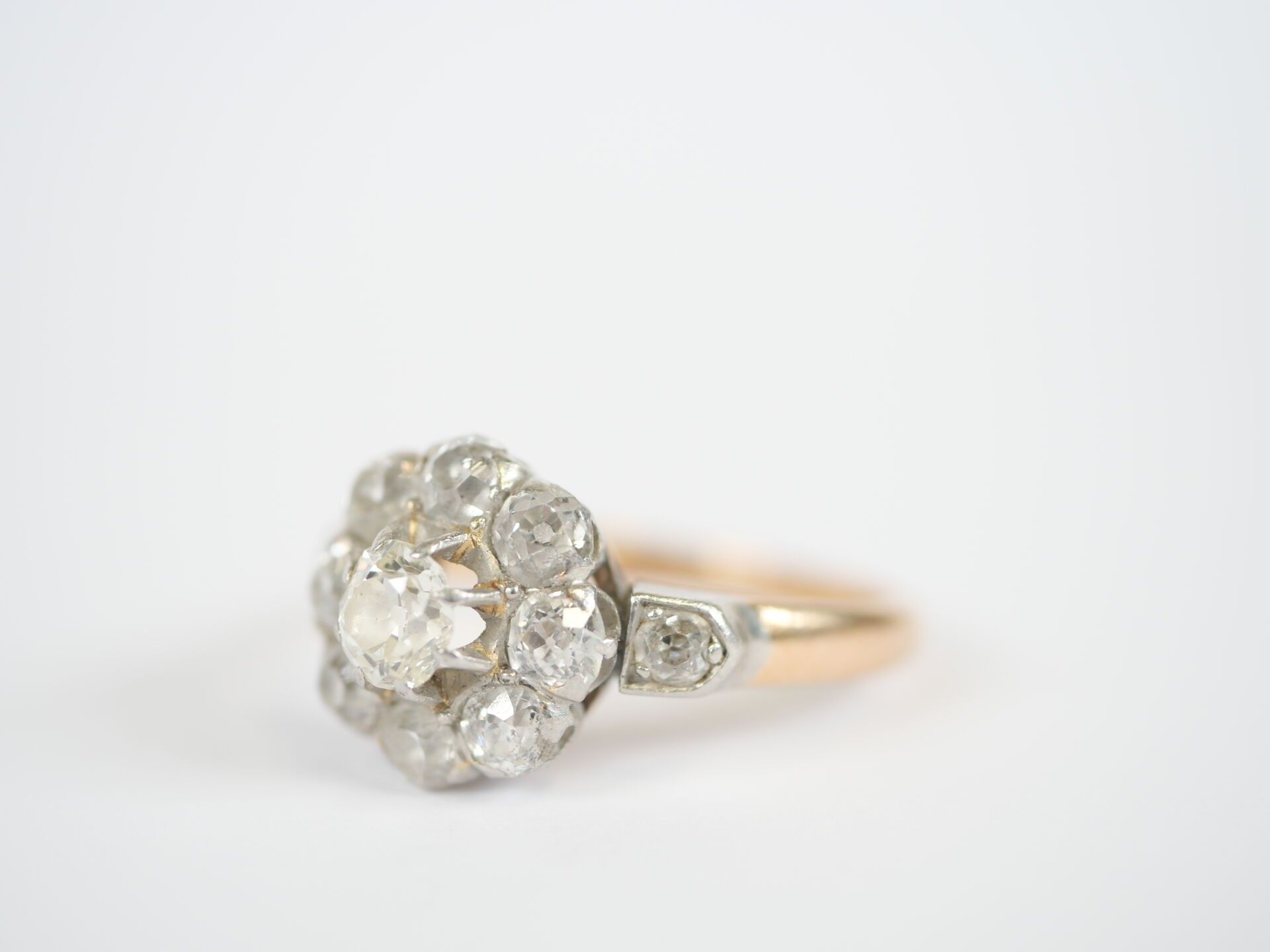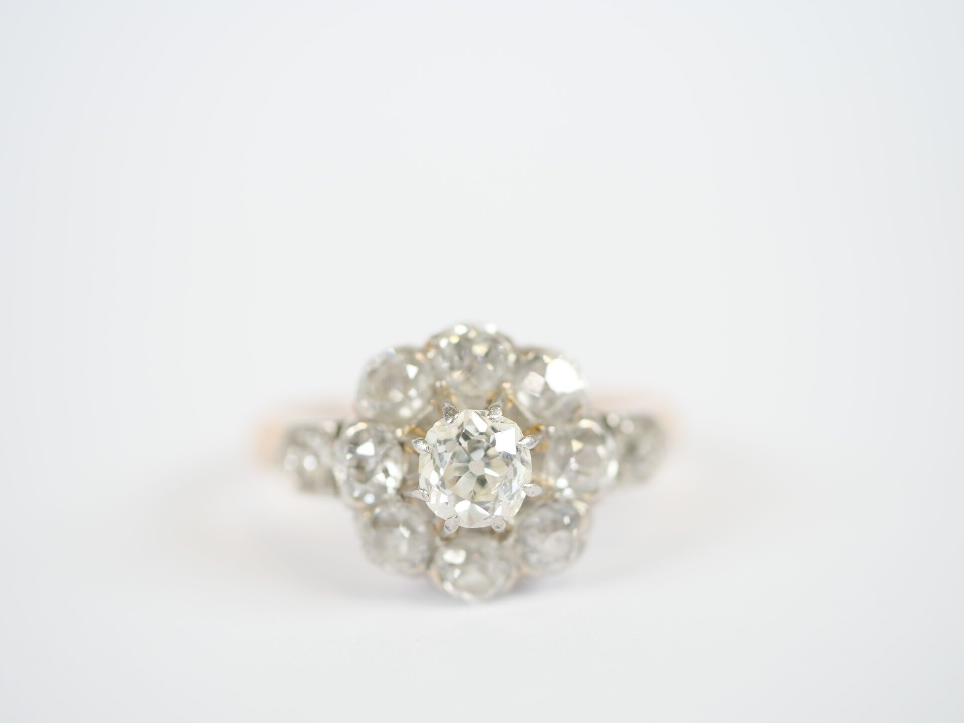 An 18K (750‰) yellow gold and white gold or platinum daisy ring set with ten old-cut diamonds in claw-setting, the largest approximately 0.33 carat.